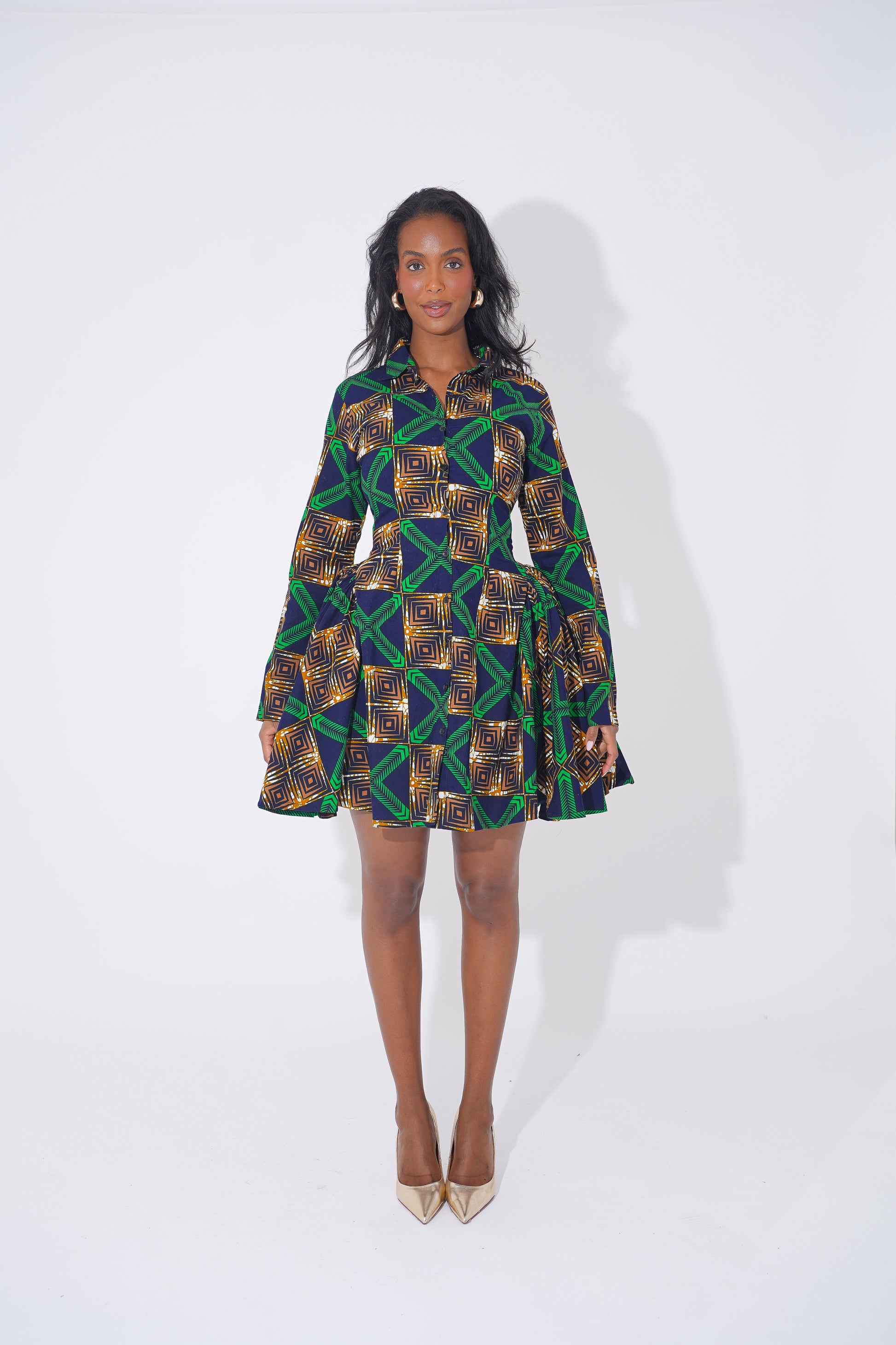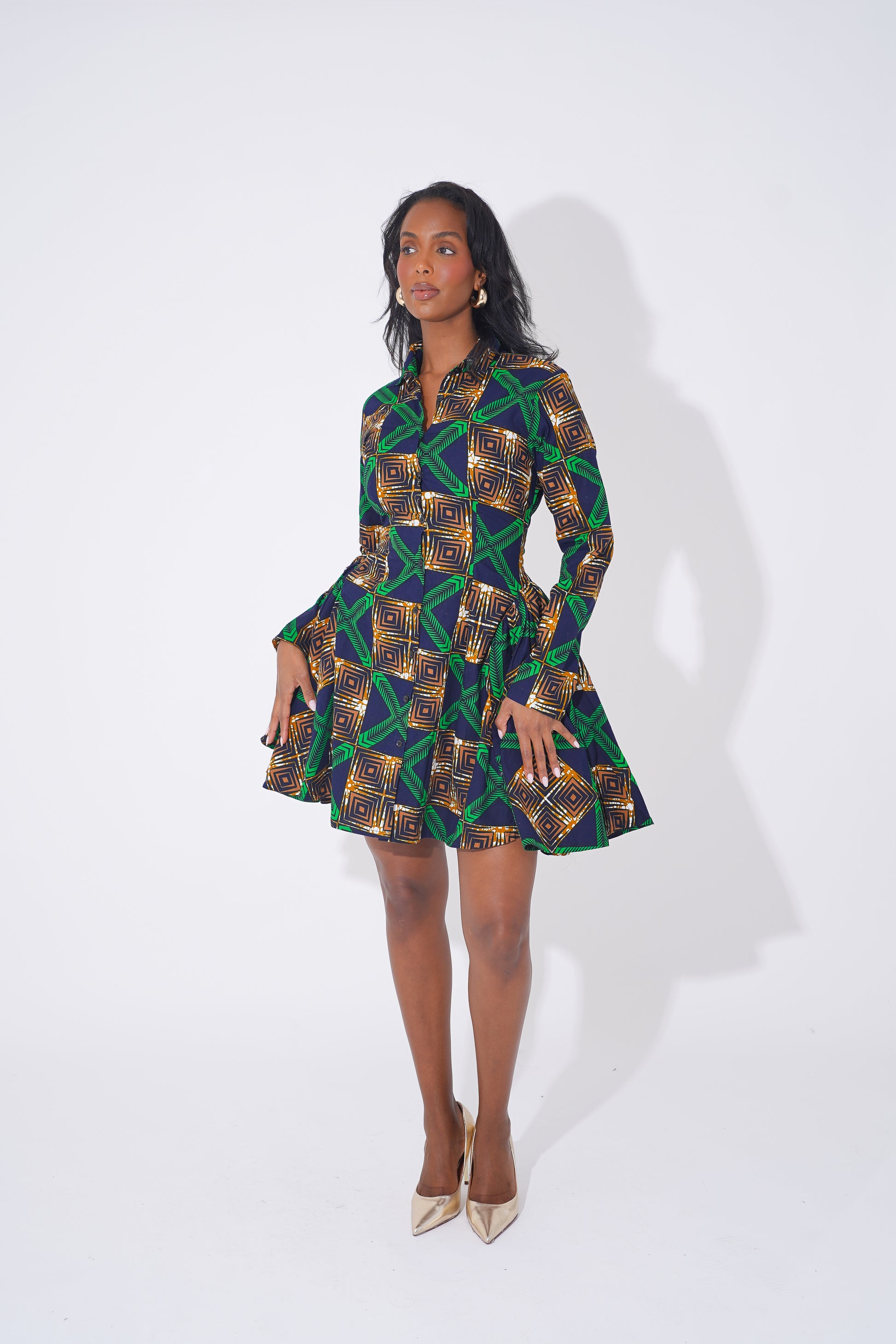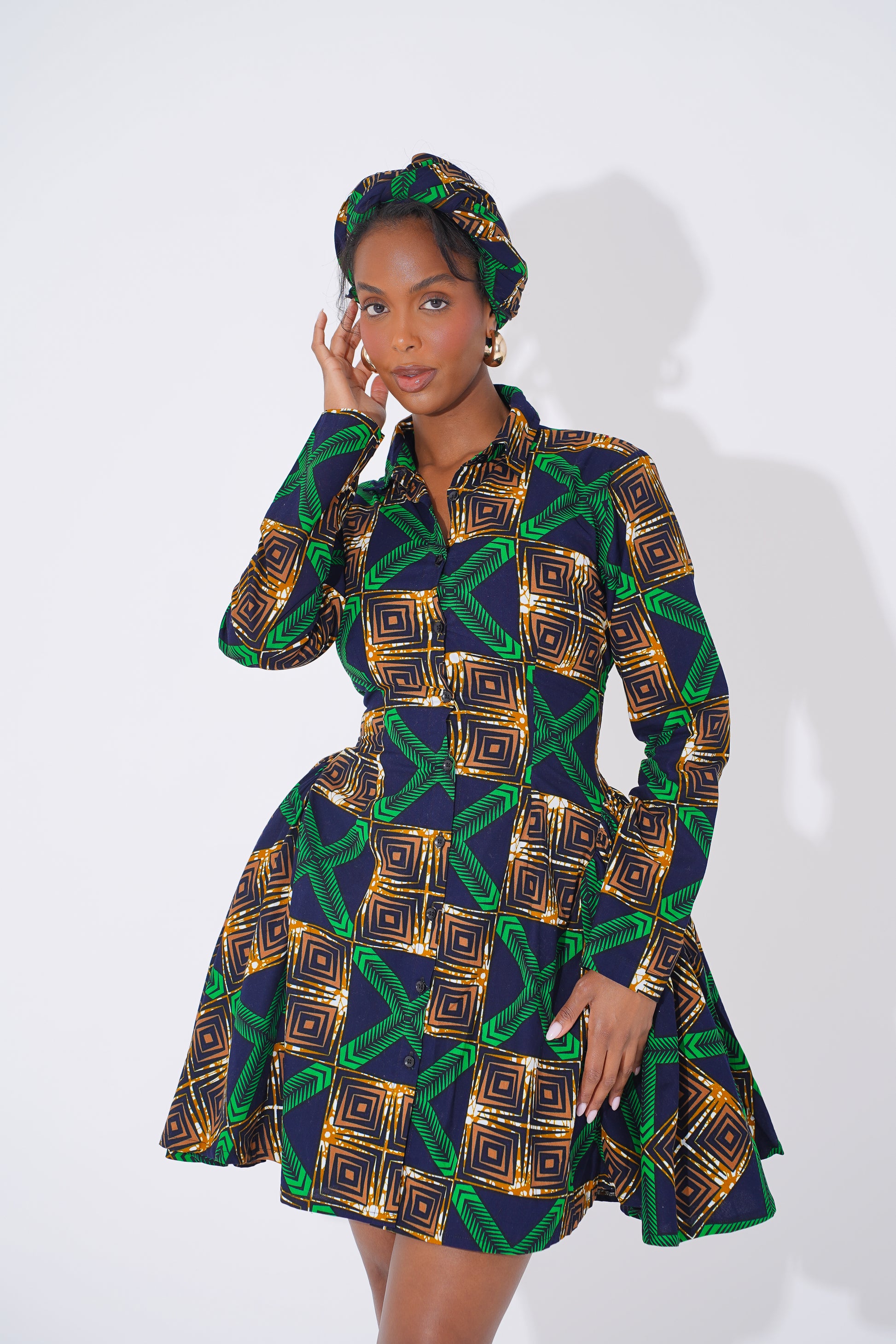 Turn heads and exude confidence with this bold and vibrant Ankara mini dress, designed for Black women who love to embrace their heritage through fashion. The geometric pattern of rich green and gold on a navy backdrop creates a striking look that is both modern and rooted in tradition.