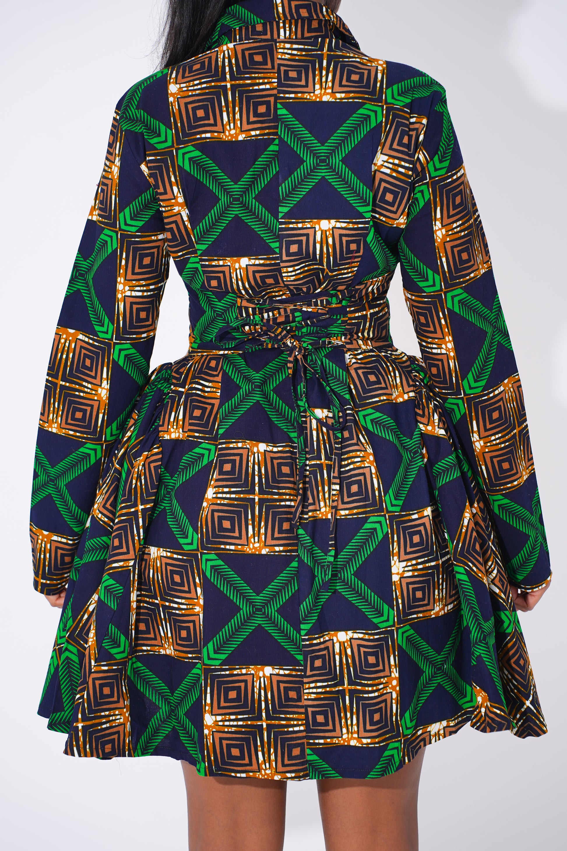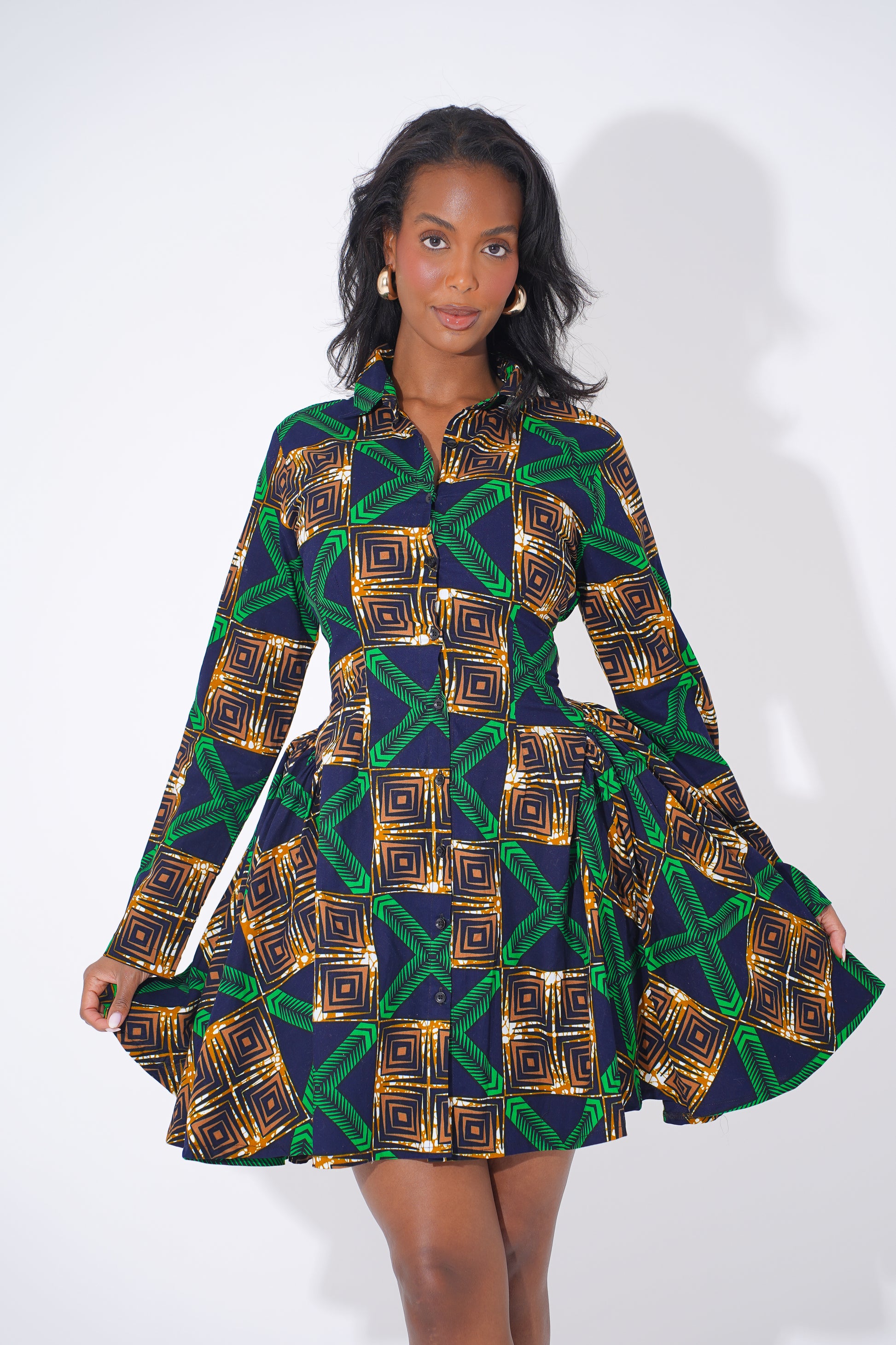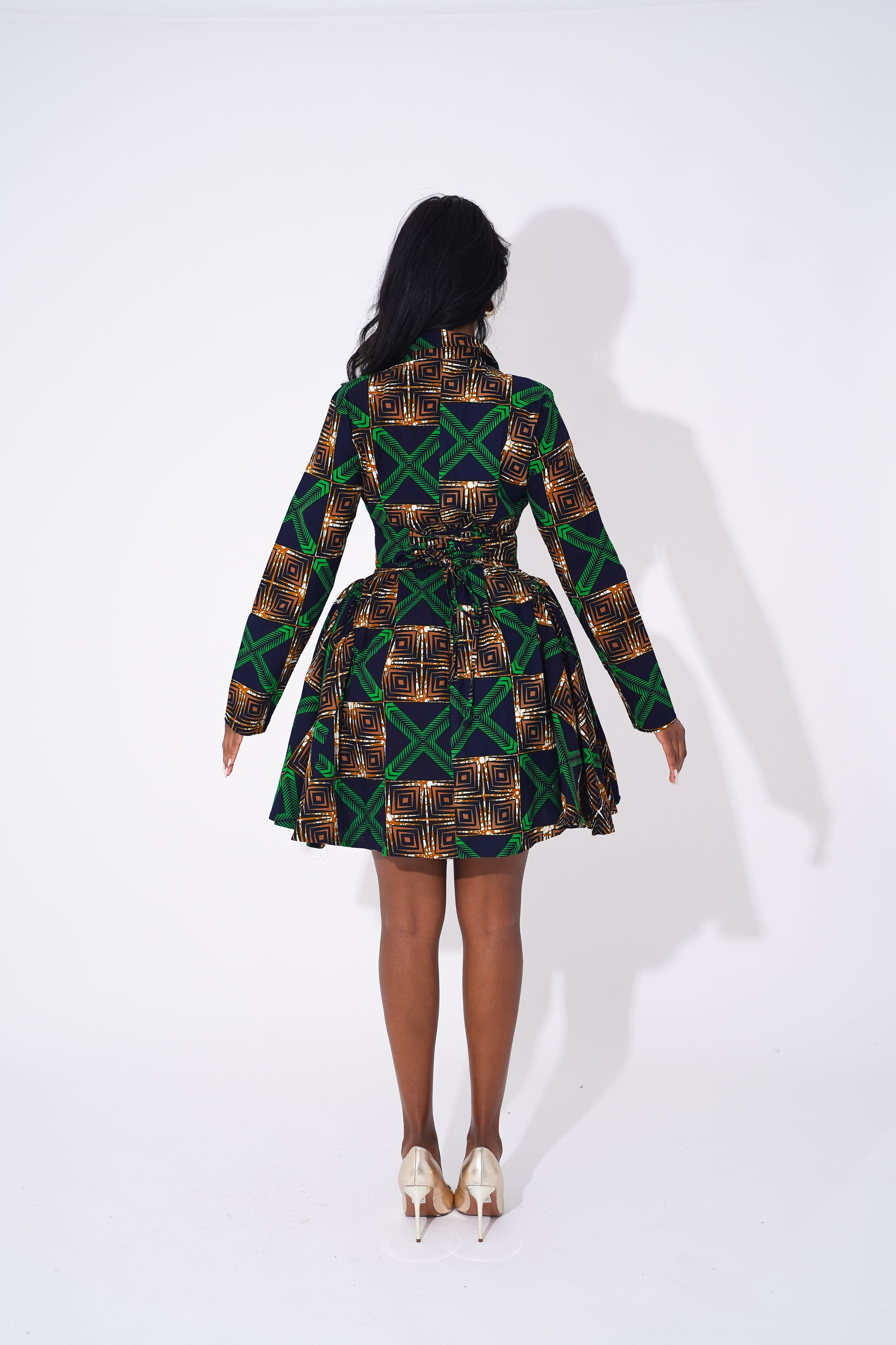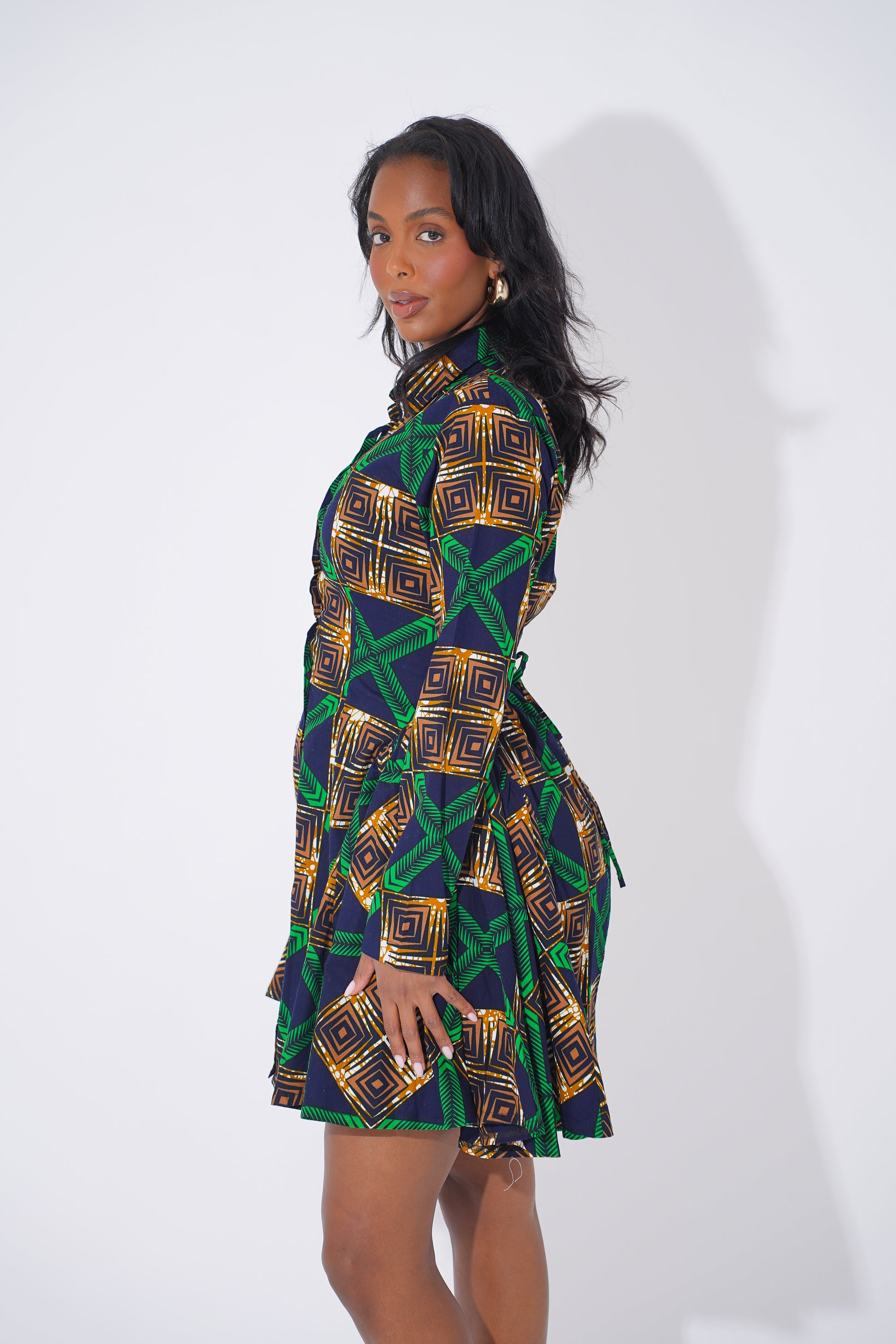 Turn heads and exude confidence with this bold and vibrant Ankara mini dress, designed for Black women who love to embrace their heritage through fashion. The geometric pattern of rich green and gold on a navy backdrop creates a striking look that is both modern and rooted in tradition.