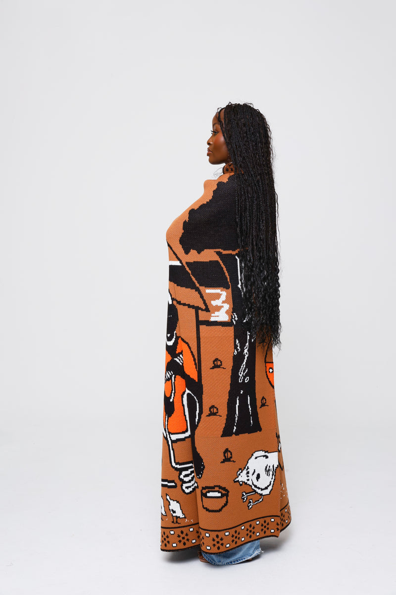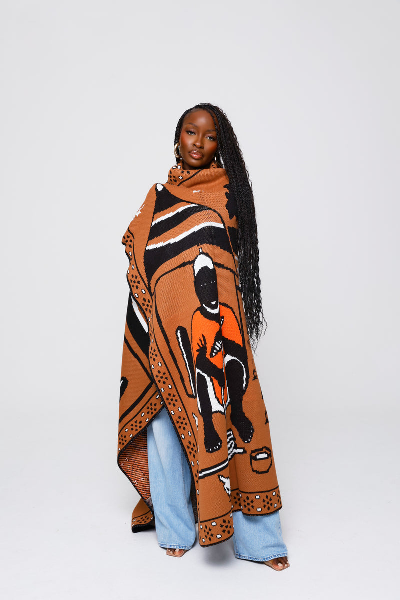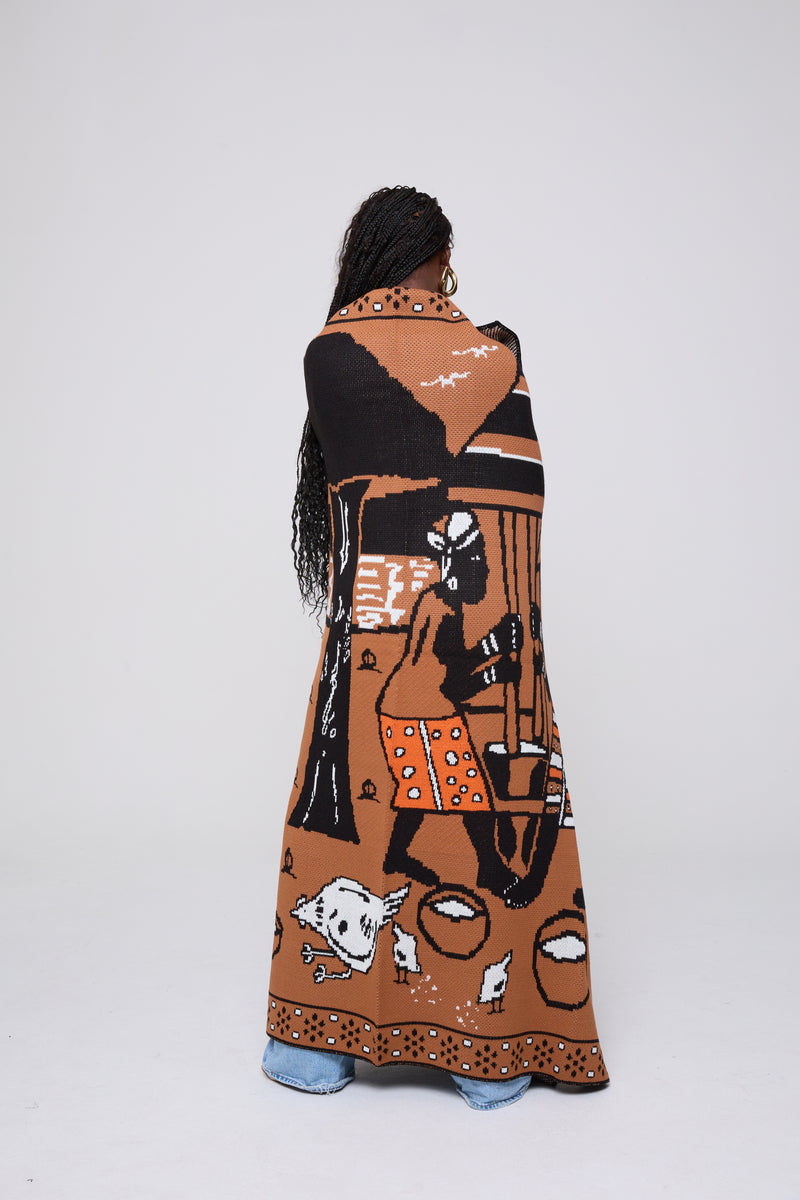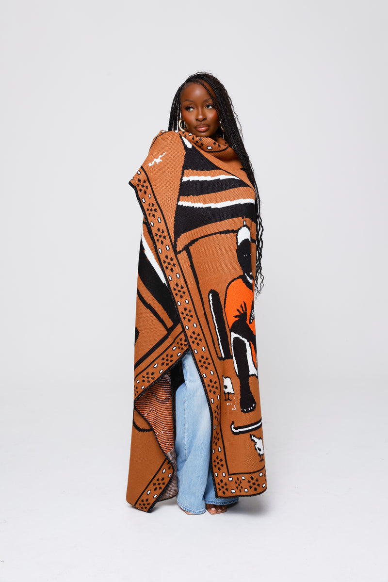This vibrant knit blanket is a beautiful fusion of art and craftsmanship, designed to bring warmth and culture to your home. Featuring an intricate, bold African-inspired pattern, the blanket depicts traditional scenes of everyday life, with vivid figures and earthy tones that evoke a sense of heritage and storytelling. Crafted from soft, high-quality knit fabric, this blanket is perfect for cozying up on chilly evenings or adding a unique touch to your living space. Its durable construction ensures long-lasting comfort, making it an ideal addition to any home décor. Whether you're looking to relax or showcase a piece of cultural art, this knit blanket is sure to be a striking and functional addition.