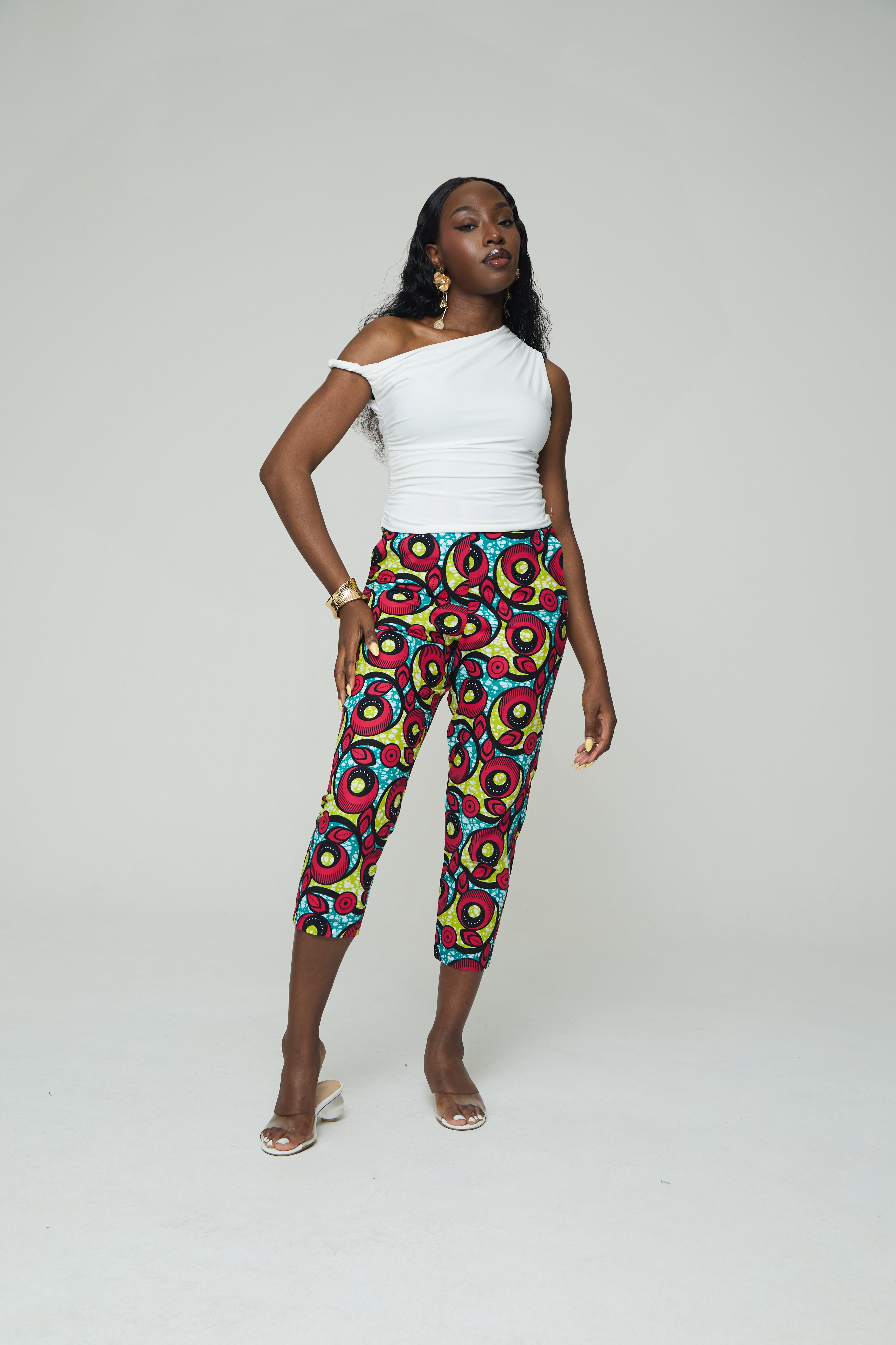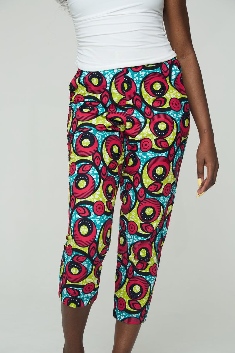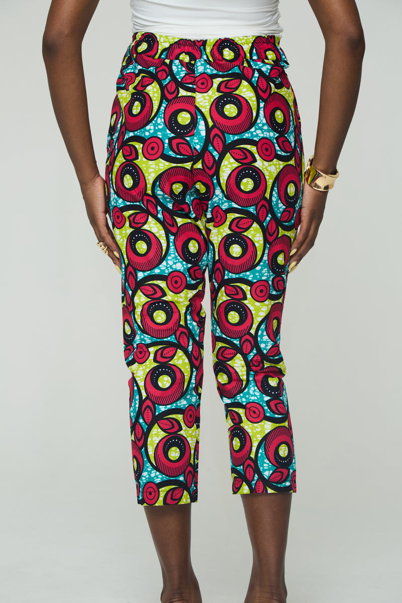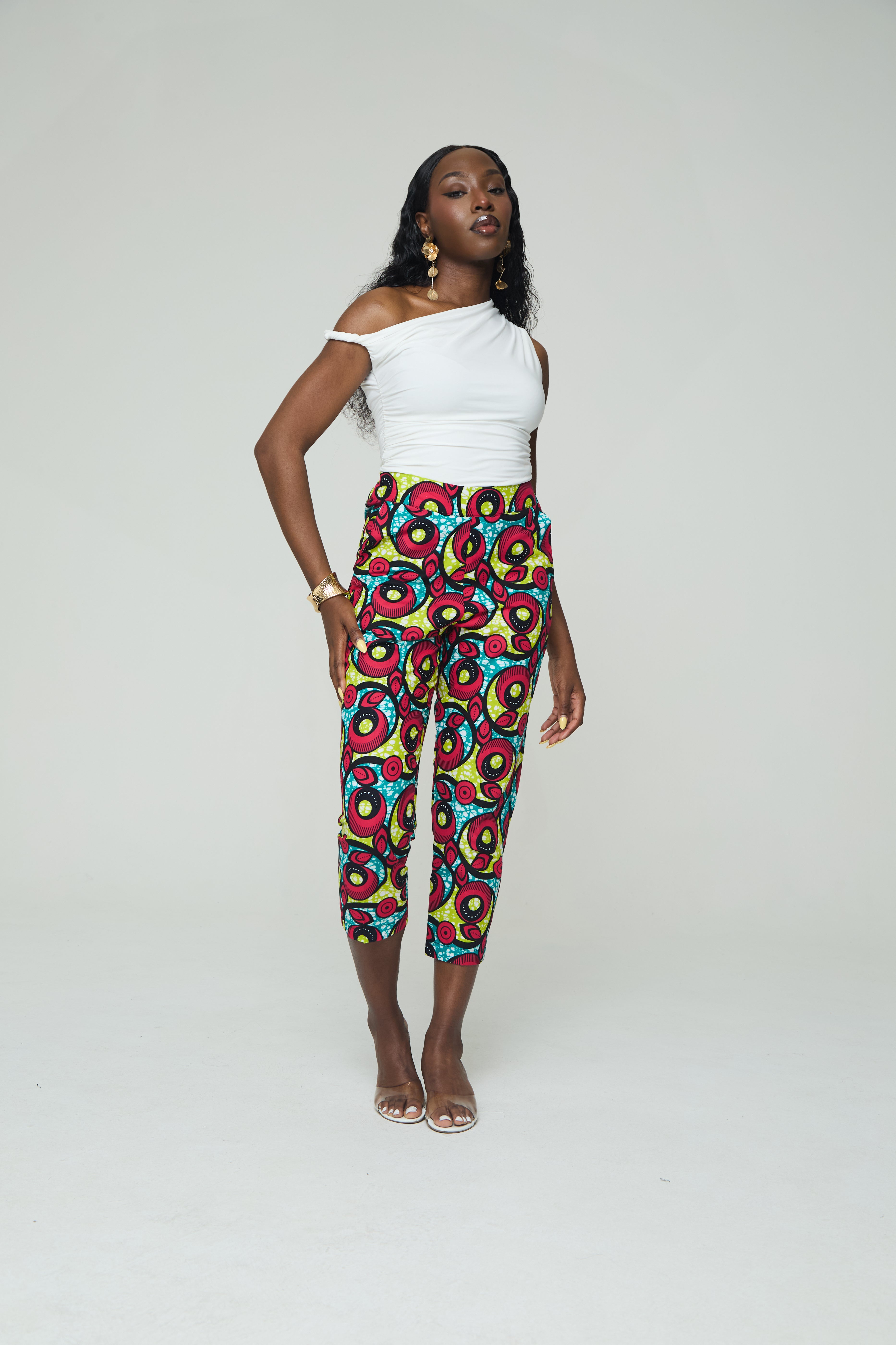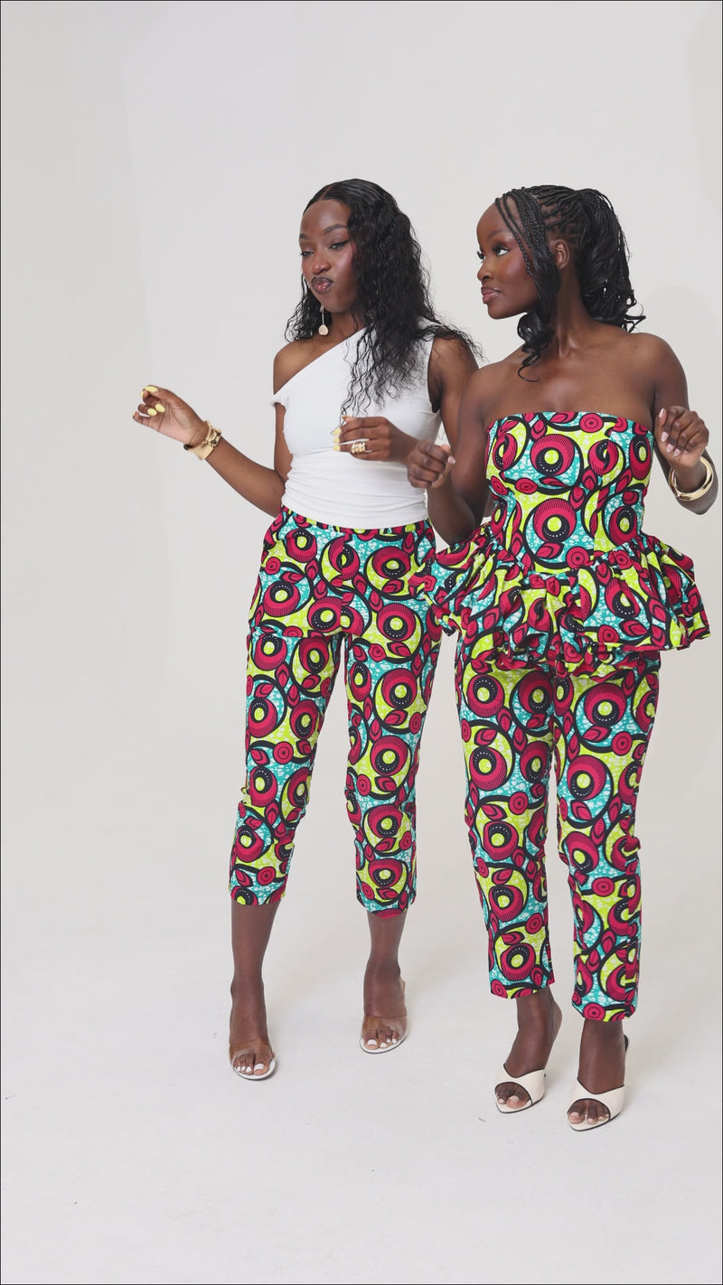 Turn heads in this Nigeria-made duo, showcasing a vibrant circular print in fuchsia, lime, and teal.