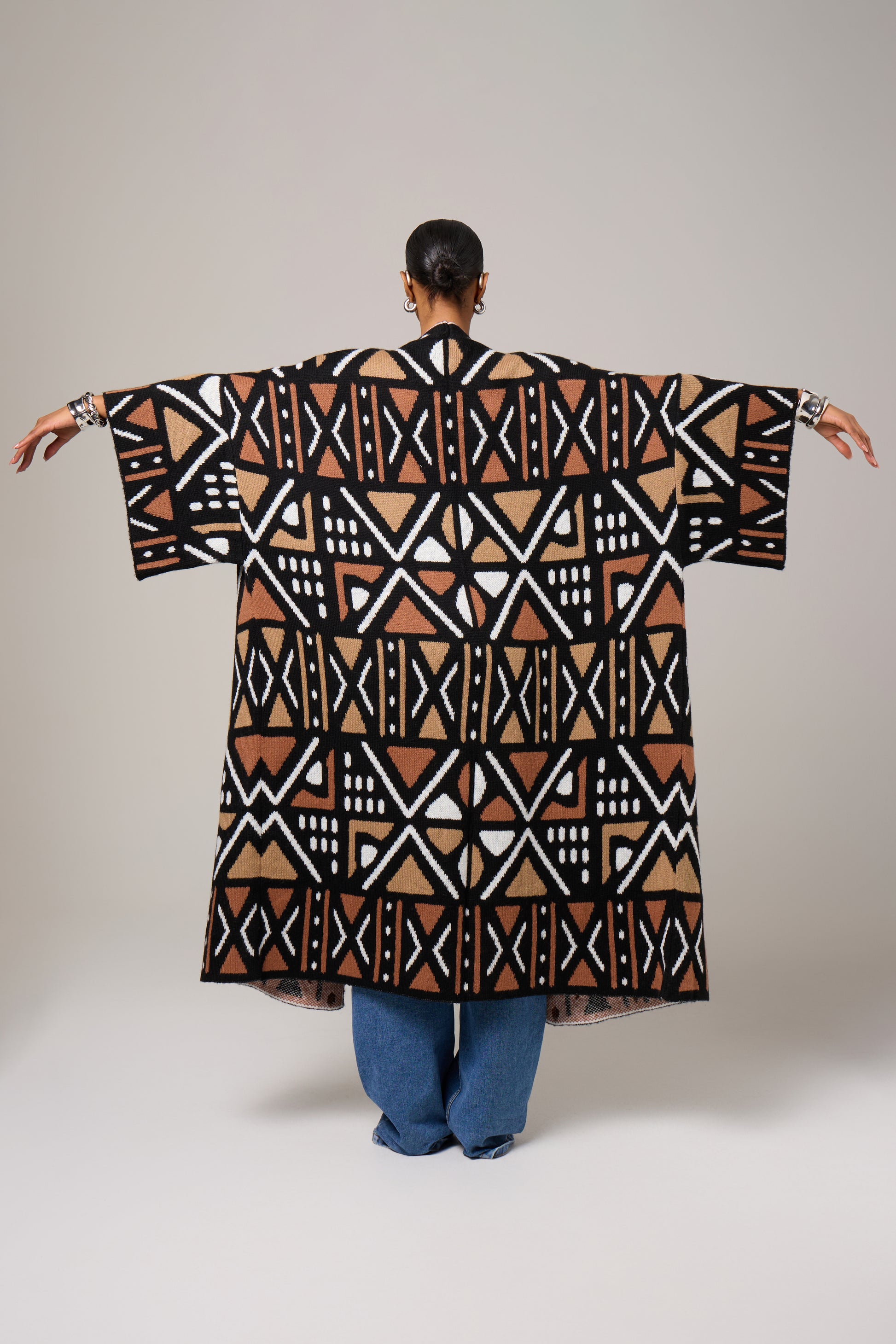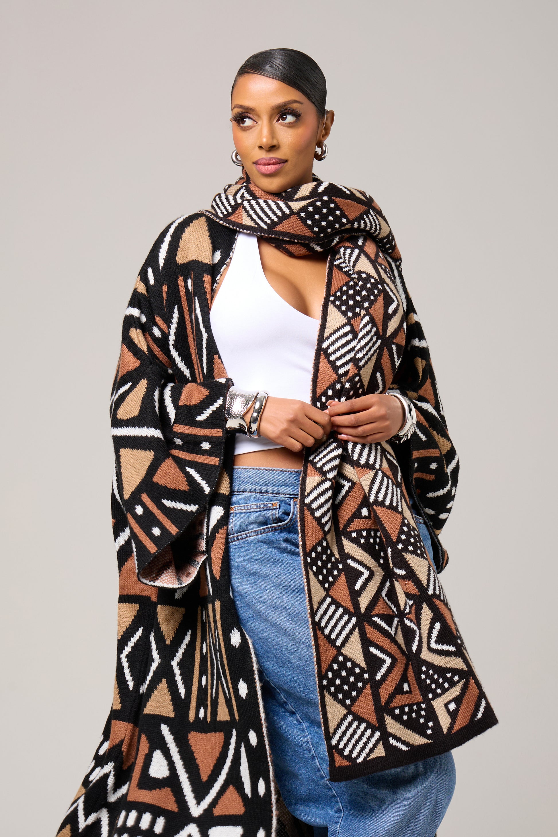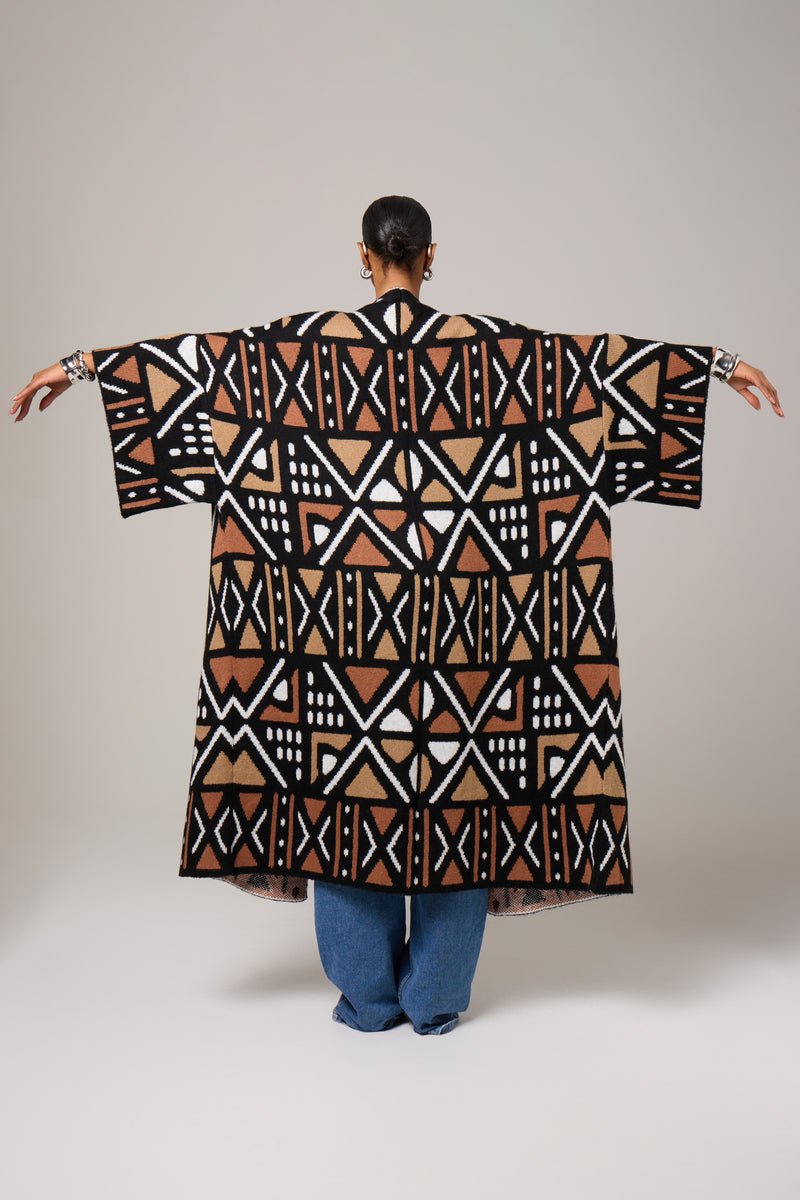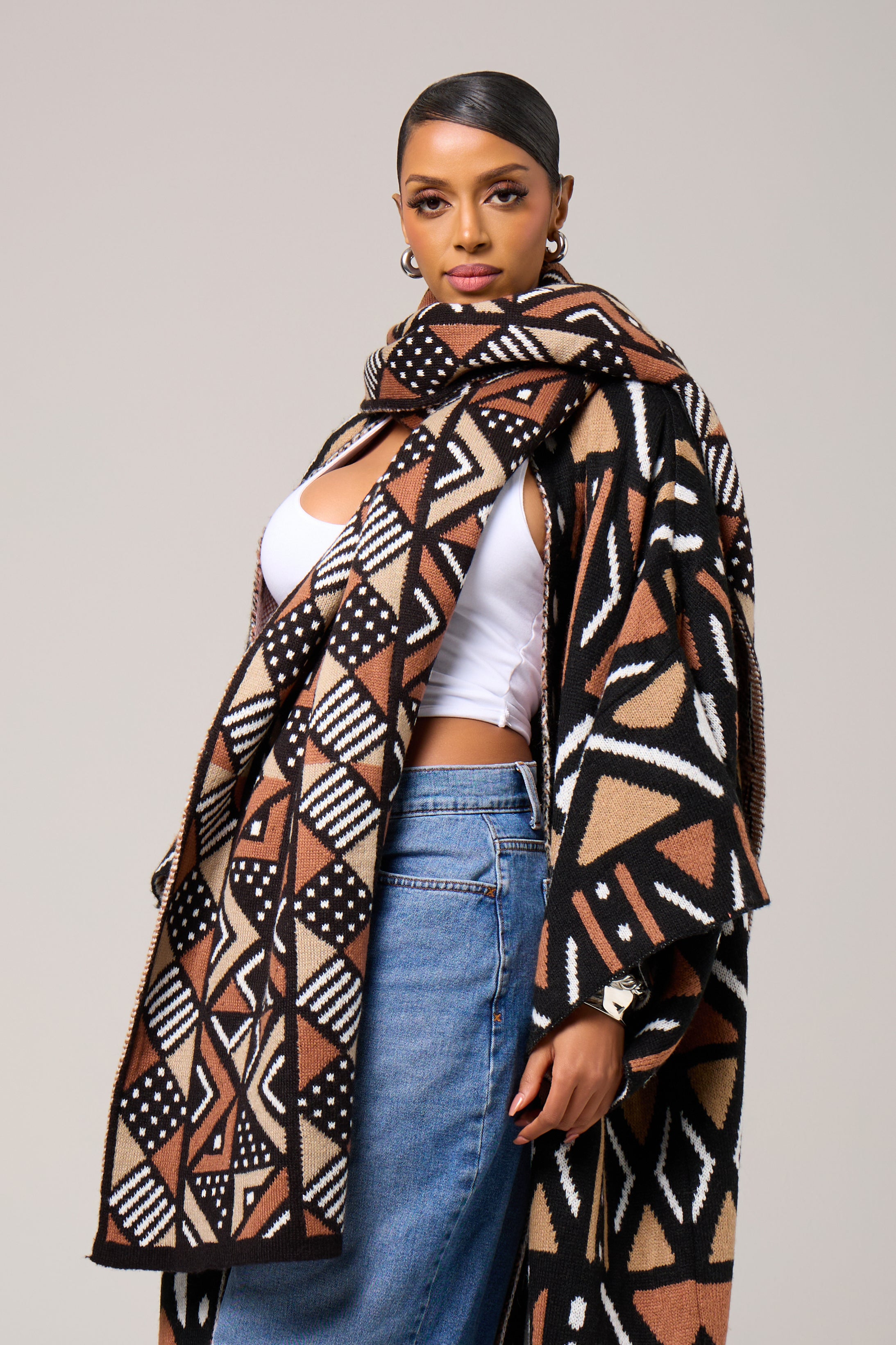 Wrap yourself in comfort and culture with this stunning long-line tribal cardigan, designed for Black woman who love expressing their heritage through bold and stylish outerwear. Featuring intricate geometric patterns in black, tan, orange, and cream, this cardigan is a modern take on traditional African motifs.