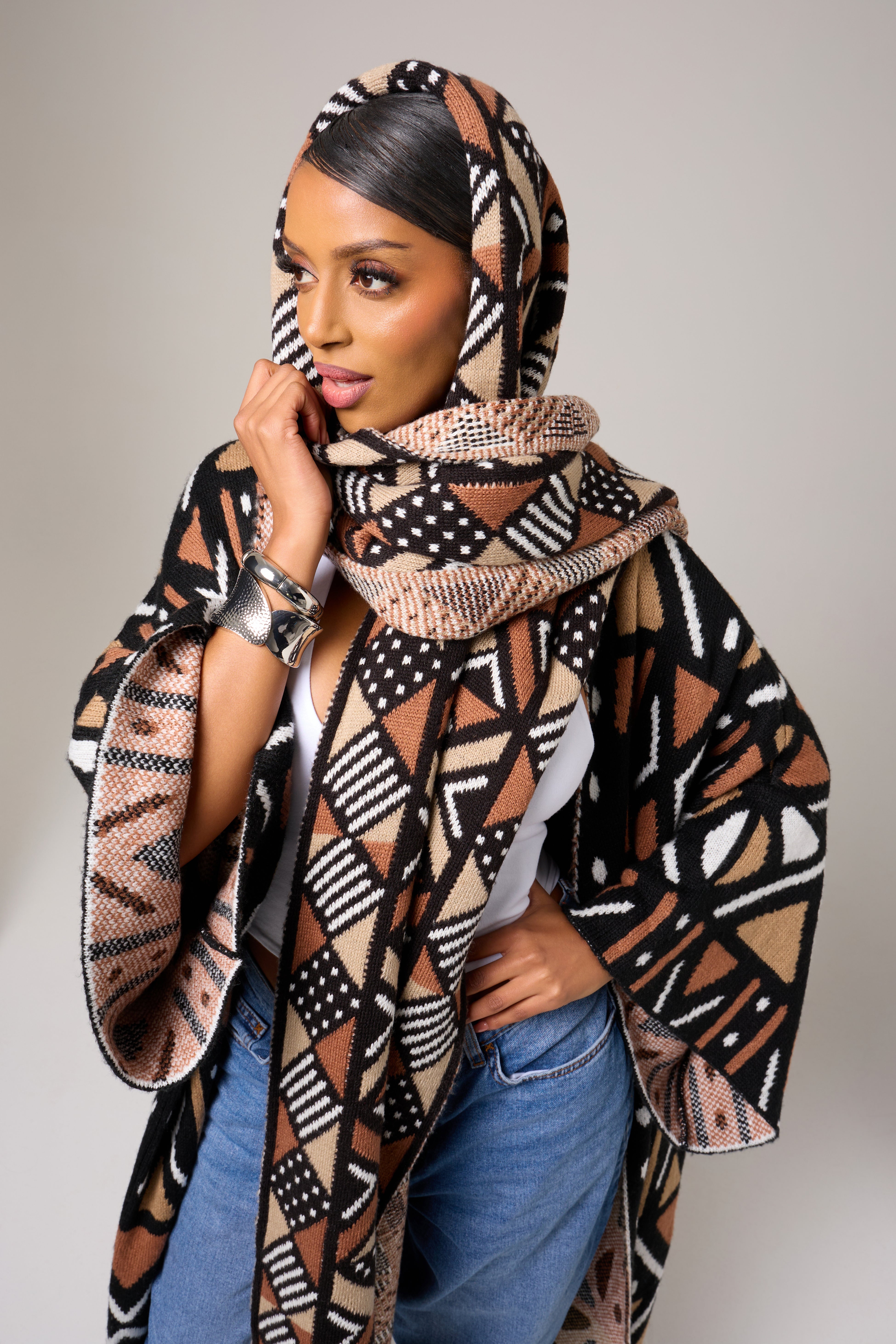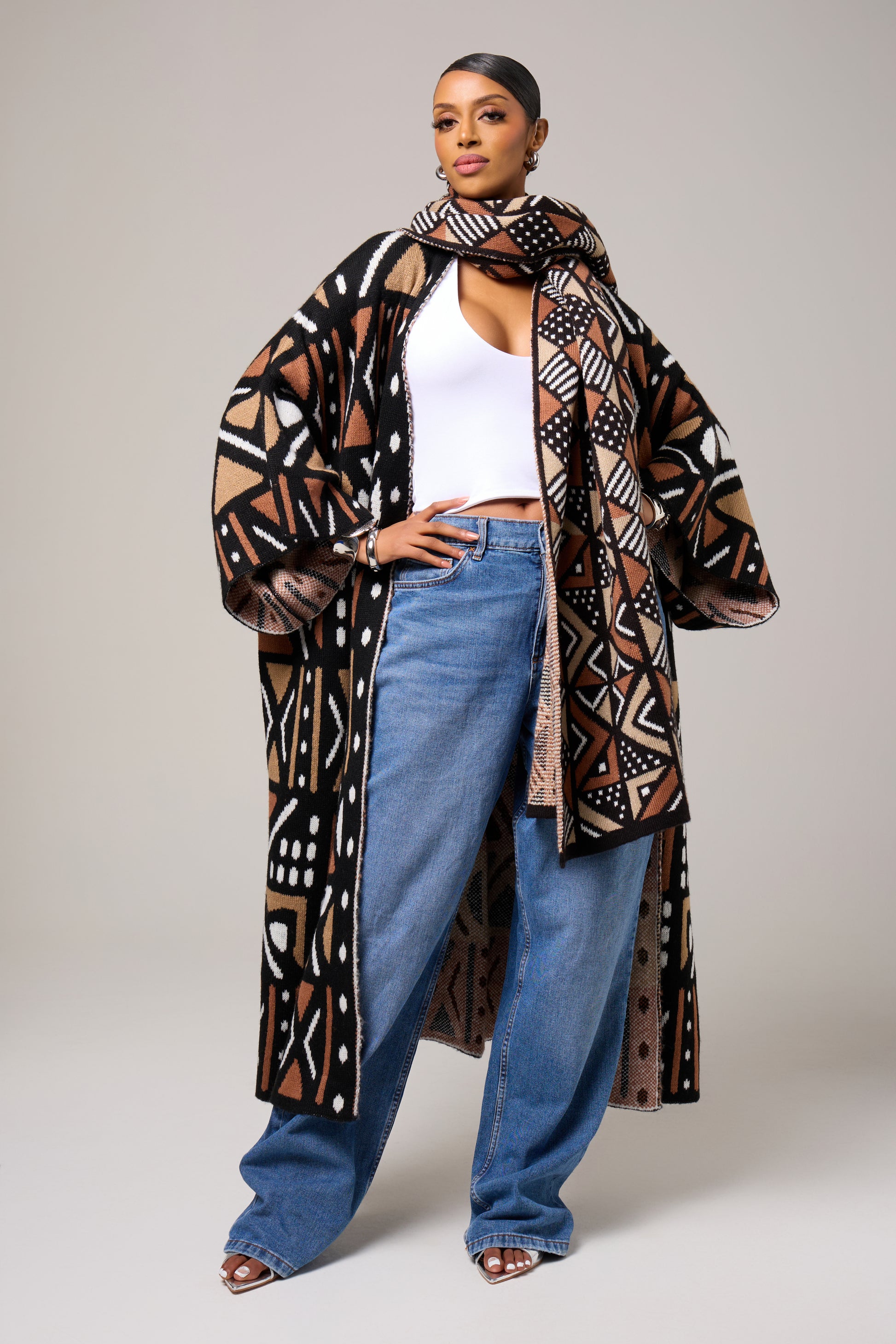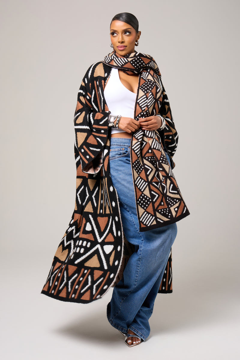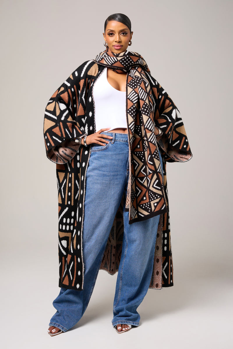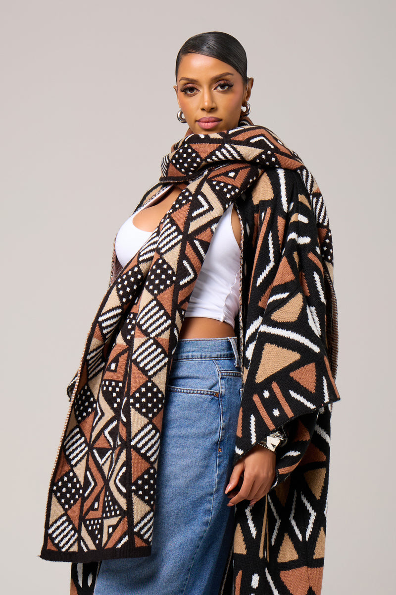 Wrap yourself in comfort and culture with this stunning long-line tribal cardigan, designed for Black woman who love expressing their heritage through bold and stylish outerwear. Featuring intricate geometric patterns in black, tan, orange, and cream, this cardigan is a modern take on traditional African motifs.