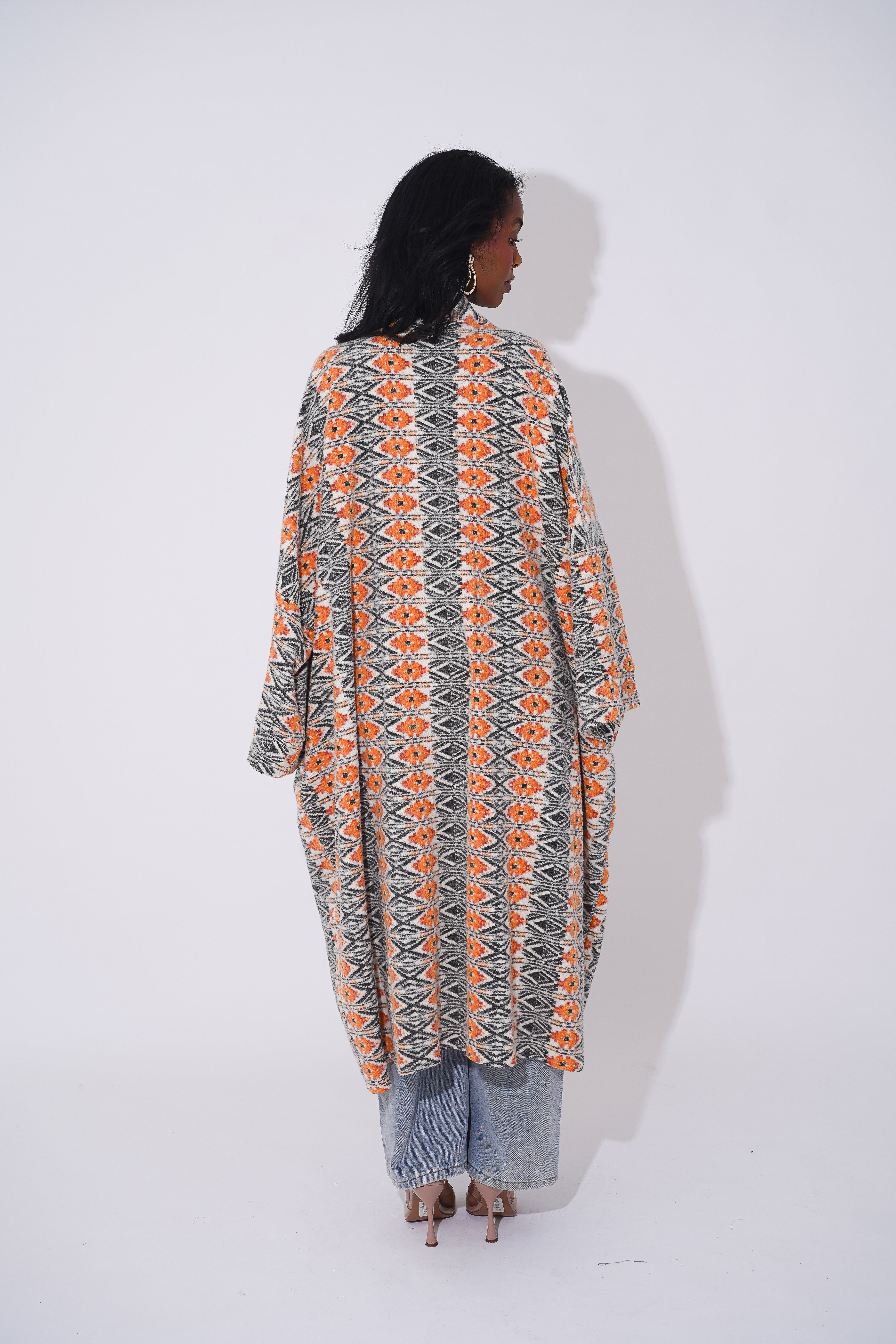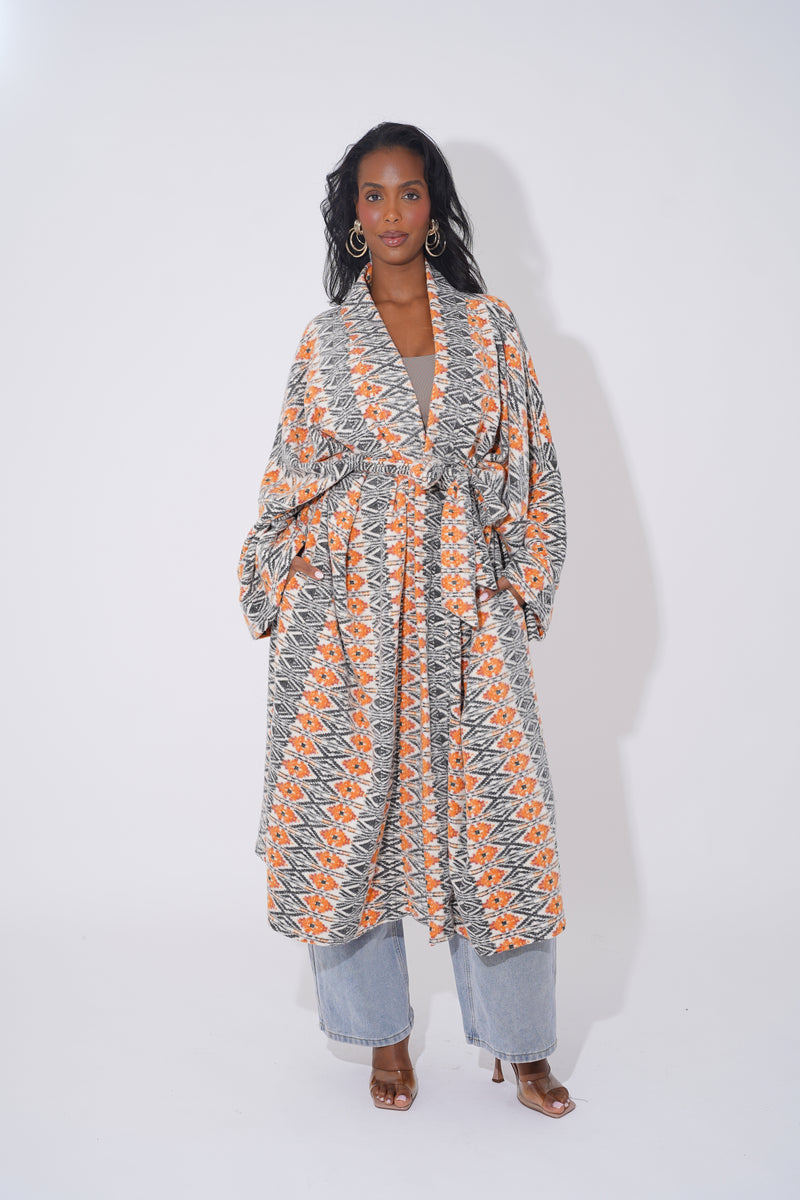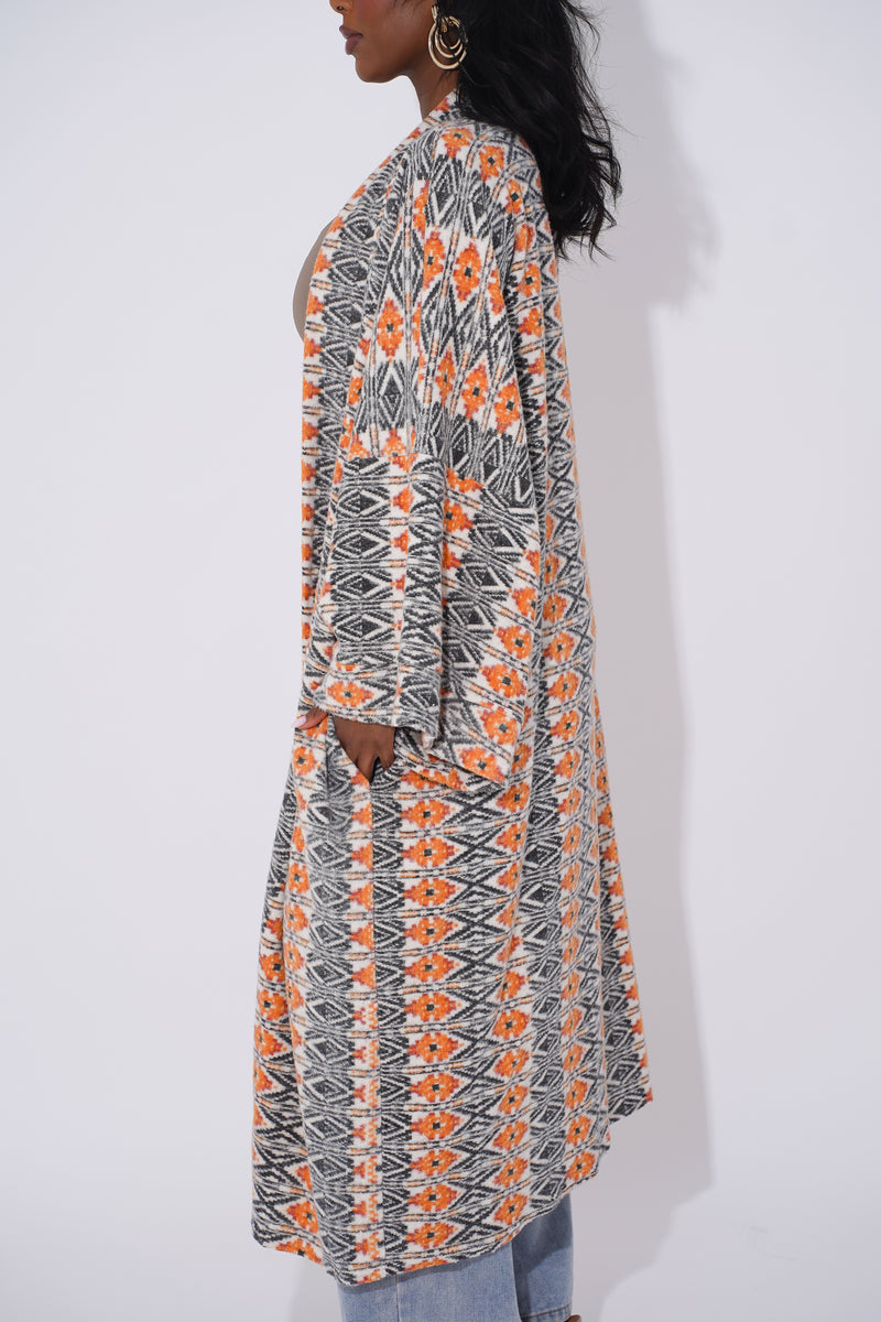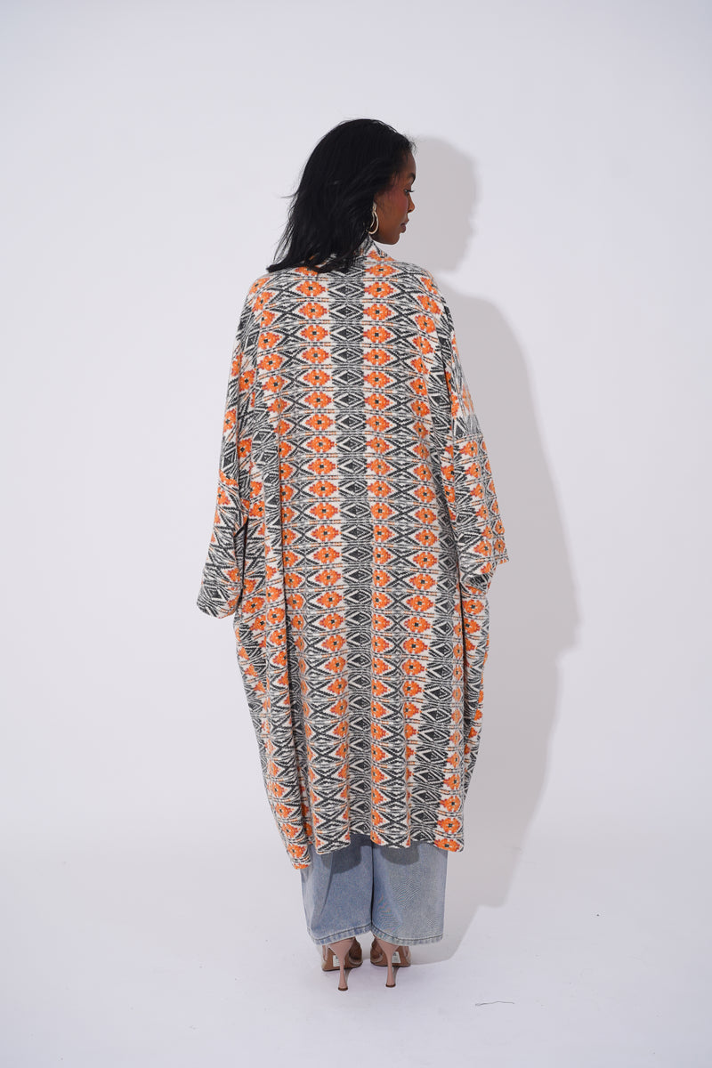 Wrap yourself in comfort and culture with this stunning long-line tribal cardigan, designed for Black woman who love expressing their heritage through bold and stylish outerwear. Featuring intricate geometric patterns in black, tan, orange, and cream, this cardigan is a modern take on traditional African motifs.