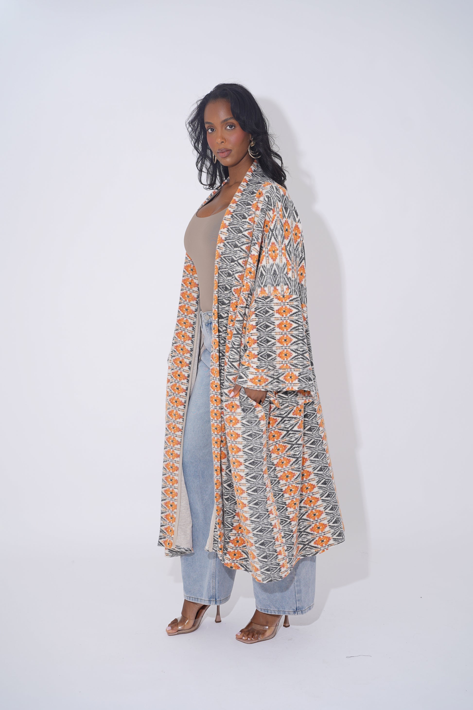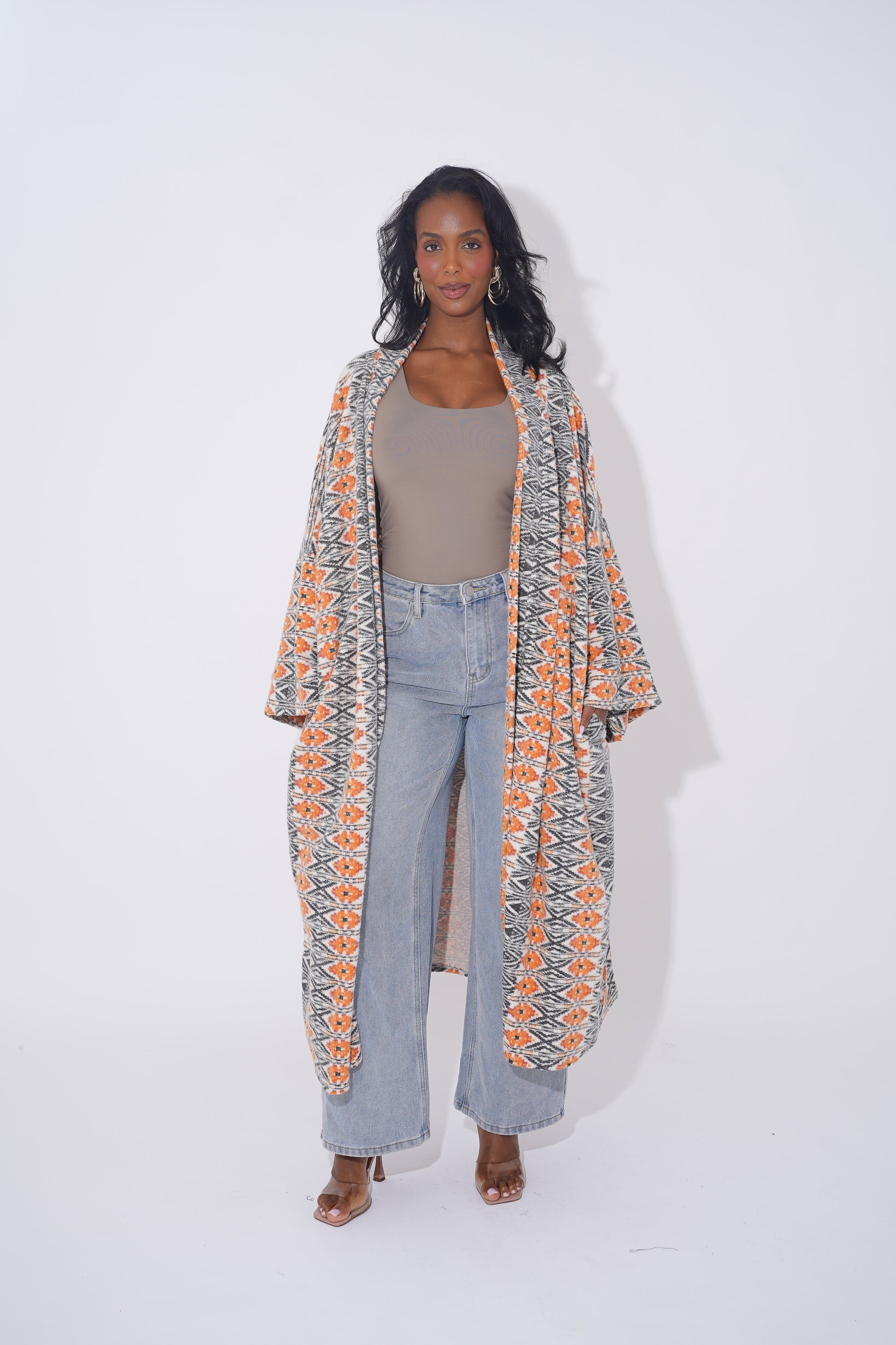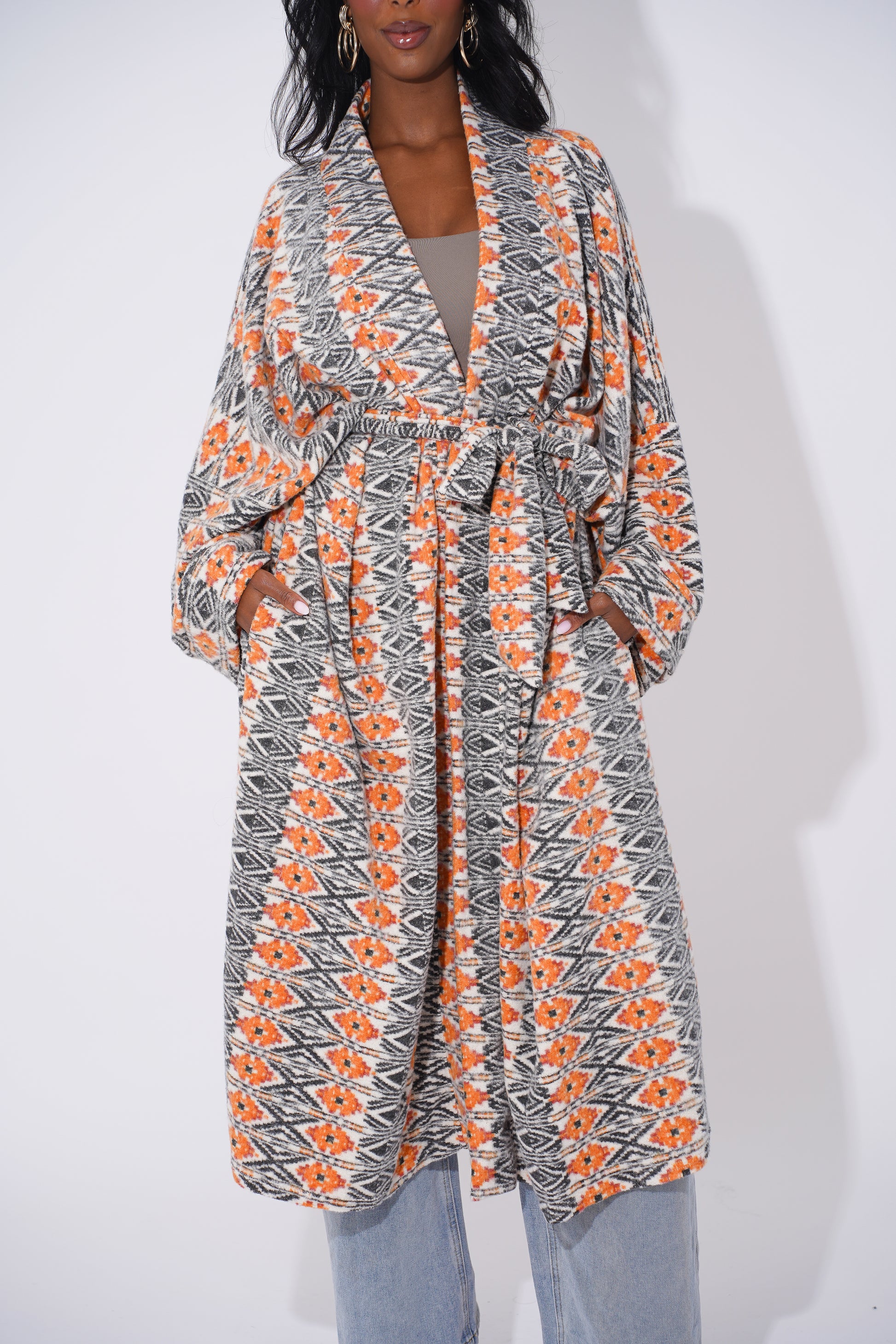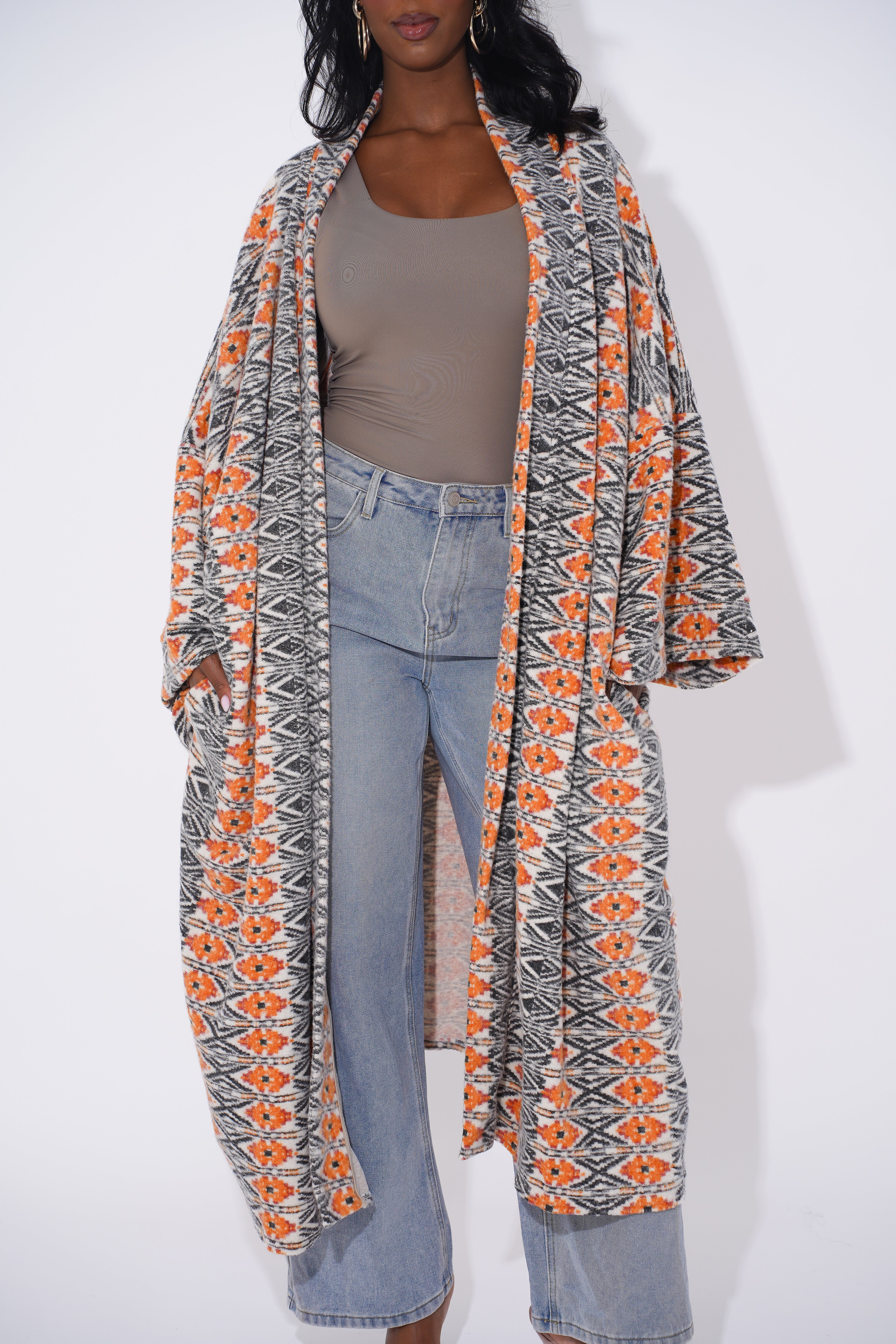 Wrap yourself in comfort and culture with this stunning long-line tribal cardigan, designed for Black woman who love expressing their heritage through bold and stylish outerwear. Featuring intricate geometric patterns in black, tan, orange, and cream, this cardigan is a modern take on traditional African motifs.