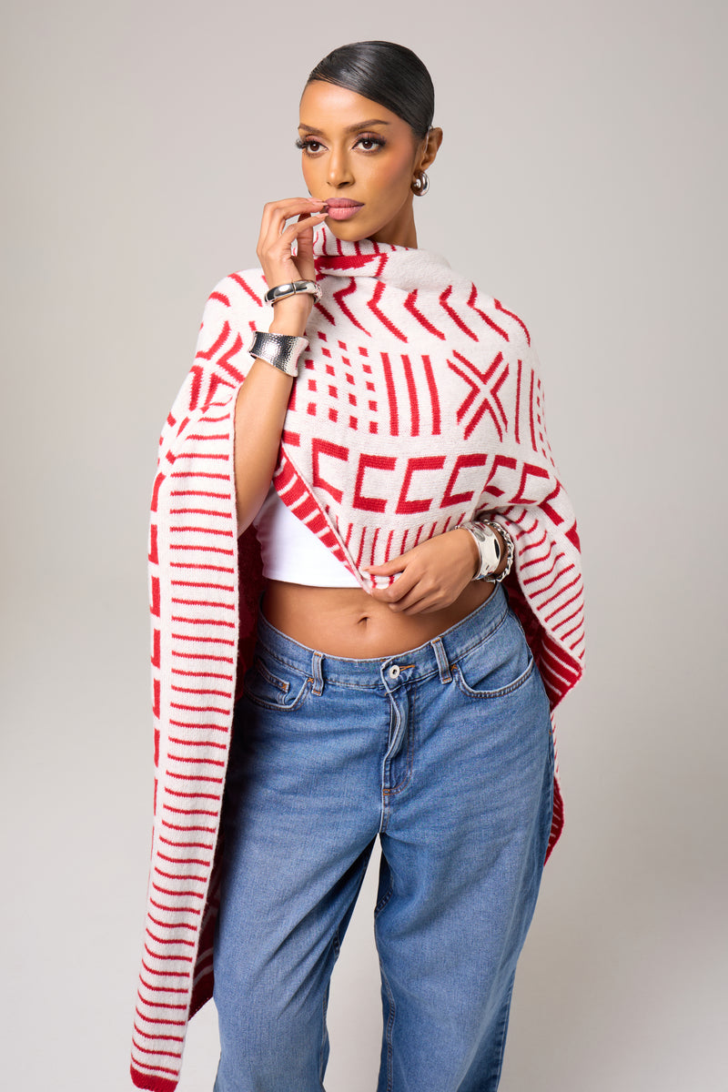 The Nubian Queen Scarf is a refined essential that blends softness with striking design. Its tactile knit and bold motifs create a look that feels powerful yet approachable.
