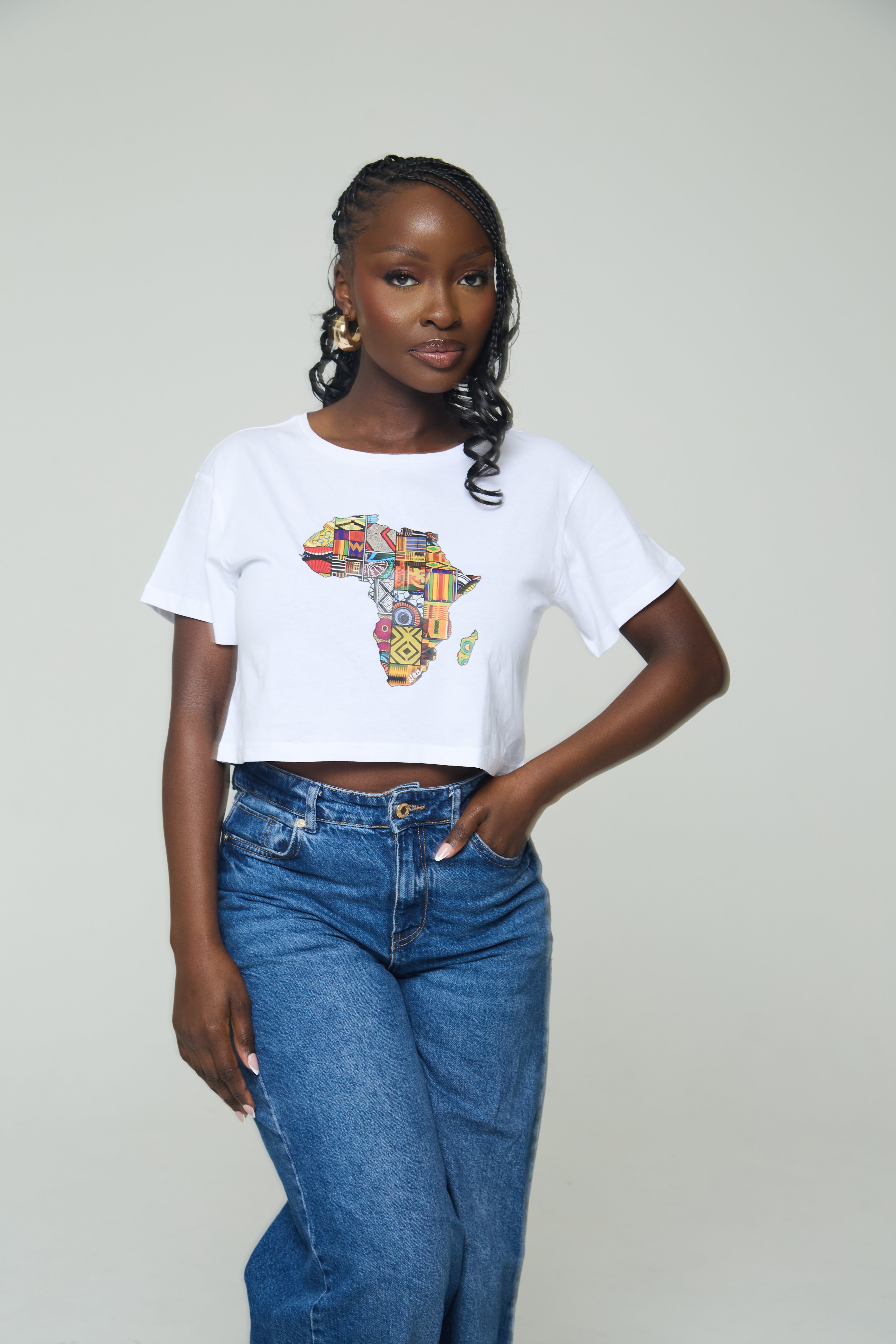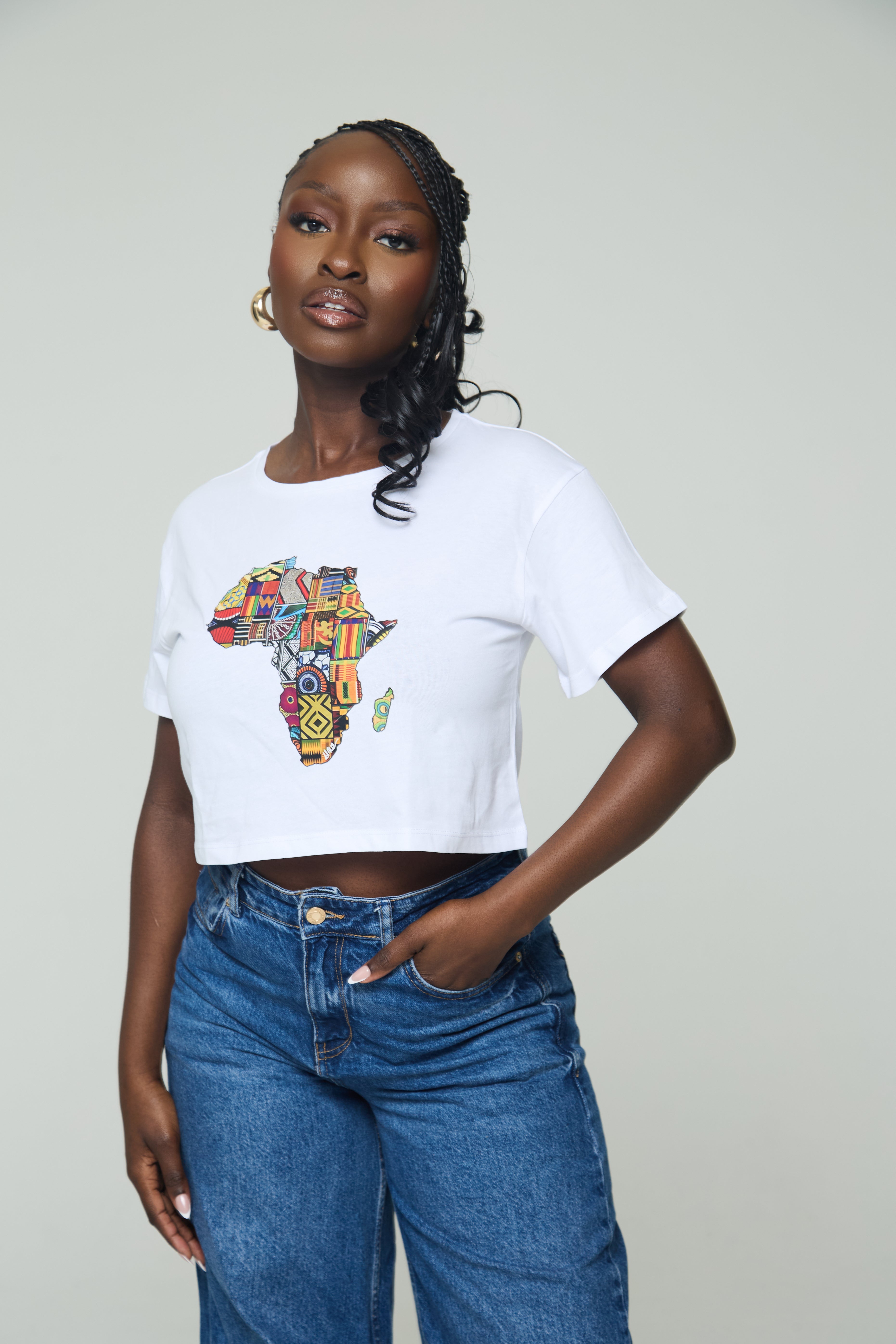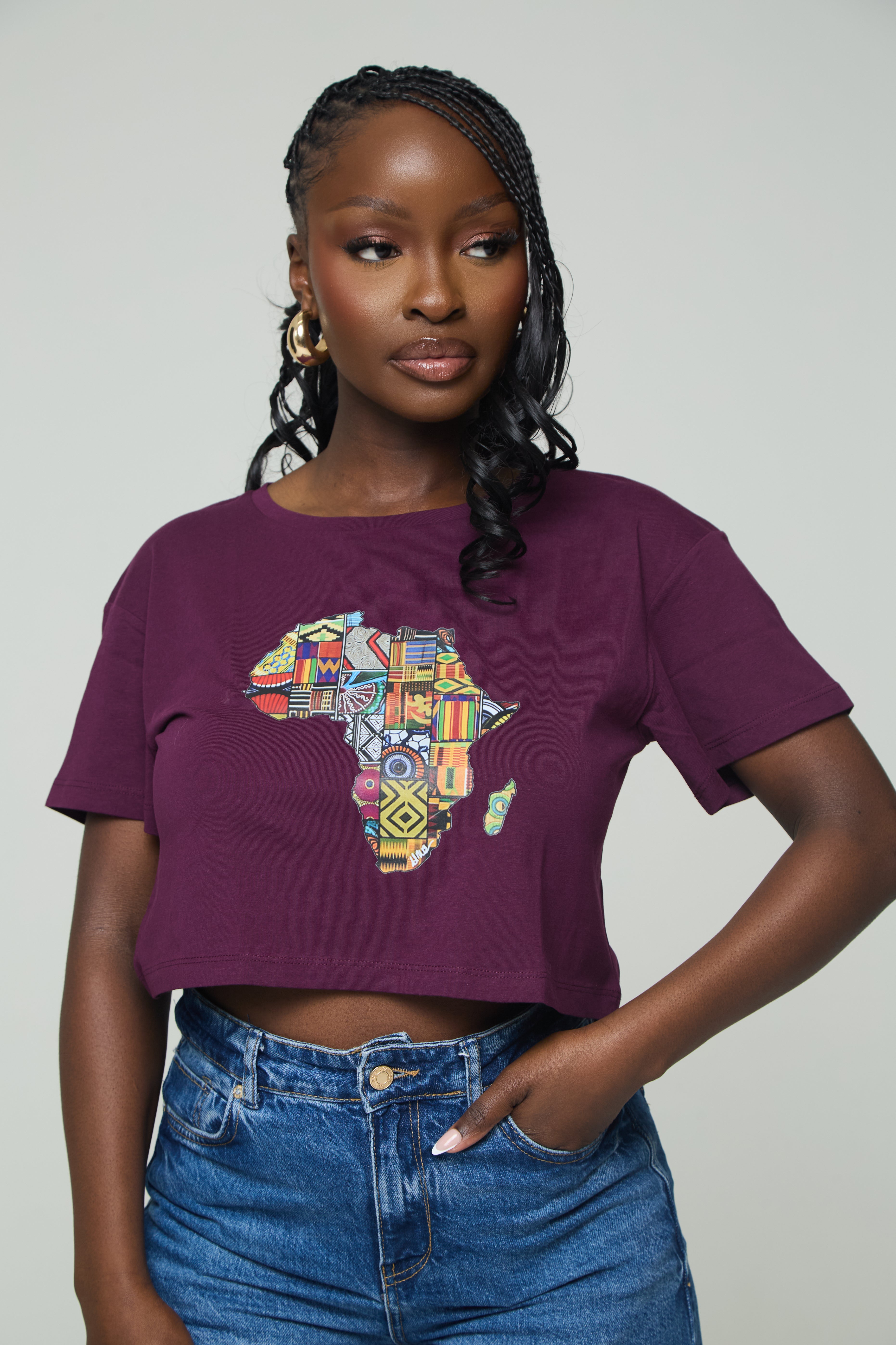 Celebrate African heritage in ultra-soft 100% cotton. A vibrant, patchwork-inspired map of Africa turns any outfit into a statement—pair it with high-rise jeans or a flowy skirt.