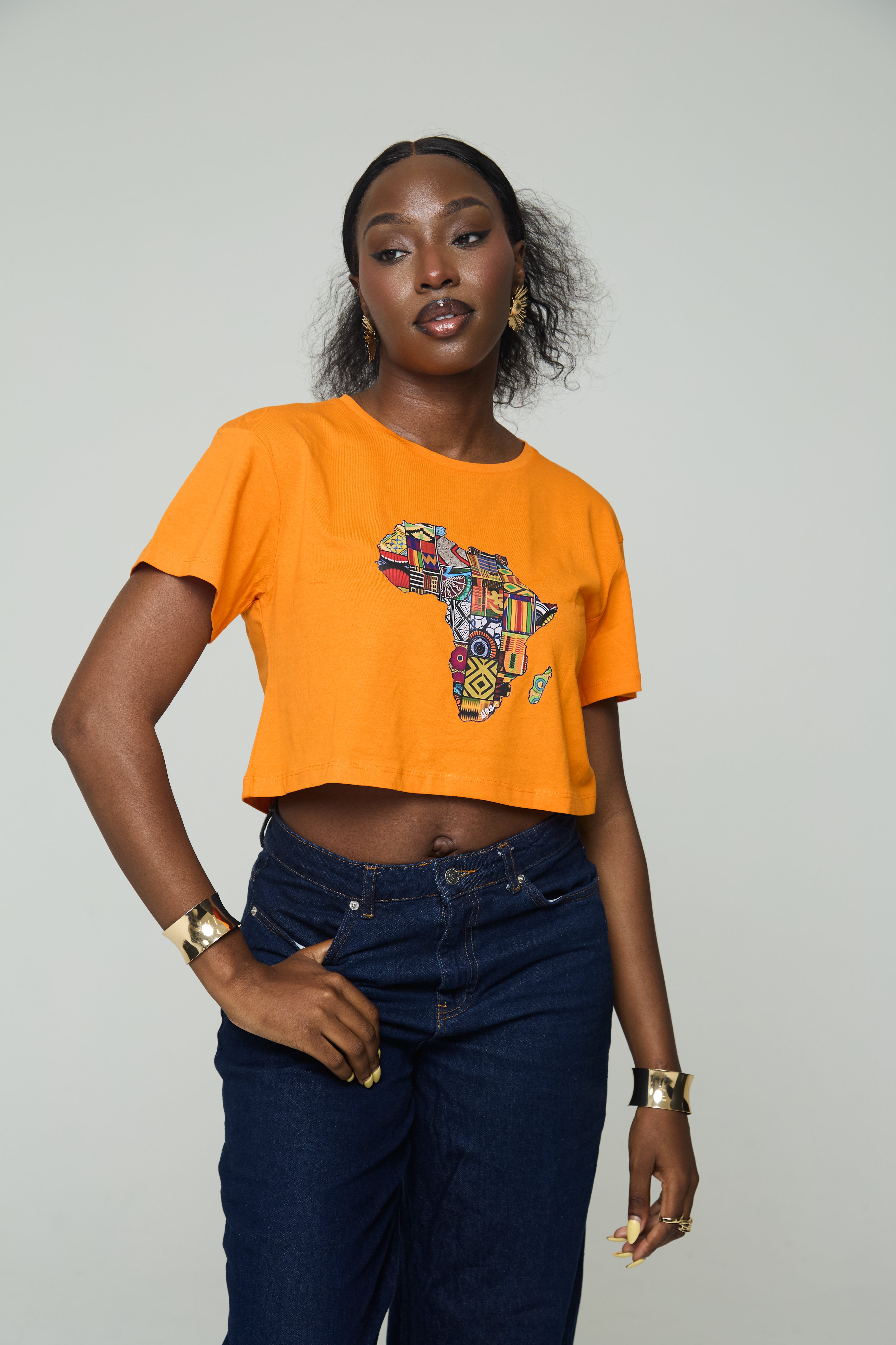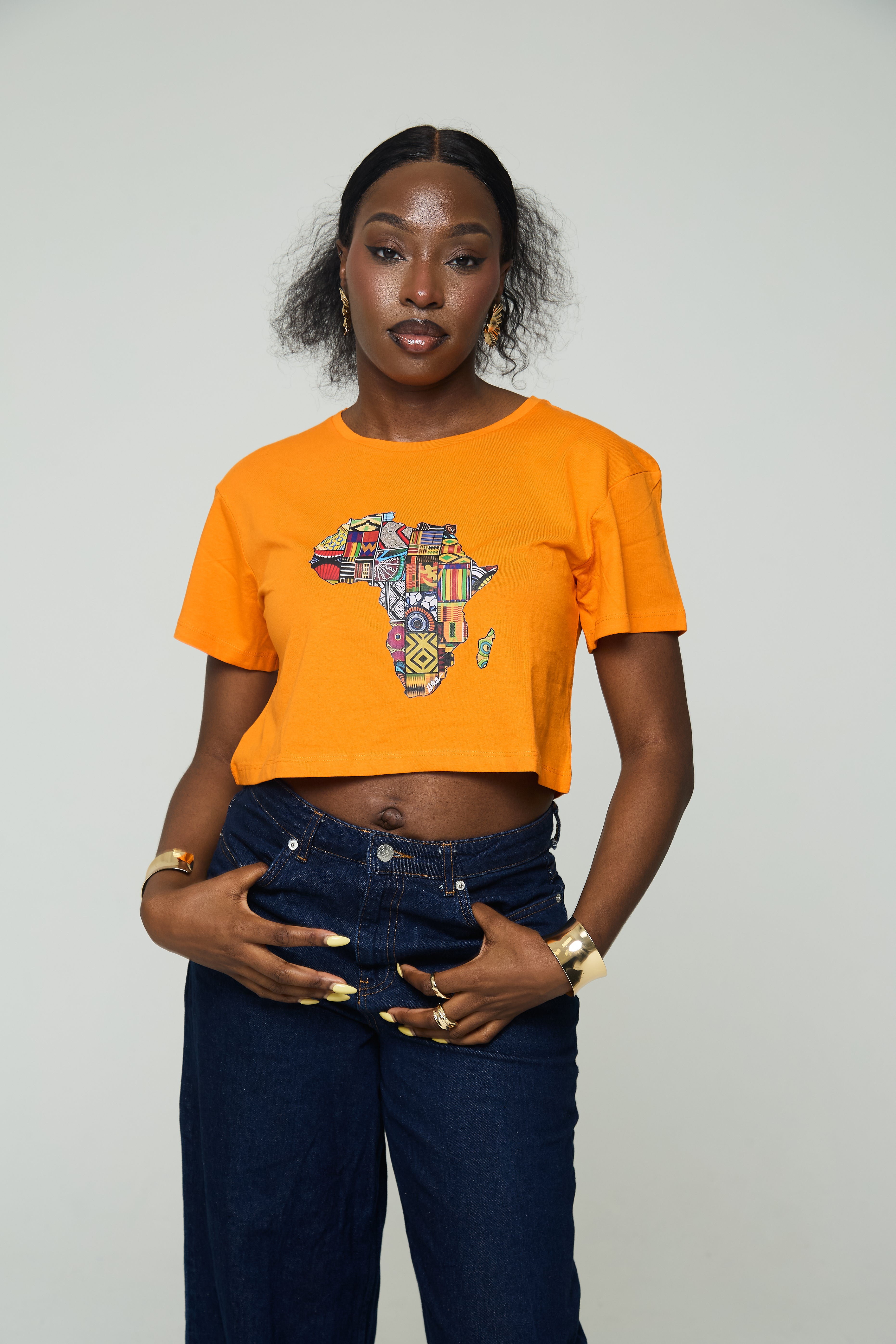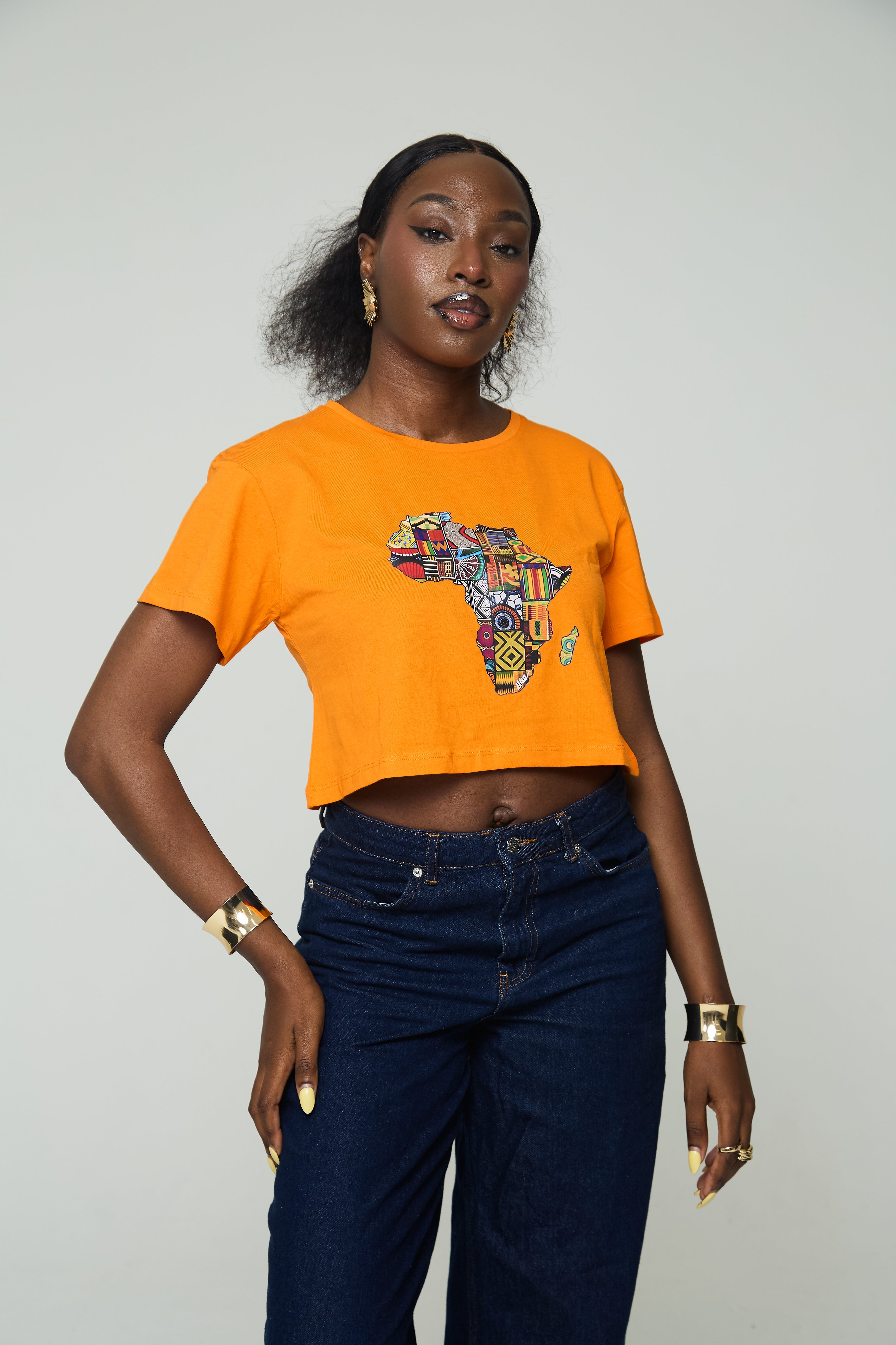Celebrate African heritage in ultra-soft 100% cotton. A vibrant, patchwork-inspired map of Africa turns any outfit into a statement—pair it with high-rise jeans or a flowy skirt.