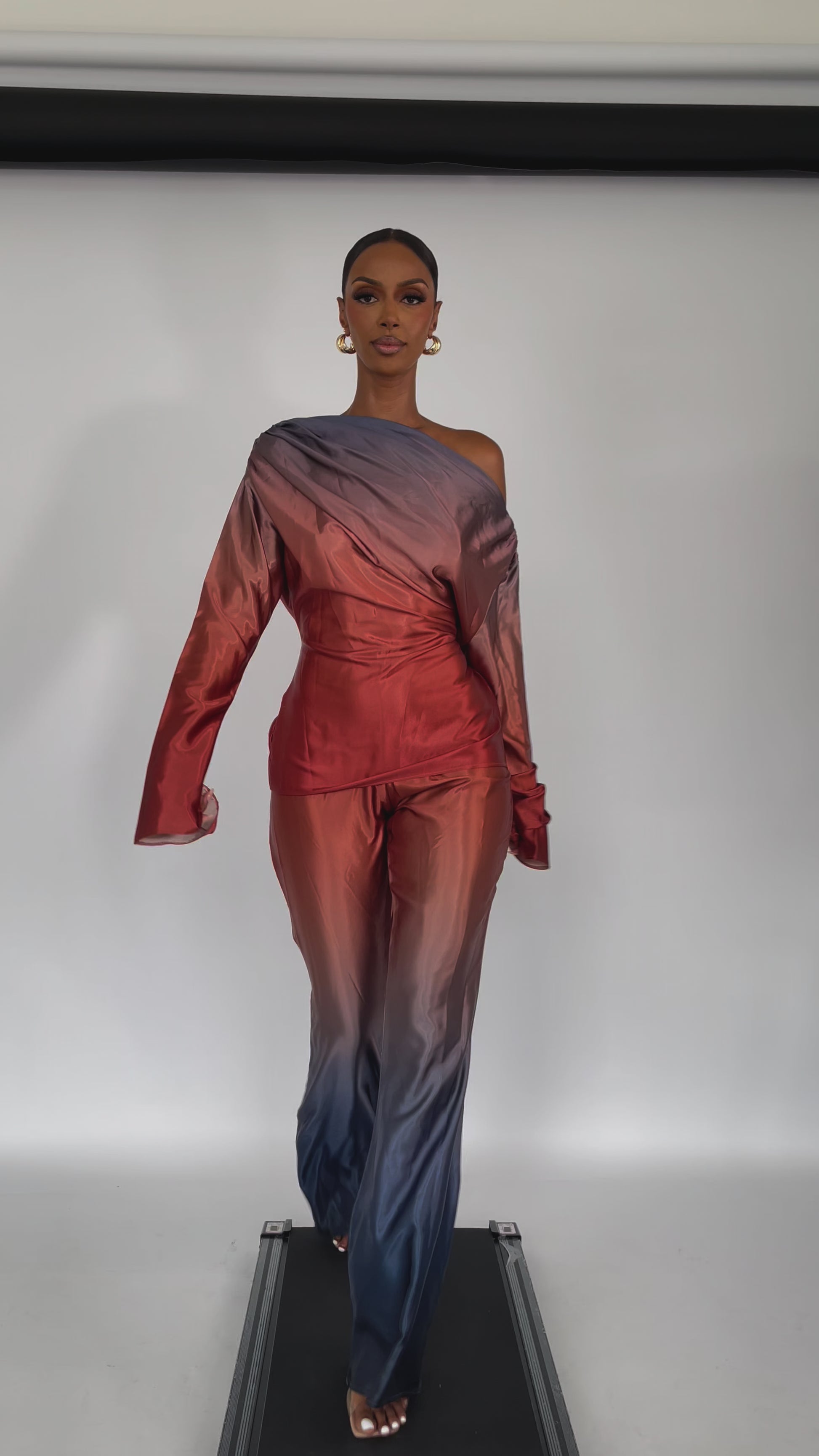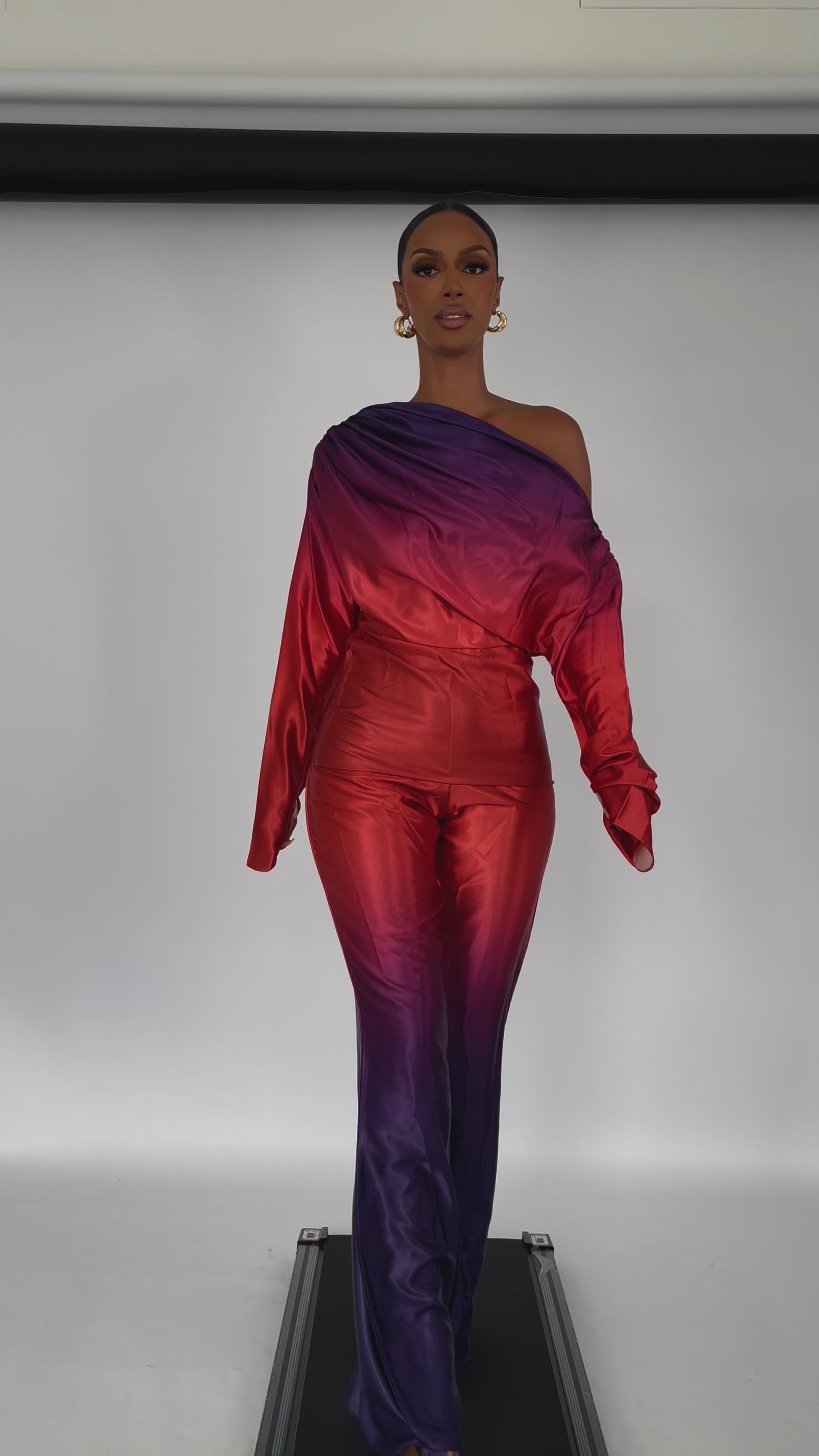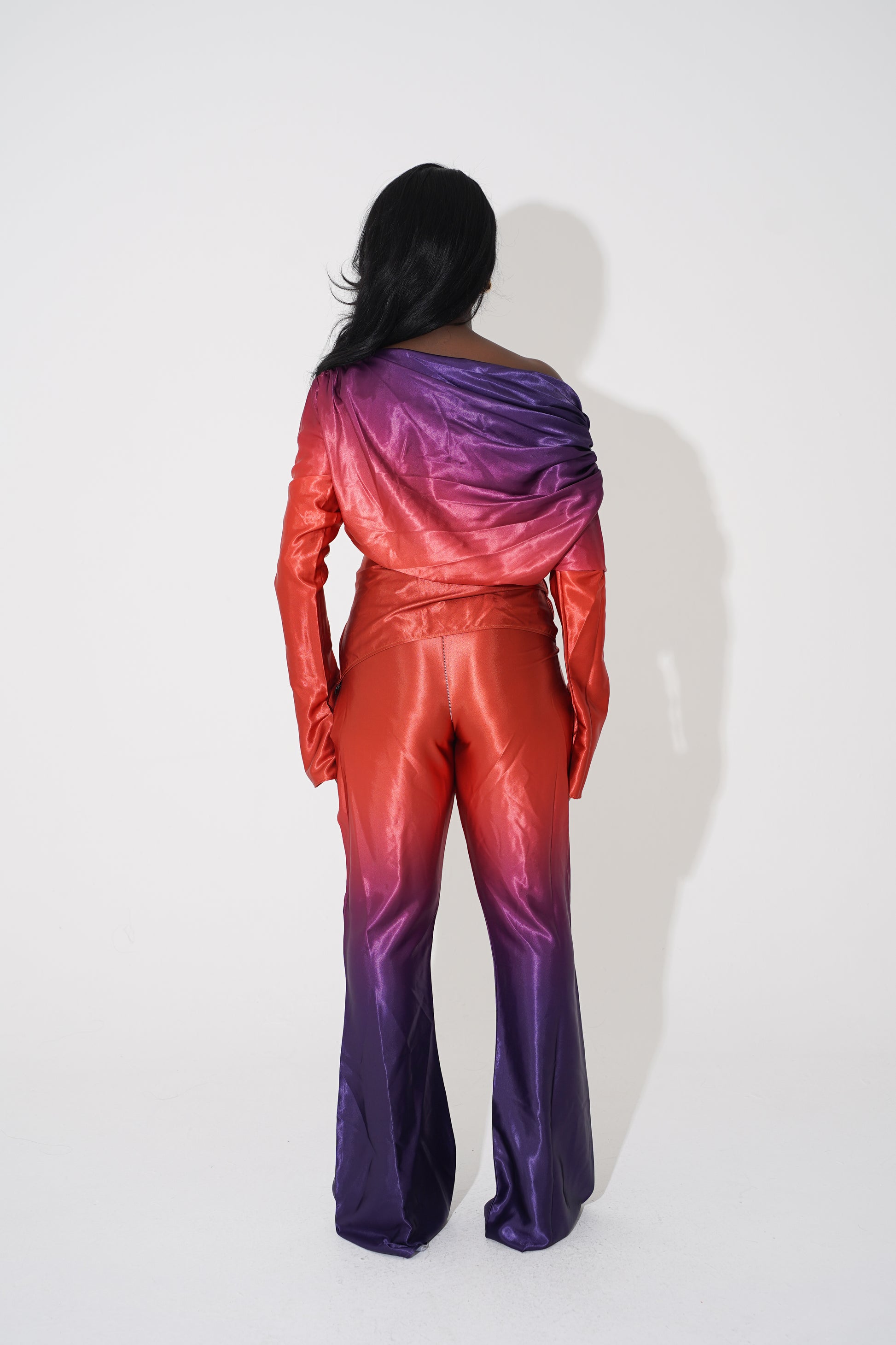 Turn heads with our Ombre Silk Top & Flared Trousers Set, designed to bring out your confidence and style. Featuring a stunning ombre effect that transitions from rich oranges to deep purples, this set is a show-stopper for any occasion.