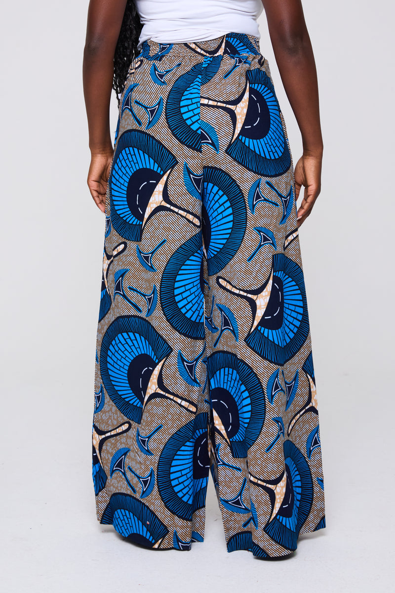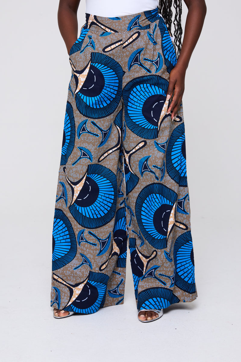 Details: Vibrant circular print, draped sleeves, side pockets on trousers