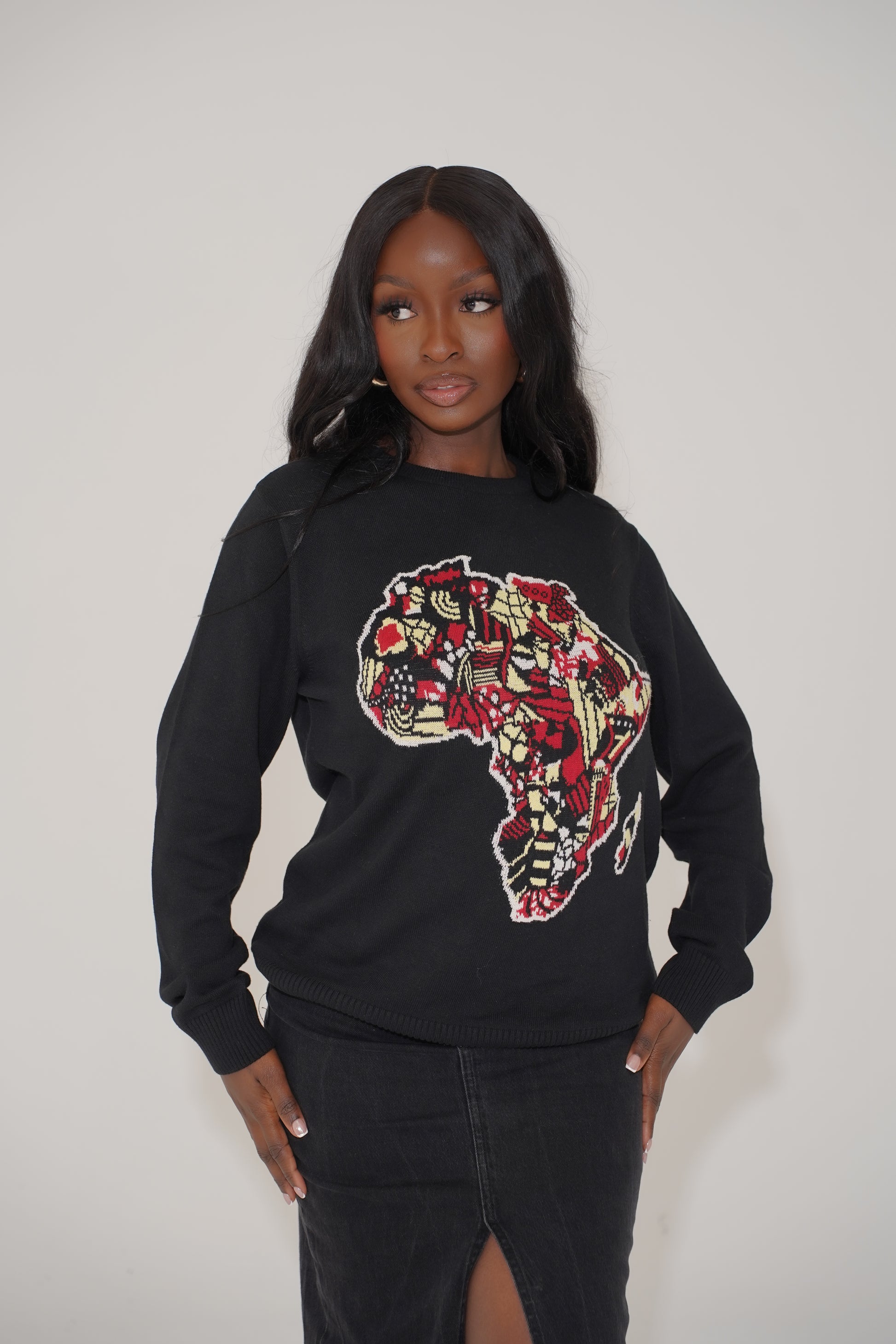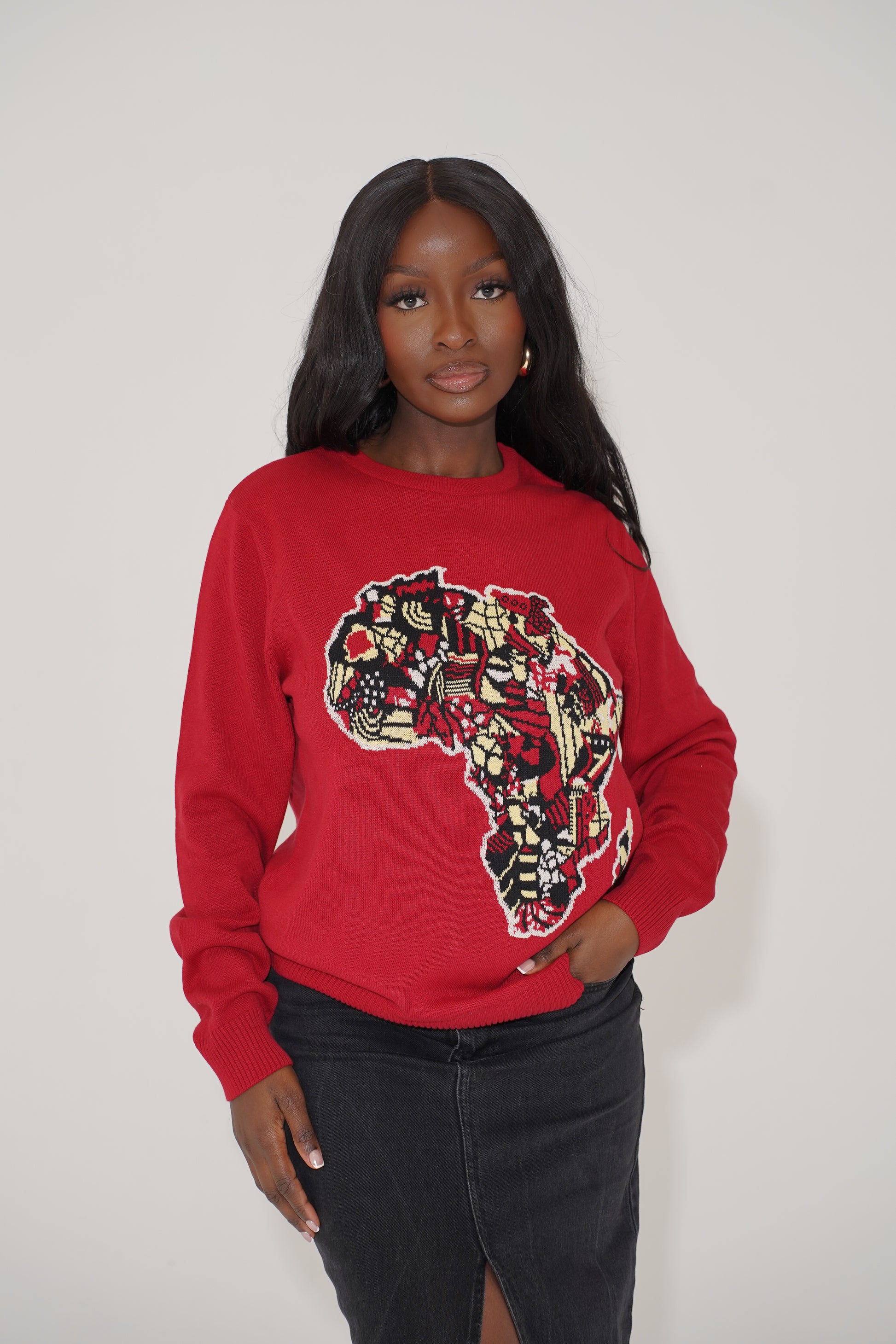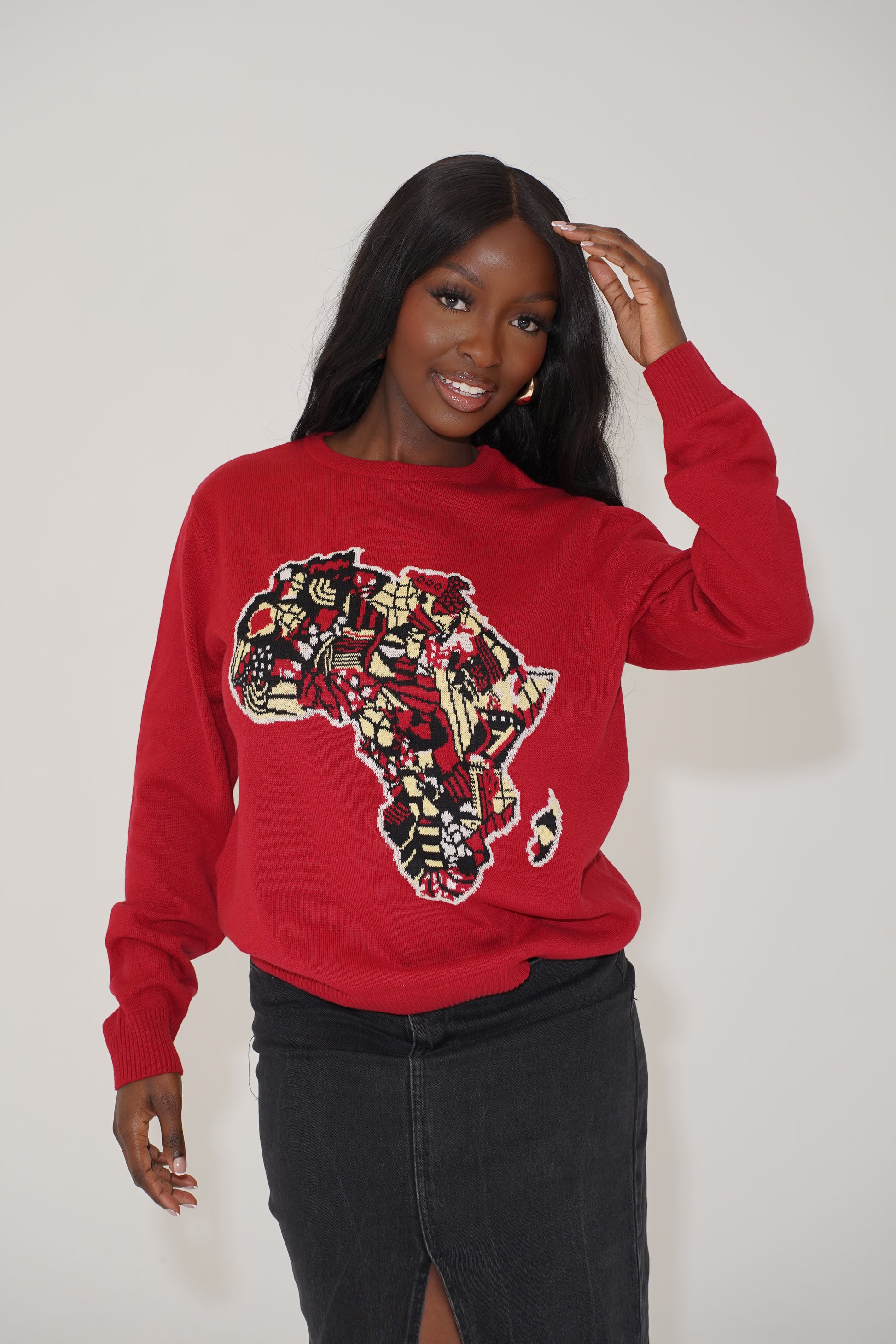 Stay warm, stylish, and connected to your roots with the African Heritage Knitted Sweatshirt. Designed for both men and women, this unisex sweater features a beautifully knitted African map design, showcasing intricate patterns inspired by traditional African textiles. The bold red, black, and gold tones create a striking visual contrast, making this piece a true statement of culture and pride.