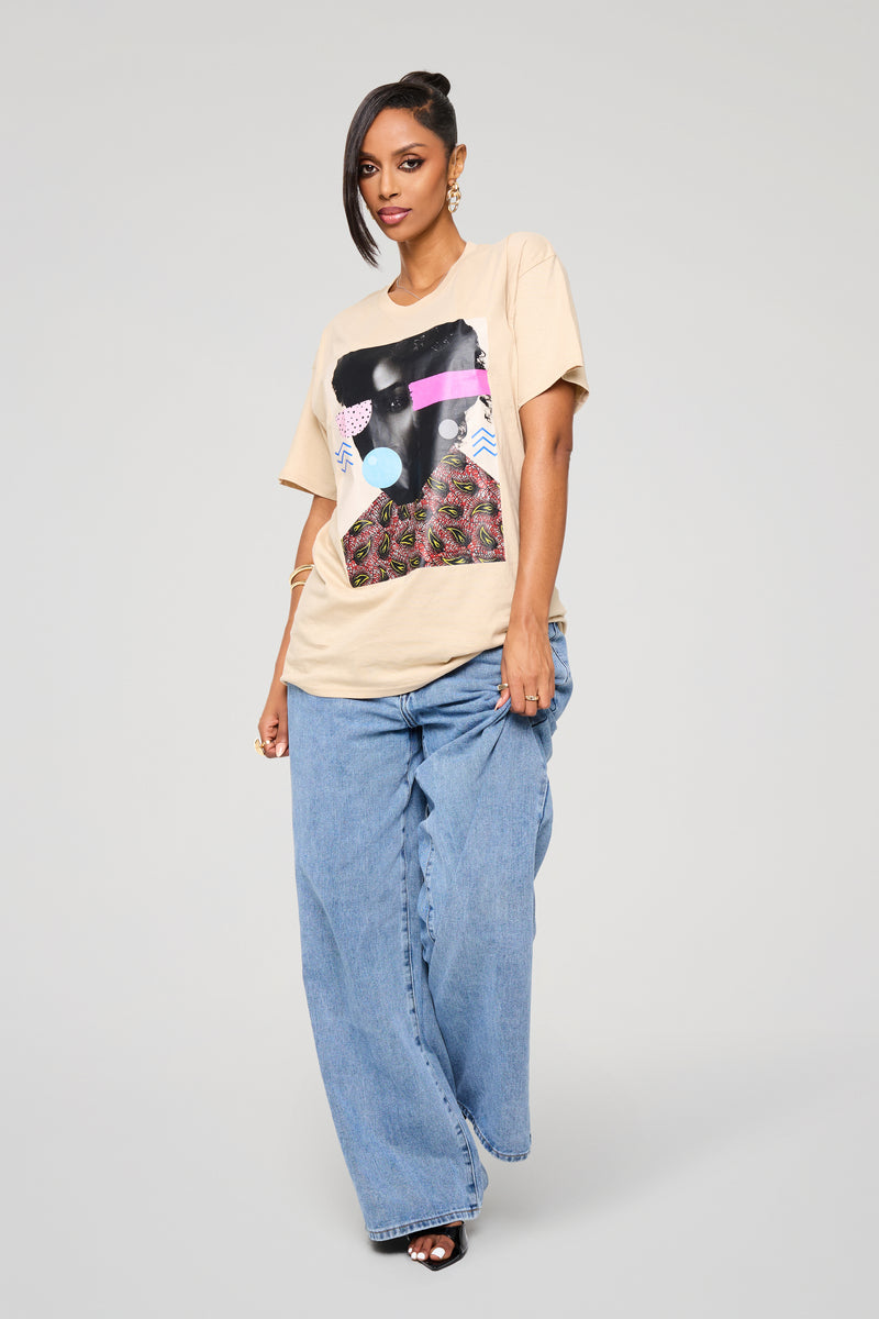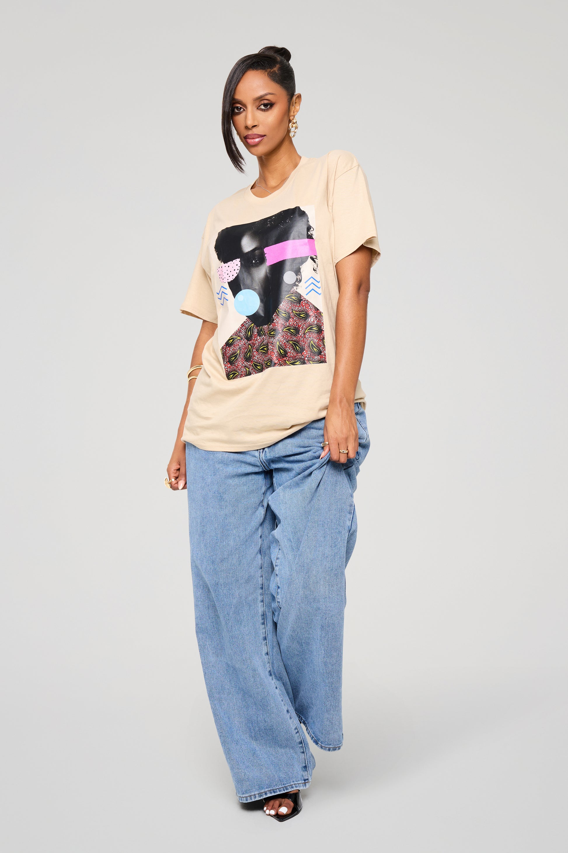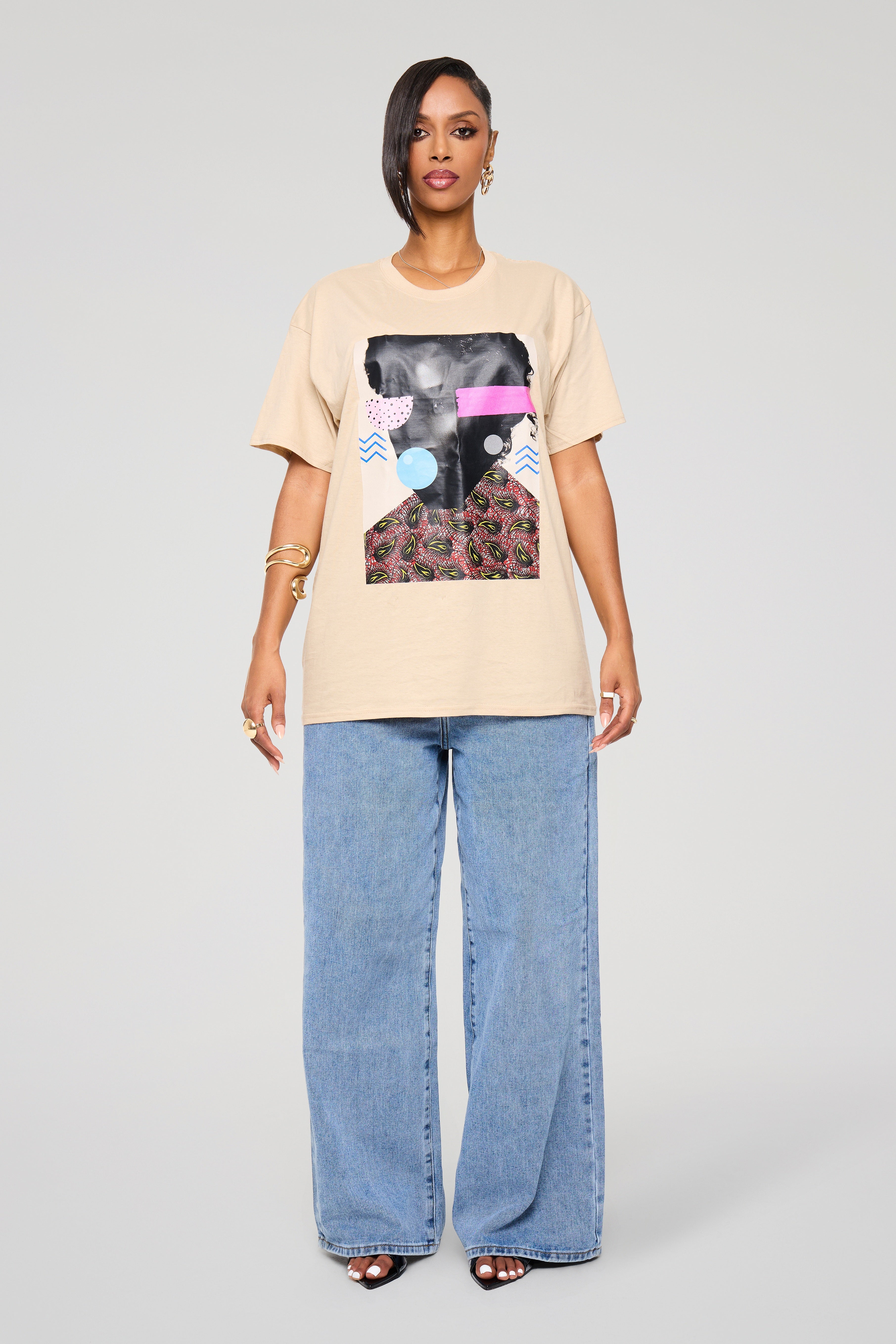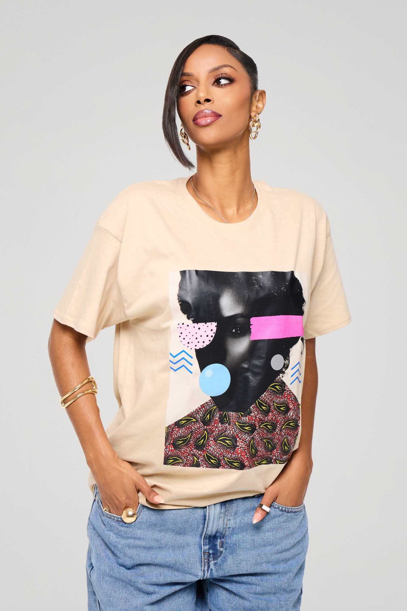 This relaxed-fit T-shirt features a striking graphic print celebrating African beauty and individuality. Perfect for everyday wear with jeans, skirts, or layered under a blazer for an elevated streetwear look.