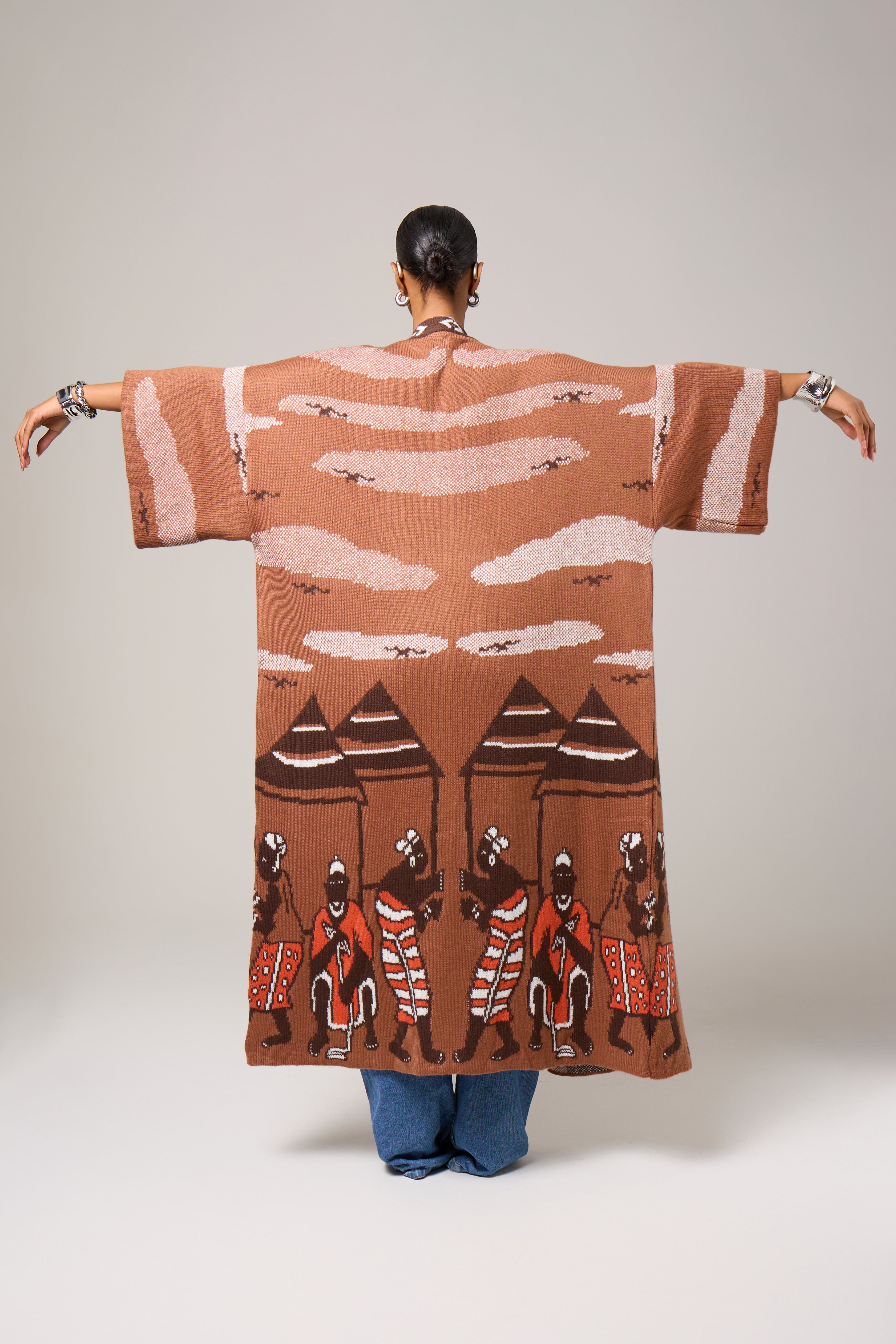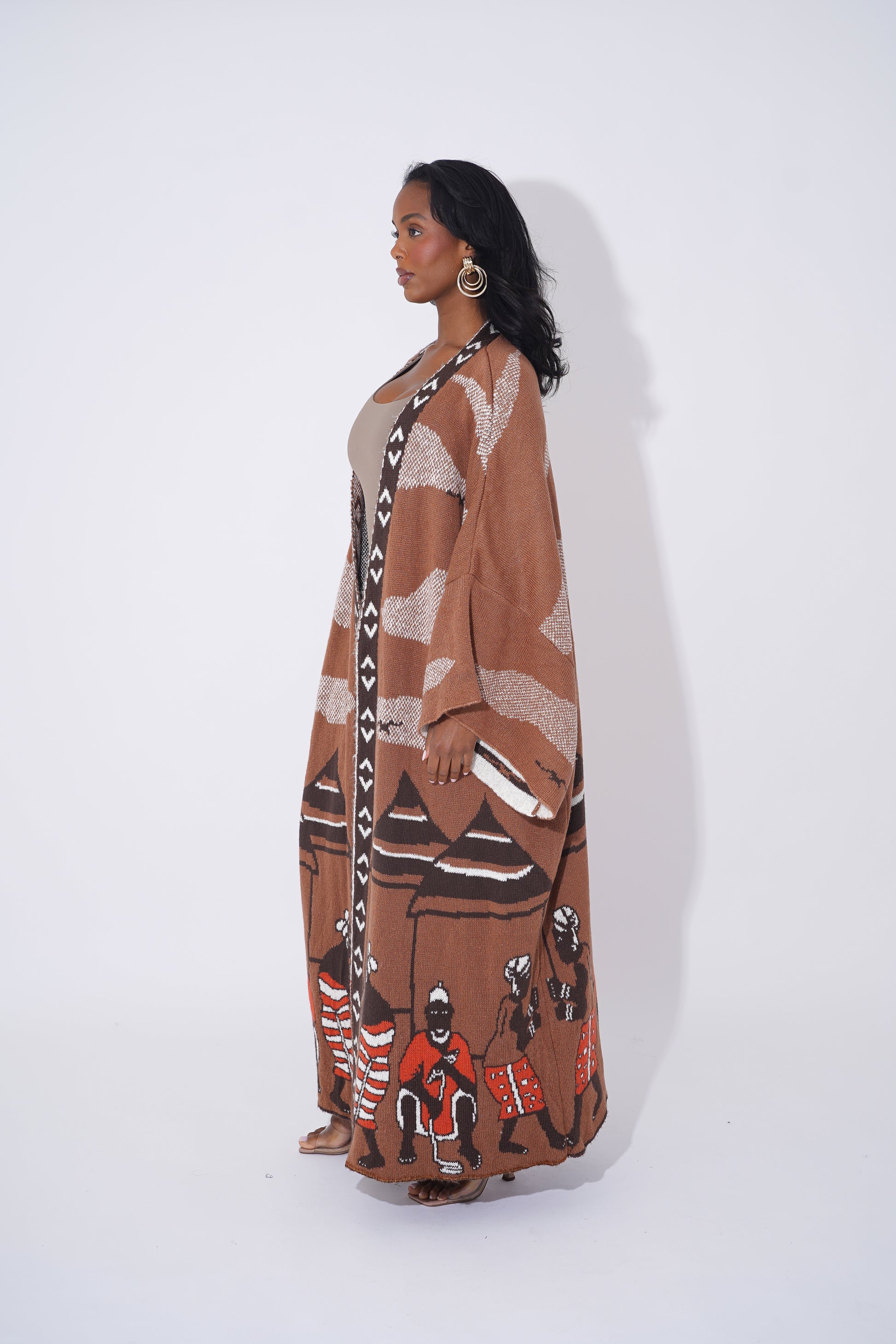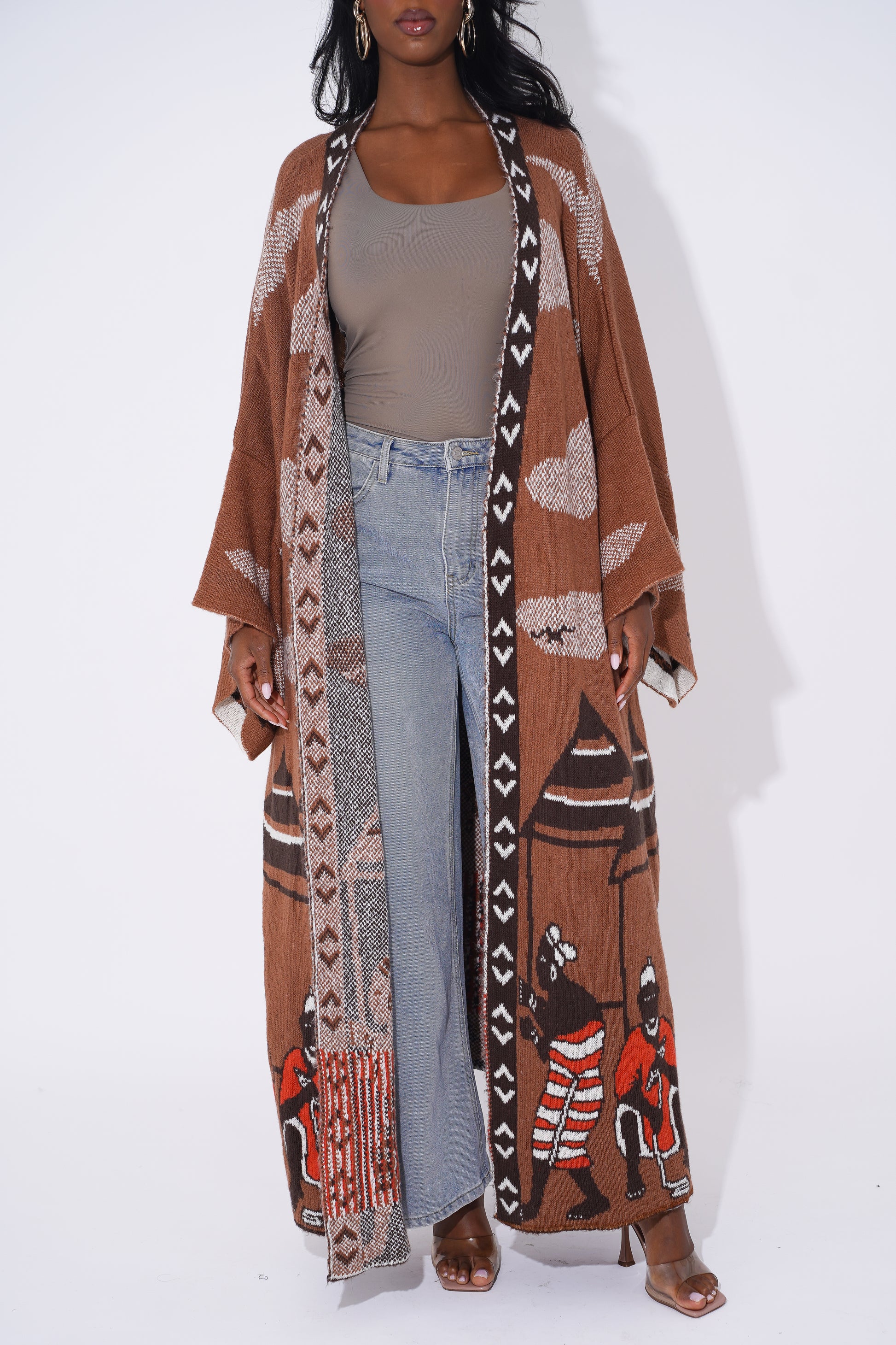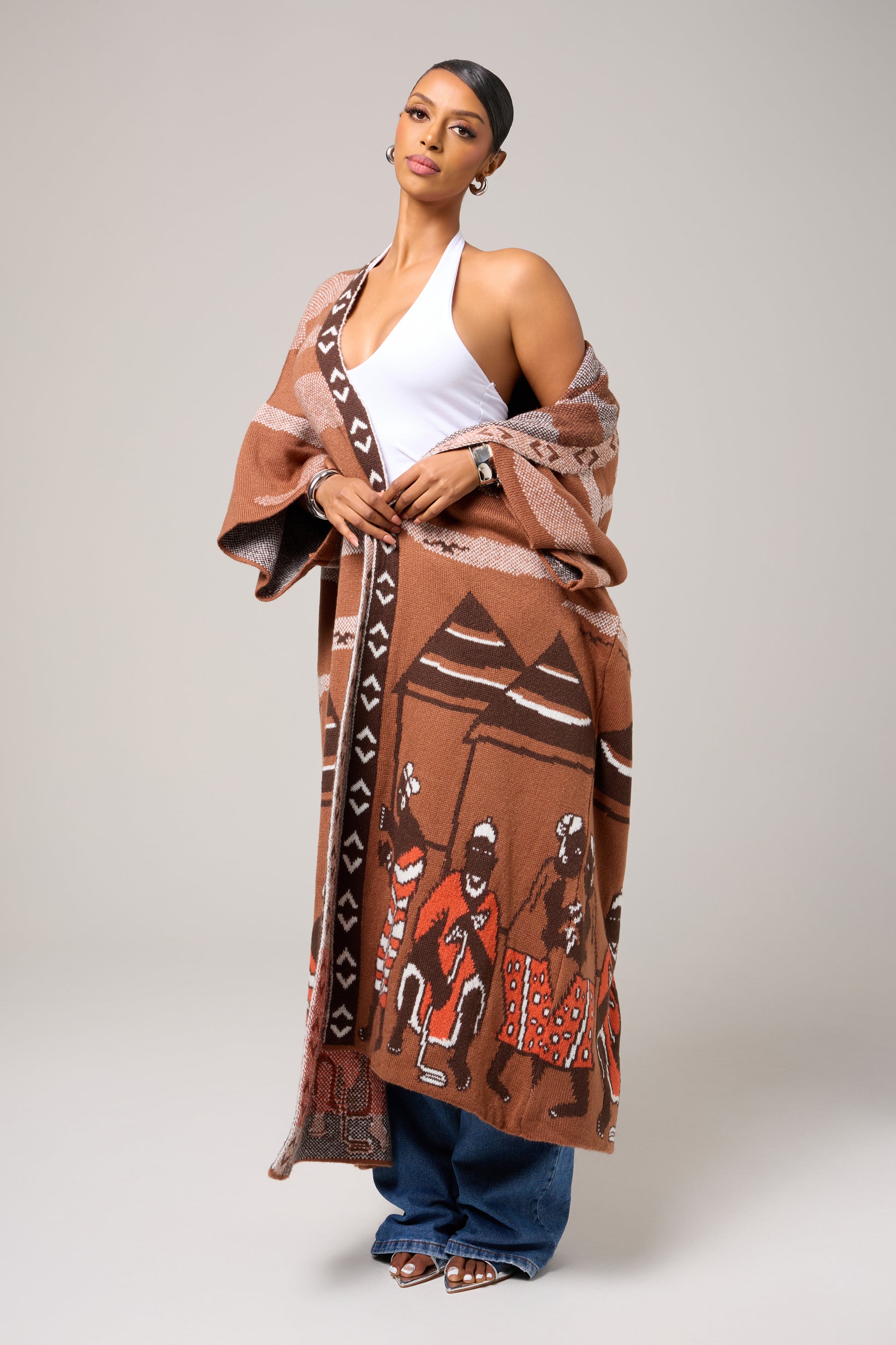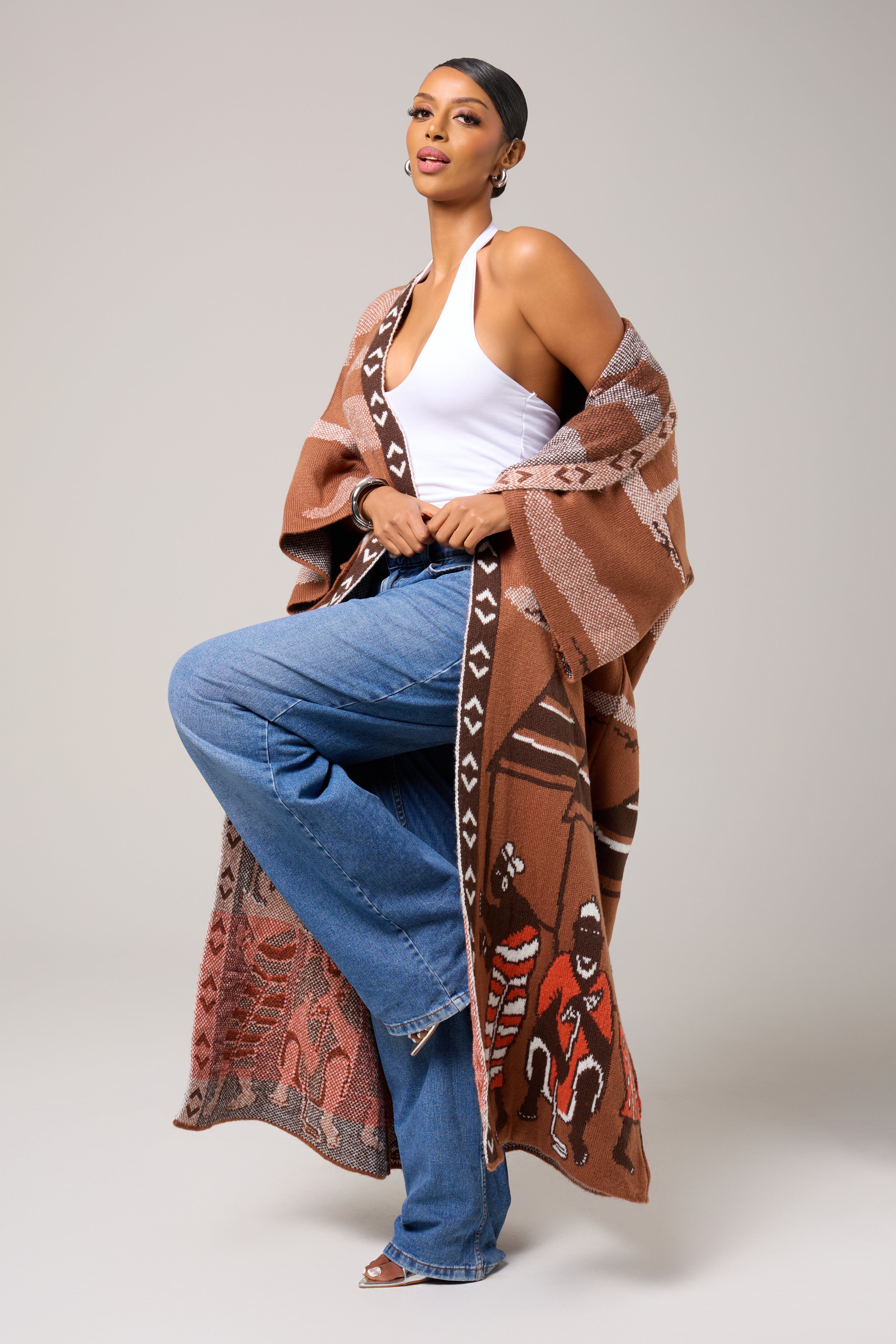 Wrap yourself in comfort and culture with this stunning long-line tribal cardigan, designed for Black woman who love expressing their heritage through bold and stylish outerwear. Featuring intricate geometric patterns in black, tan, orange, and cream, this cardigan is a modern take on traditional African motifs.