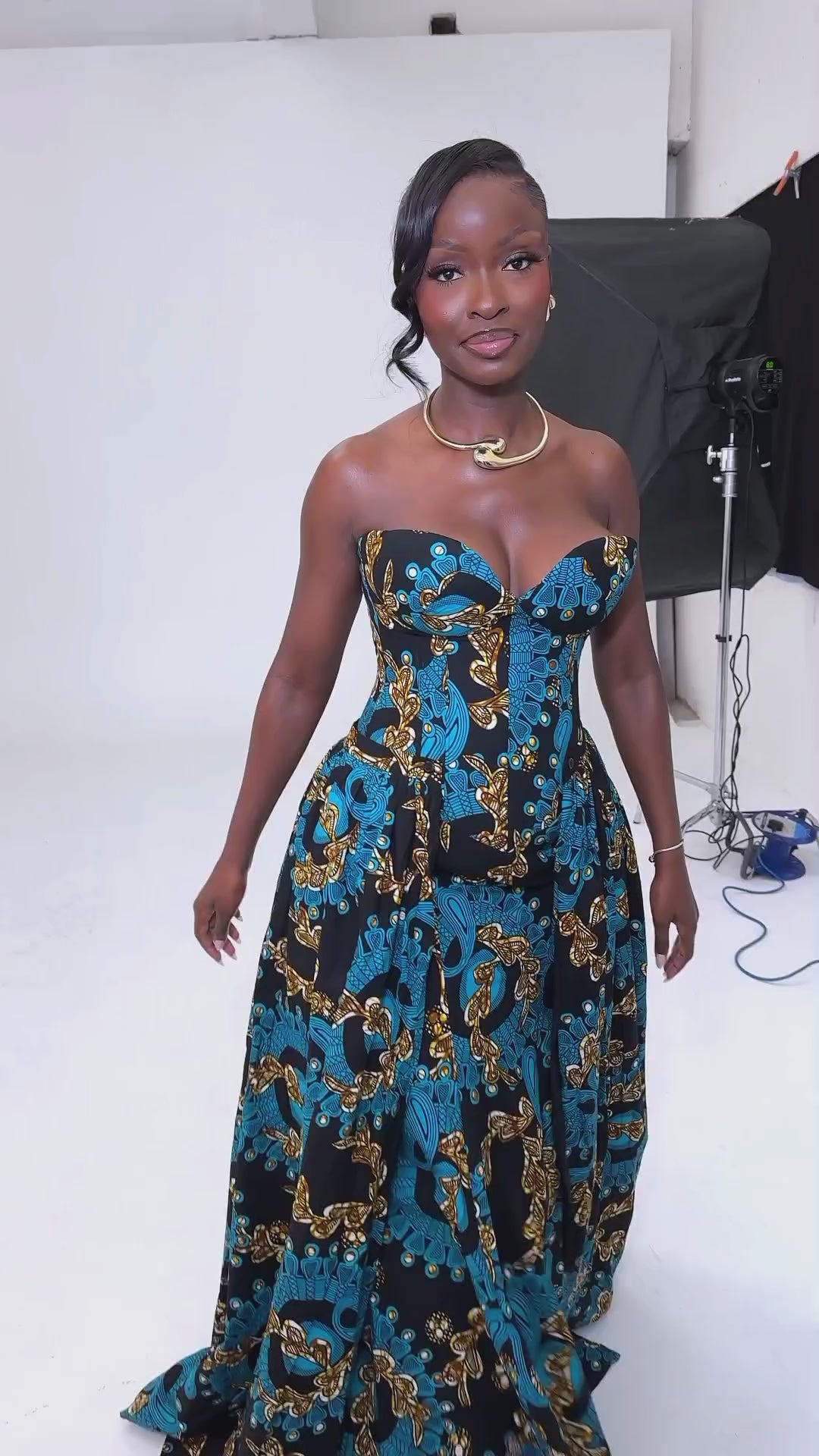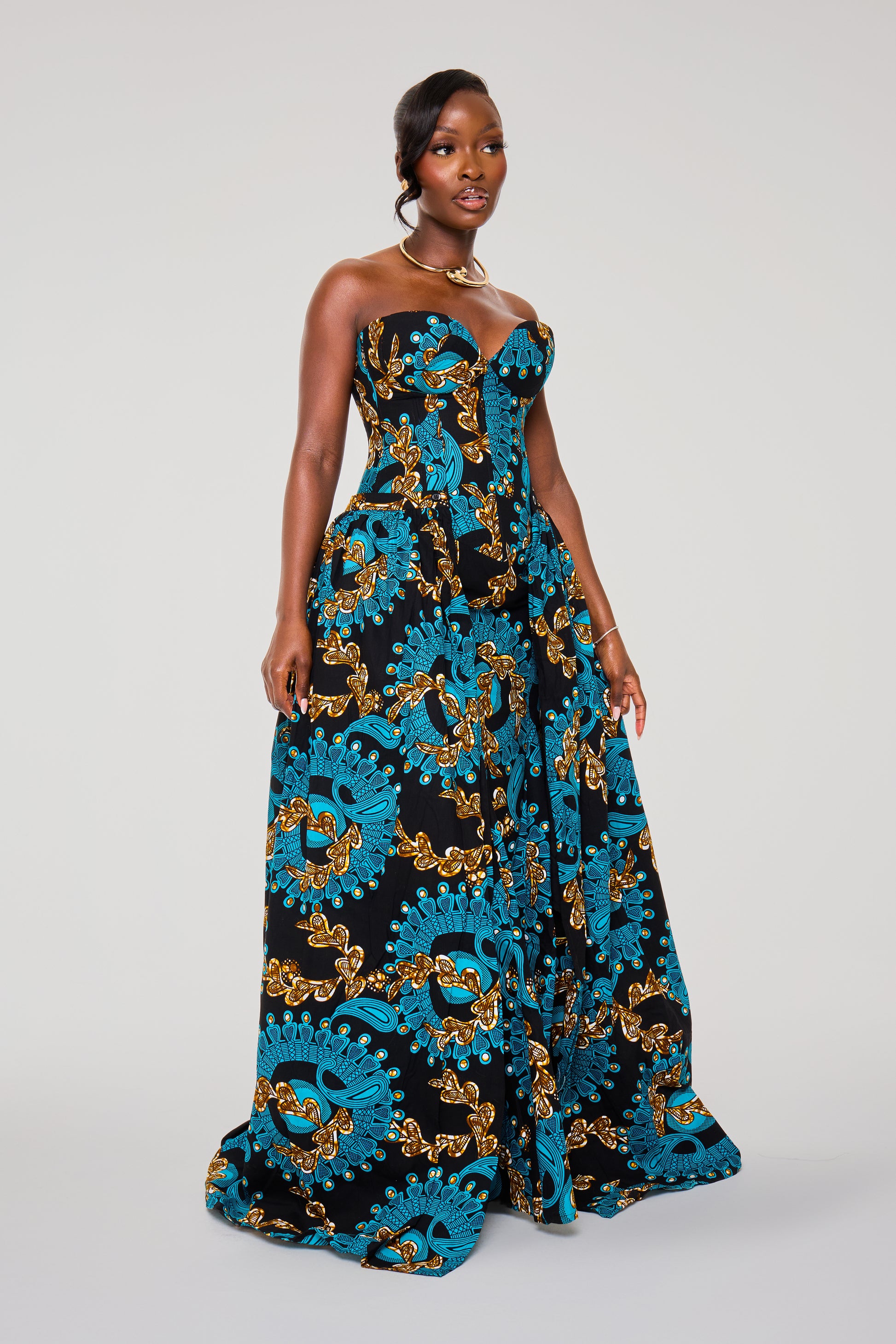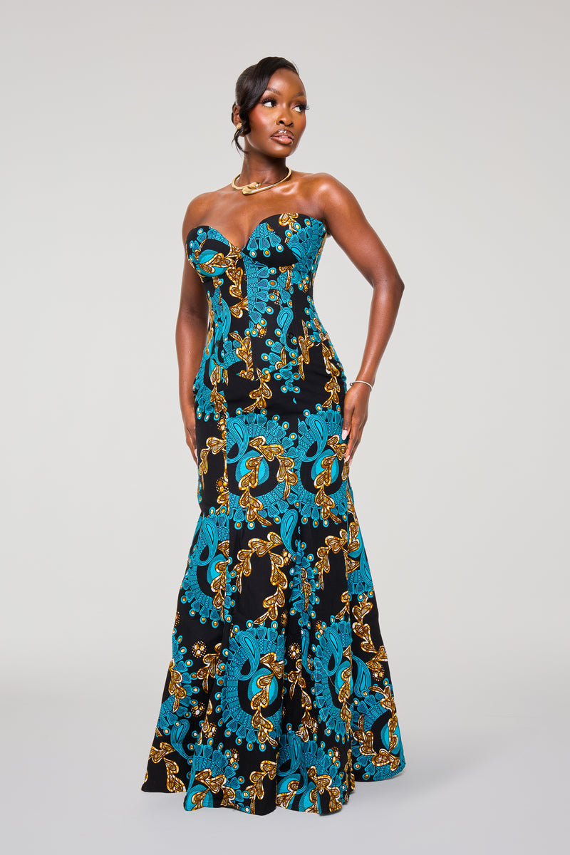 The Chimamanda Dress is a strapless convertible maxi crafted to sculpt, flatter, and flow with you, this strapless corset gown is made from premium Ankara with a bold print that instantly commands attention. The structured bodice snatches the waist beautifully, while the detachable maxi flare lets you switch up your style in seconds.