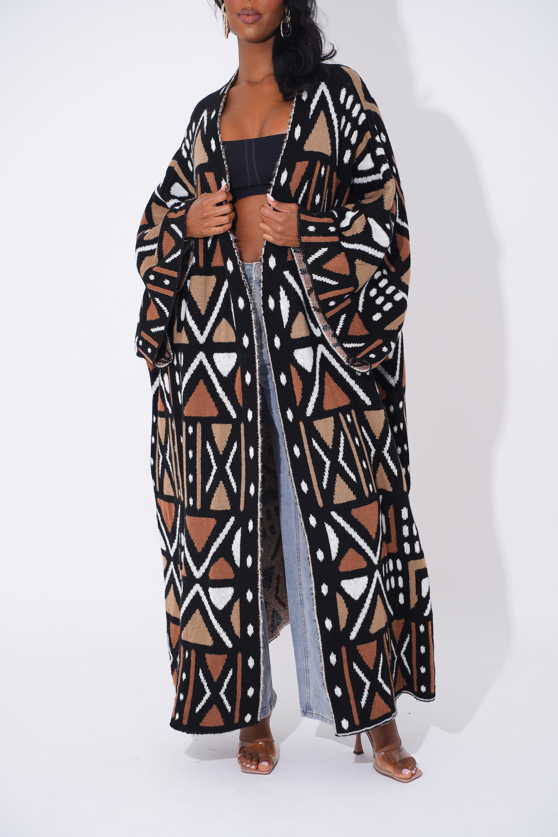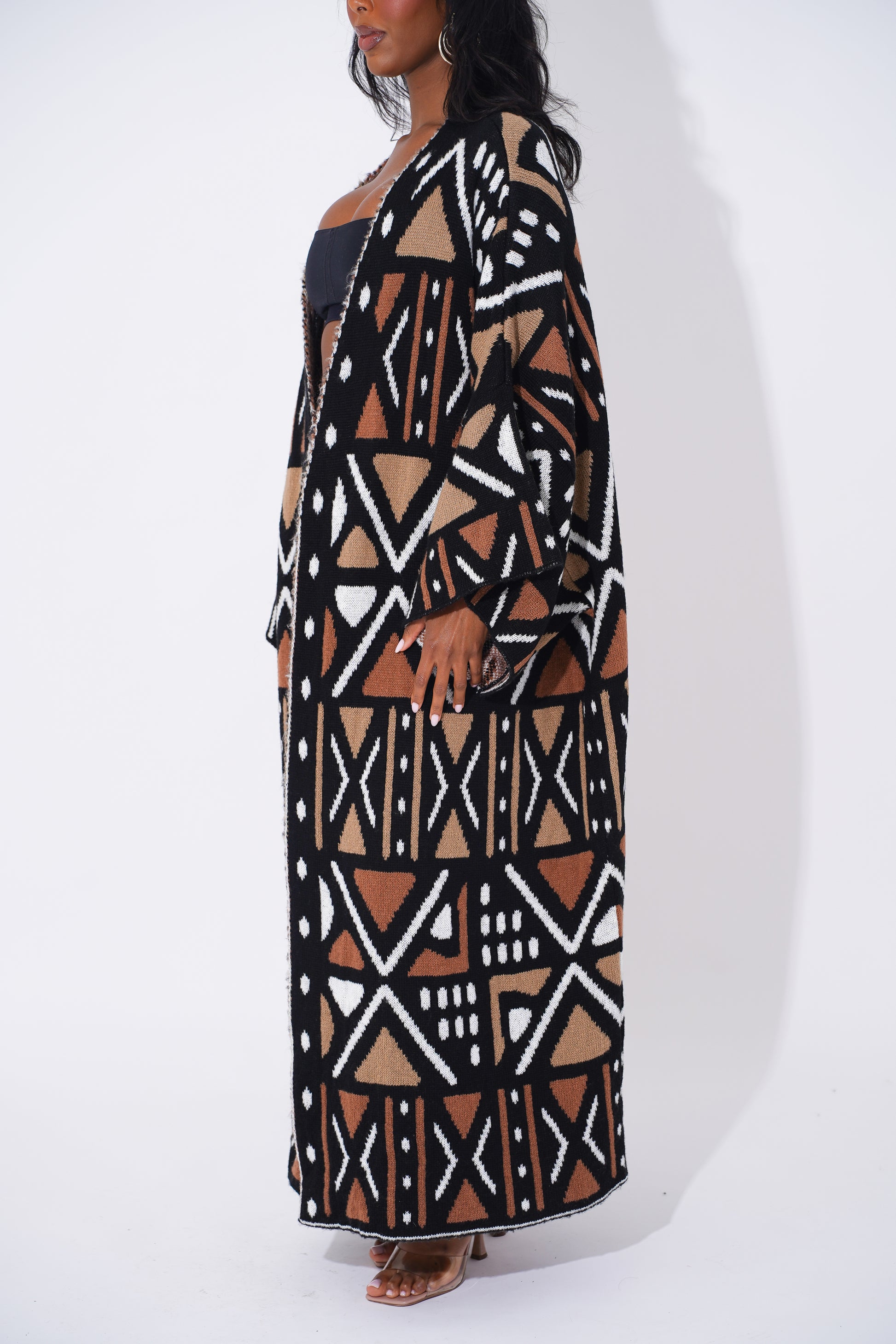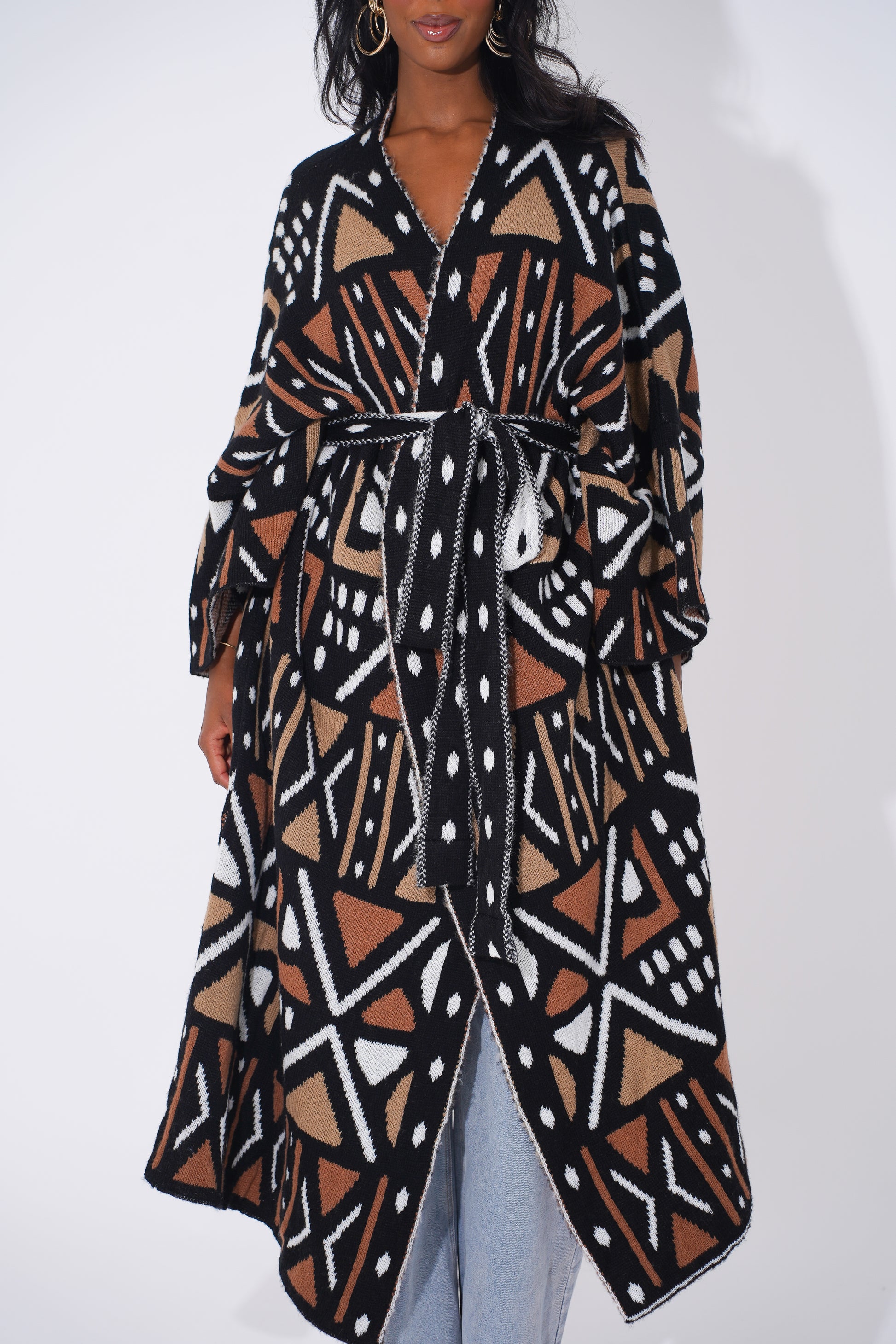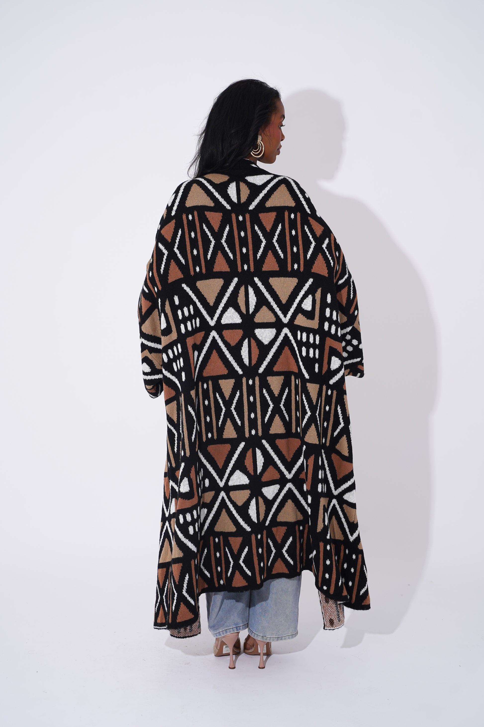 Wrap yourself in comfort and culture with this stunning long-line tribal cardigan, designed for Black woman who love expressing their heritage through bold and stylish outerwear. Featuring intricate geometric patterns in black, tan, orange, and cream, this cardigan is a modern take on traditional African motifs.
