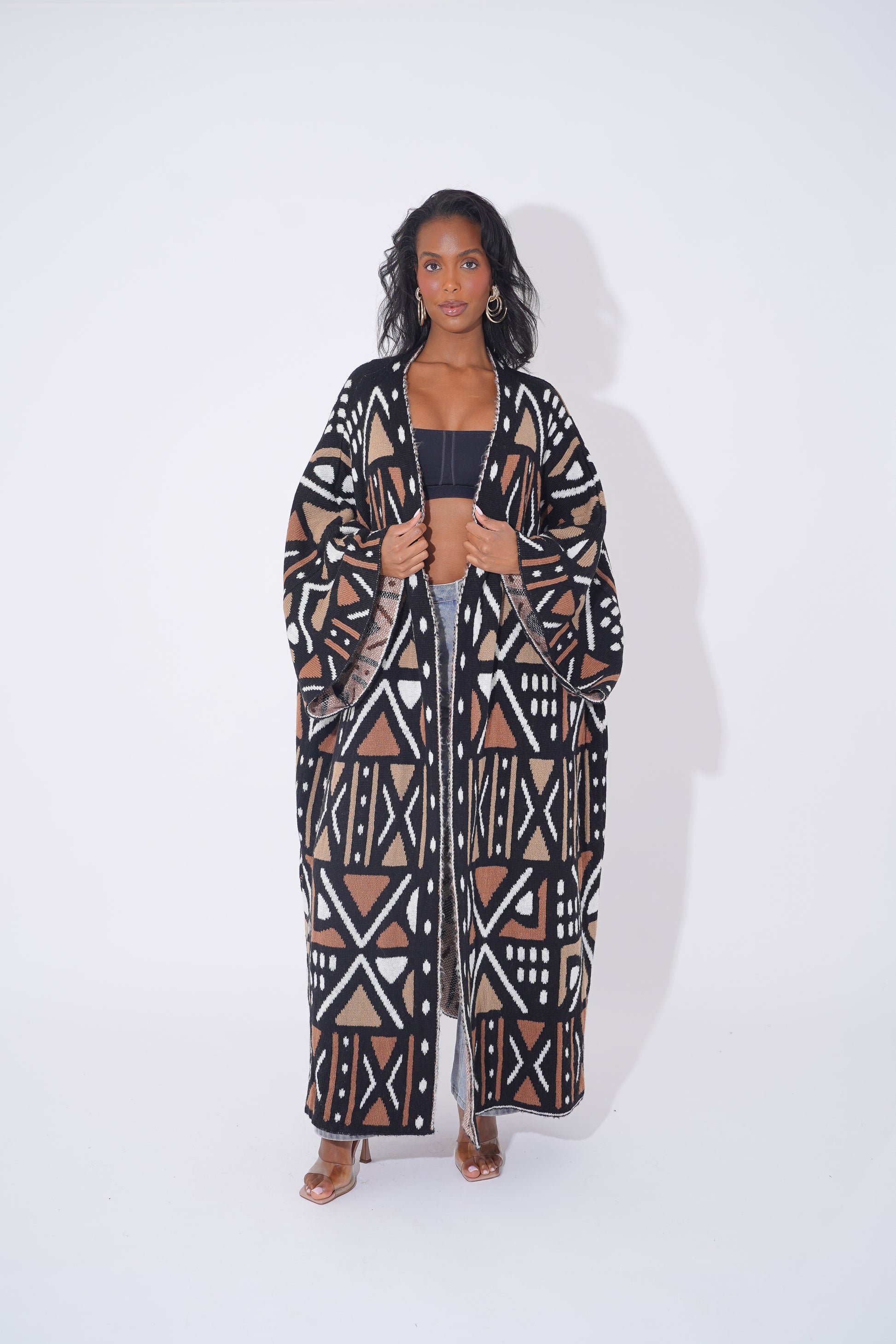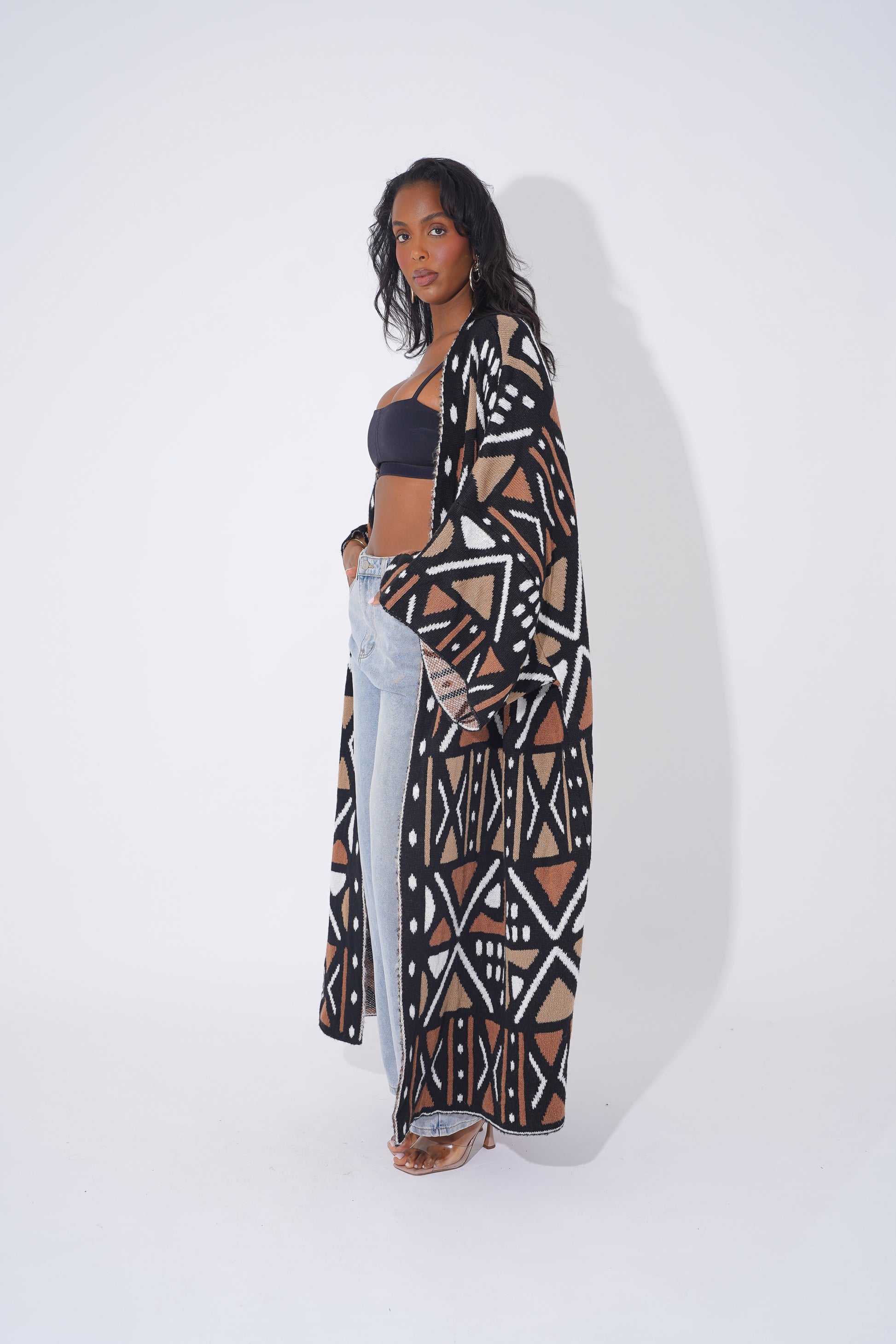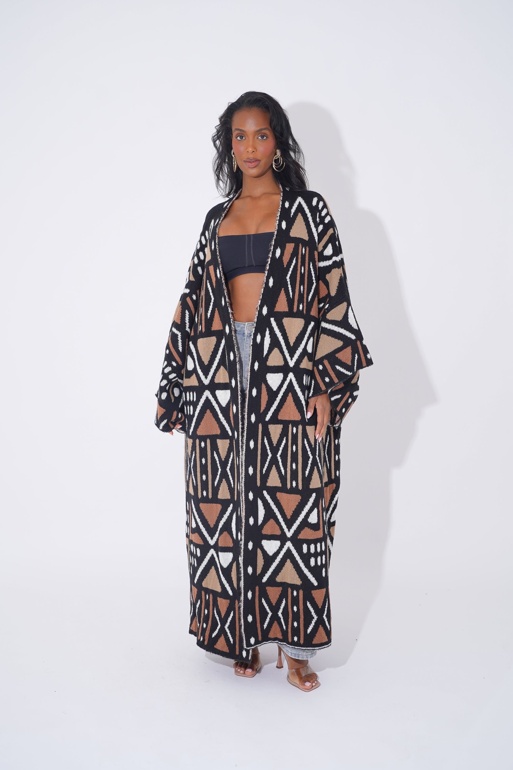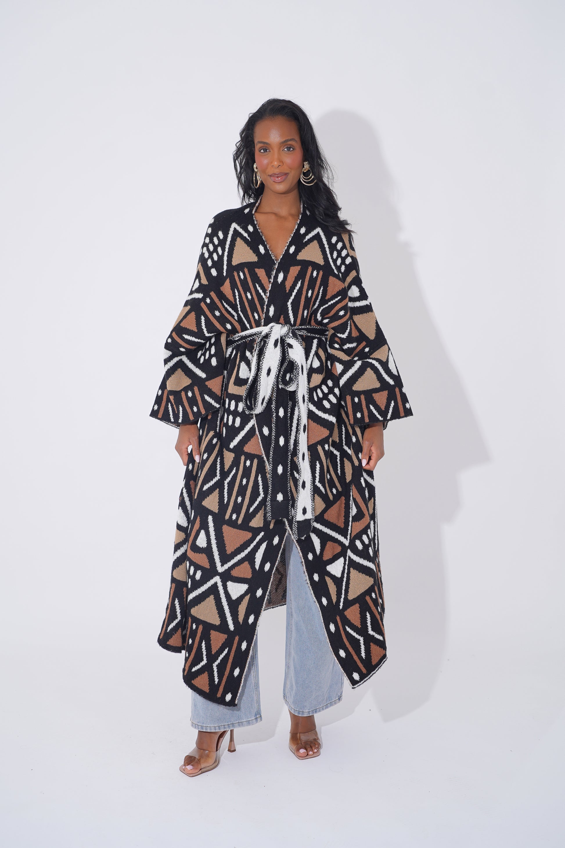 Wrap yourself in comfort and culture with this stunning long-line tribal cardigan, designed for Black woman who love expressing their heritage through bold and stylish outerwear. Featuring intricate geometric patterns in black, tan, orange, and cream, this cardigan is a modern take on traditional African motifs.