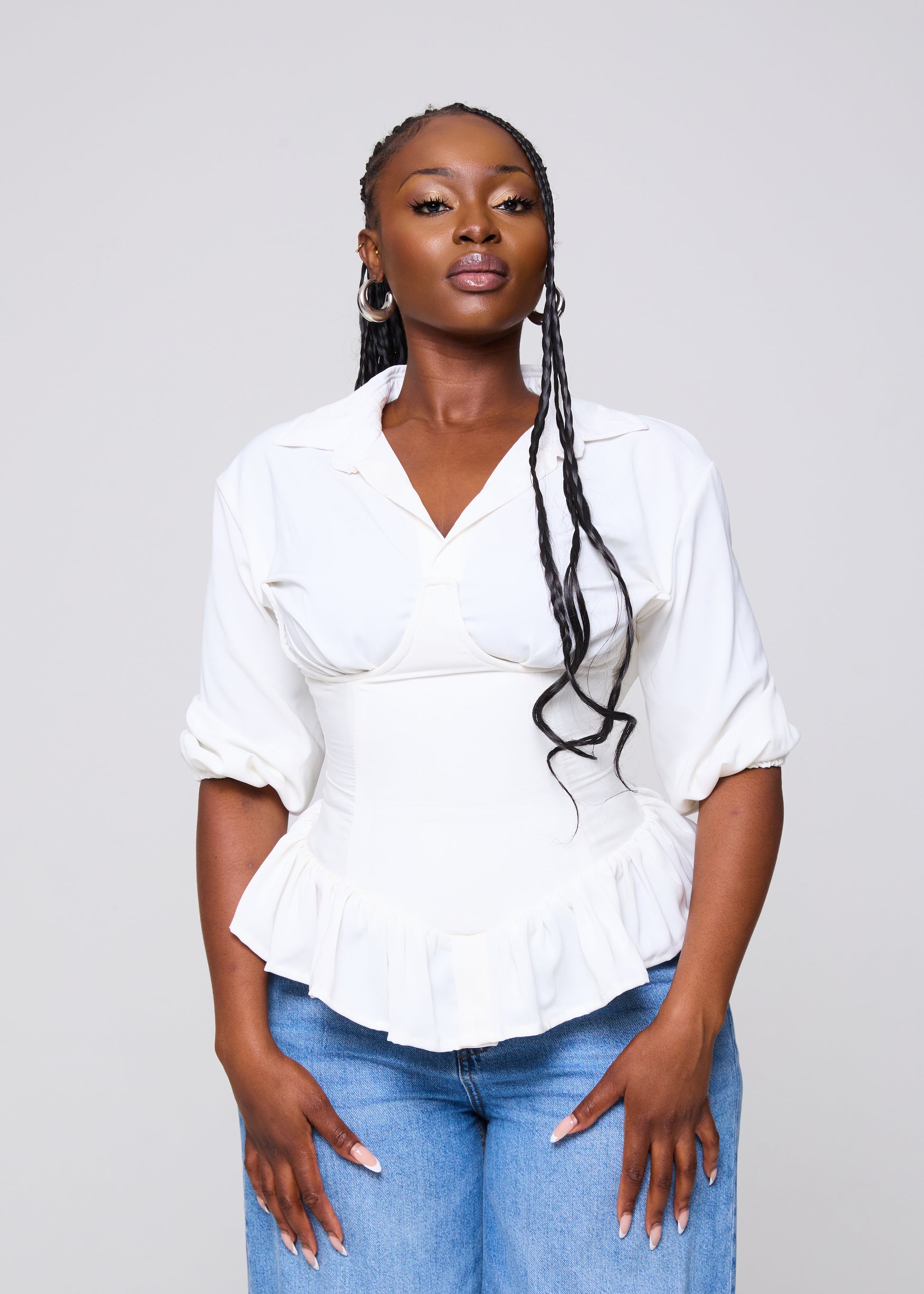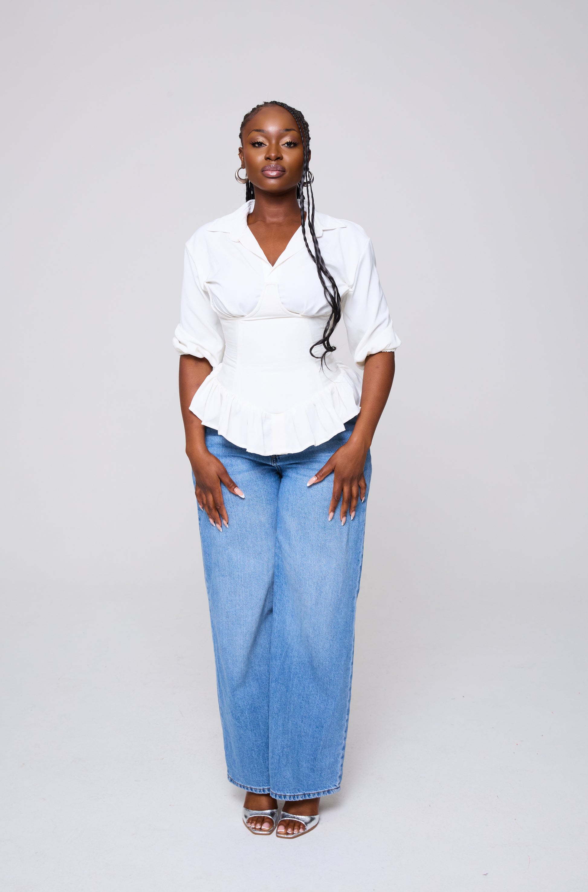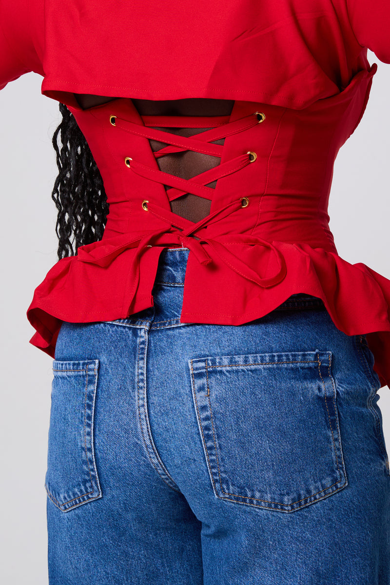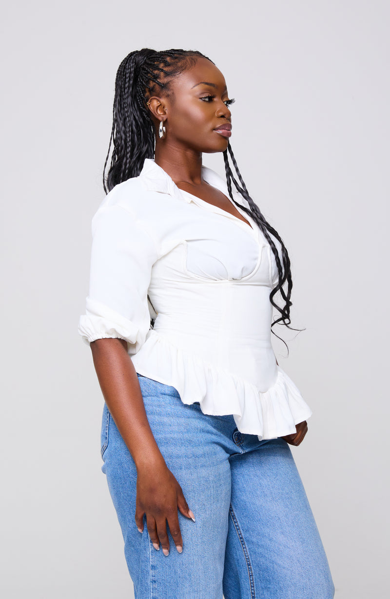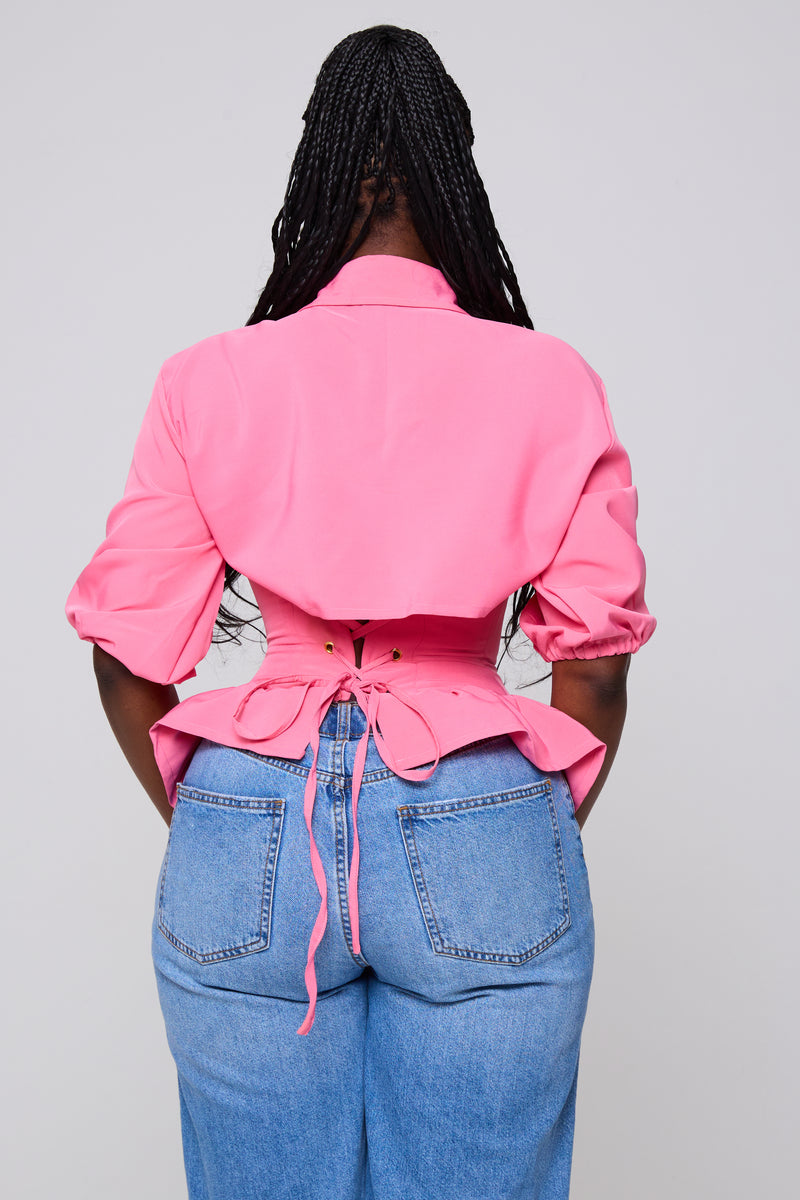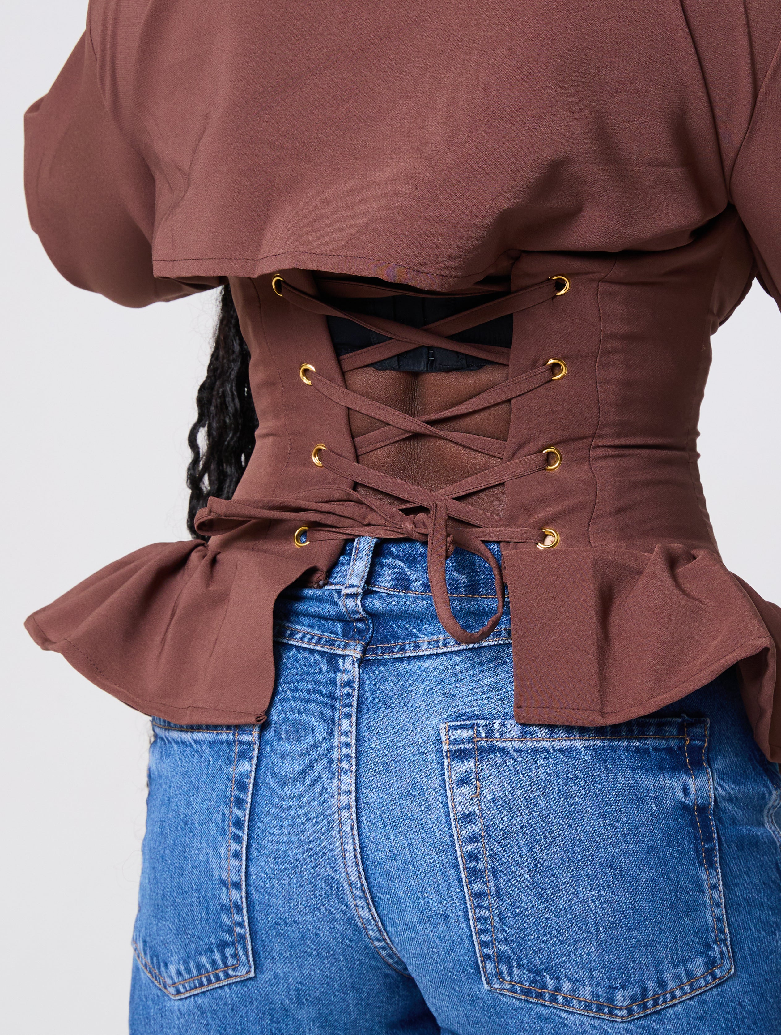 Crafted with a figure-sculpting corset silhouette, it features a collared neckline, soft puff sleeves, and a ruffled peplum hem that accentuates the waist. The adjustable lace-up back ensures the perfect fit, adding a modern twist to a timeless design.