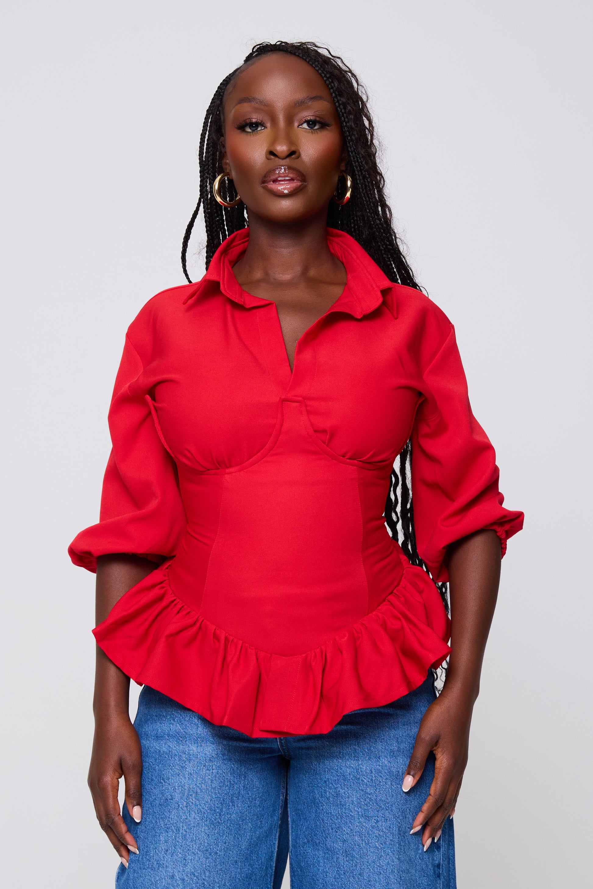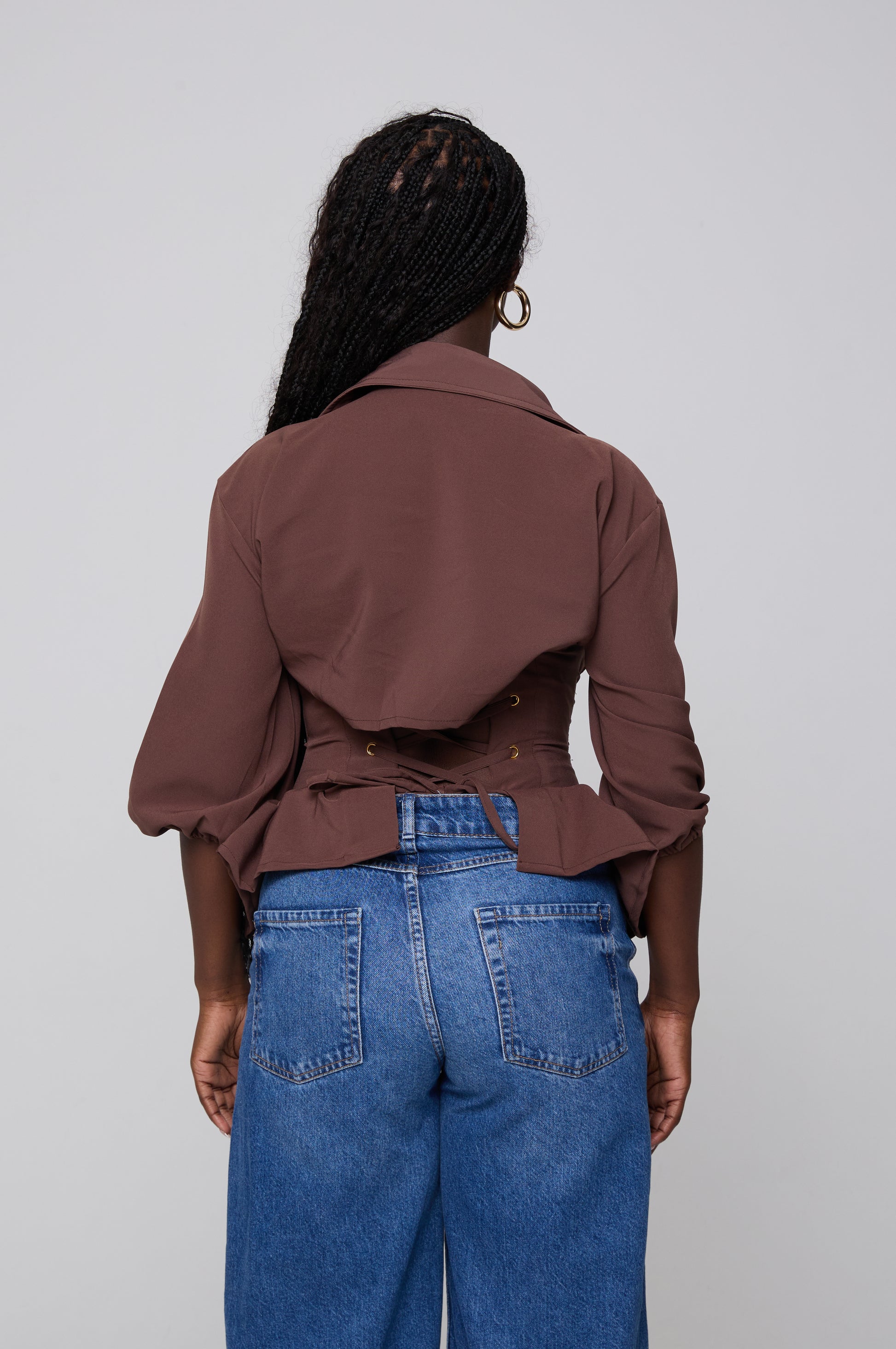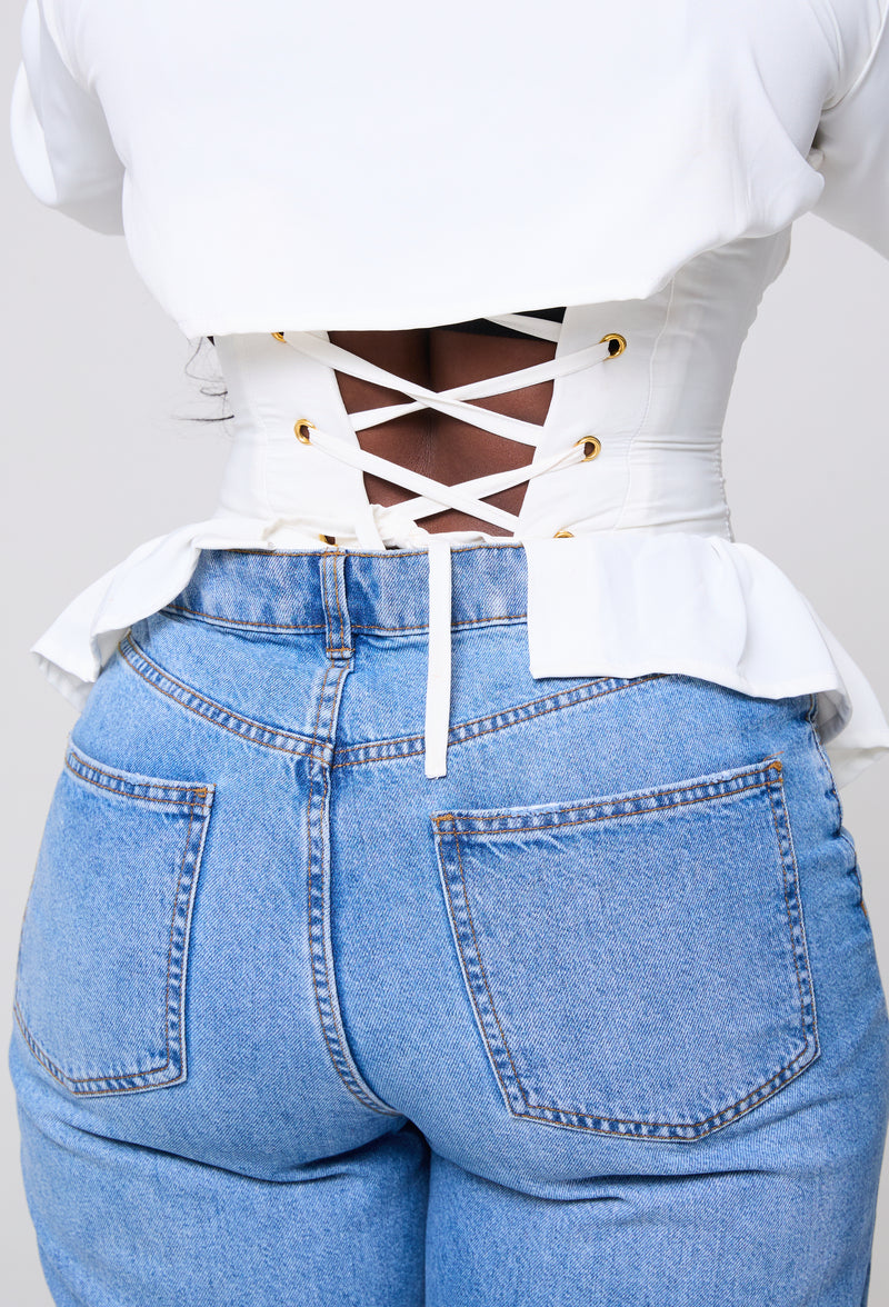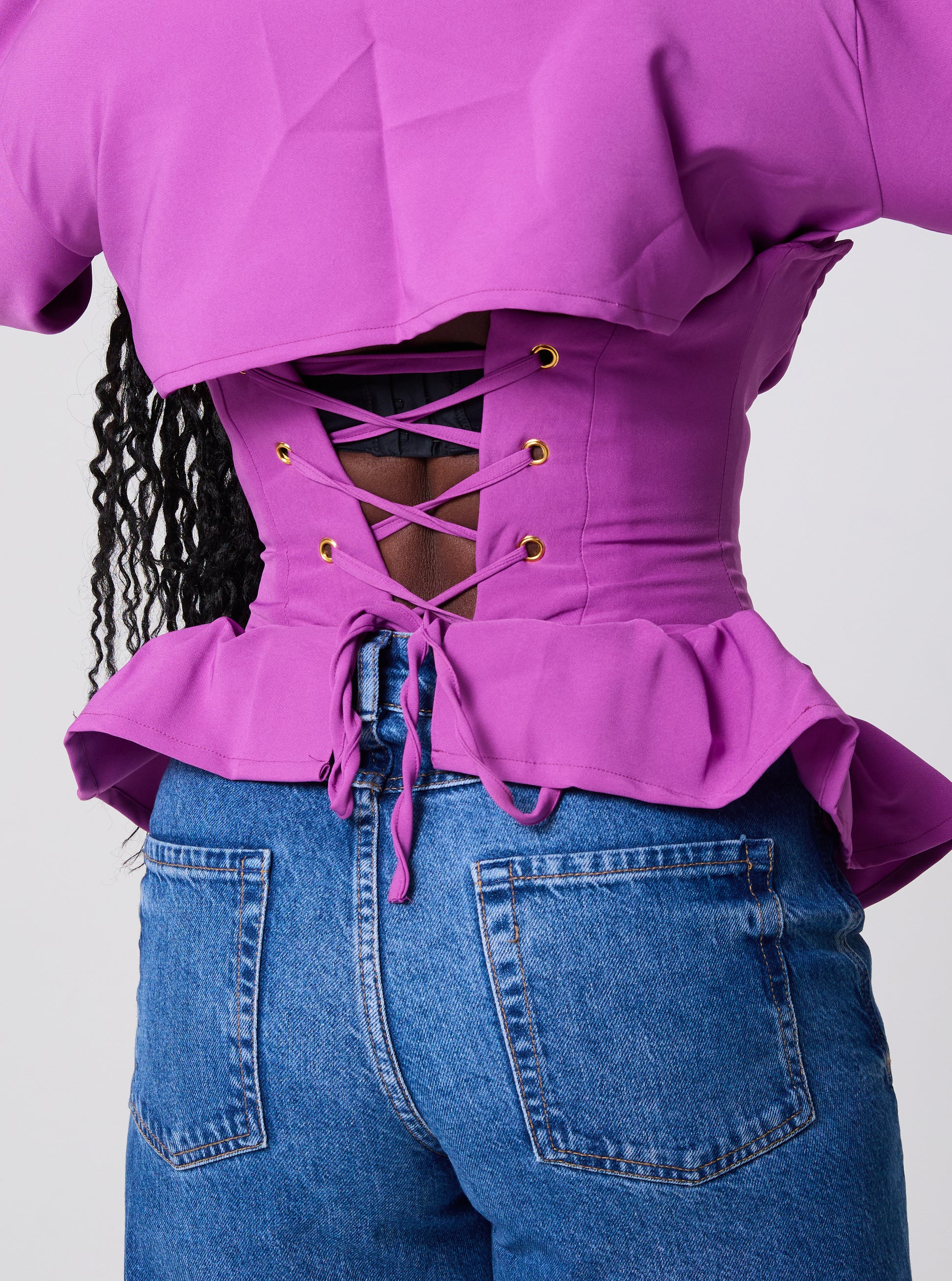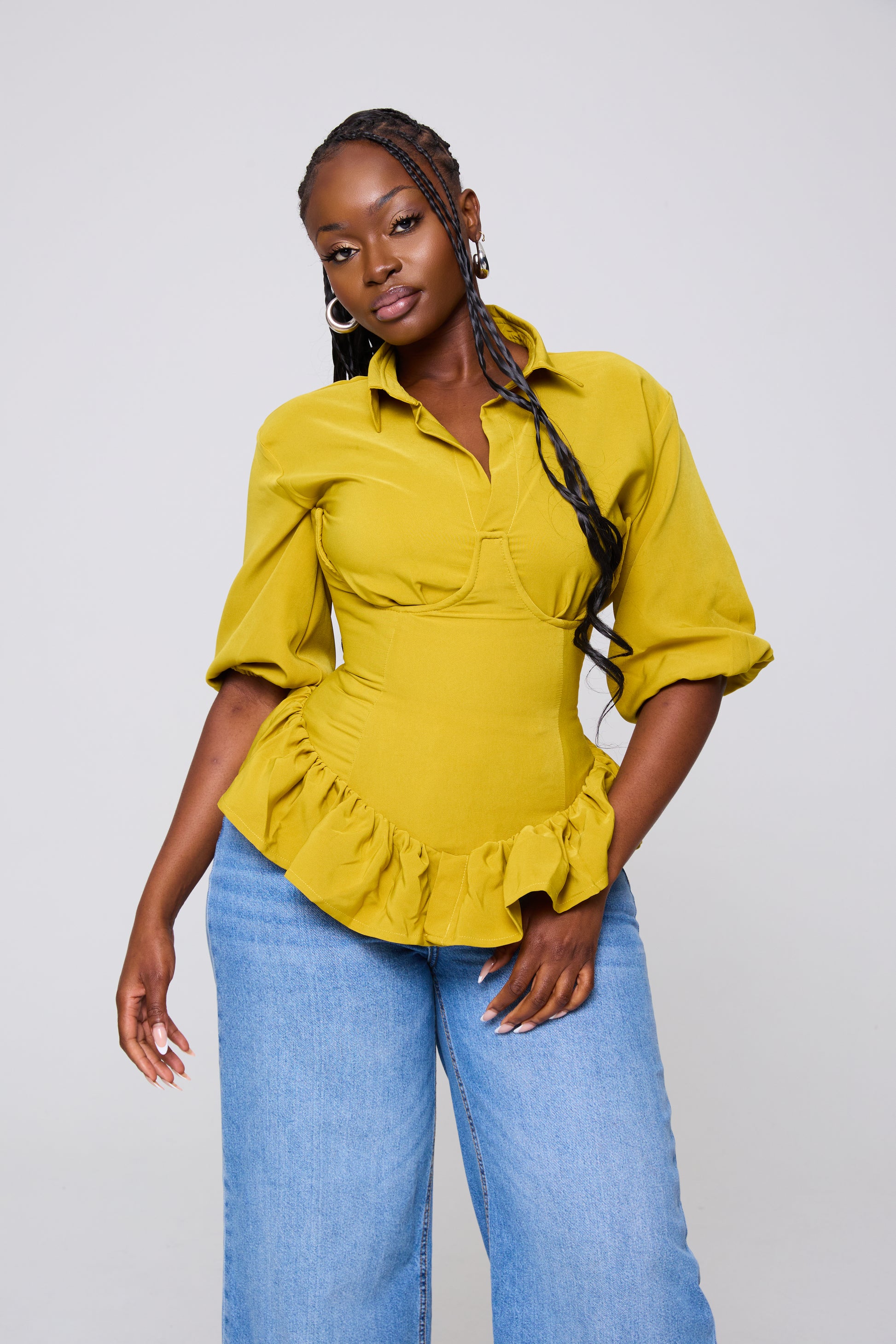 Crafted with a figure-sculpting corset silhouette, it features a collared neckline, soft puff sleeves, and a ruffled peplum hem that accentuates the waist. The adjustable lace-up back ensures the perfect fit, adding a modern twist to a timeless design.