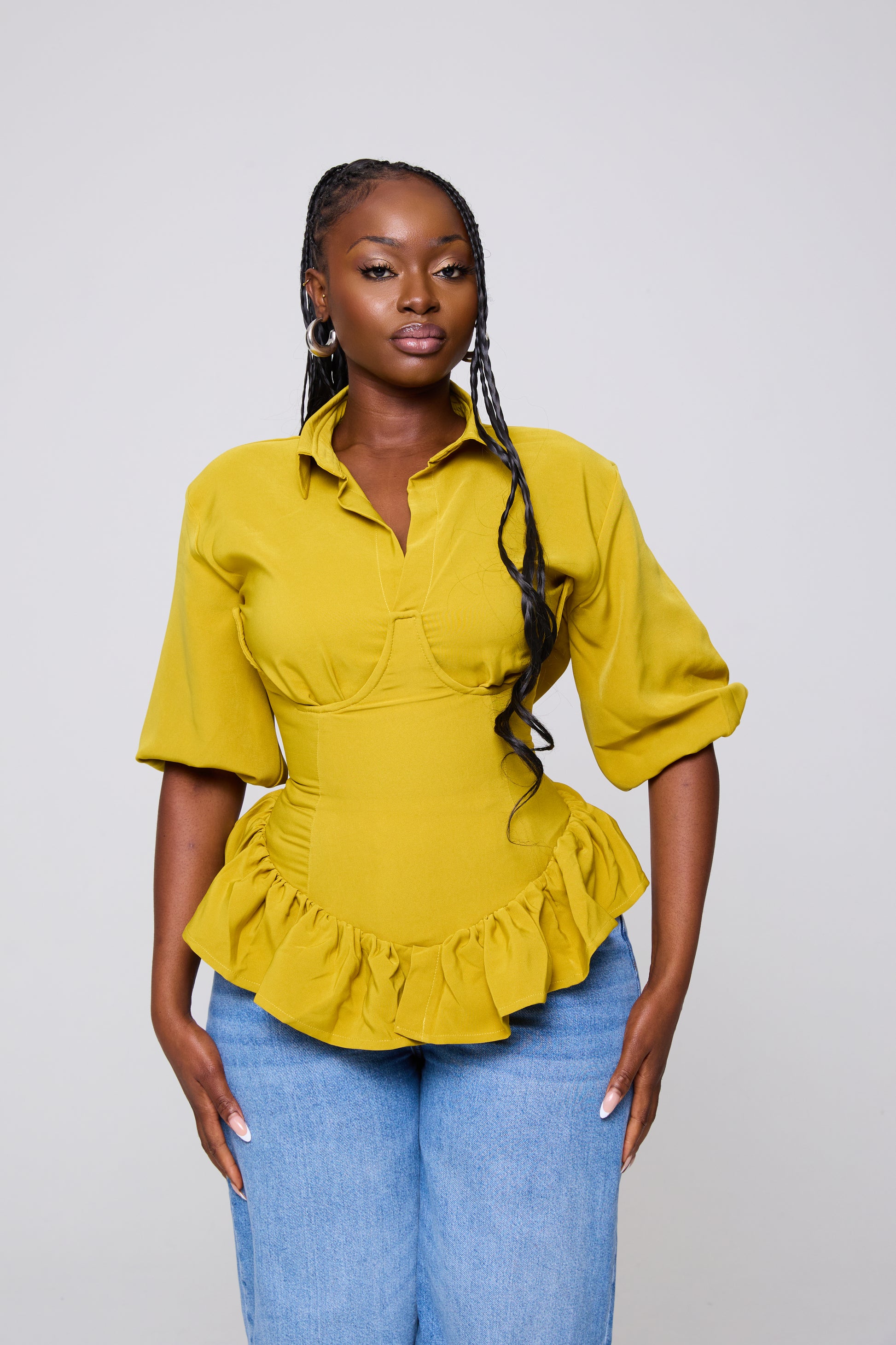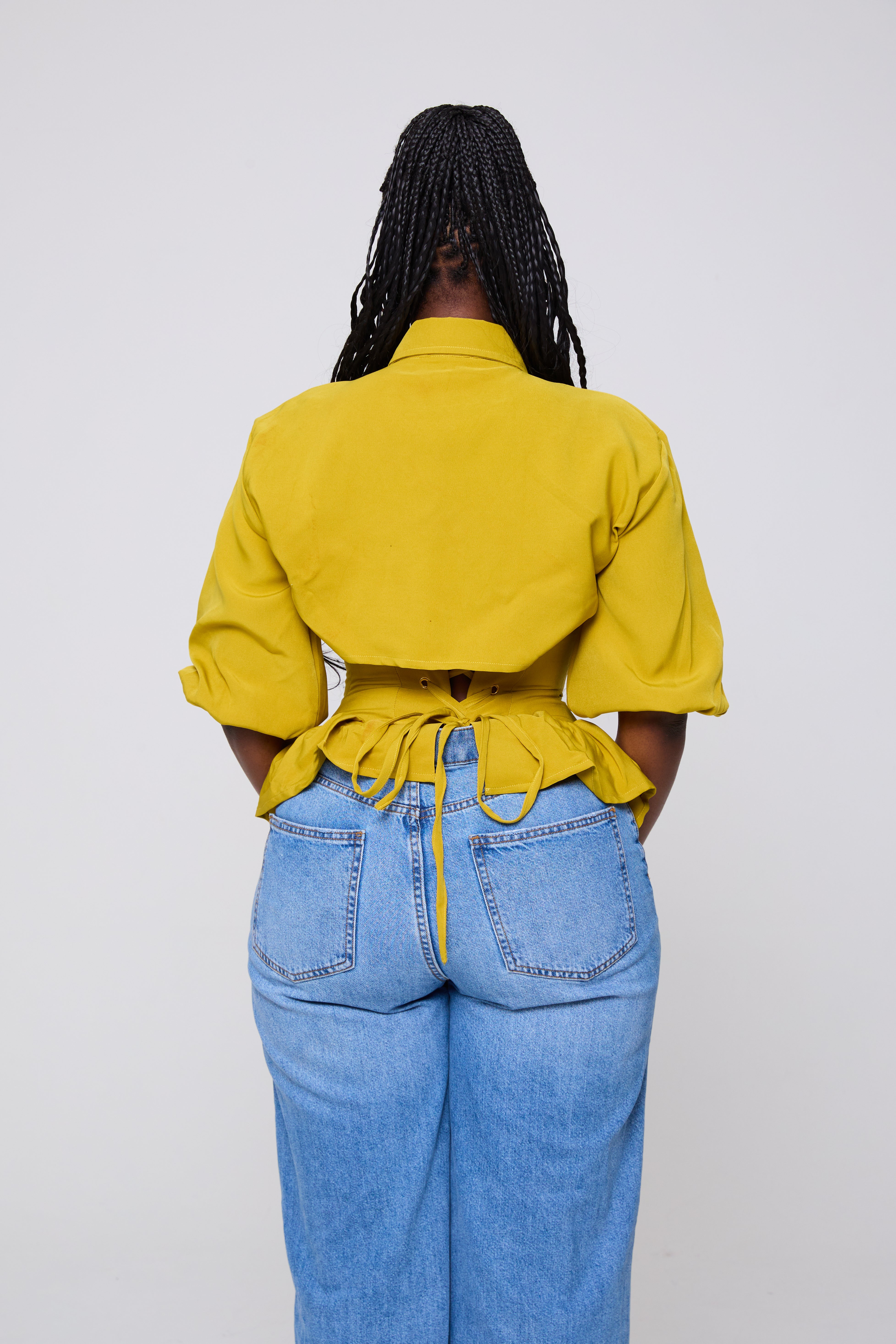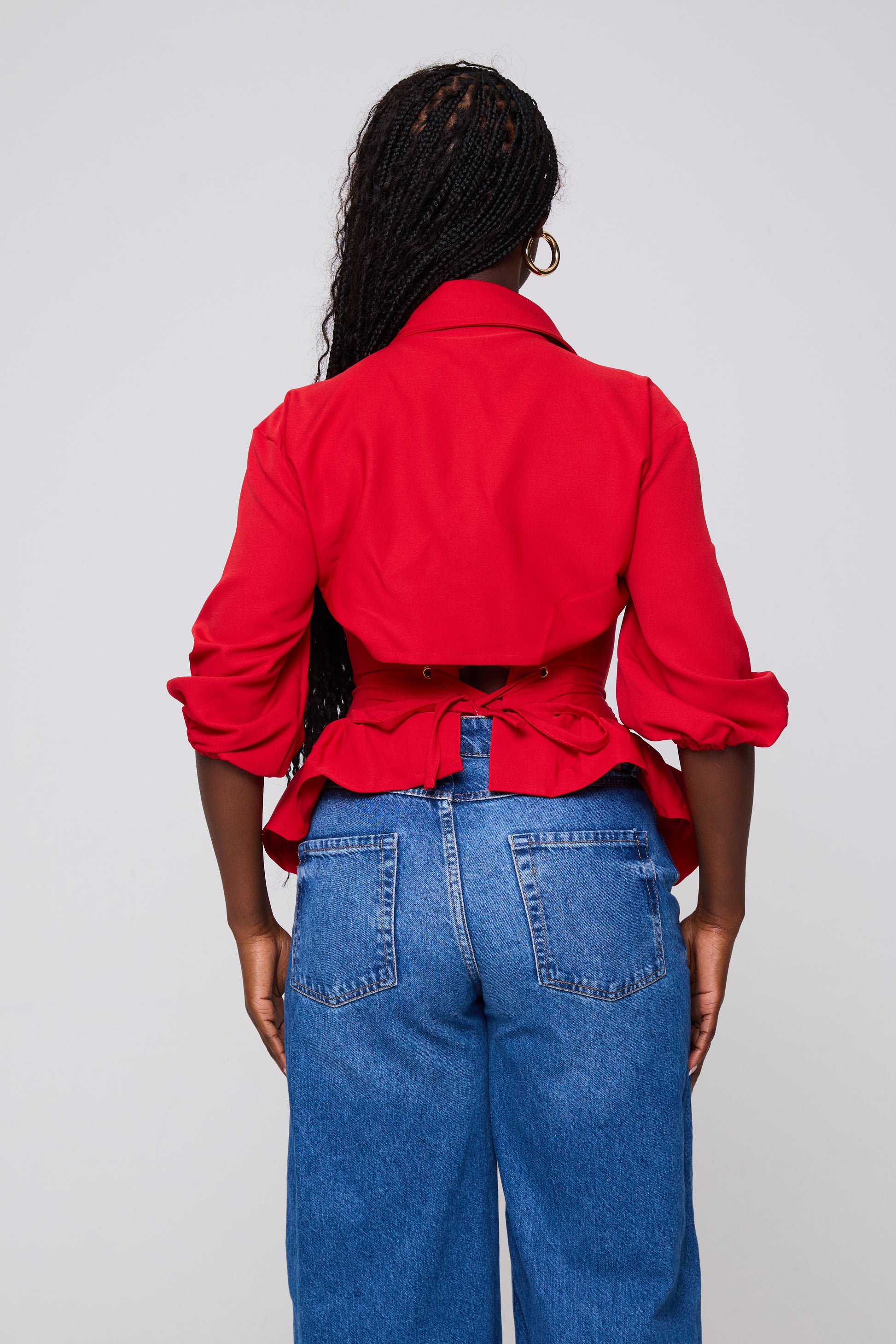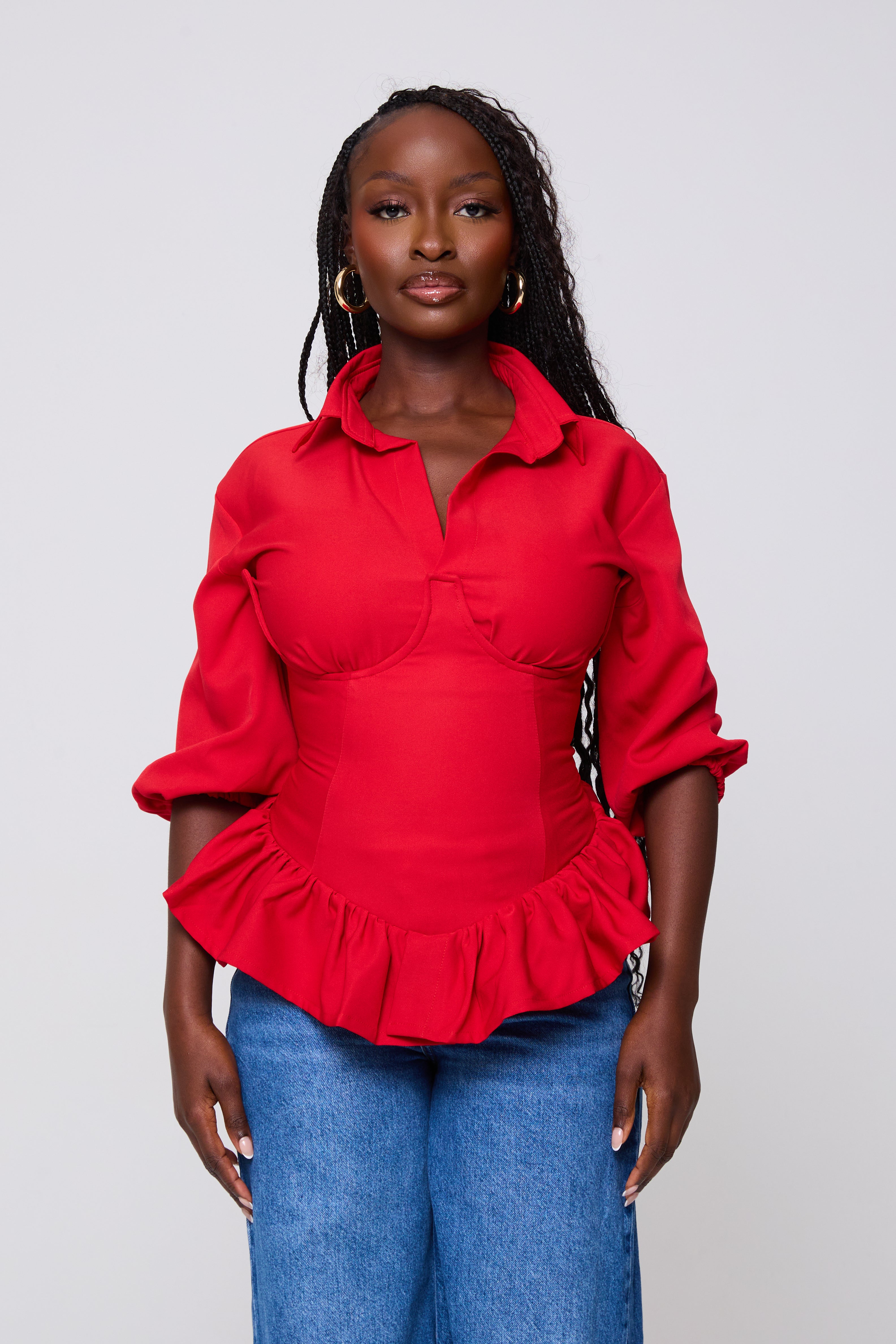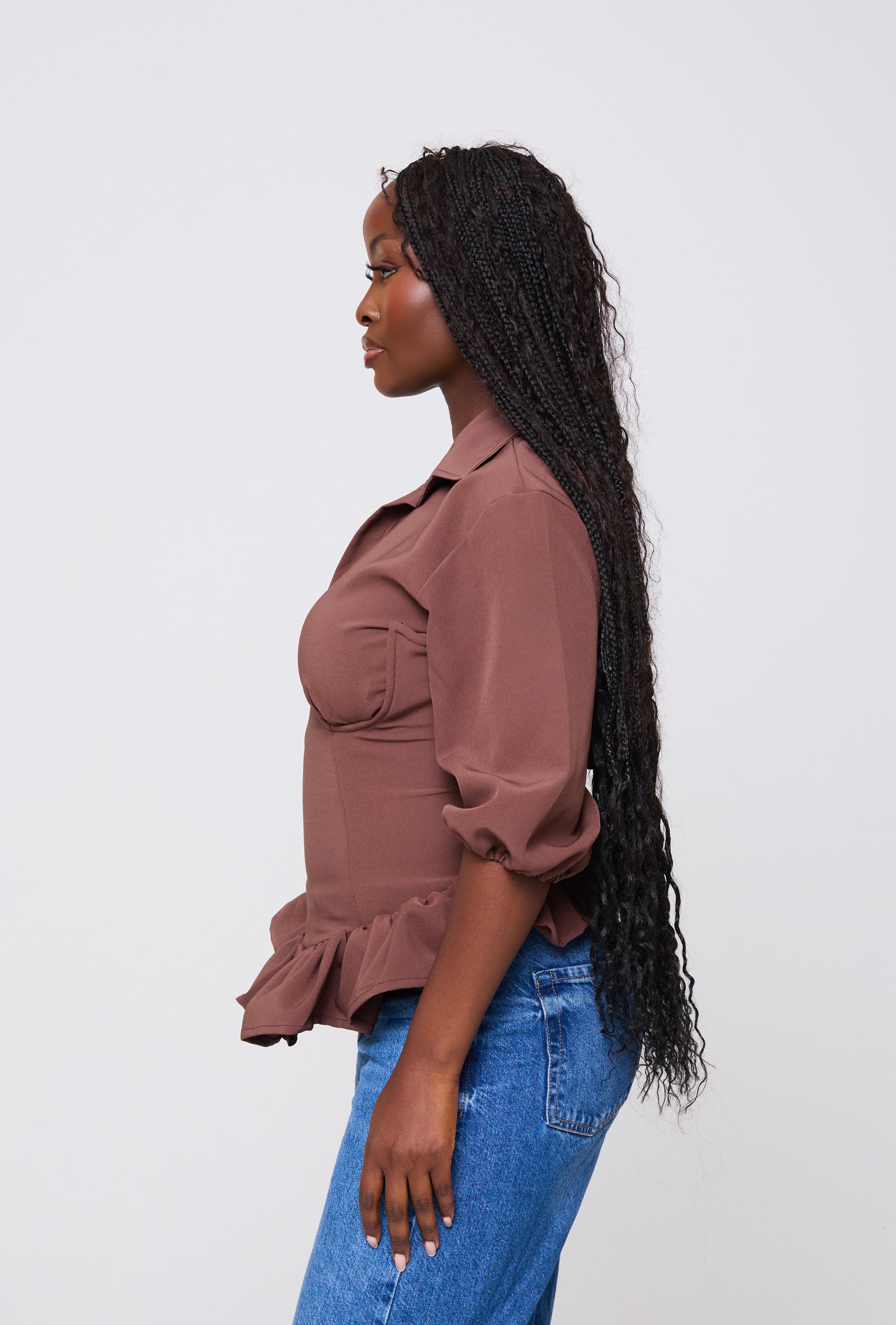 Crafted with a figure-sculpting corset silhouette, it features a collared neckline, soft puff sleeves, and a ruffled peplum hem that accentuates the waist. The adjustable lace-up back ensures the perfect fit, adding a modern twist to a timeless design.