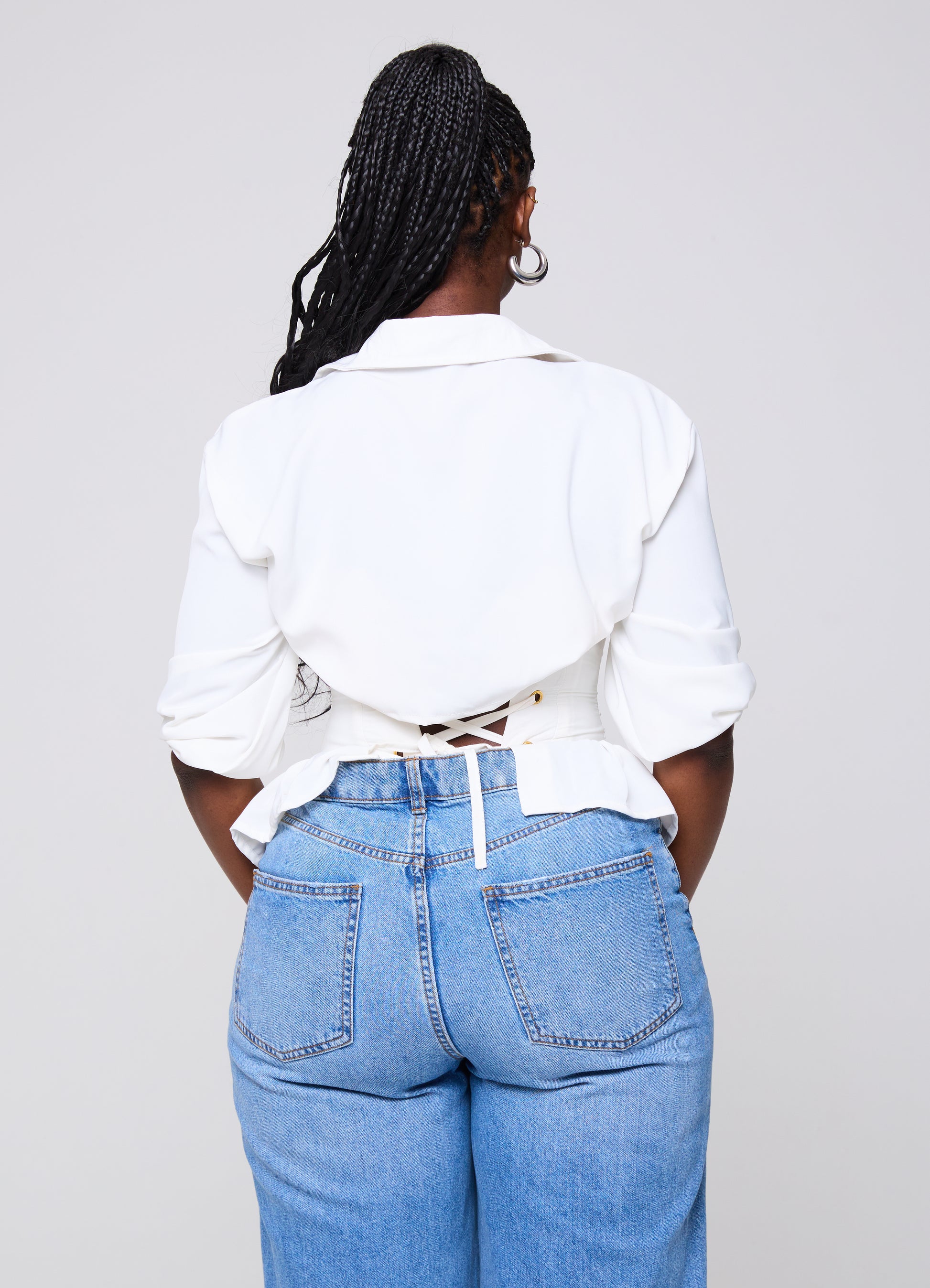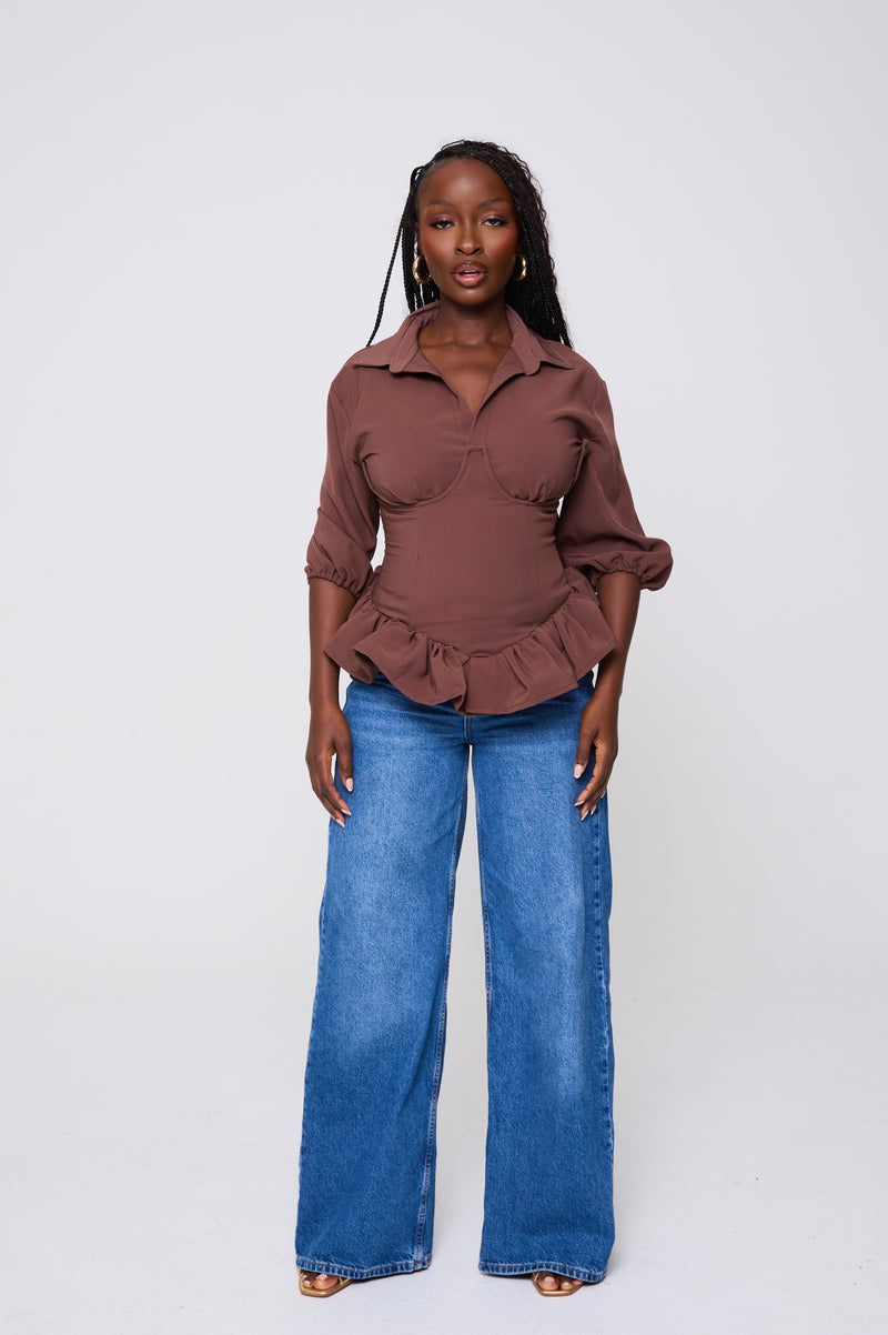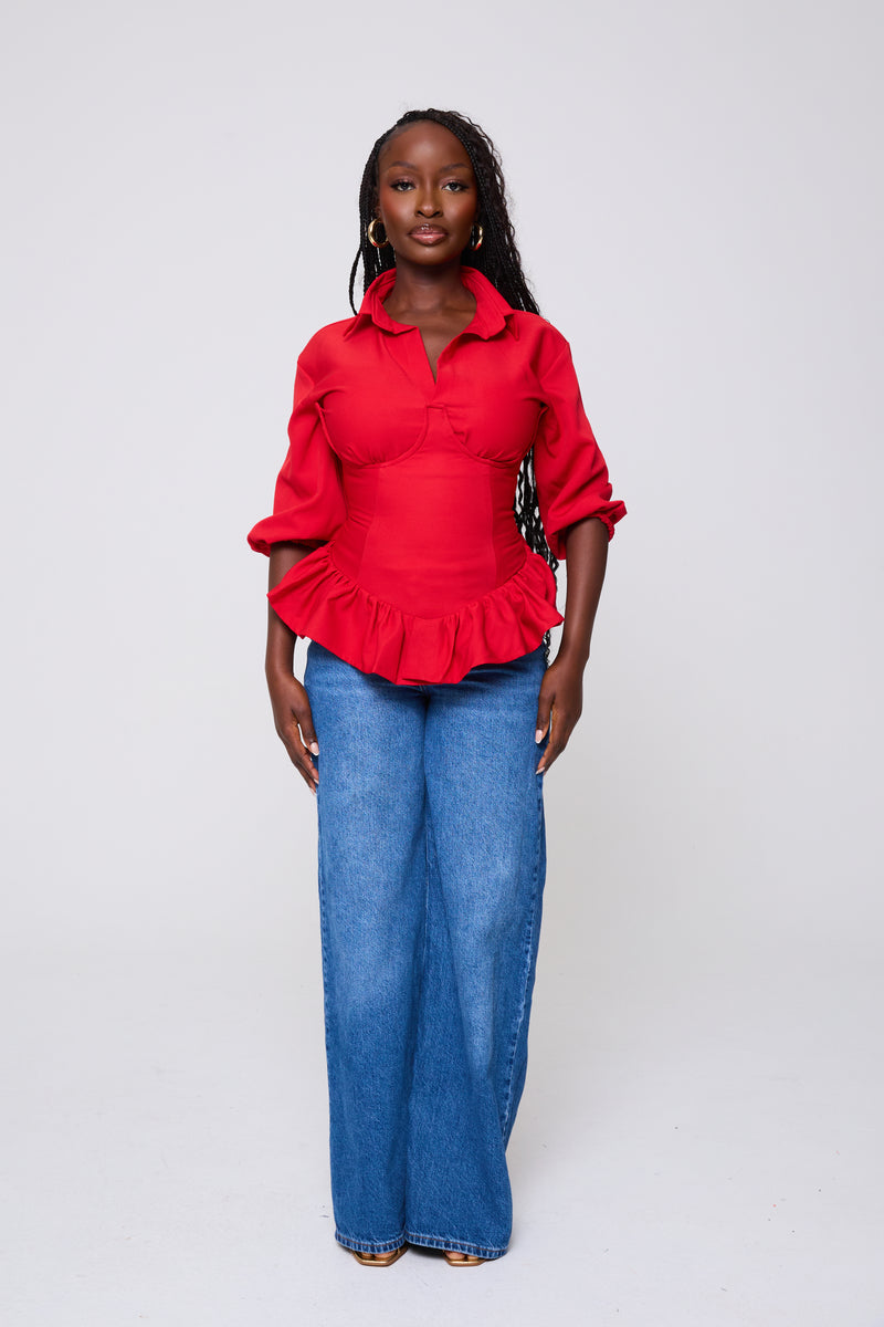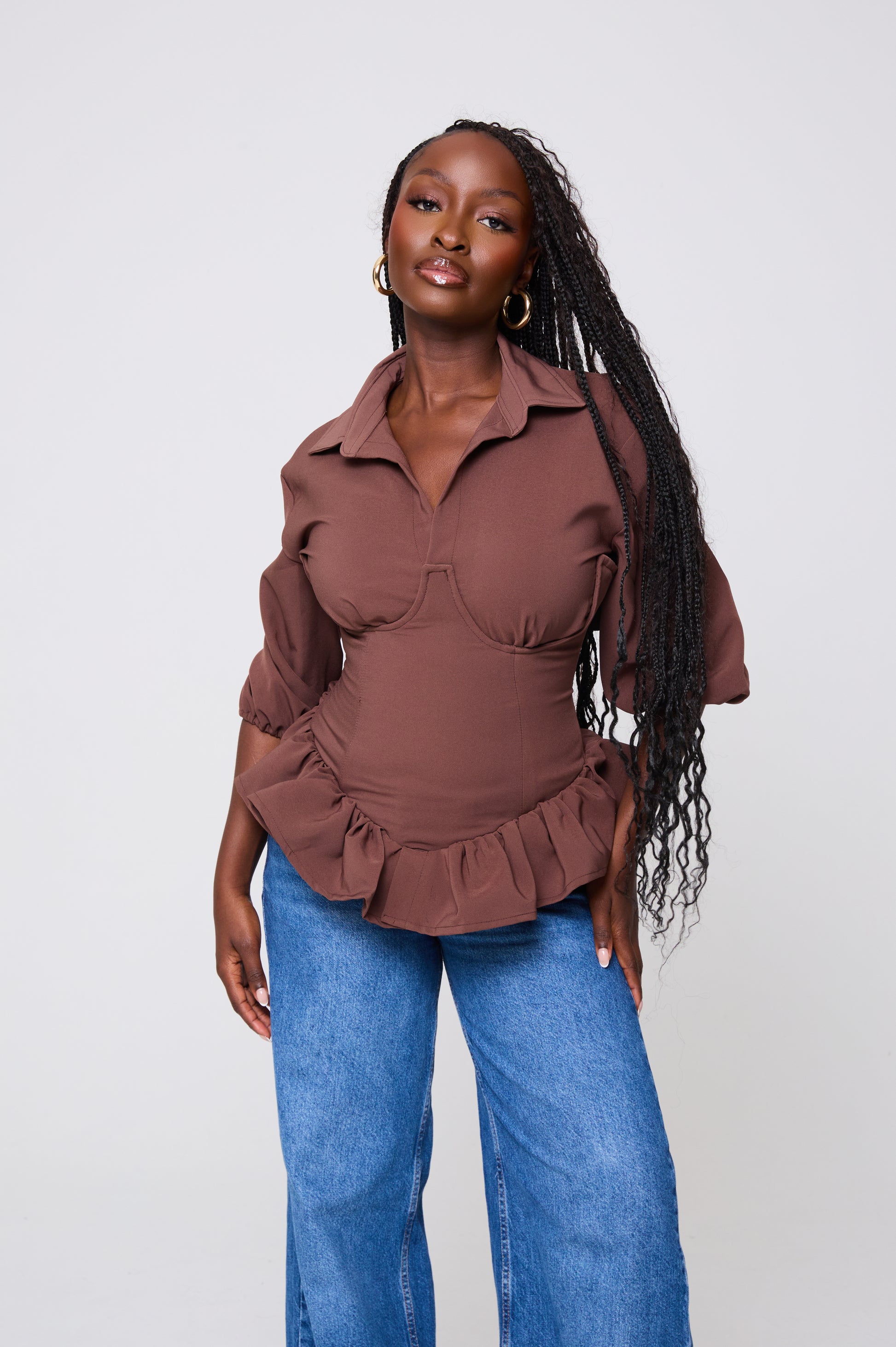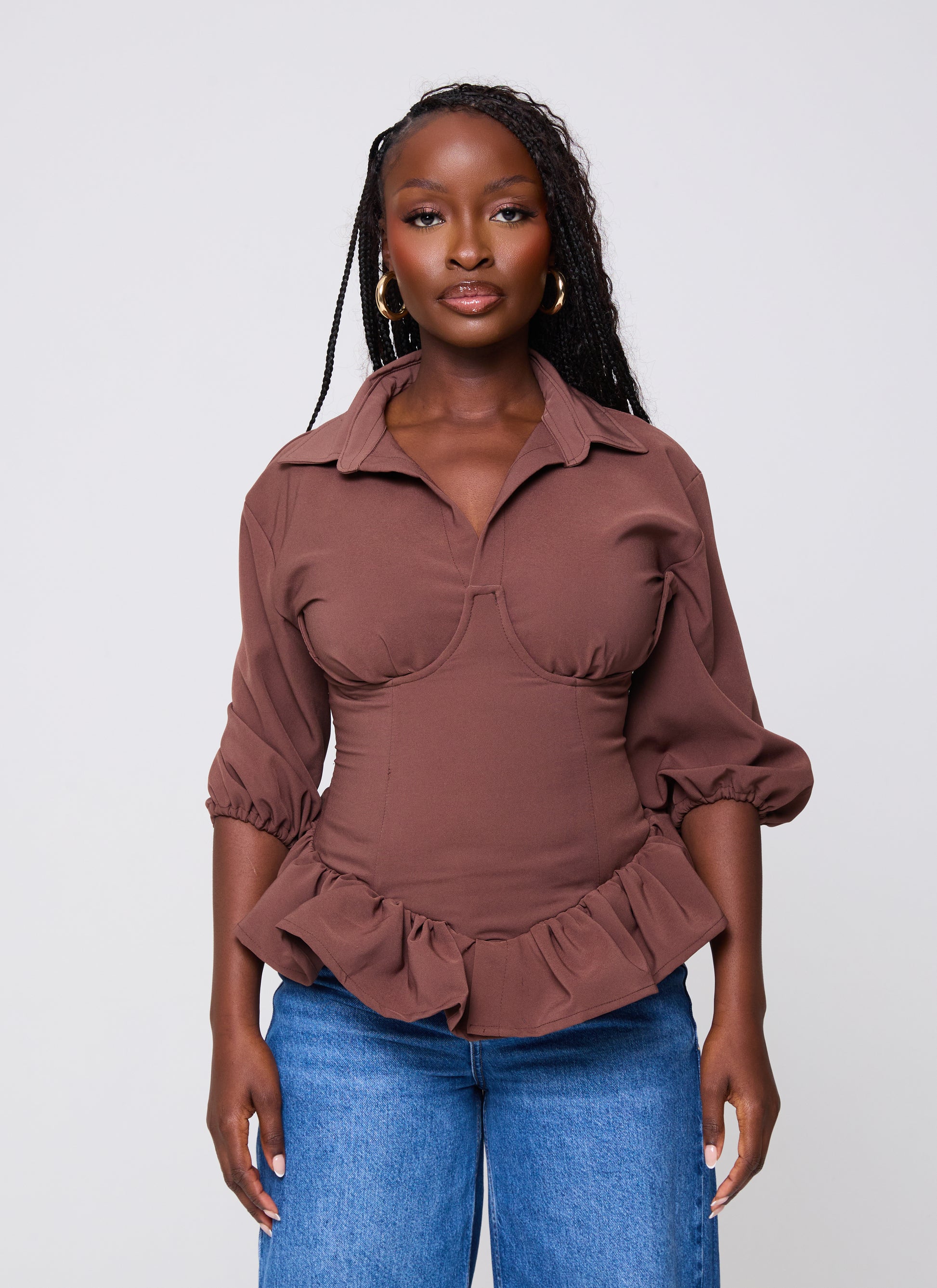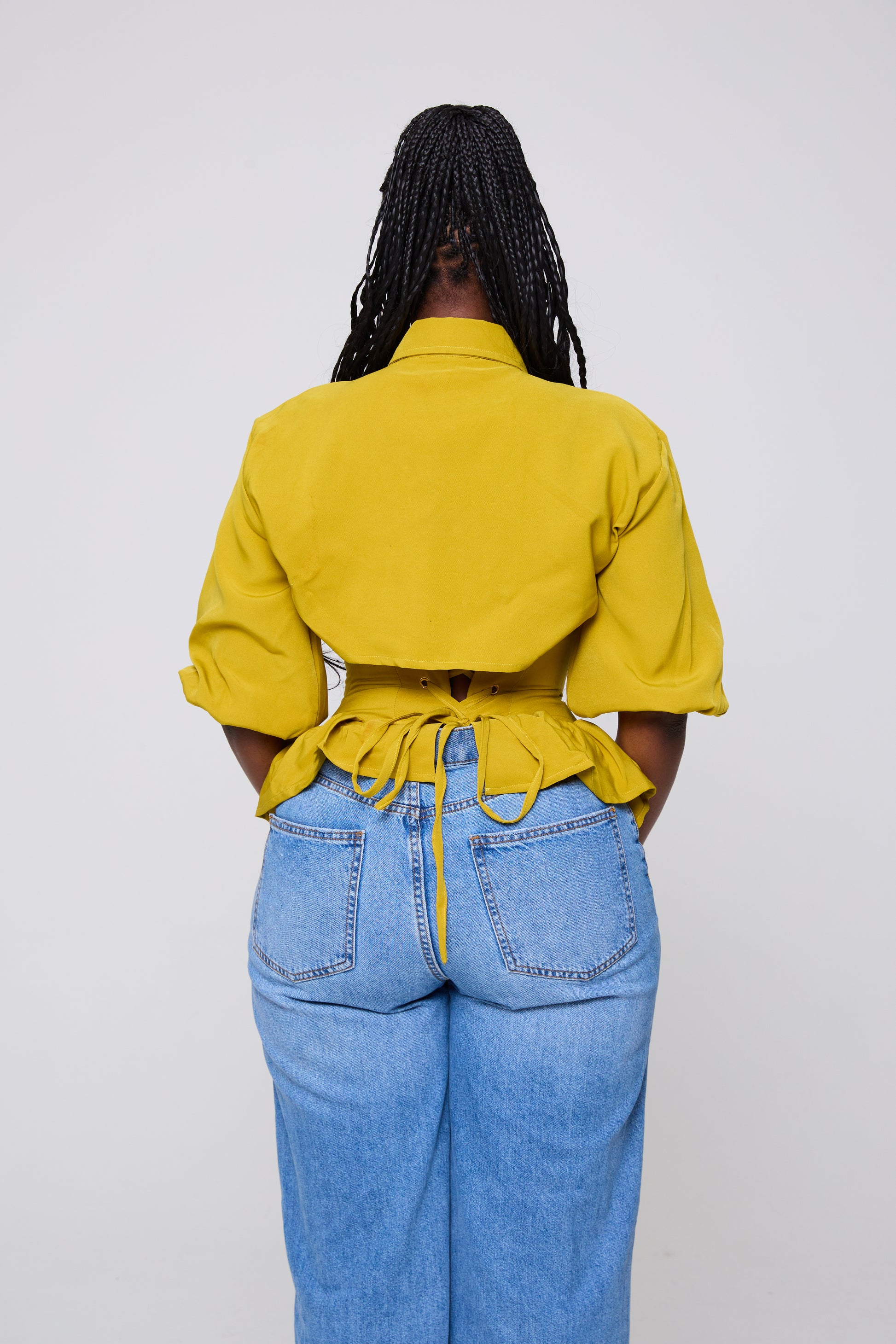 Crafted with a figure-sculpting corset silhouette, it features a collared neckline, soft puff sleeves, and a ruffled peplum hem that accentuates the waist. The adjustable lace-up back ensures the perfect fit, adding a modern twist to a timeless design.