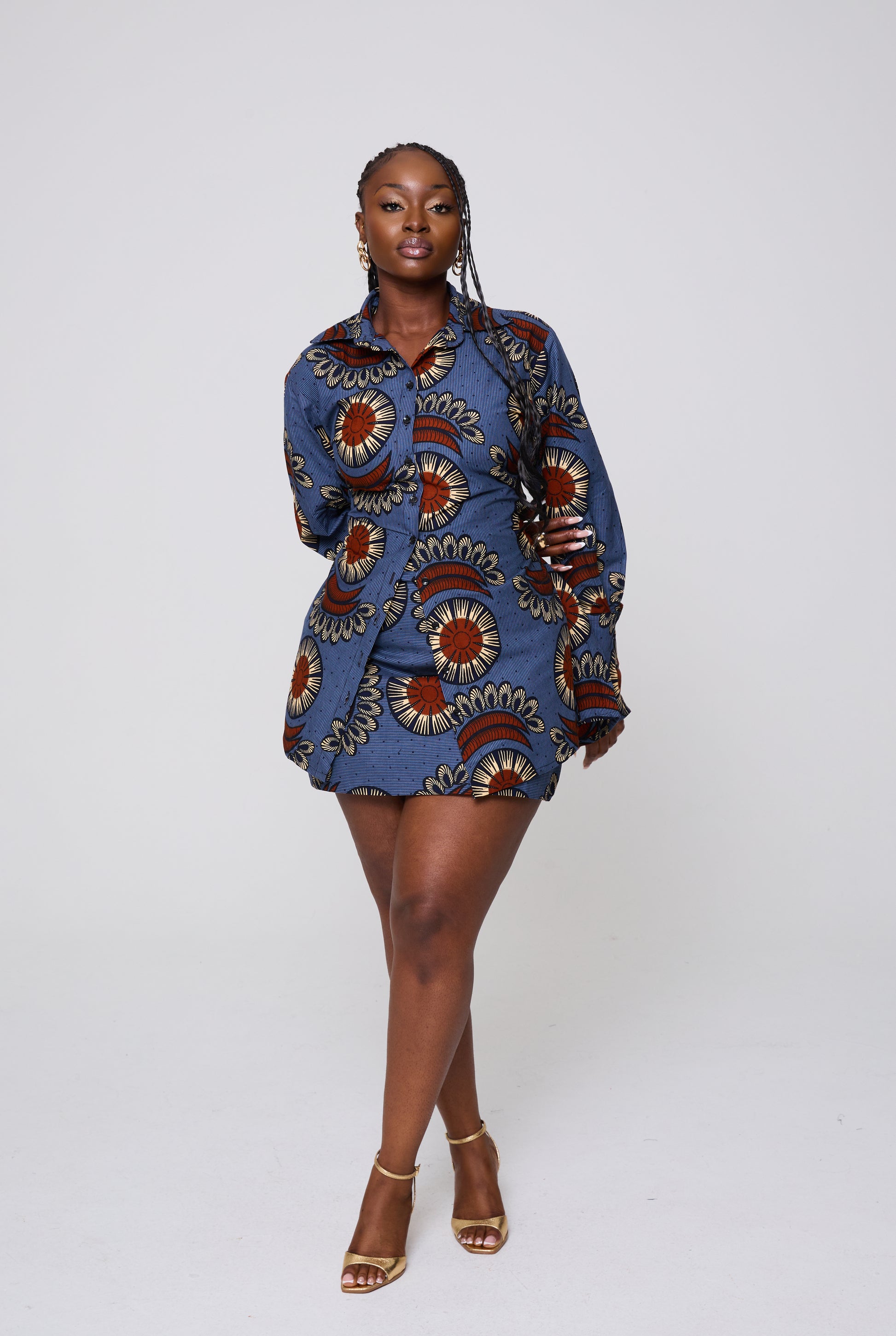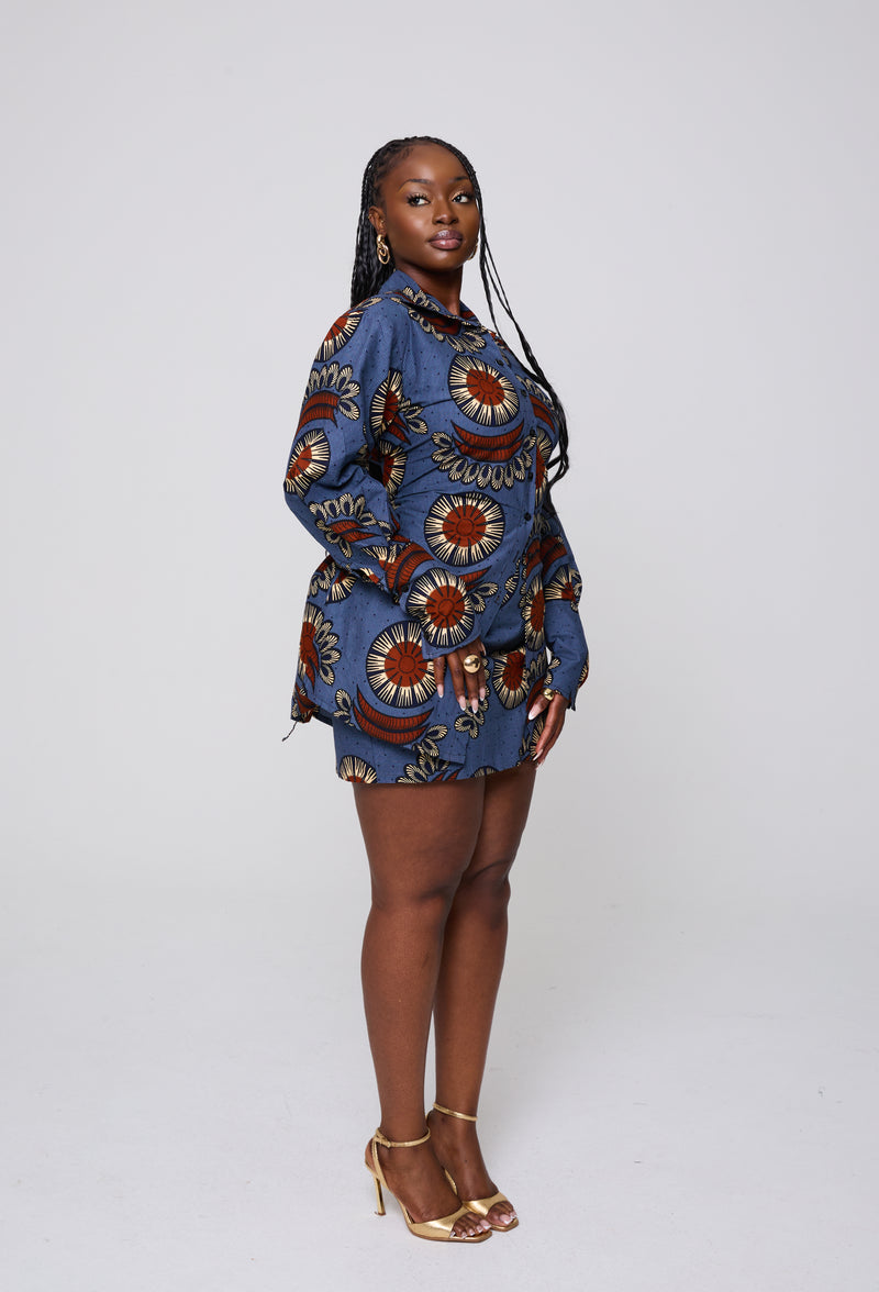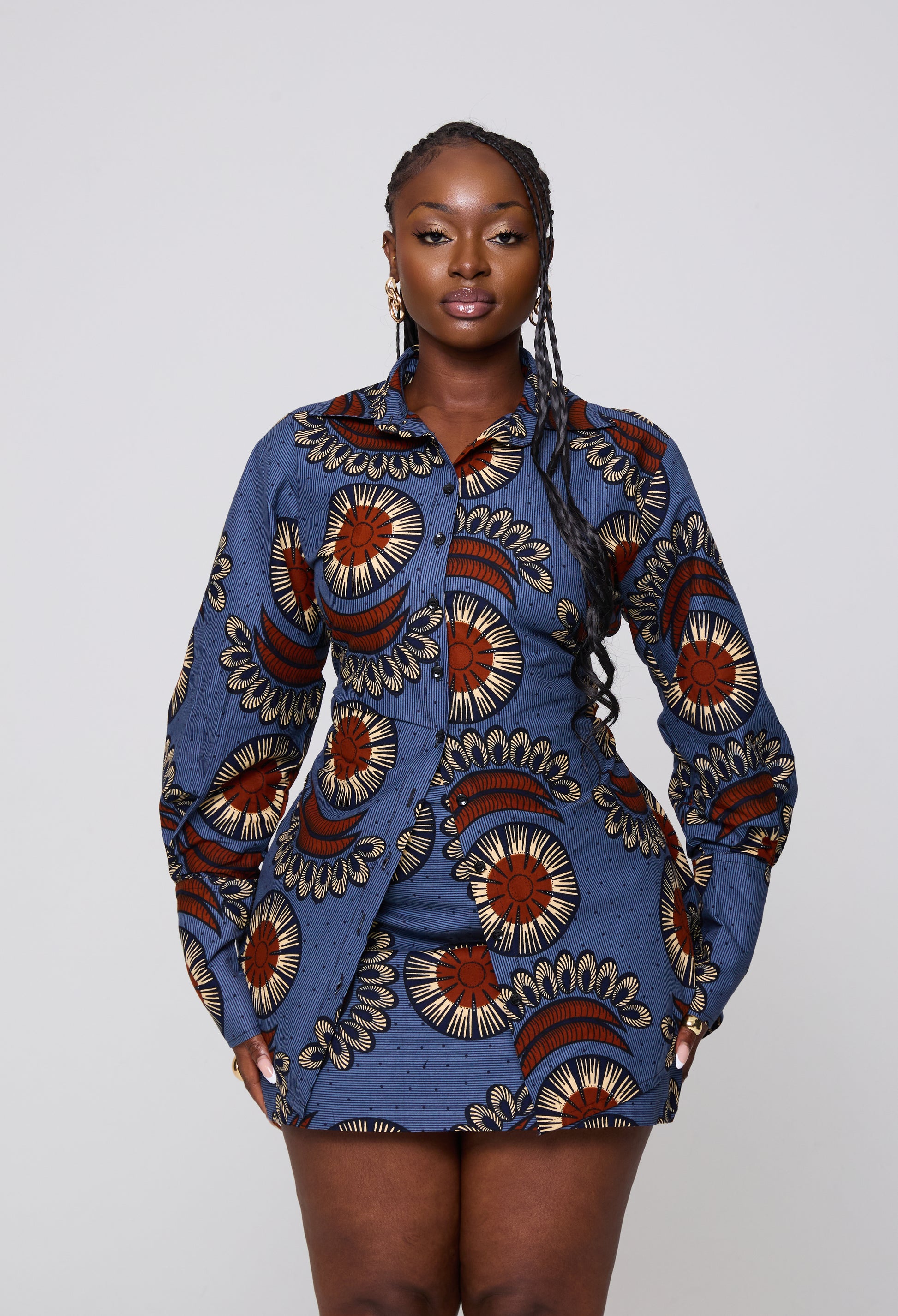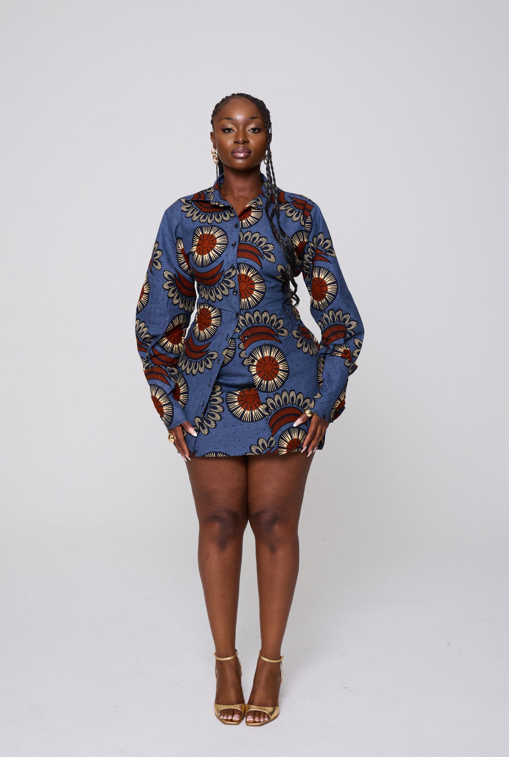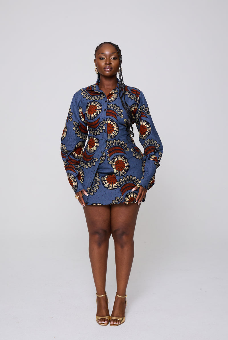 Cut from 100% Ankara cotton, this two-piece set features a structured button-up shirt with a flattering waist tie and a matching mini skirt designed to hug your curves while keeping you comfortable. Perfect for brunch, nights out, or creative workdays.