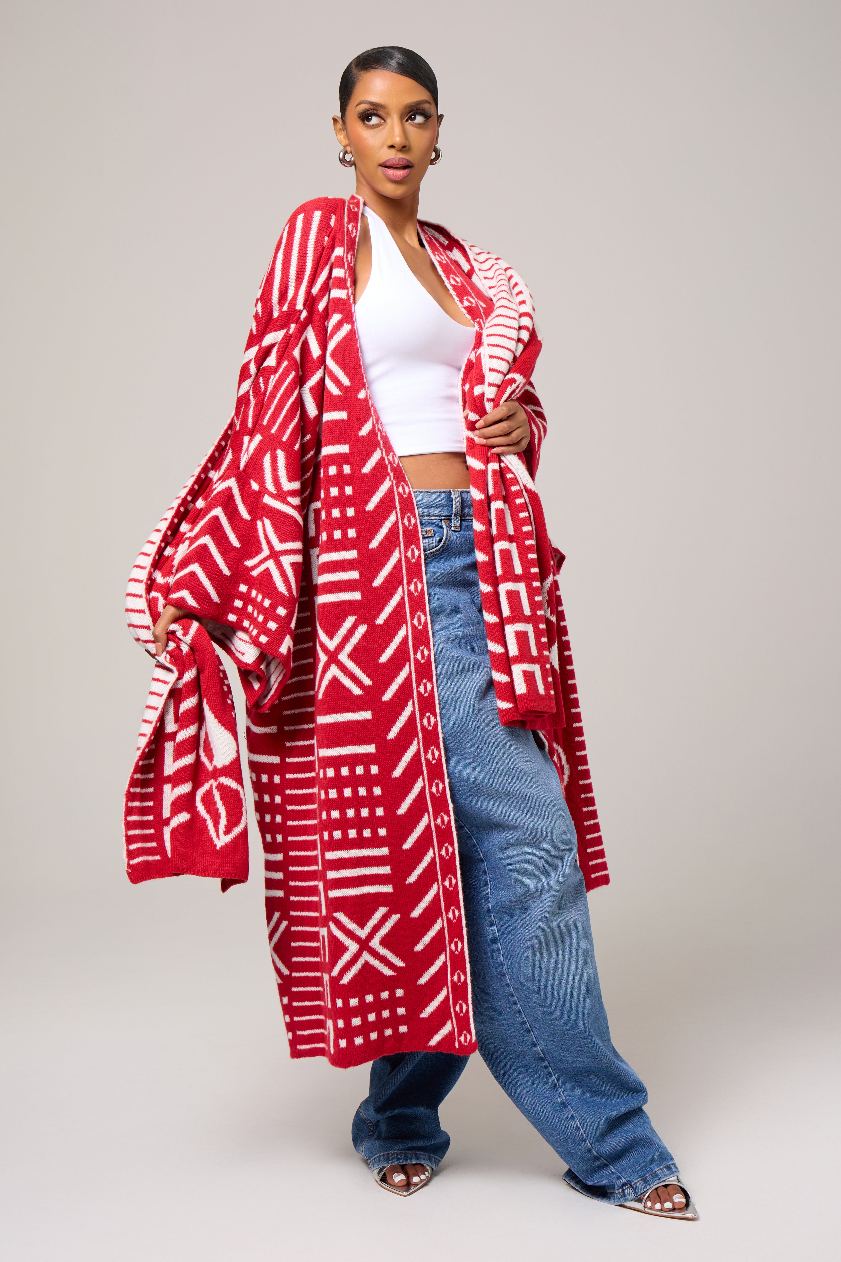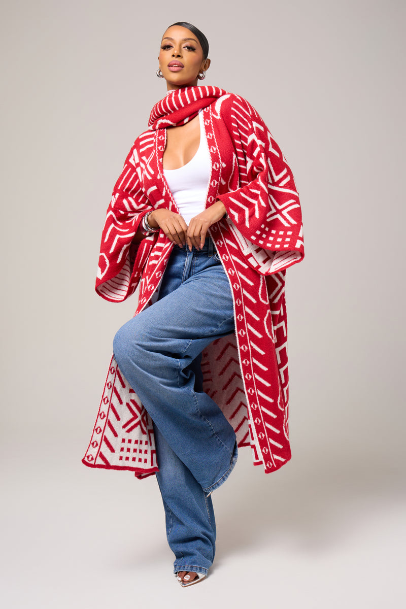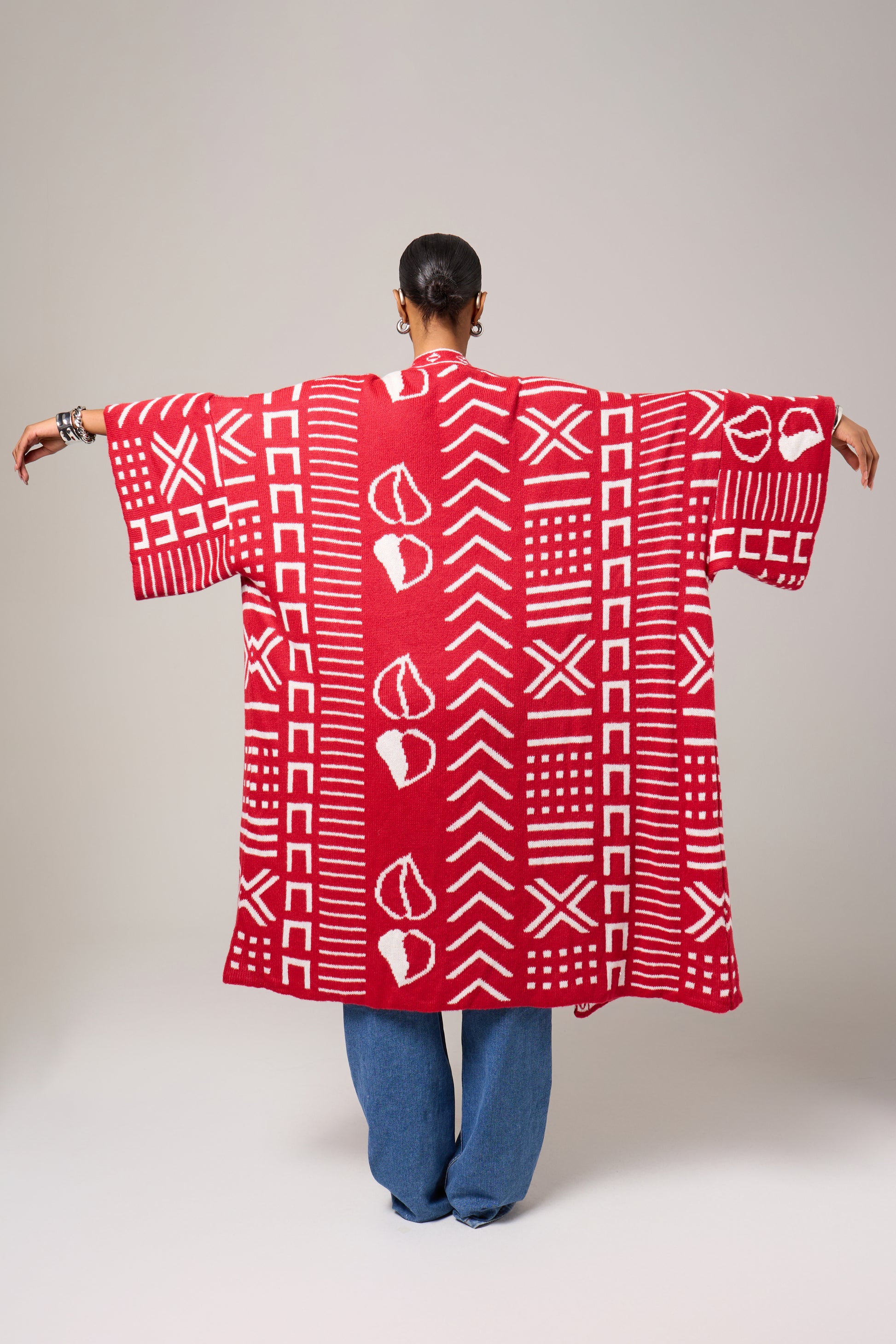 An unapologetic celebration of culture and color, the Nubian Queen Cardigan brings striking symbolism to a relaxed, modern silhouette. Rendered in a vivid red base with contrasting graphic motifs inspired by African visual language, this piece is designed to command attention while offering effortless ease.