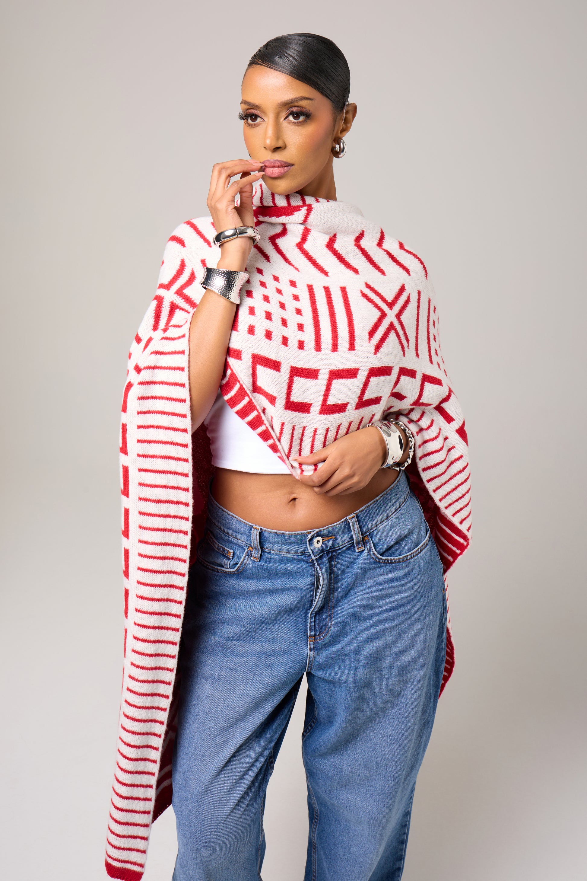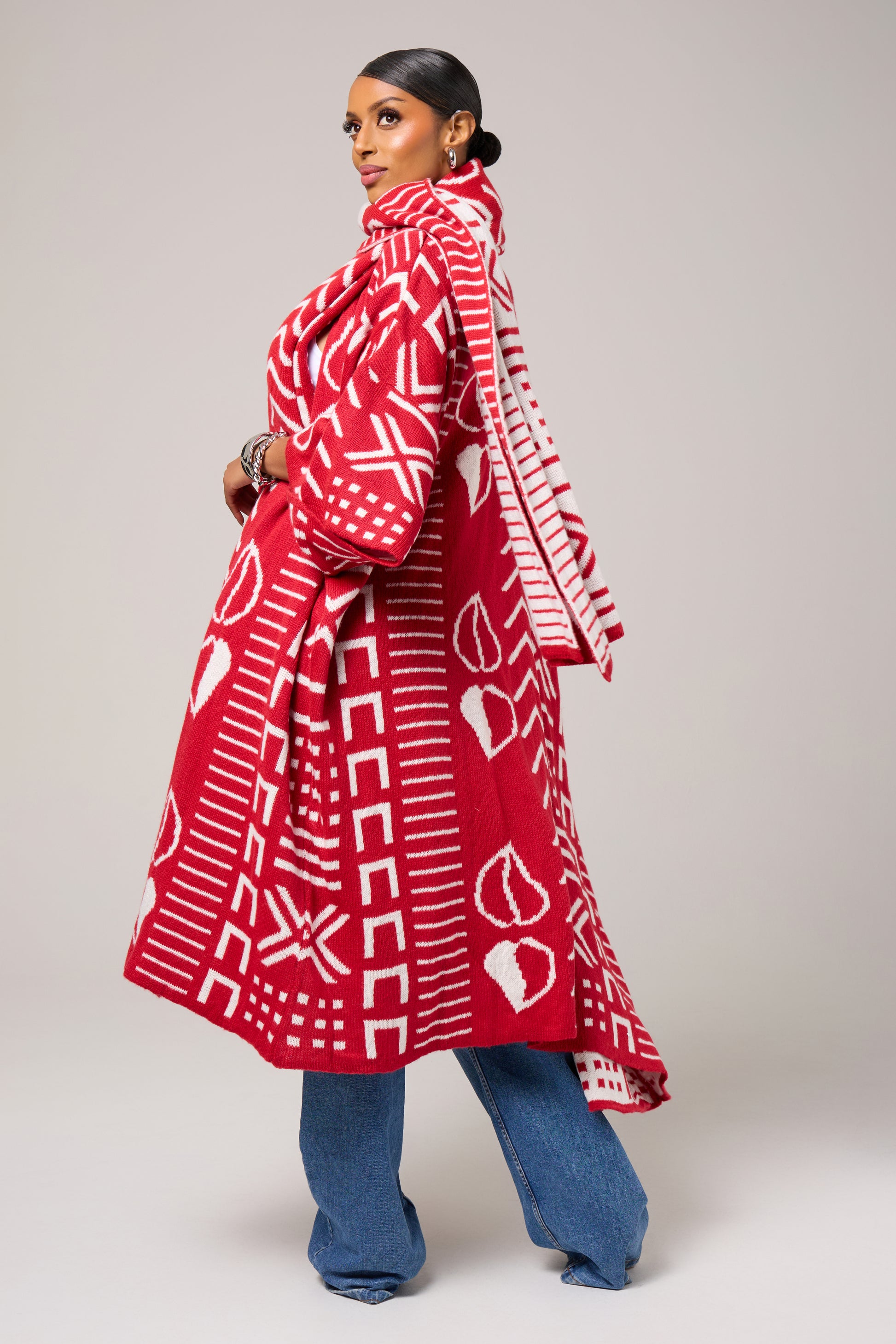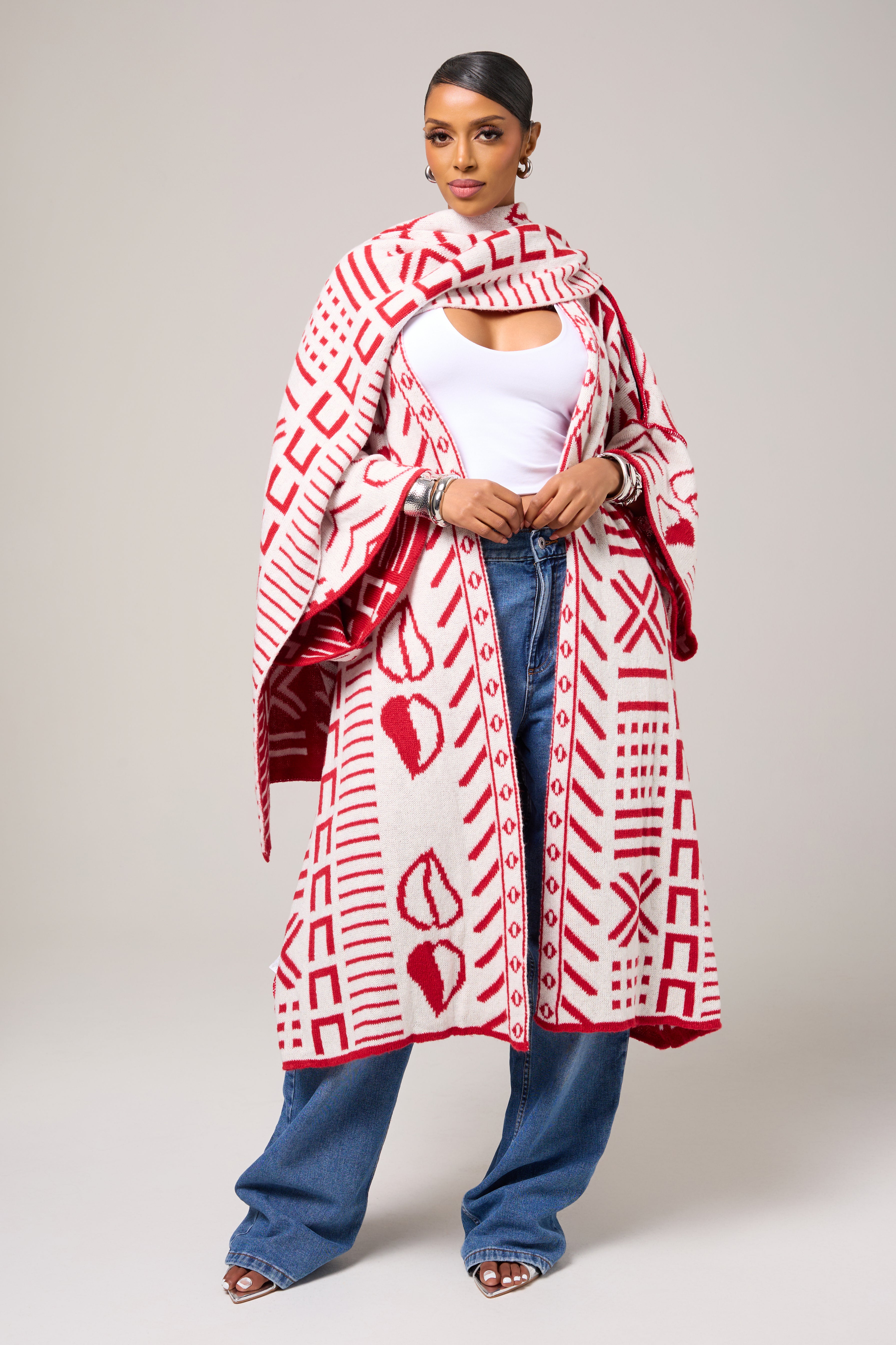 An unapologetic celebration of culture and color, the Nubian Queen Cardigan brings striking symbolism to a relaxed, modern silhouette. Rendered in a vivid red base with contrasting graphic motifs inspired by African visual language, this piece is designed to command attention while offering effortless ease.