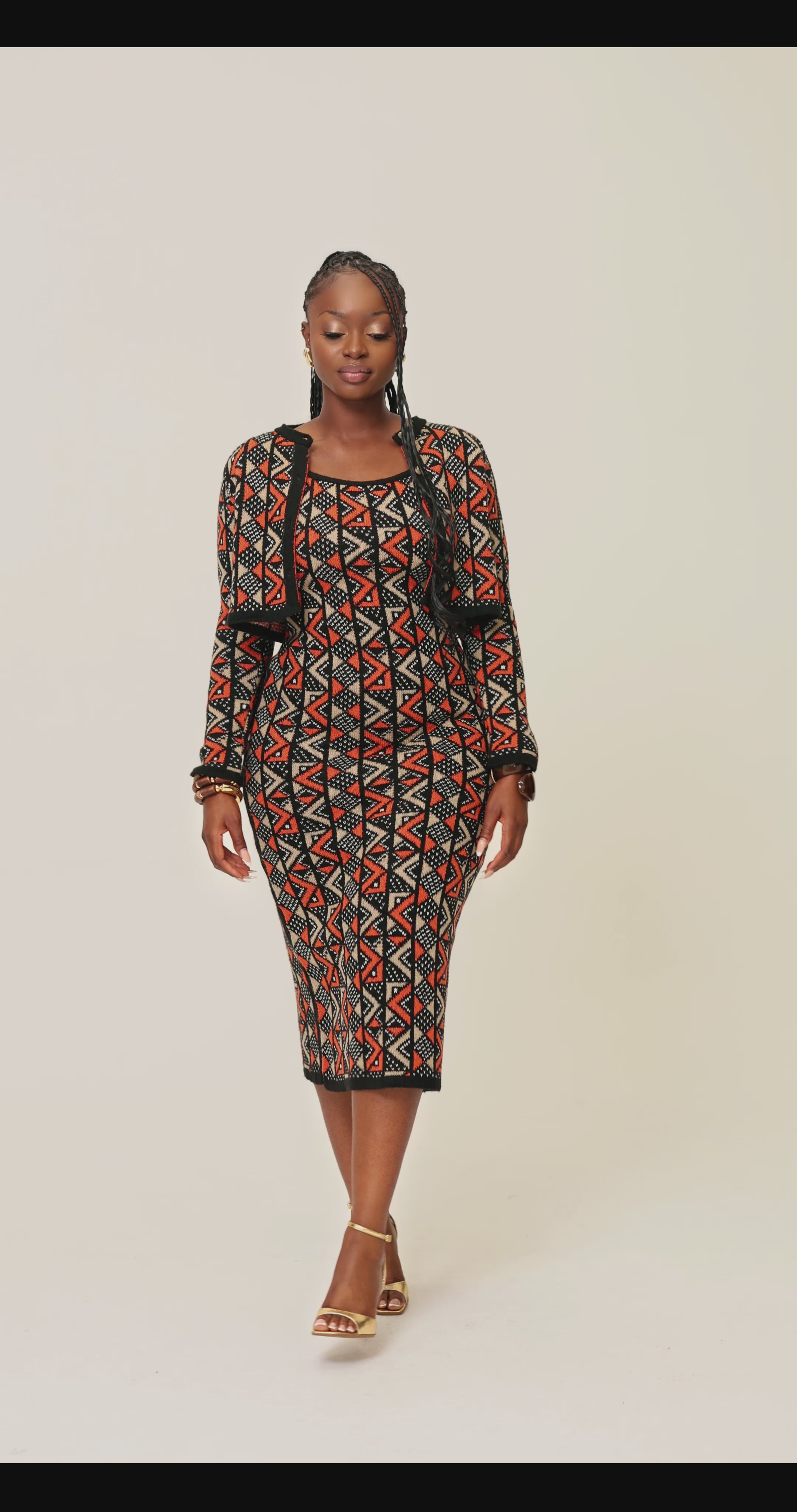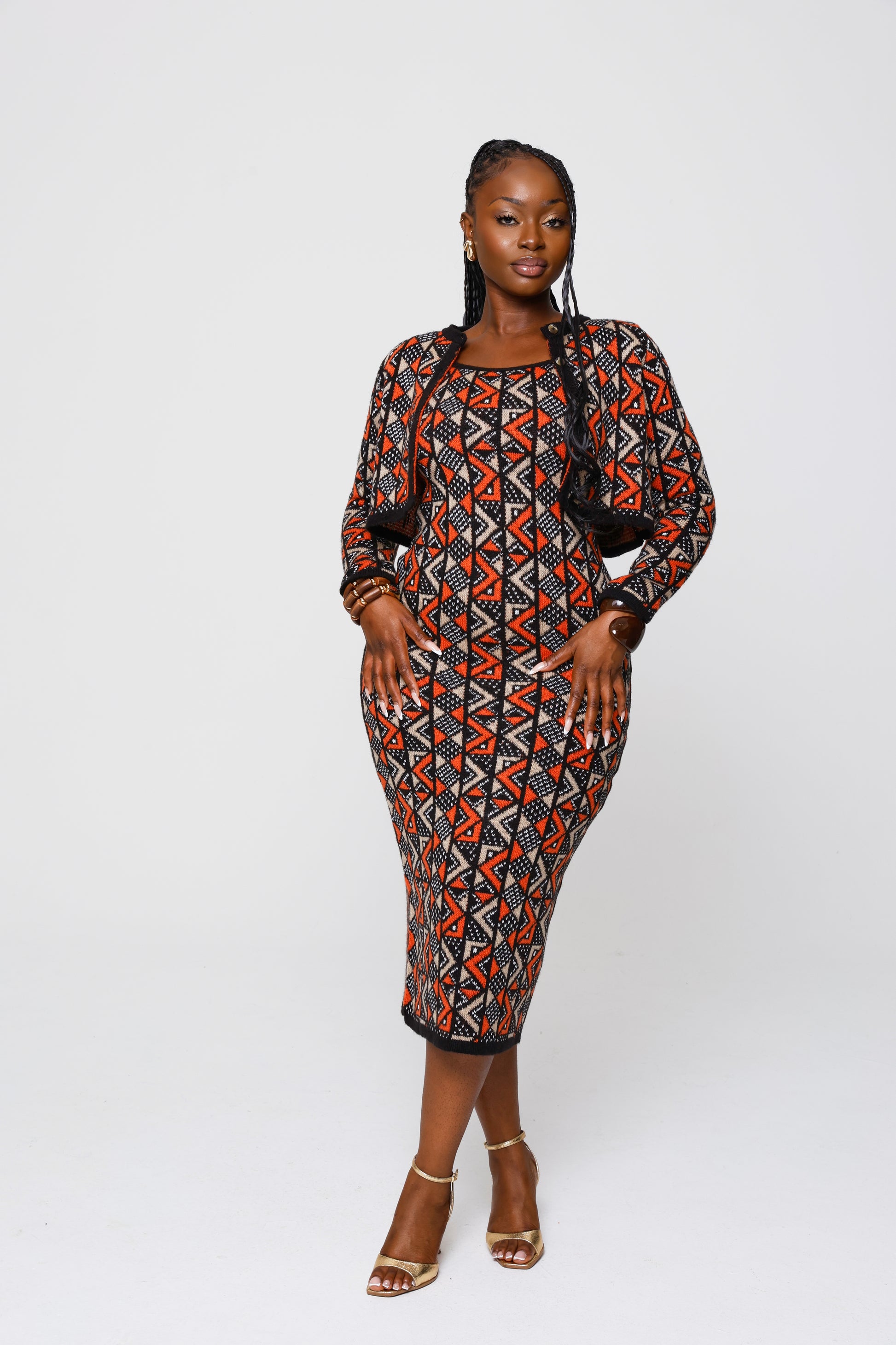 Step into effortless elegance with this bold two-piece knitwear set, crafted with signature Grassfields artistry. The fitted midi dress hugs your curves while the cropped button cardigan adds structure and versatility.