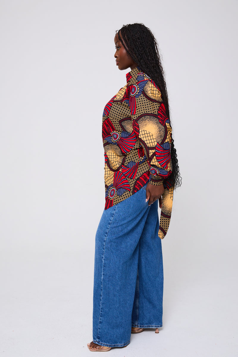 This statement shirt features a vibrant African-inspired print that radiates confidence. Designed with a structured collar, long sleeves, and a flattering wrap detail that ties at the back to accentuate the waist.