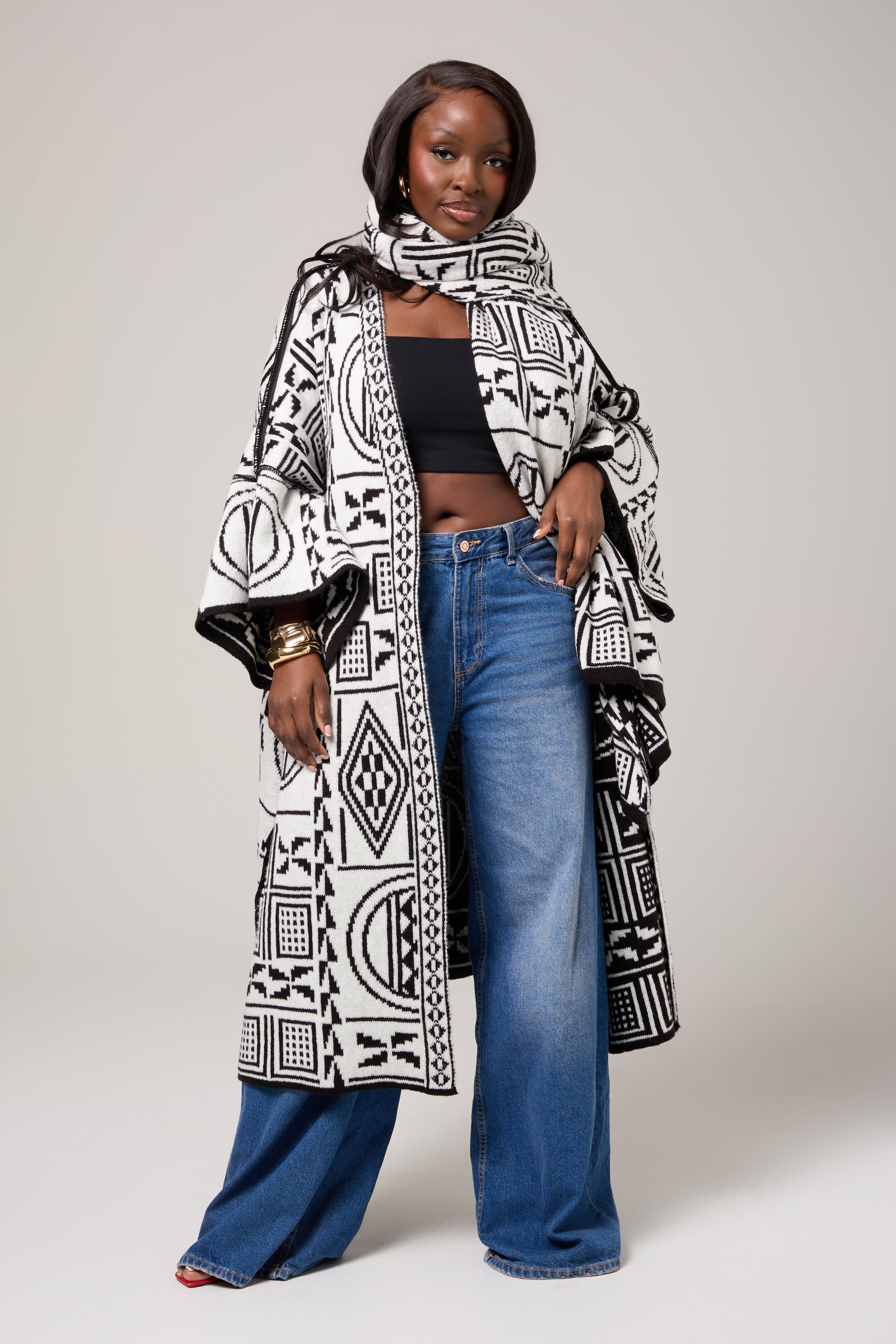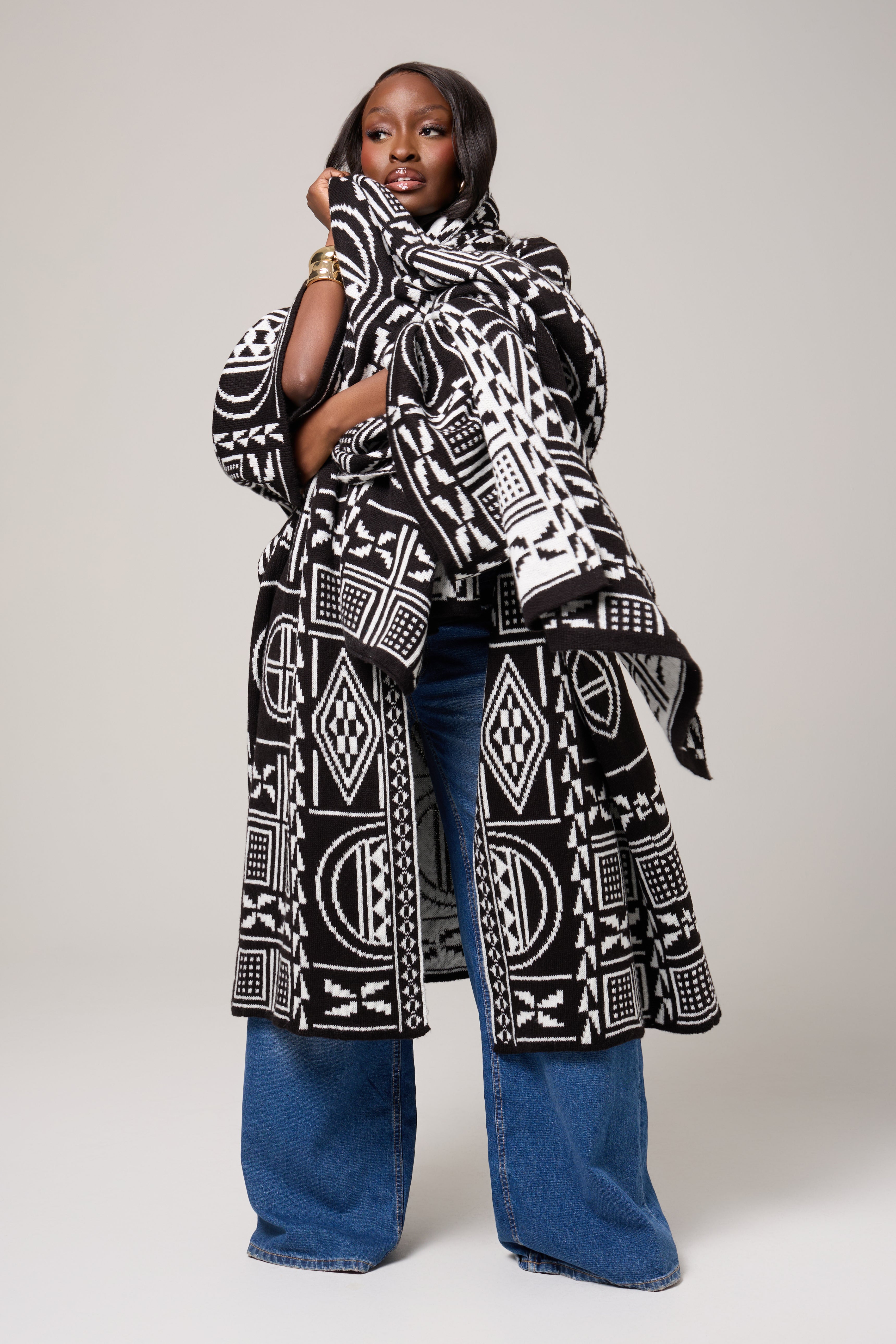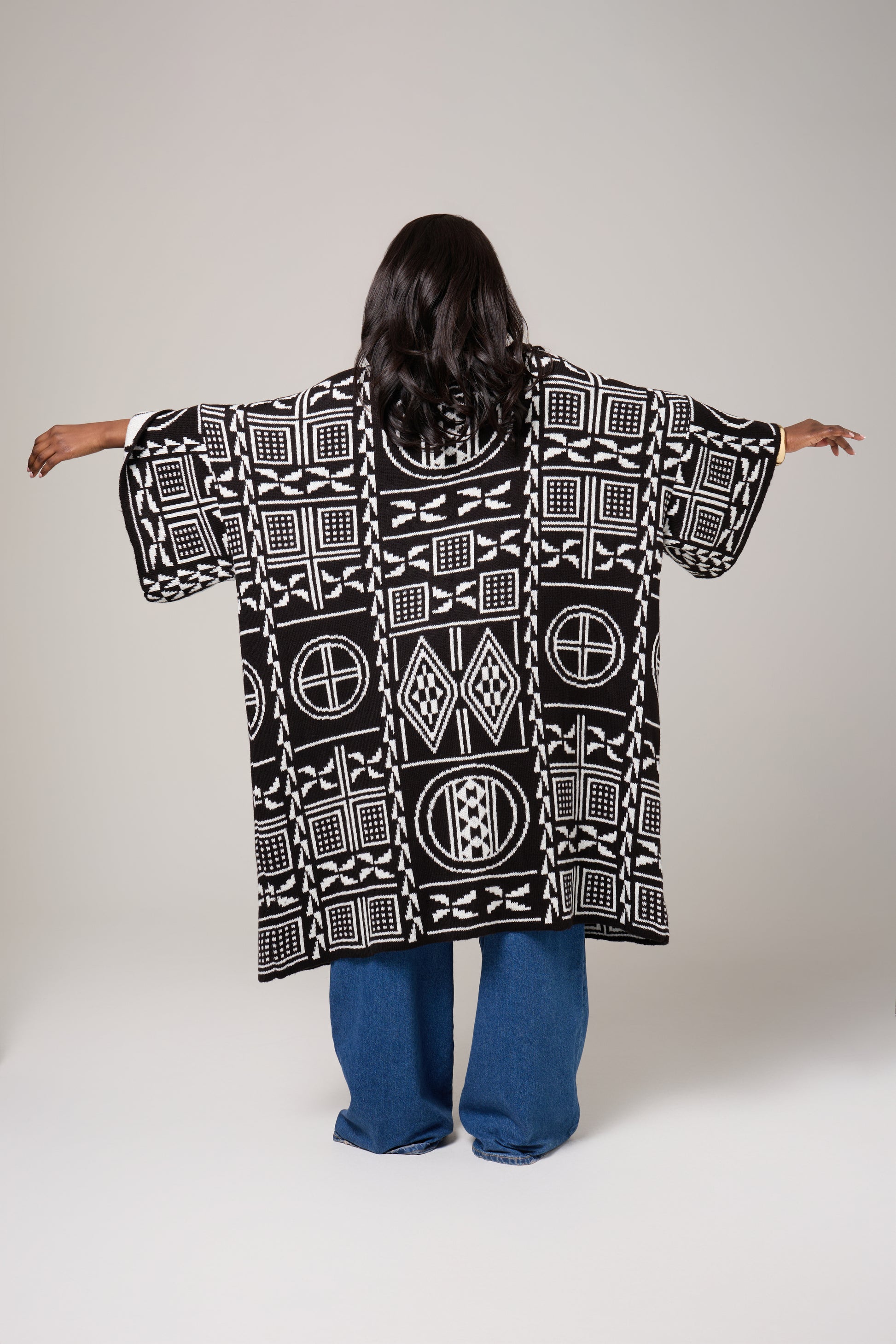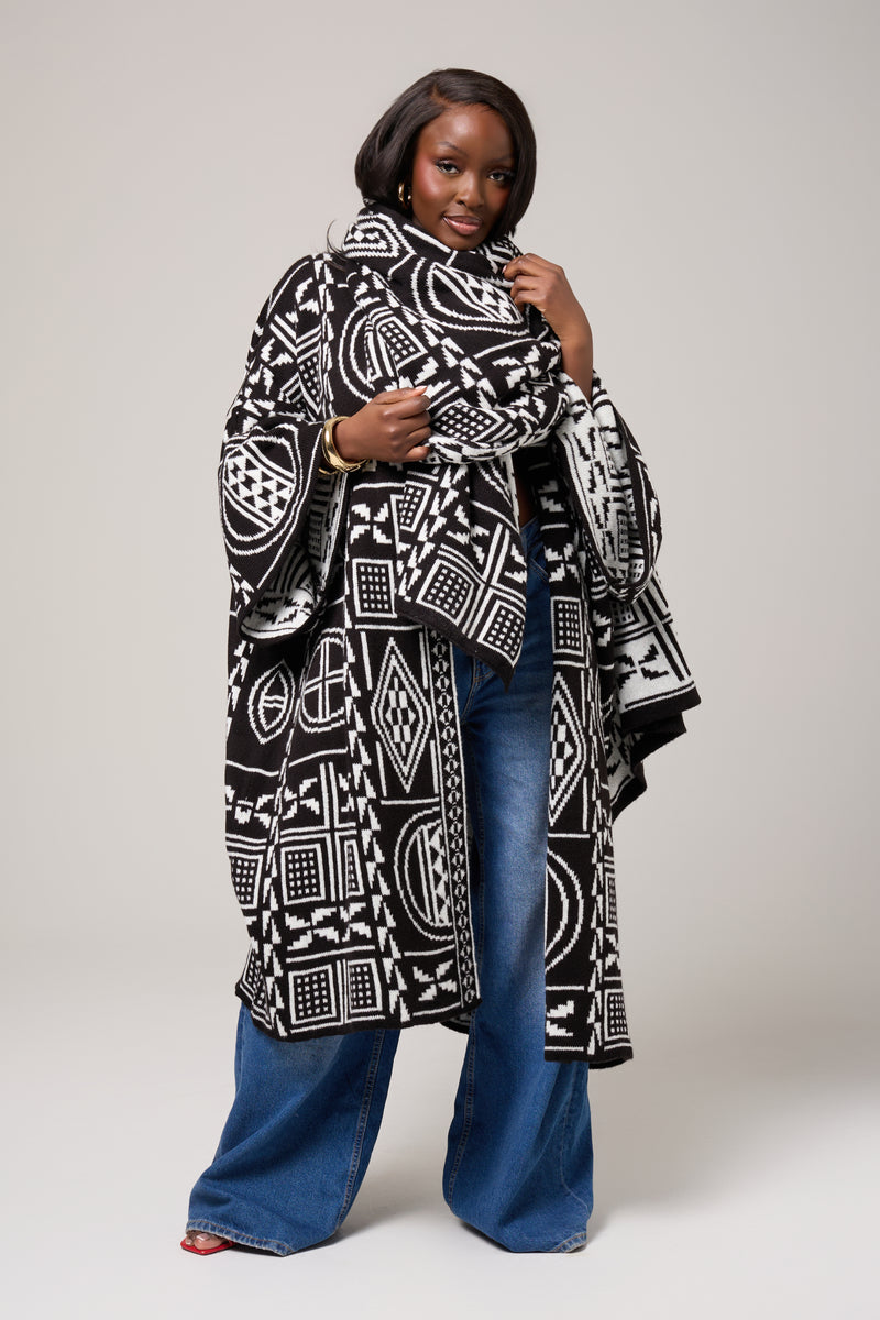 A striking blend of tradition and contemporary ease, the Mireya Cardigan is designed to drape effortlessly while making a bold visual statement. Featuring an intricate black-and-ivory geometric motif inspired by African symbolism, this piece brings depth, texture, and quiet confidence to everyday dressing.