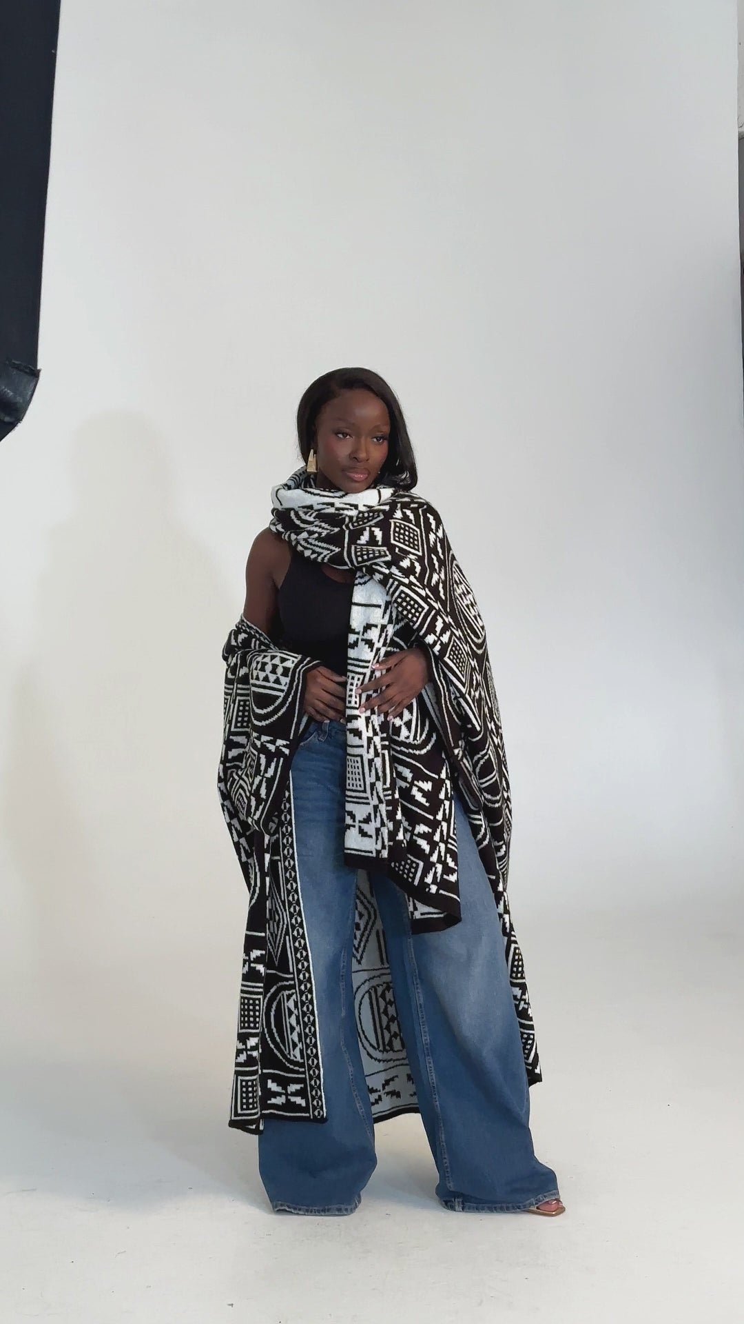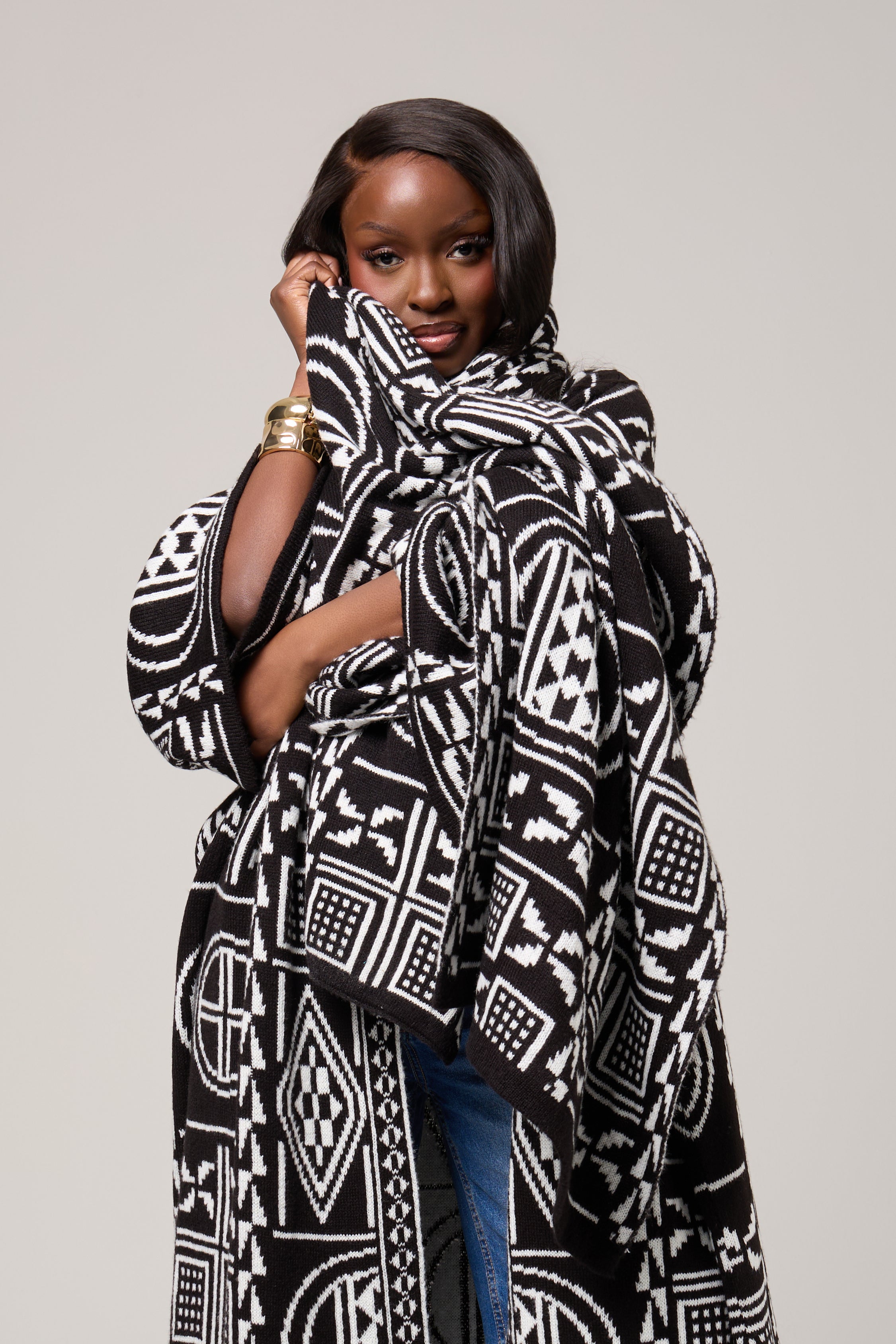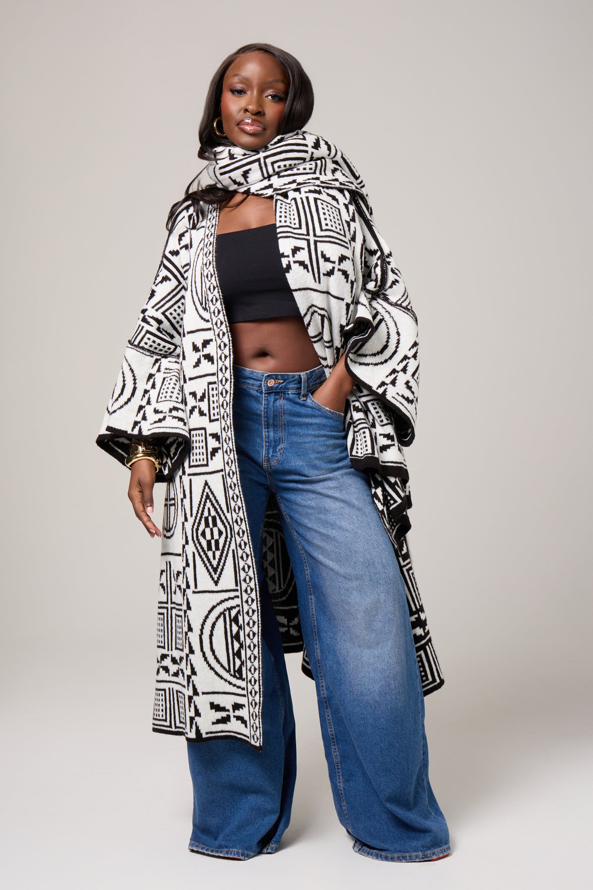 A striking blend of tradition and contemporary ease, the Mireya Cardigan is designed to drape effortlessly while making a bold visual statement. Featuring an intricate black-and-ivory geometric motif inspired by African symbolism, this piece brings depth, texture, and quiet confidence to everyday dressing.