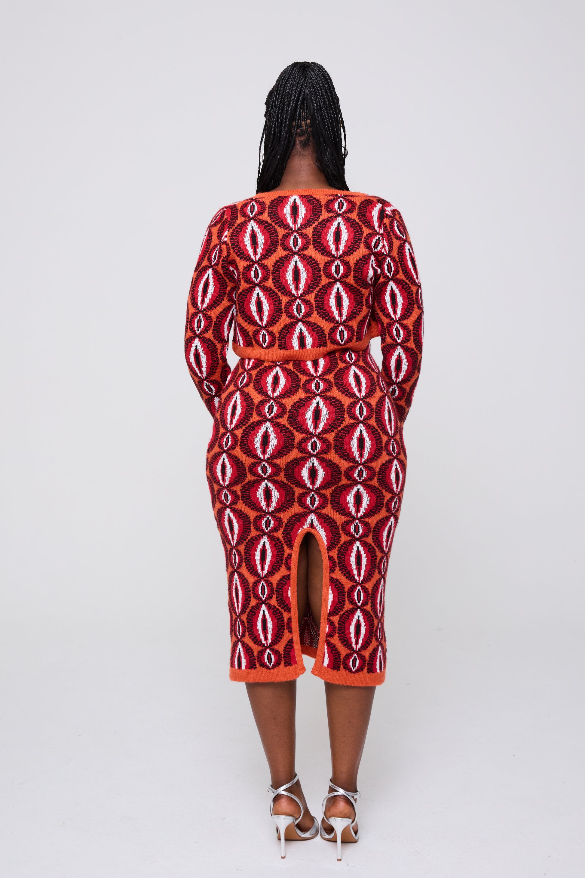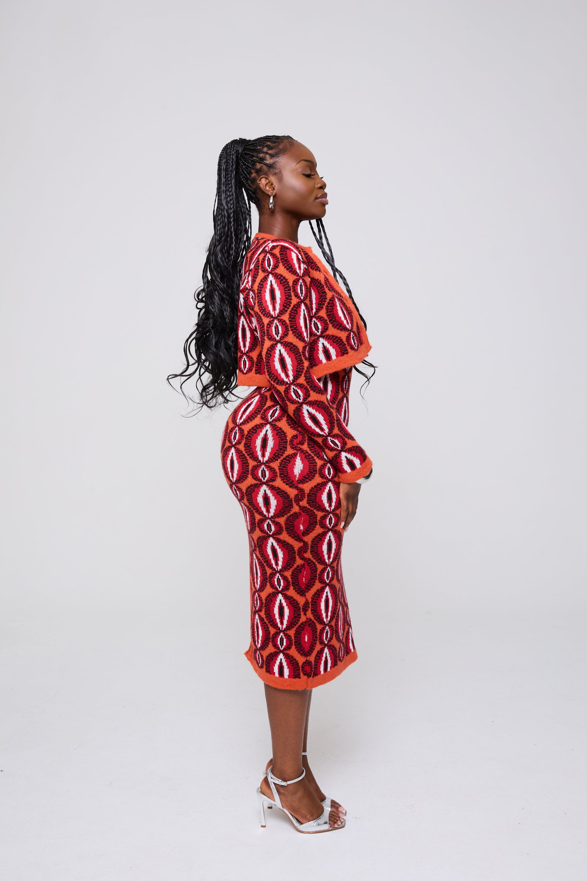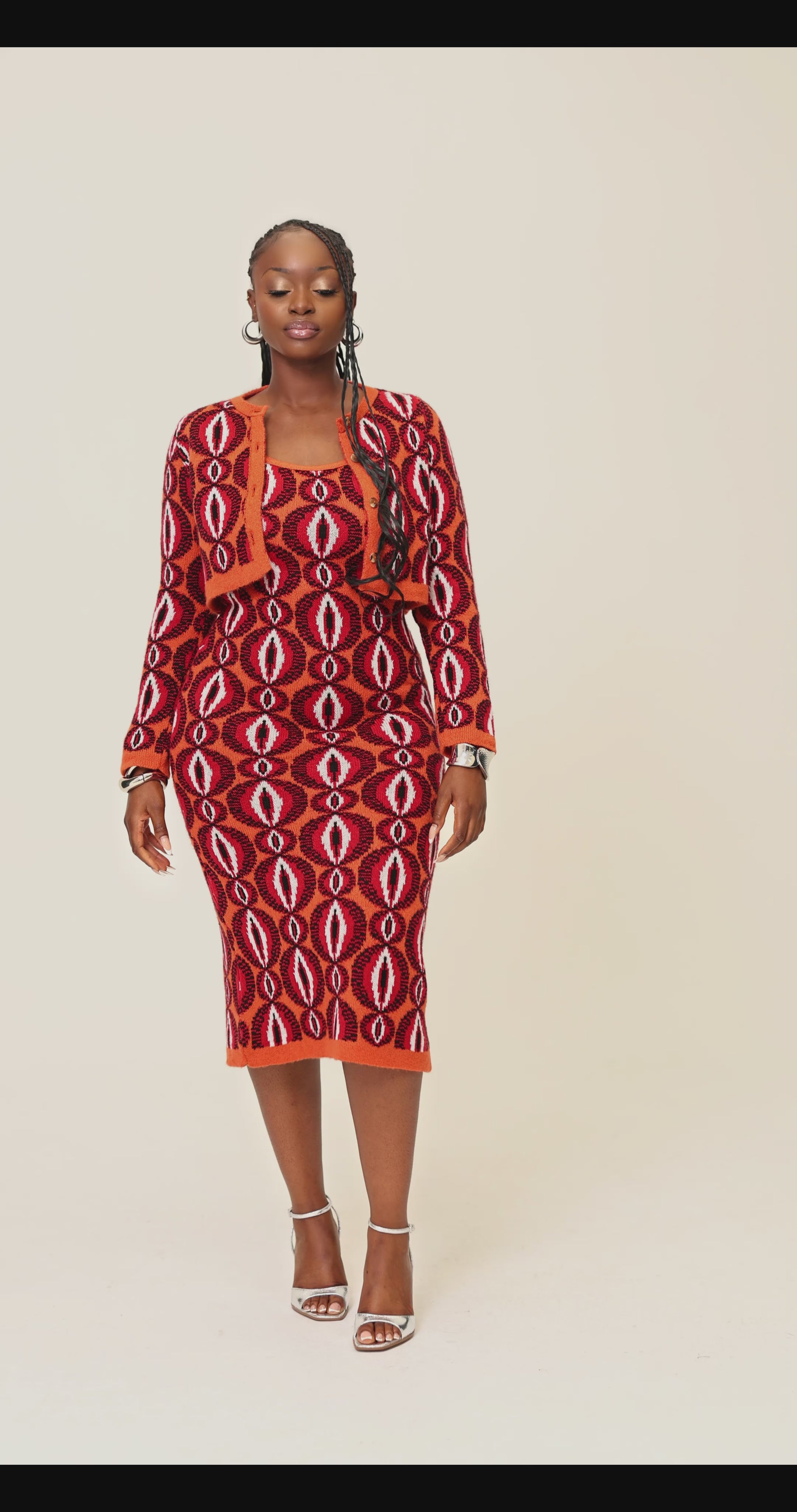 Step into effortless elegance with this bold two-piece knitwear set, crafted with signature Grassfields artistry. The fitted midi dress hugs your curves while the cropped button cardigan adds structure and versatility.