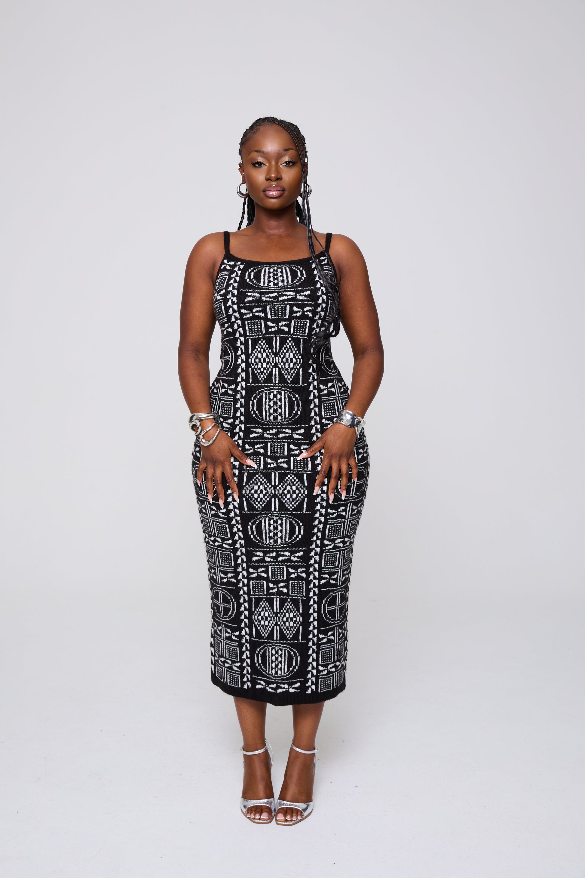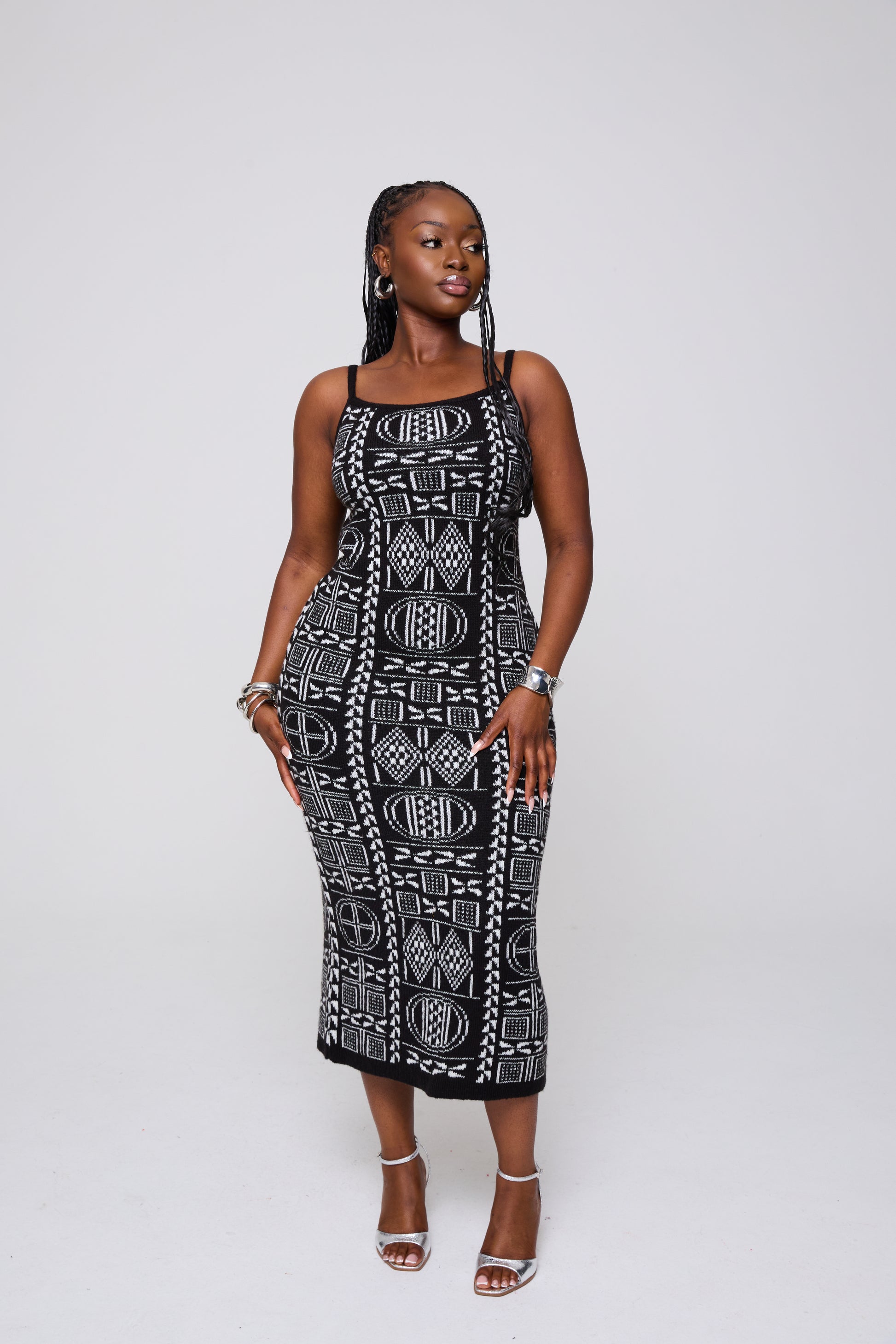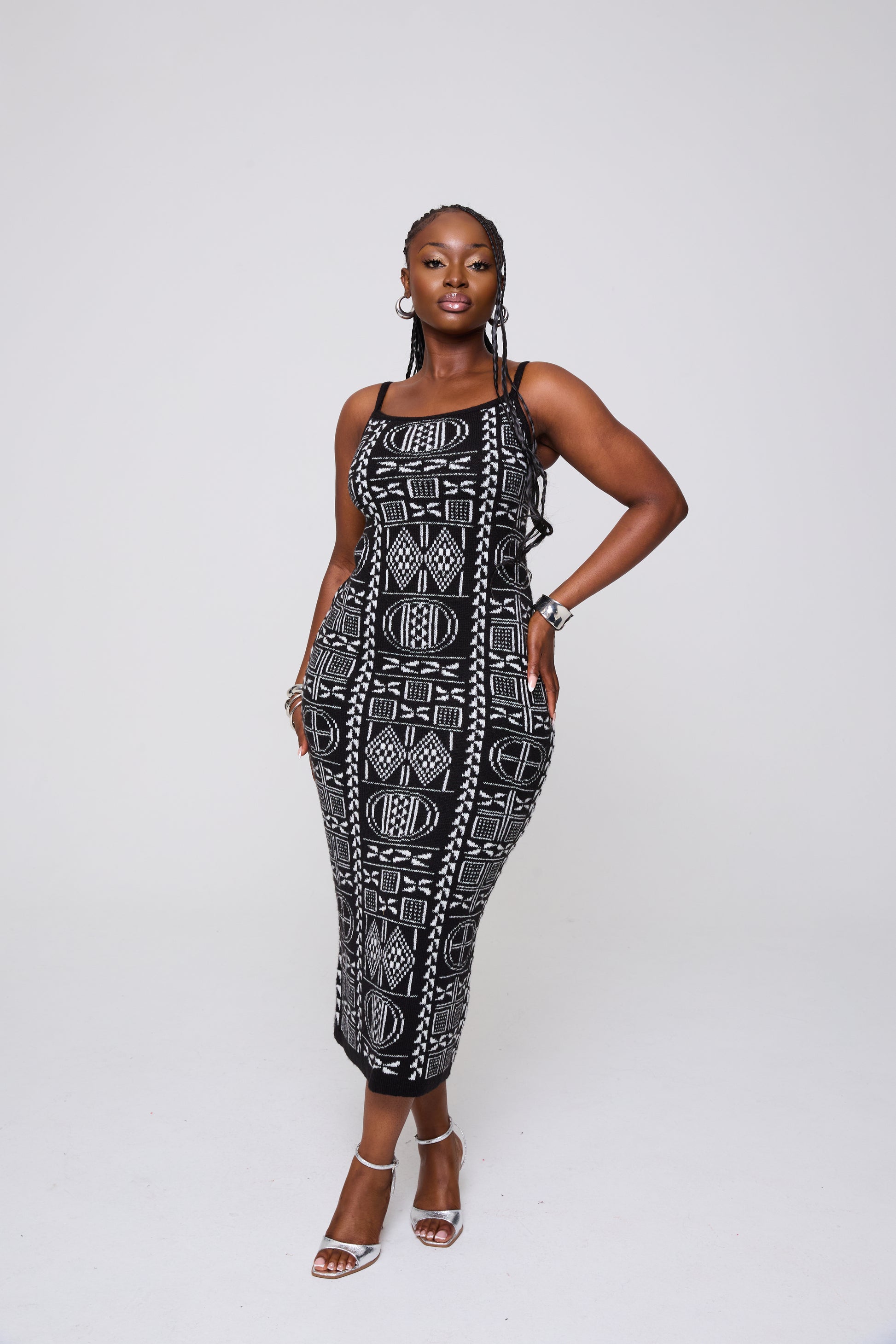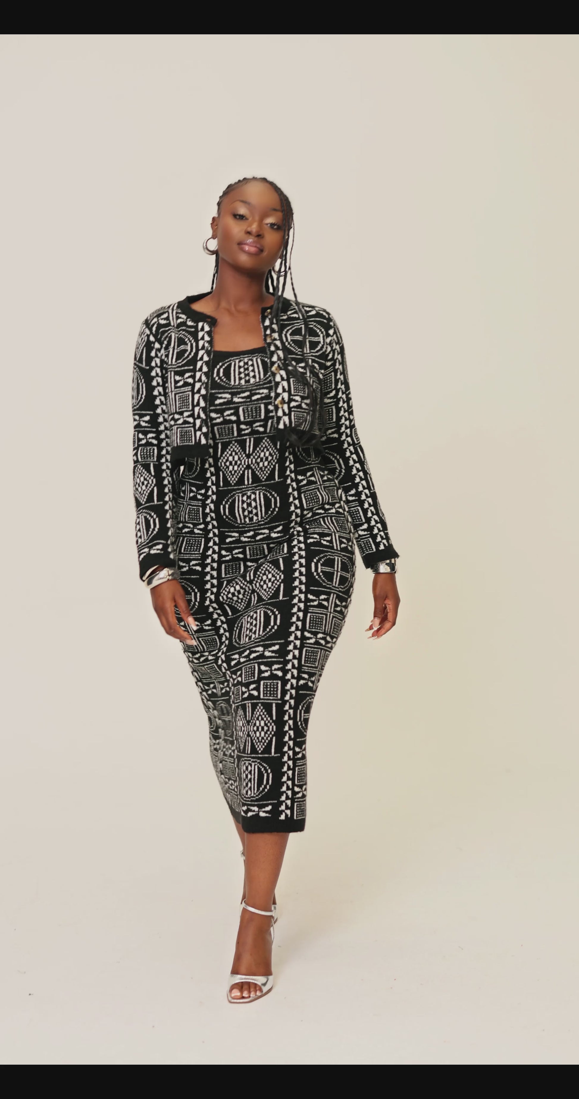 Step into effortless elegance with this bold two-piece knitwear set, crafted with signature Grassfields artistry. The fitted midi dress hugs your curves while the cropped button cardigan adds structure and versatility.
