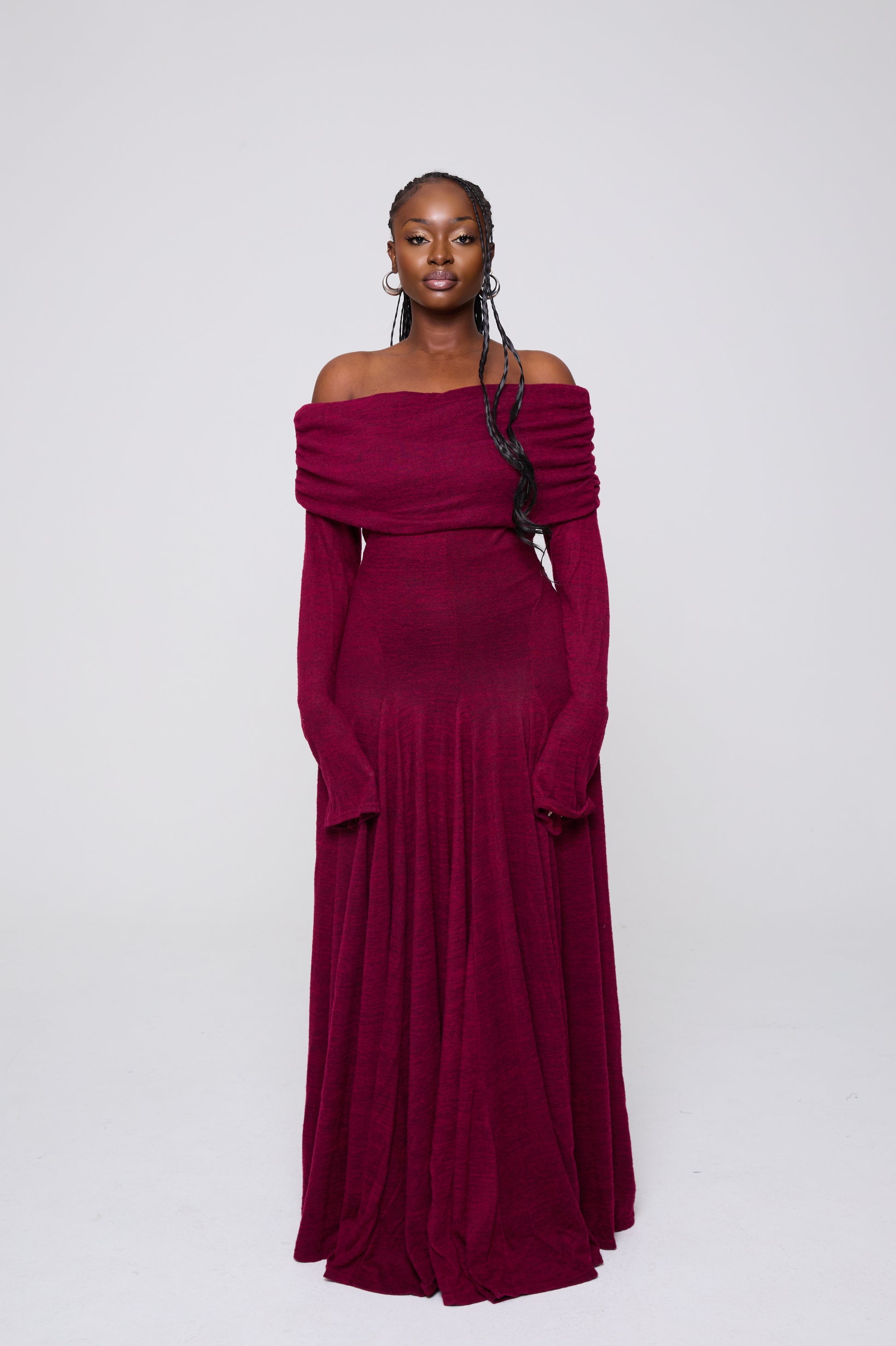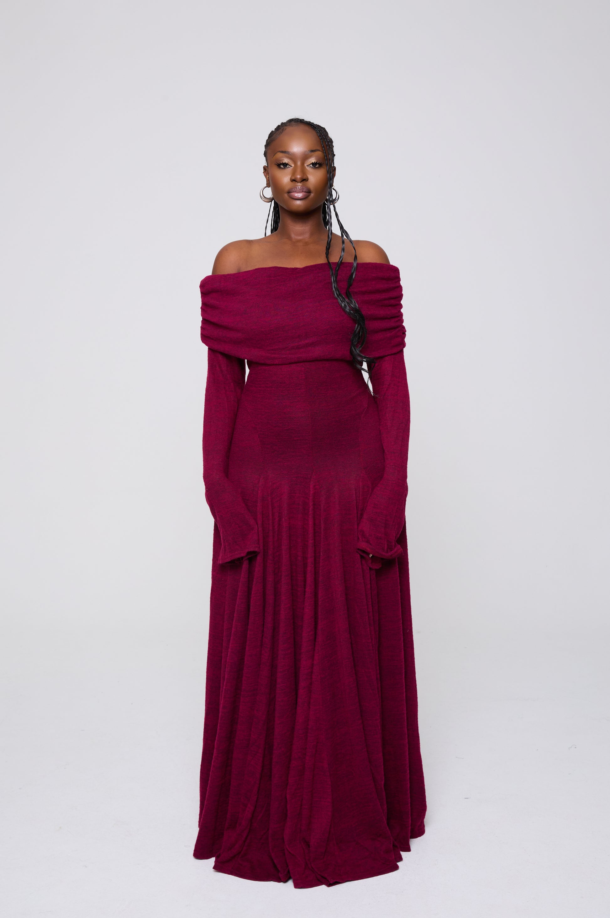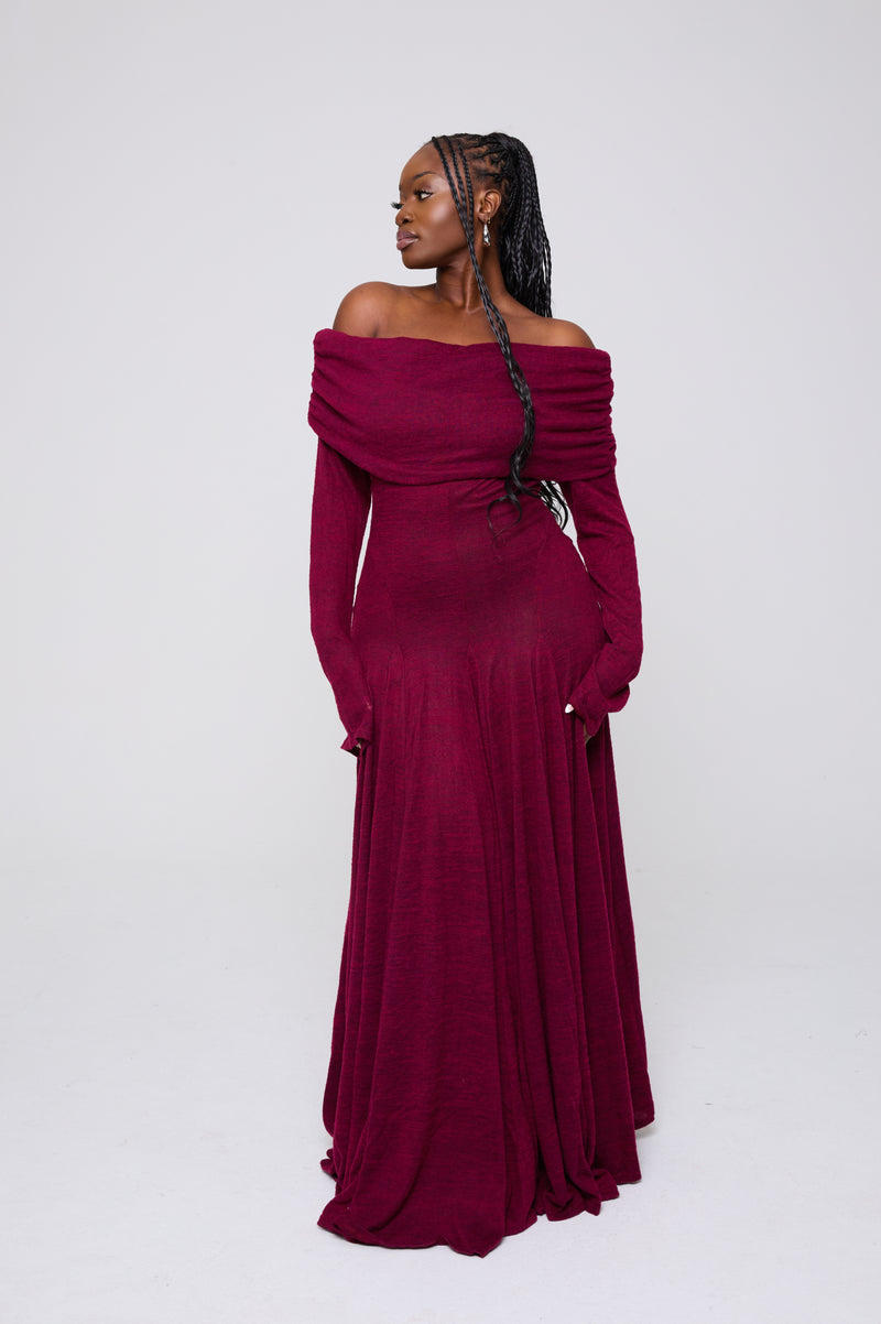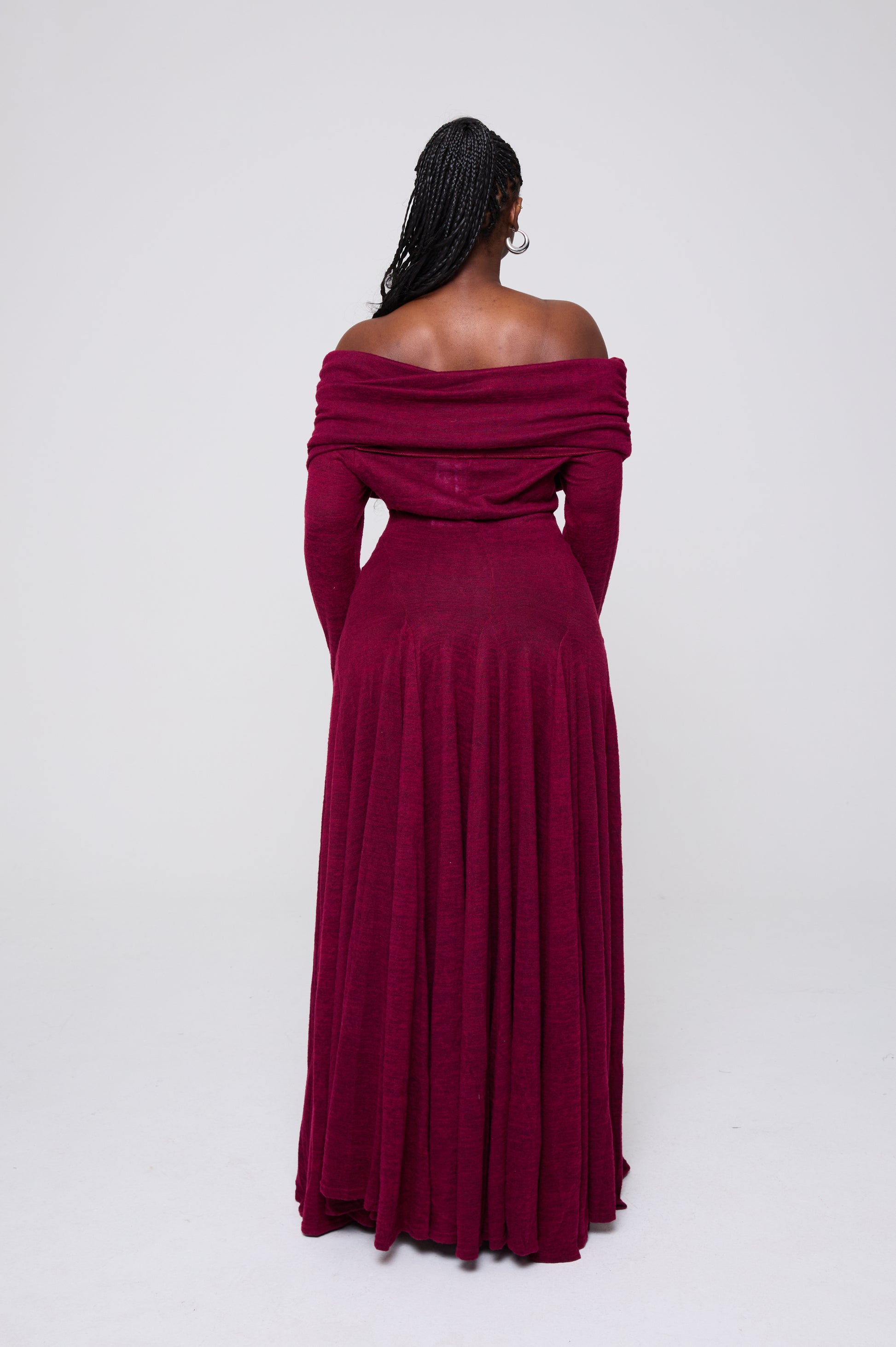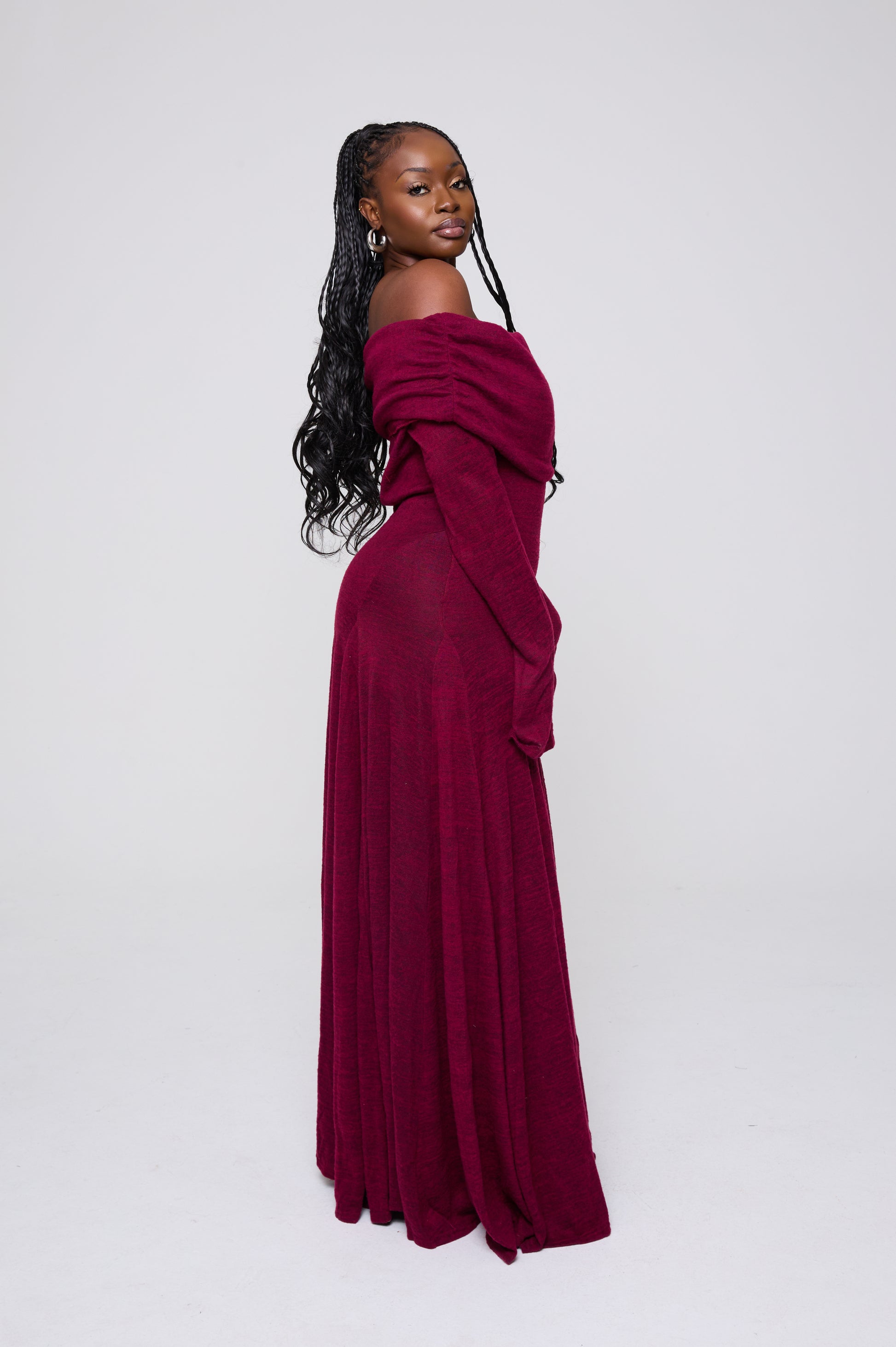 Make an unforgettable entrance in this rich burgundy off-shoulder knit gown. Designed with a dramatic draped neckline and fitted bodice, it flows into a full-length skirt that moves gracefully with every step. The elongated sleeves add a touch of elegance, while subtle ruching at the top frames the shoulders beautifully. Crafted in a soft, stretch knit, it combines comfort with sophistication — perfect for evening occasions, holiday gatherings, or any moment you want to feel effortlessly regal.