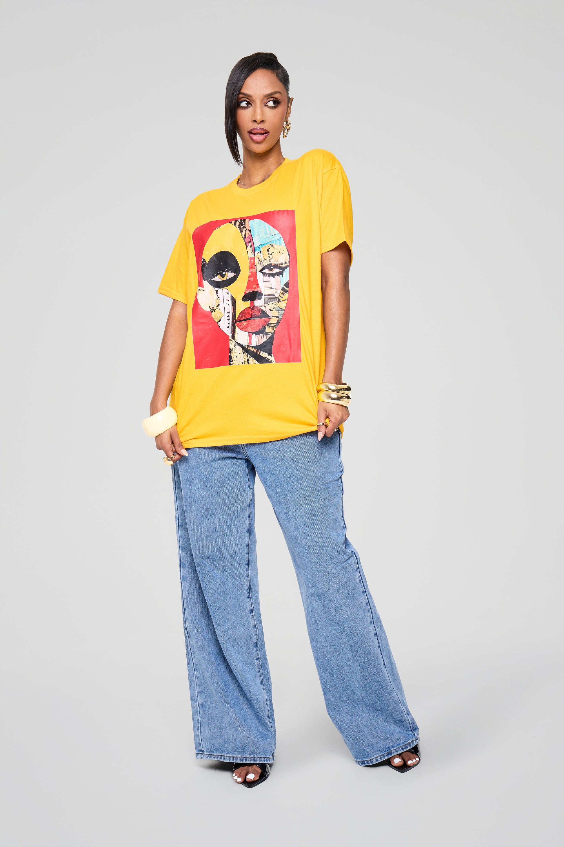 This relaxed-fit T-shirt features a striking graphic print celebrating African beauty and individuality. Perfect for everyday wear with jeans, skirts, or layered under a blazer for an elevated streetwear look.