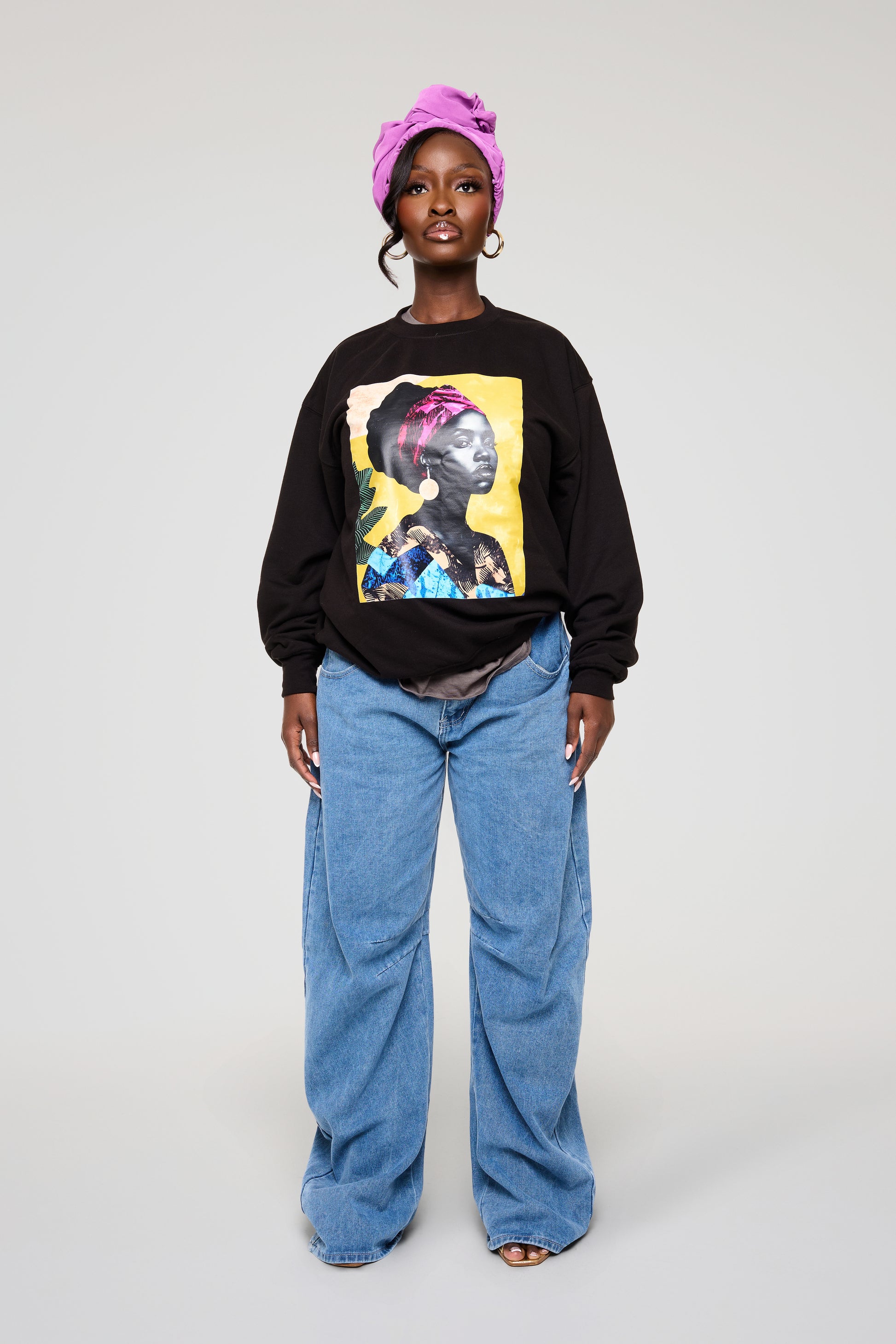 This soft, relaxed-fit sweatshirt features a striking African-inspired portrait print that turns an everyday essential into a statement piece. Made from cotton-blend fleece, it’s warm, breathable and perfect for off-duty days. The artwork adds colour, culture and personality to your look, easy to dress up or down.