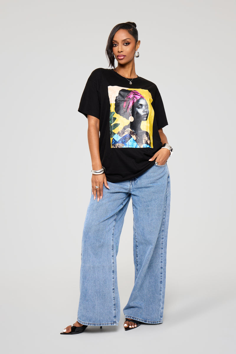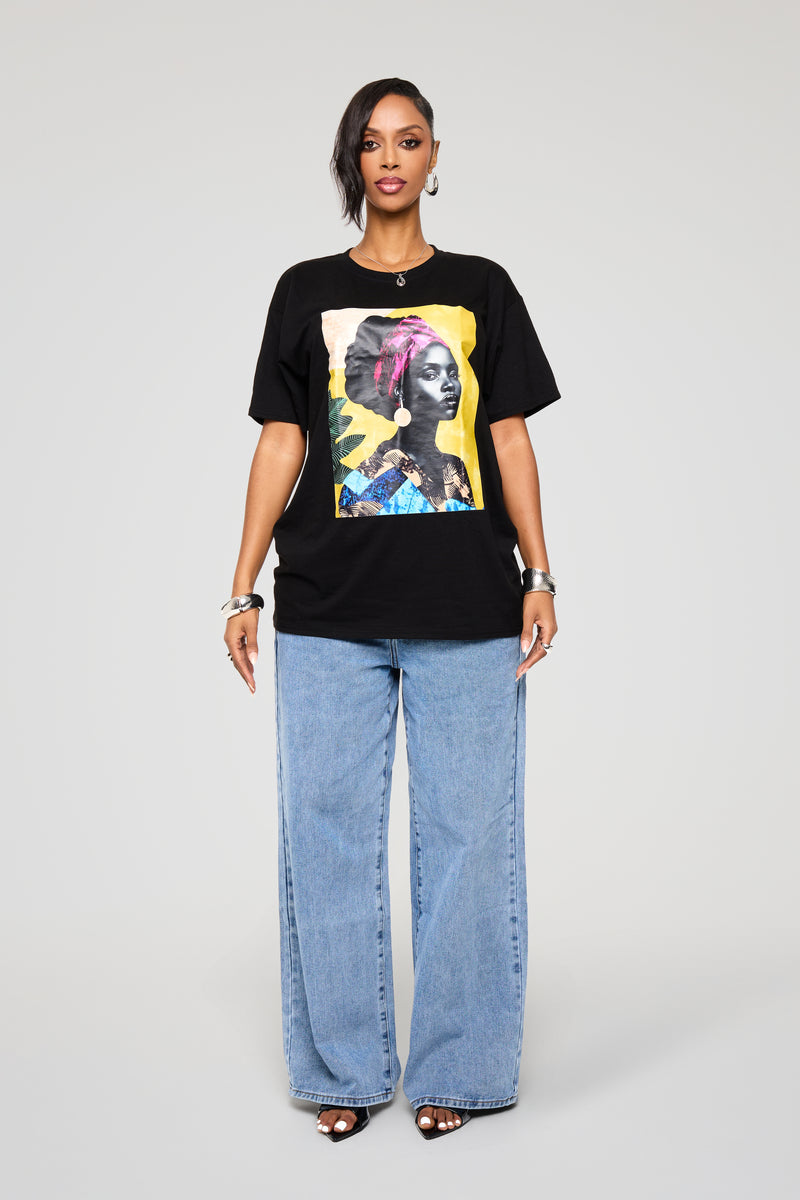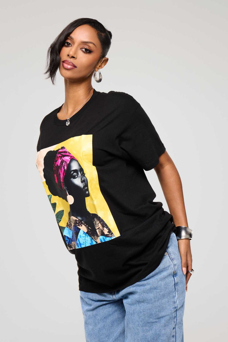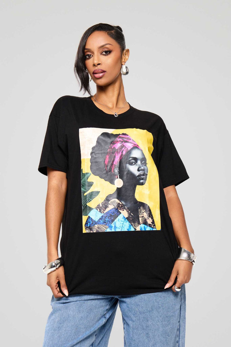 This relaxed-fit T-shirt features a striking graphic print celebrating African beauty and individuality. Perfect for everyday wear with jeans, skirts, or layered under a blazer for an elevated streetwear look.