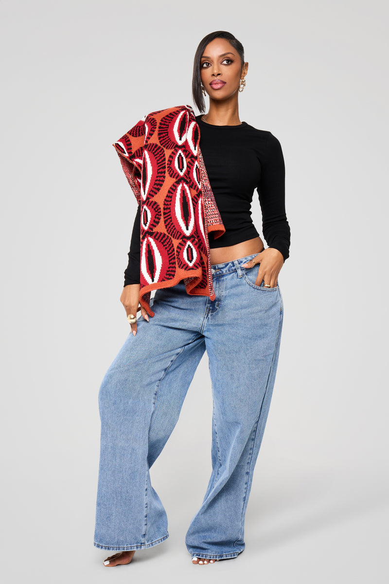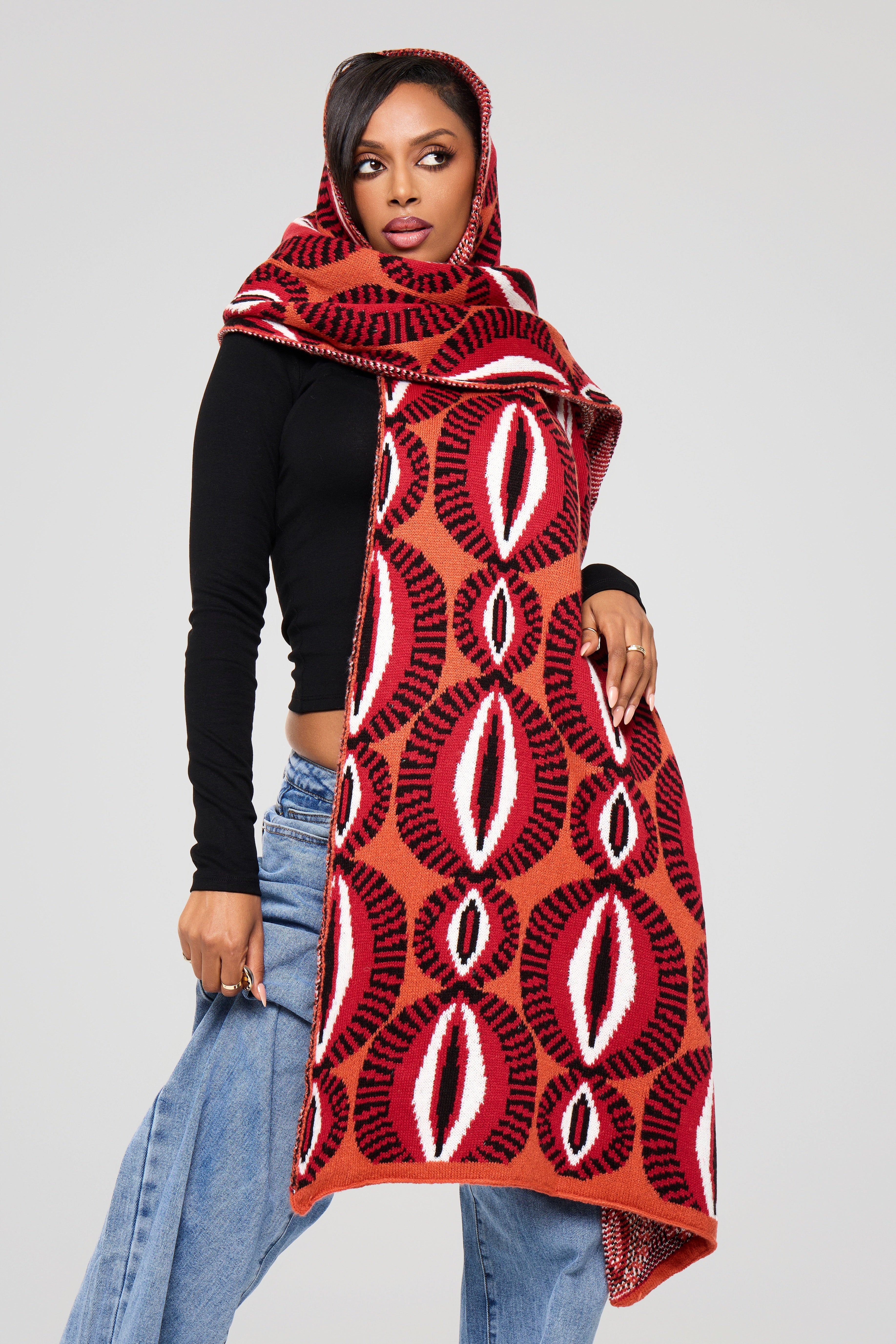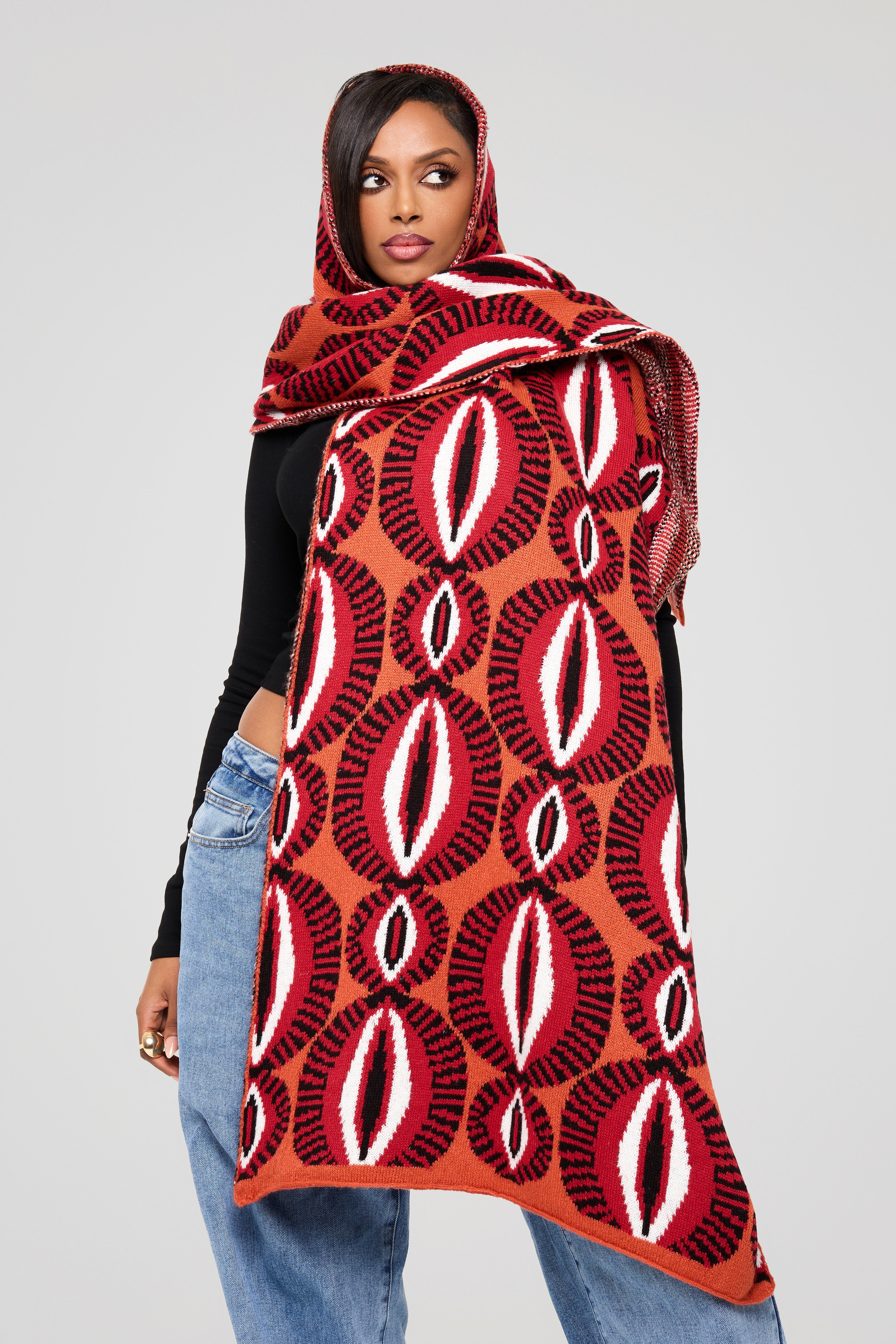 This oversized scarf features bold African-inspired geometric patterns woven into a luxe, mid-weight knit. Designed for versatility, it drapes beautifully over the shoulders as a wrap or layers easily over coats for colder days. The generous length and width make it perfect for styling in multiple ways while adding instant texture and character to any outfit.
