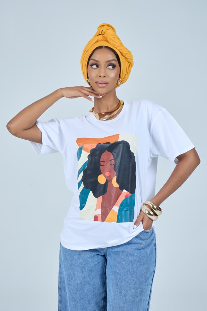 This relaxed-fit T-shirt features a striking graphic print celebrating African beauty and individuality. Perfect for everyday wear with jeans, skirts, or layered under a blazer for an elevated streetwear look.