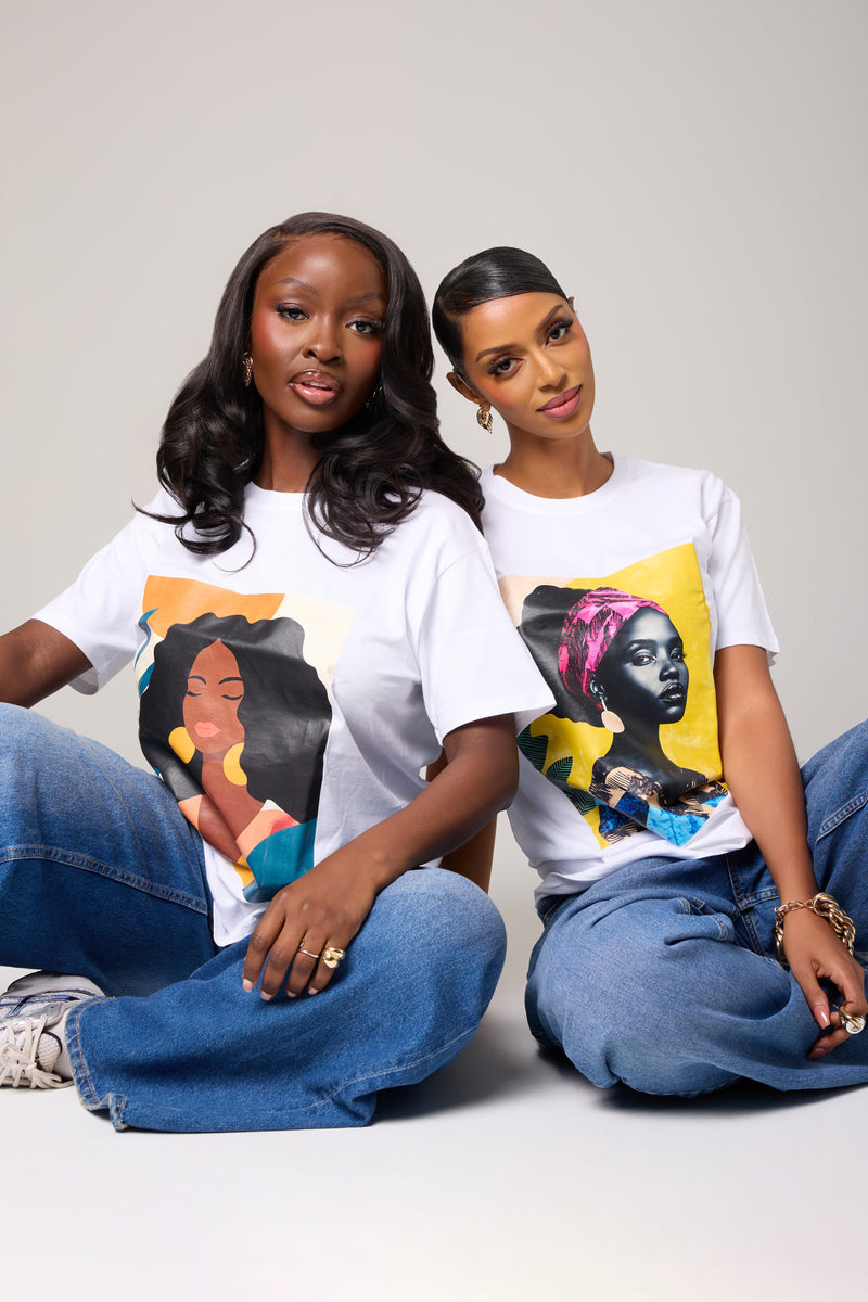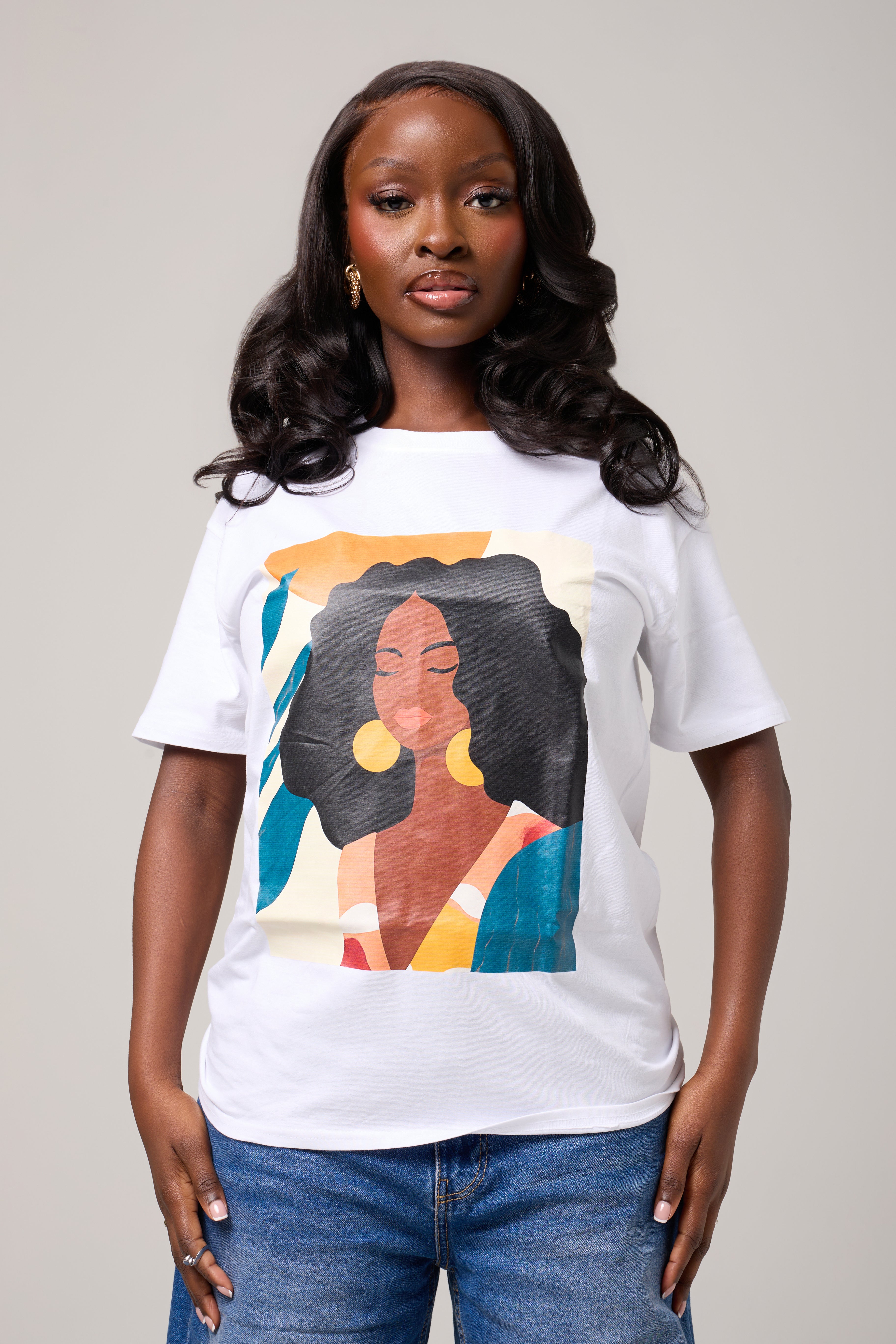 This relaxed-fit T-shirt features a striking graphic print celebrating African beauty and individuality. Perfect for everyday wear with jeans, skirts, or layered under a blazer for an elevated streetwear look.