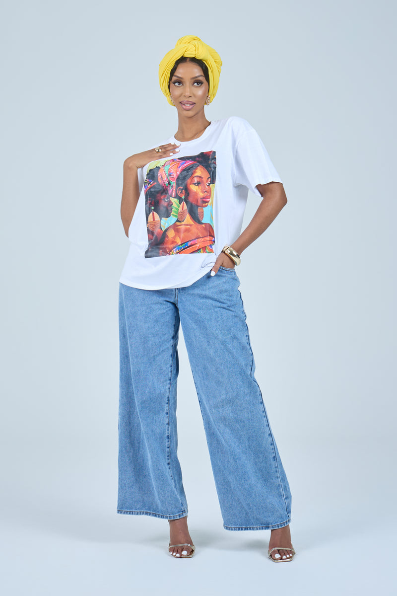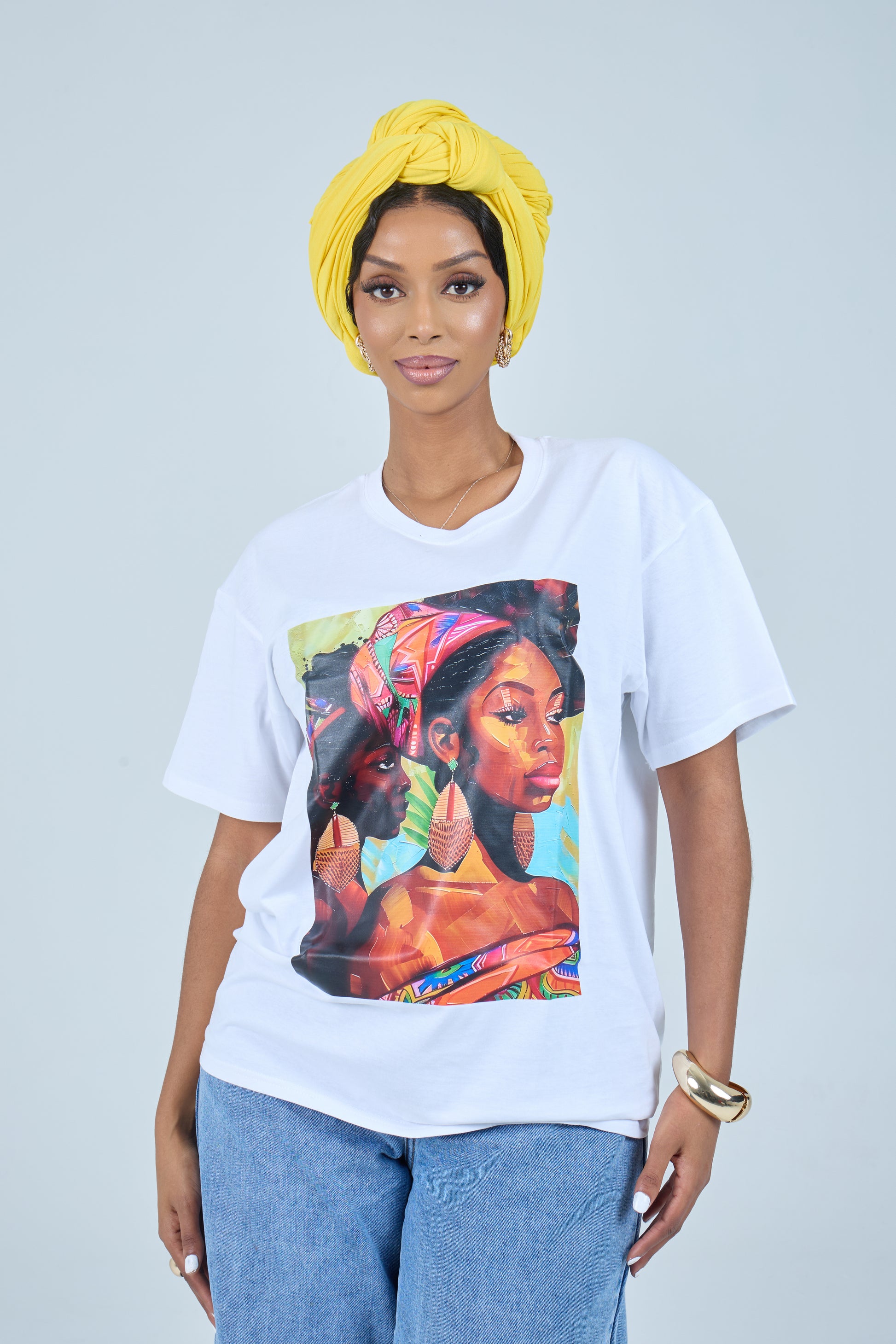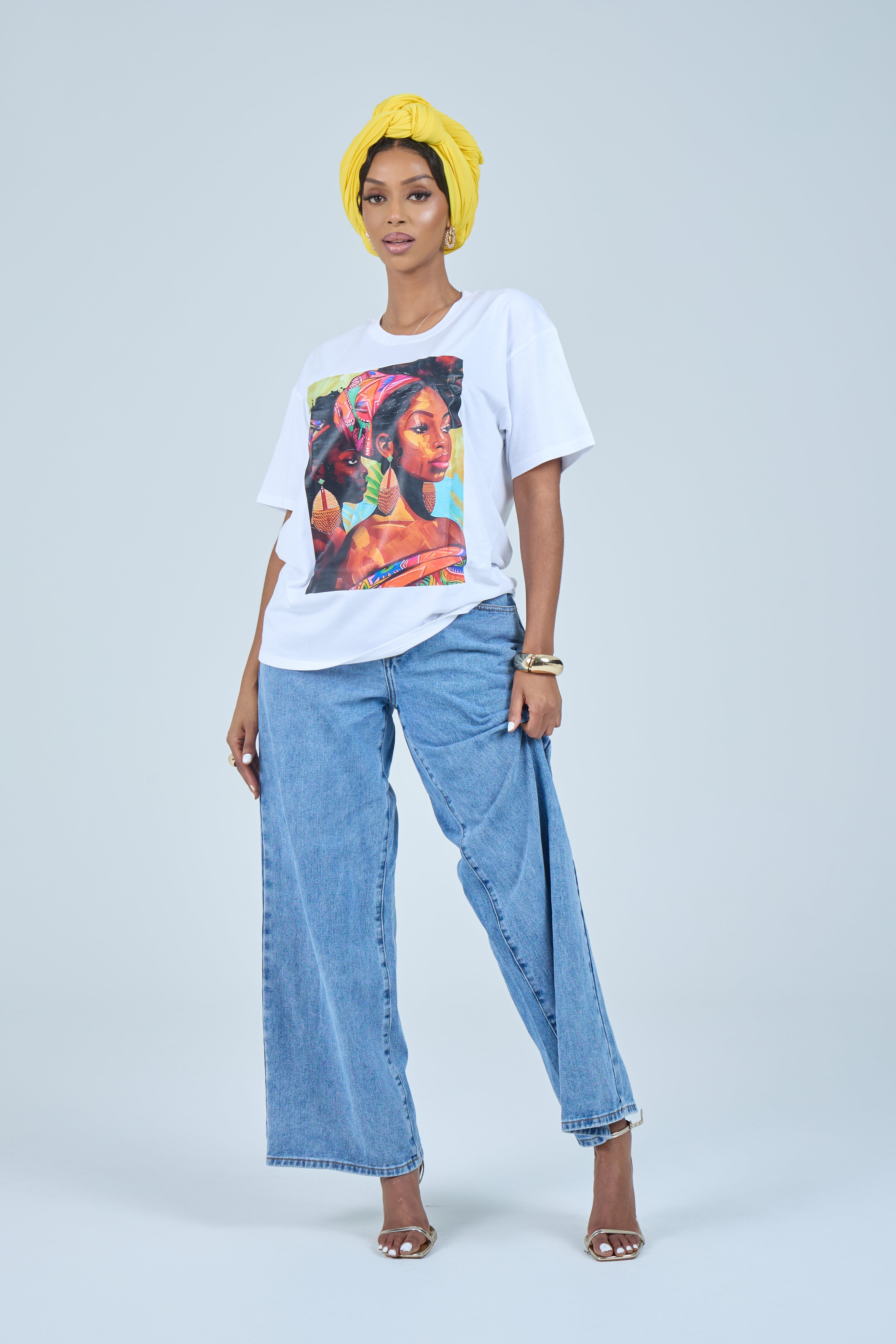 This relaxed-fit T-shirt features a striking graphic print celebrating African beauty and individuality. Perfect for everyday wear with jeans, skirts, or layered under a blazer for an elevated streetwear look.