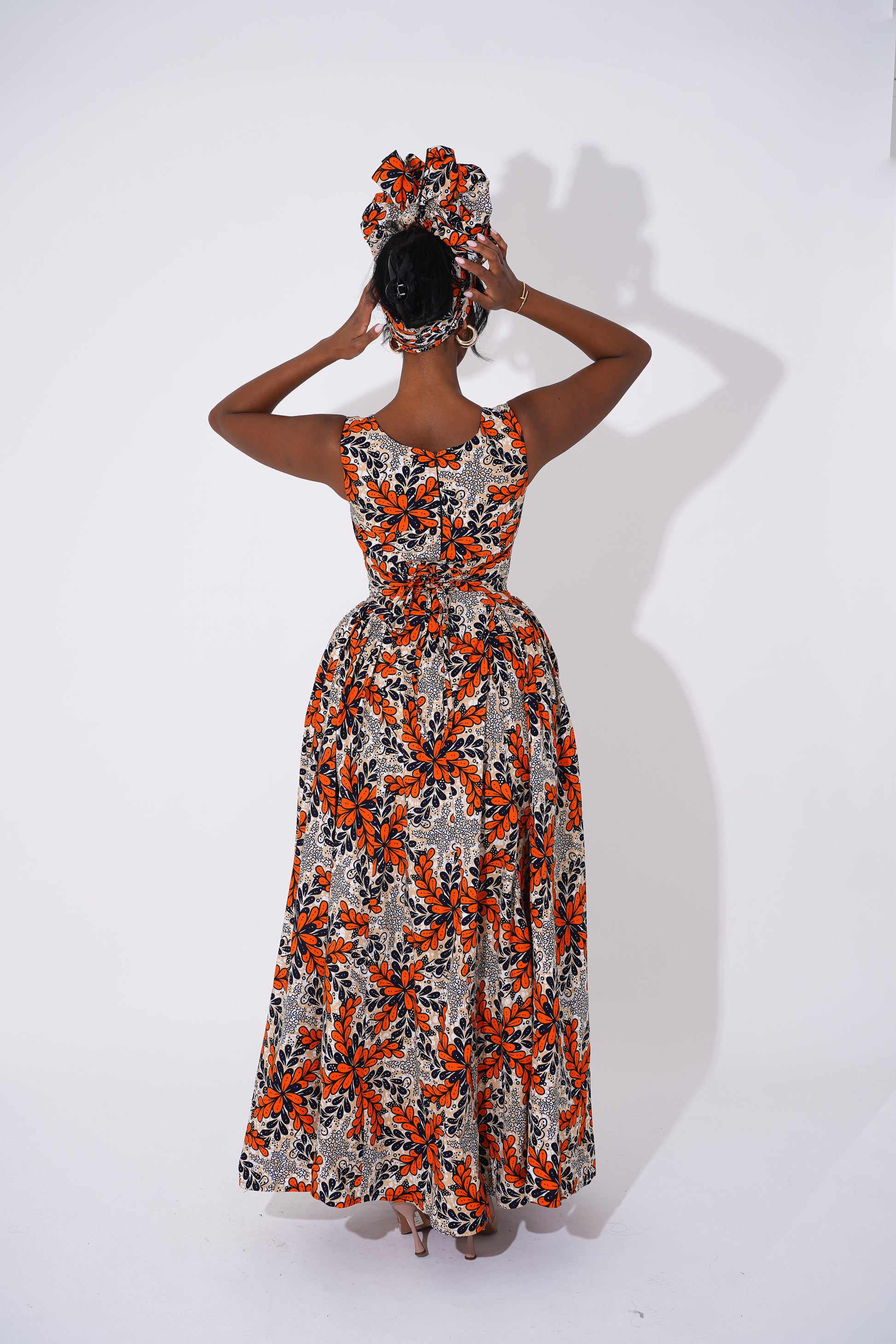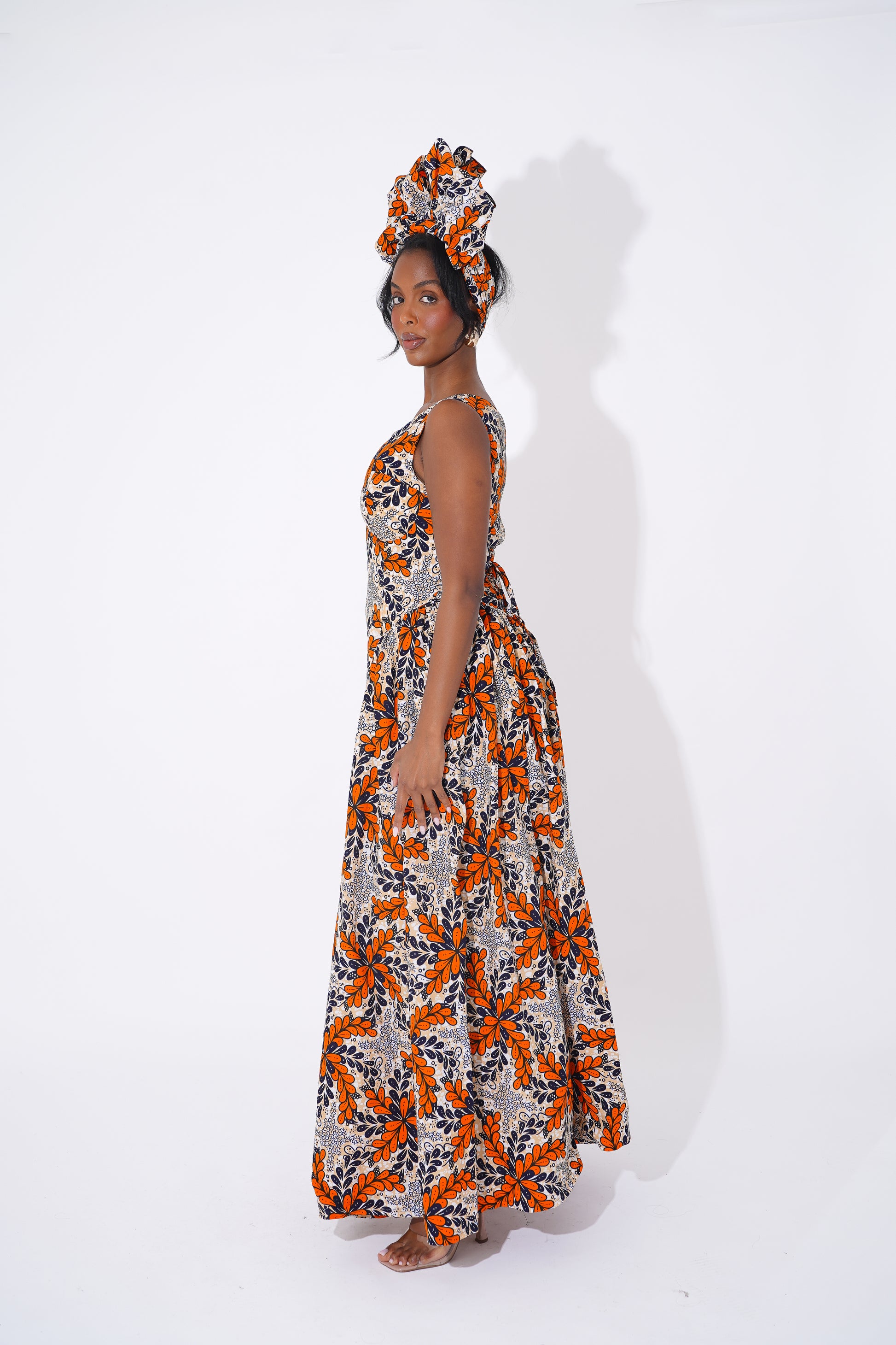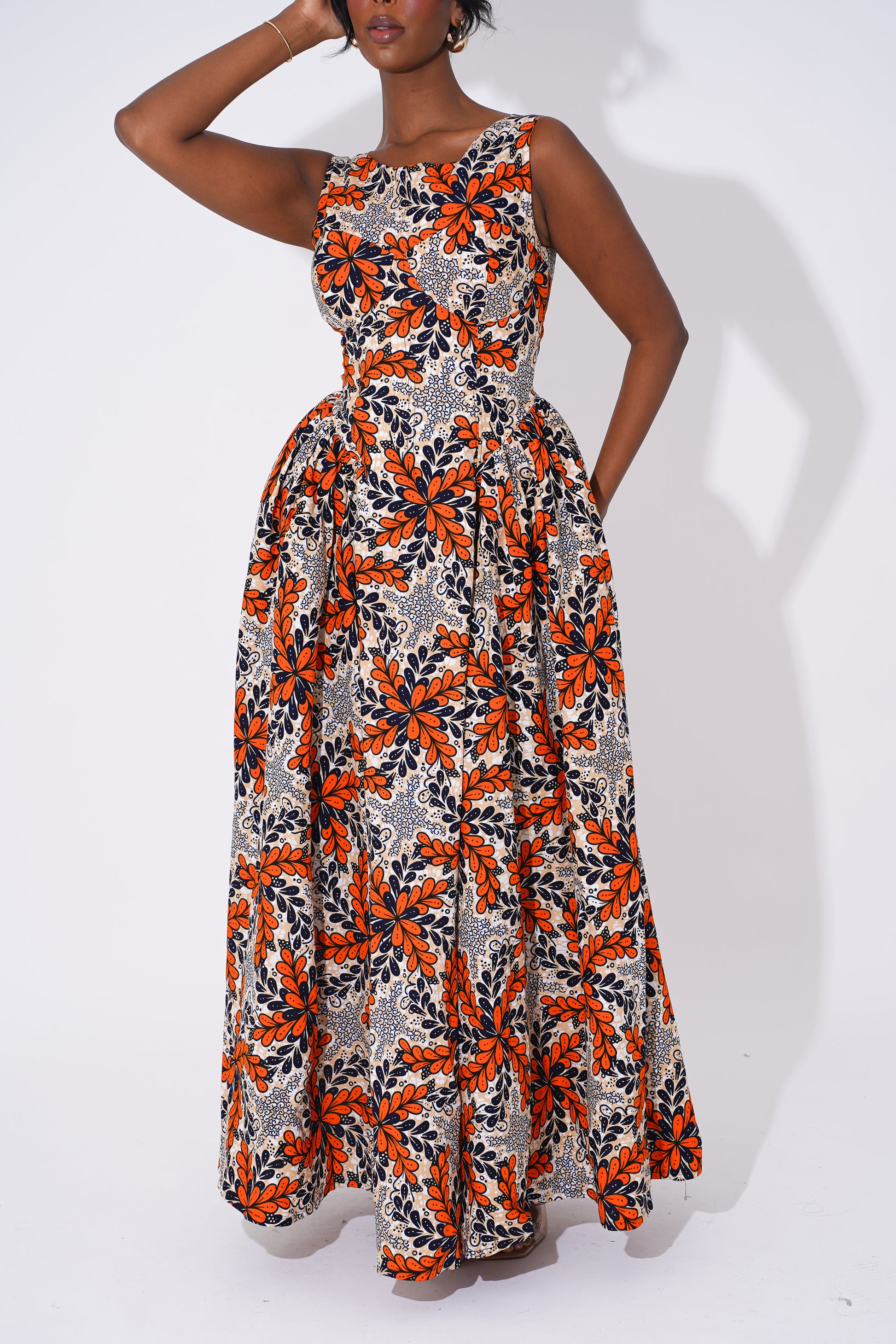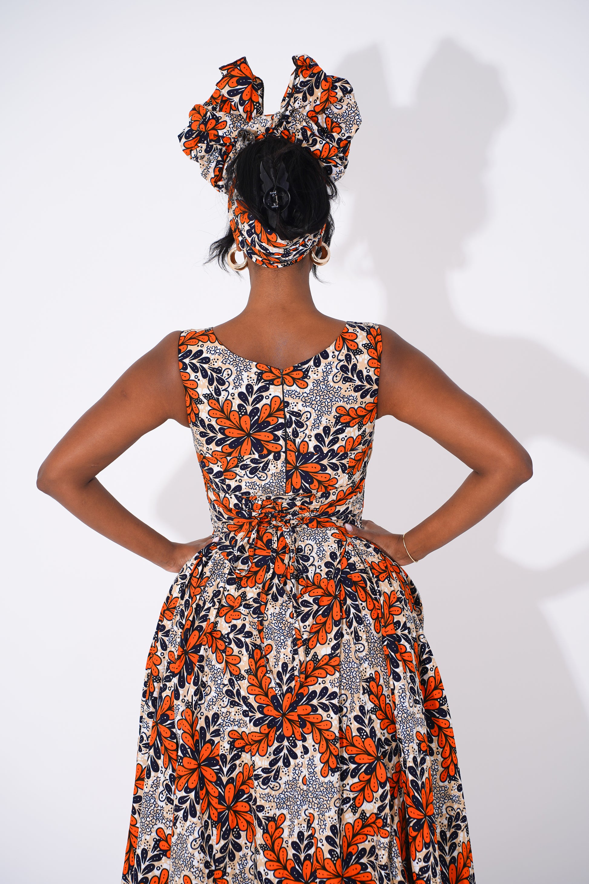 Celebrate timeless elegance and cultural heritage with this stunning Ankara maxi dress. Featuring an intricate design of bold orange and navy florals set against a soft cream background, this dress is a showstopper for the modern Black American woman who values style with a cultural flair.