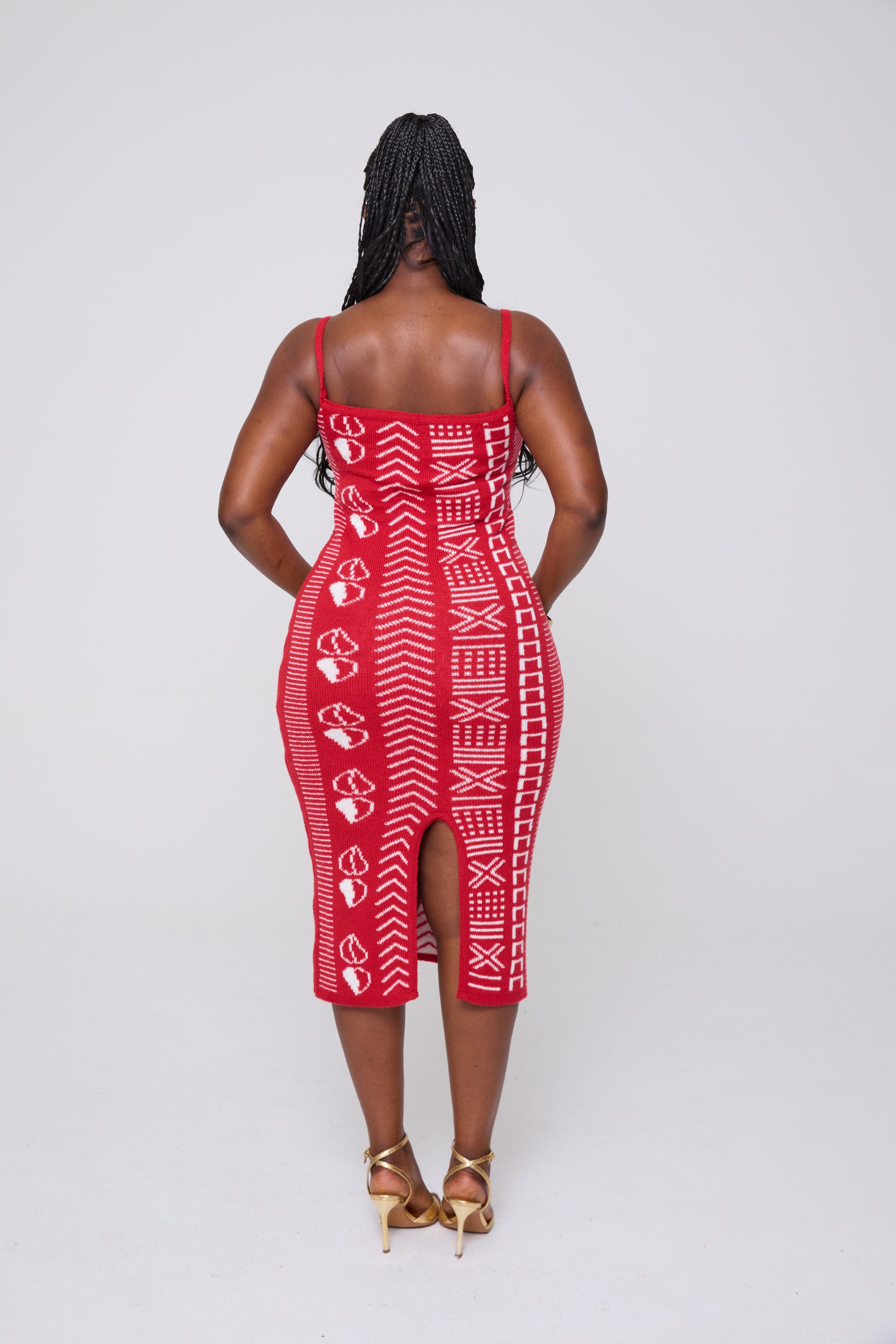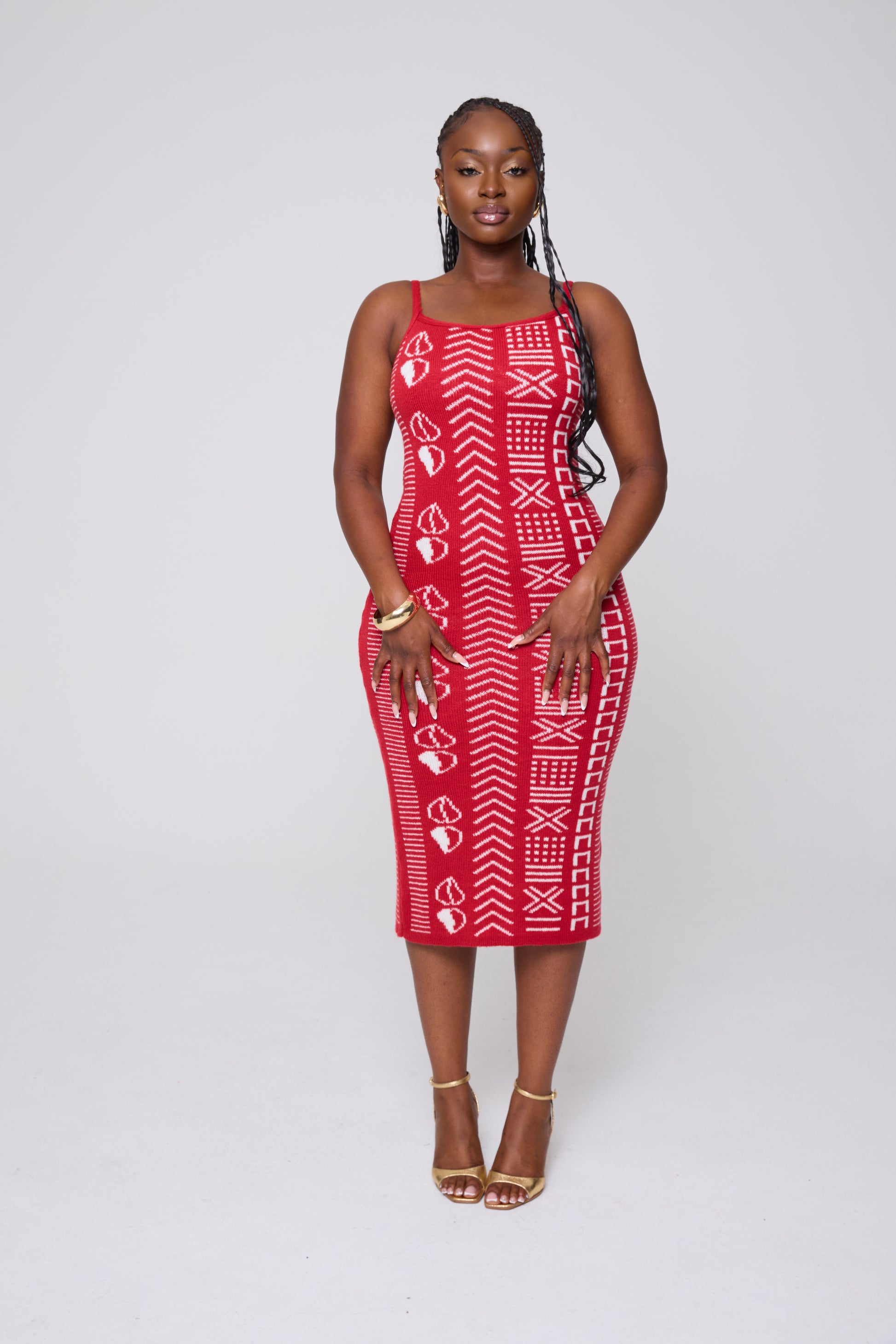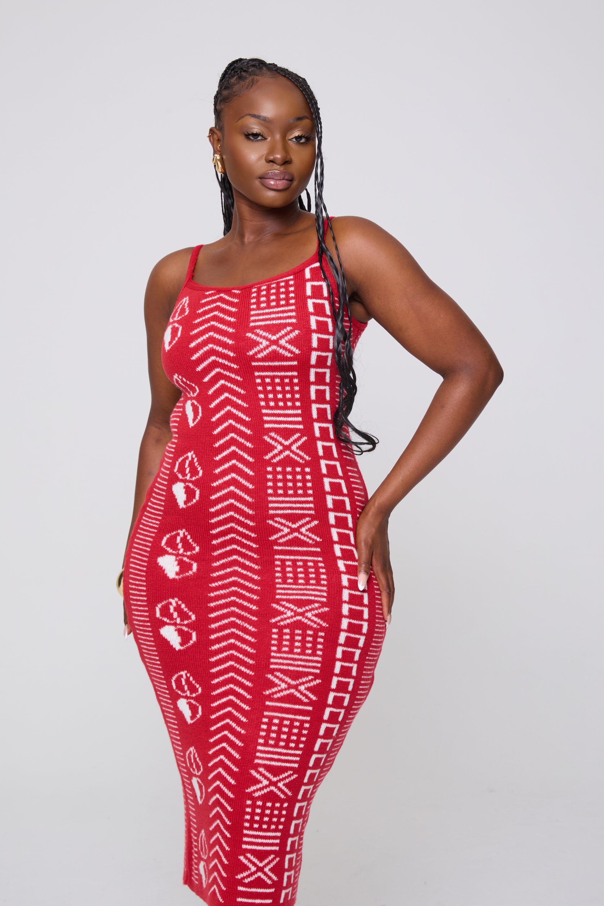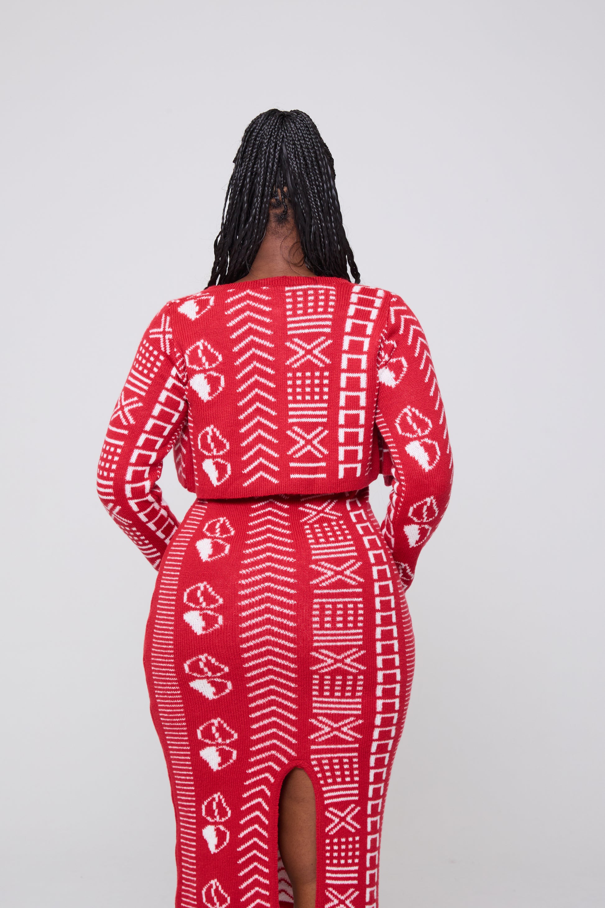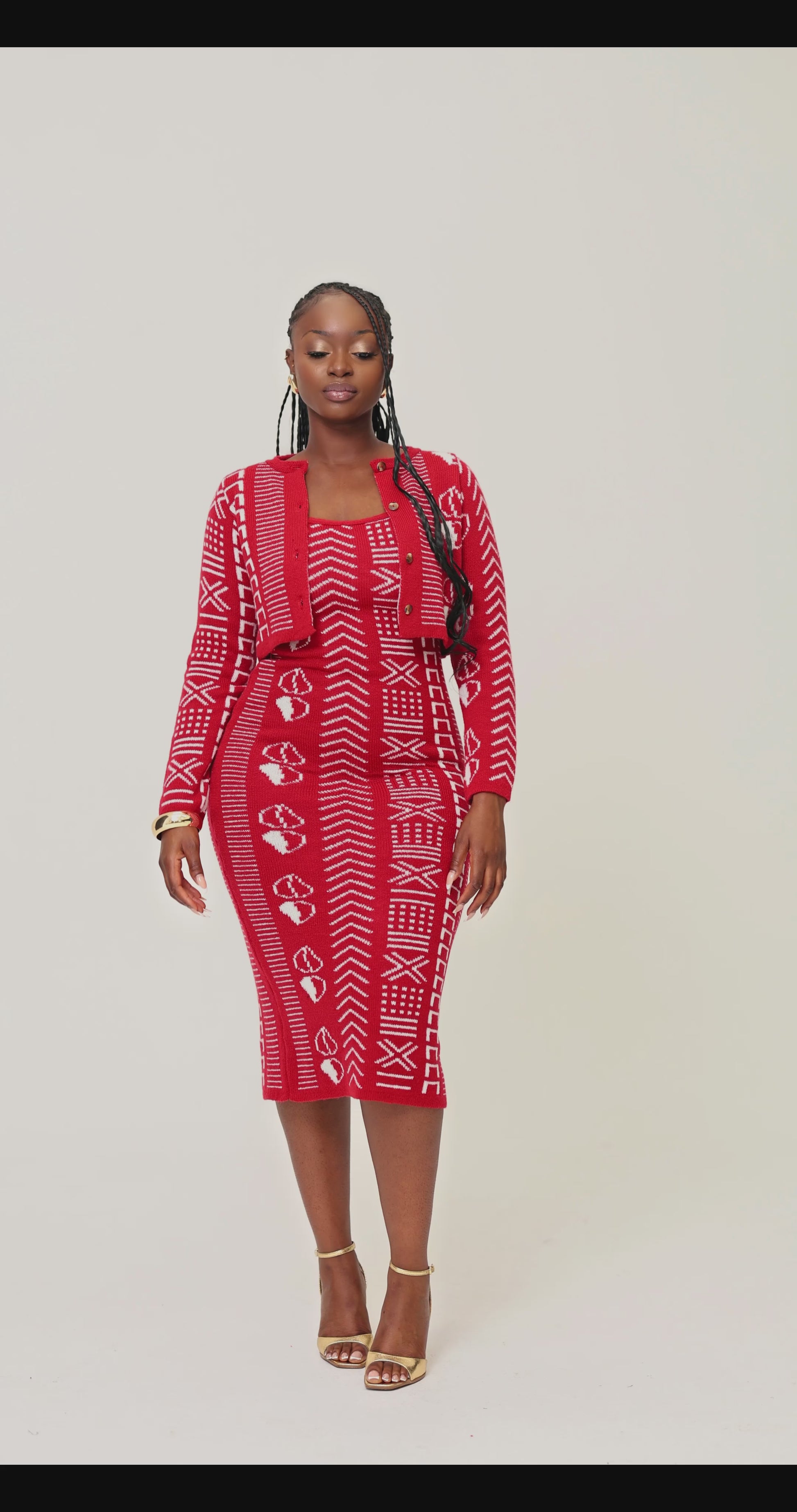 Step into effortless elegance with this bold two-piece knitwear set, crafted with signature Grassfields artistry. The fitted midi dress hugs your curves while the cropped button cardigan adds structure and versatility.