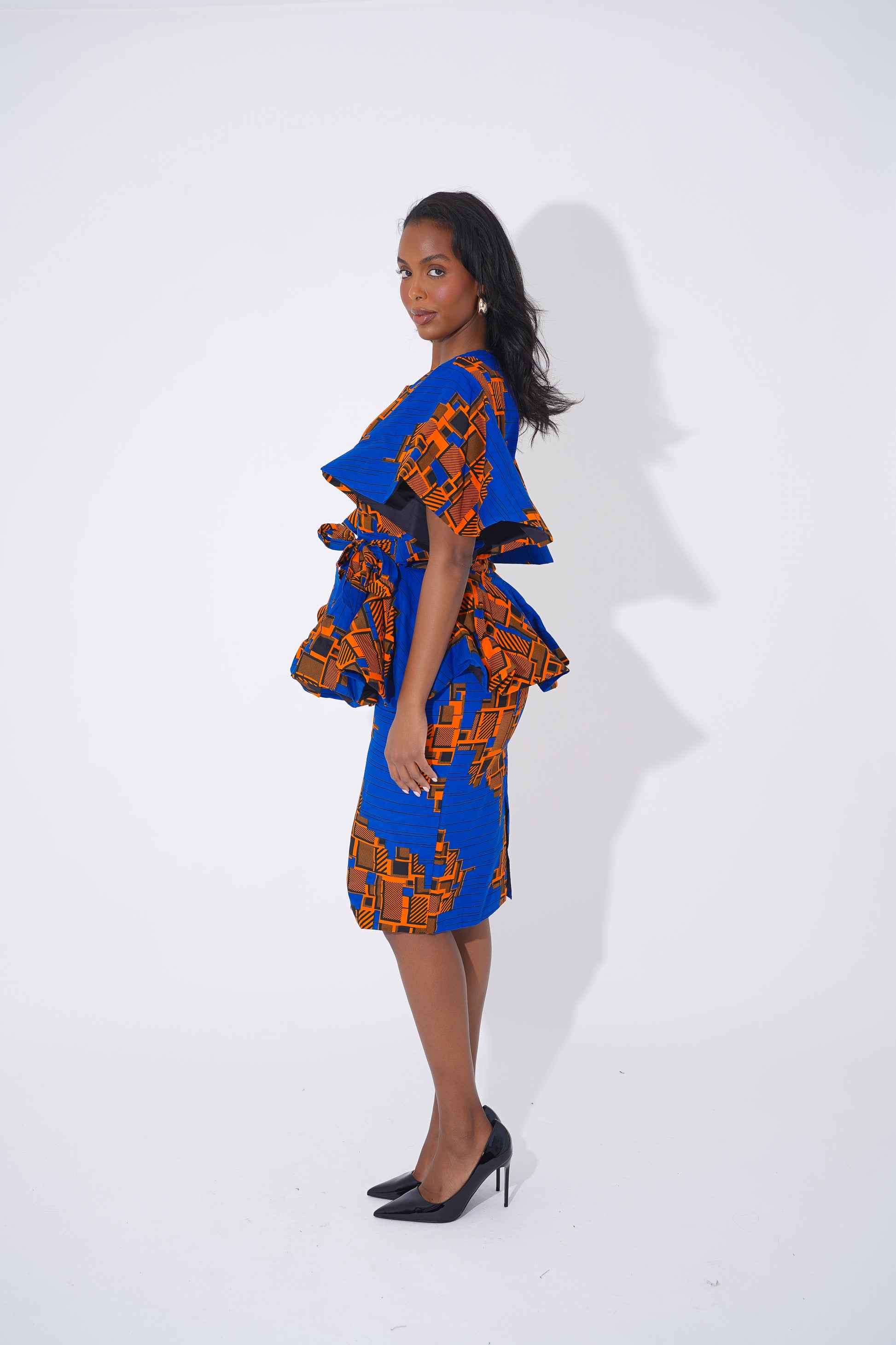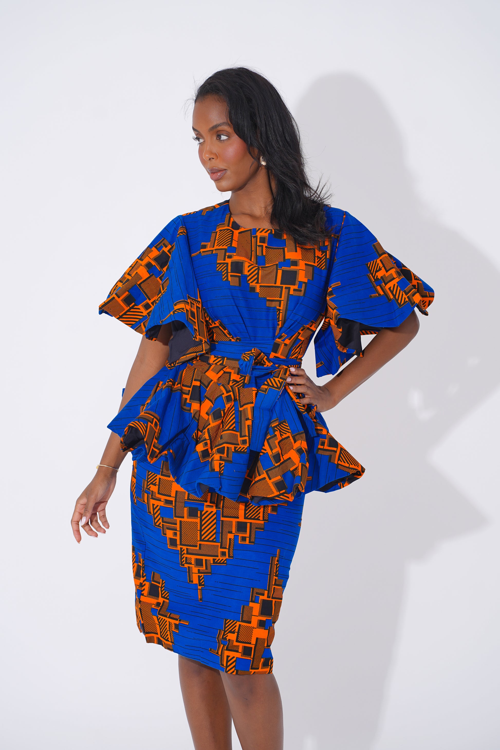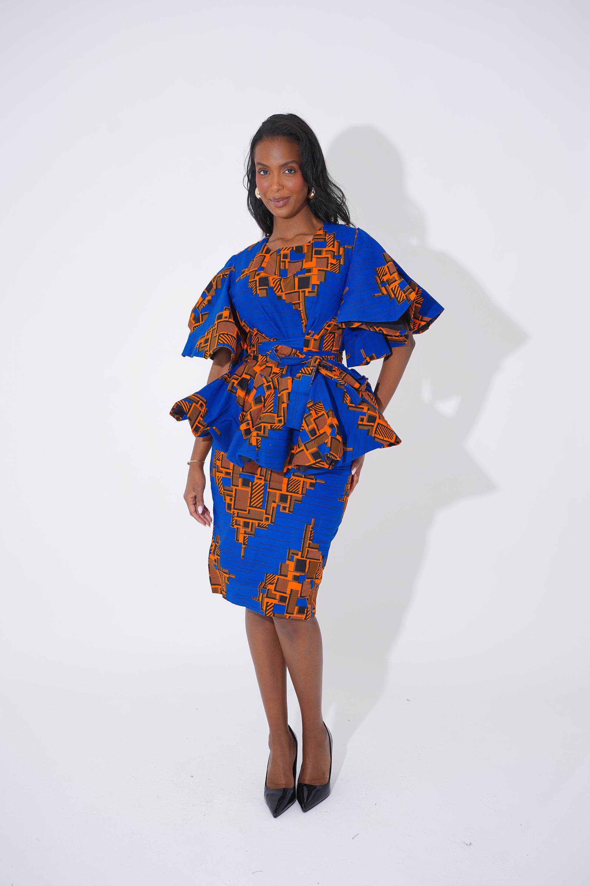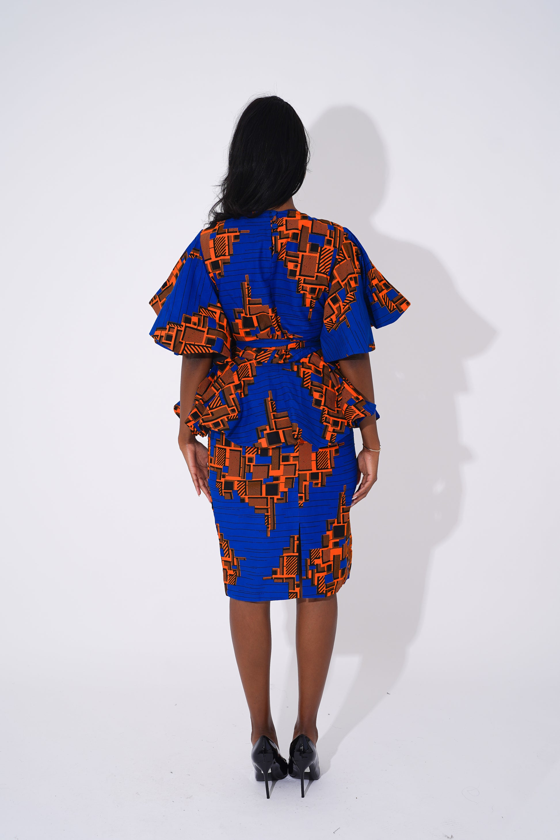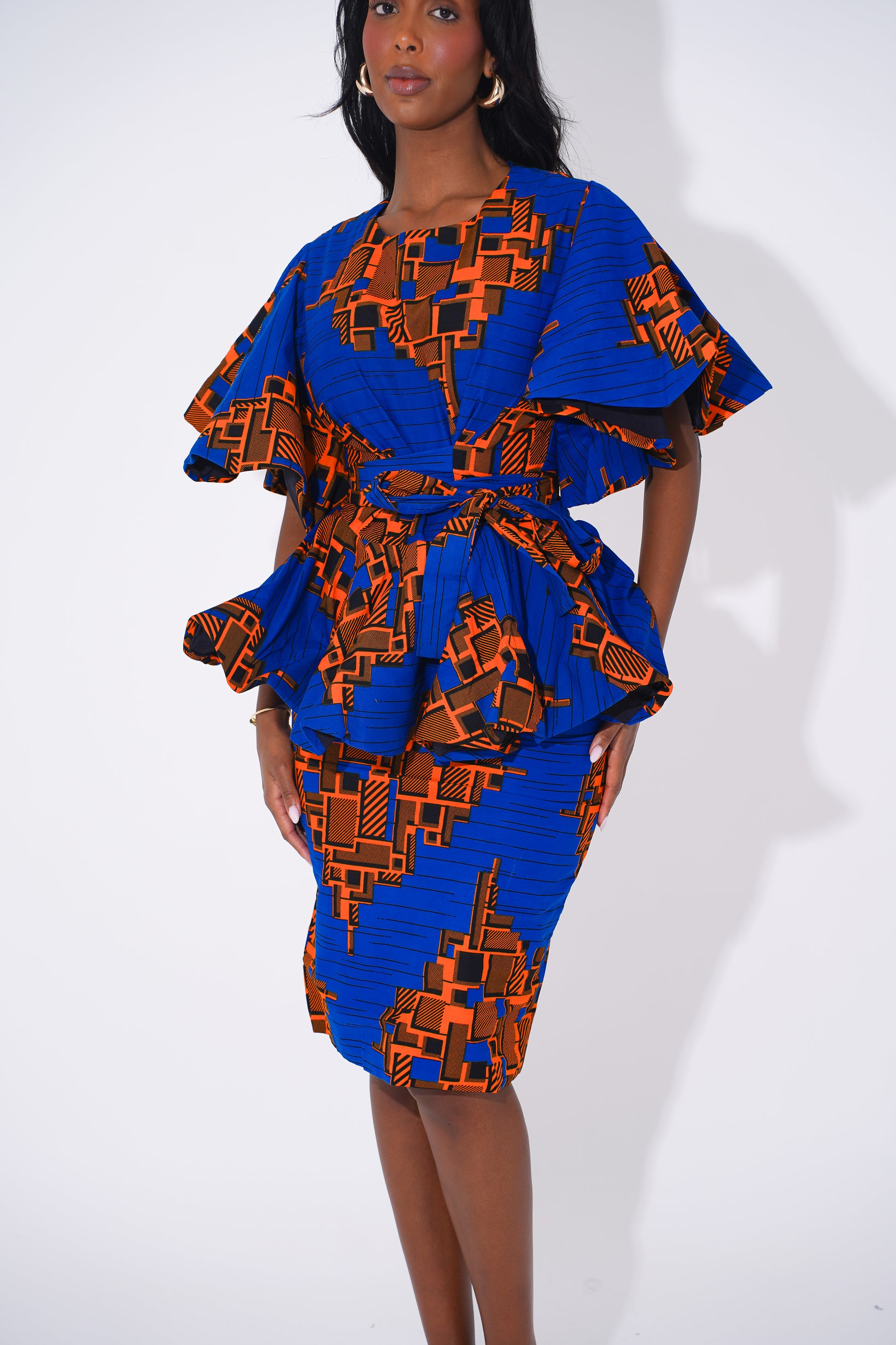 Command attention and celebrate your unique style with this sophisticated Ankara-inspired peplum pencil Set, designed to honor the beauty and confidence of Black women. Featuring a stunning combination of rich royal blue and bold orange geometric patterns, this set effortlessly blends modern elegance with cultural heritage.