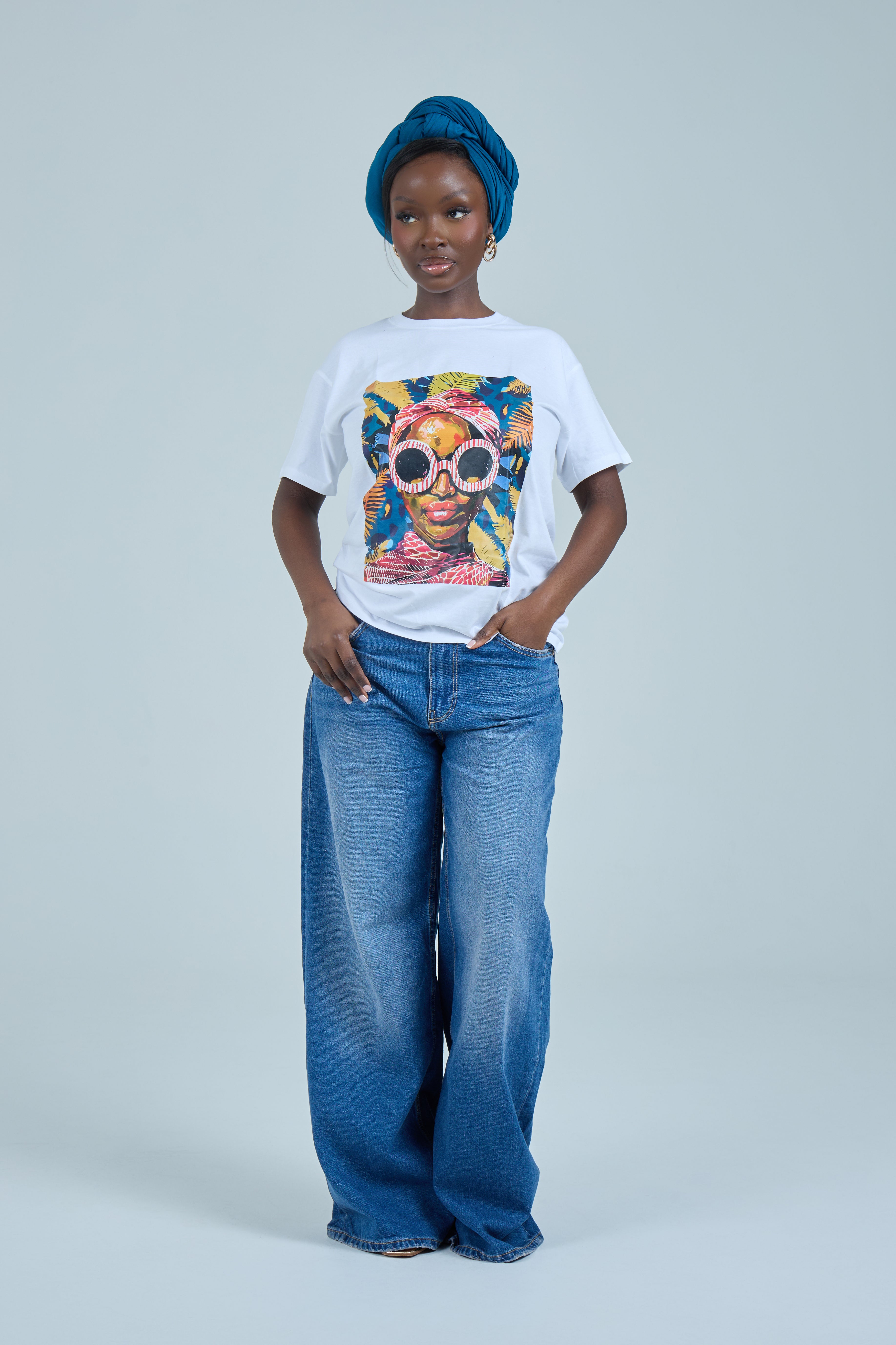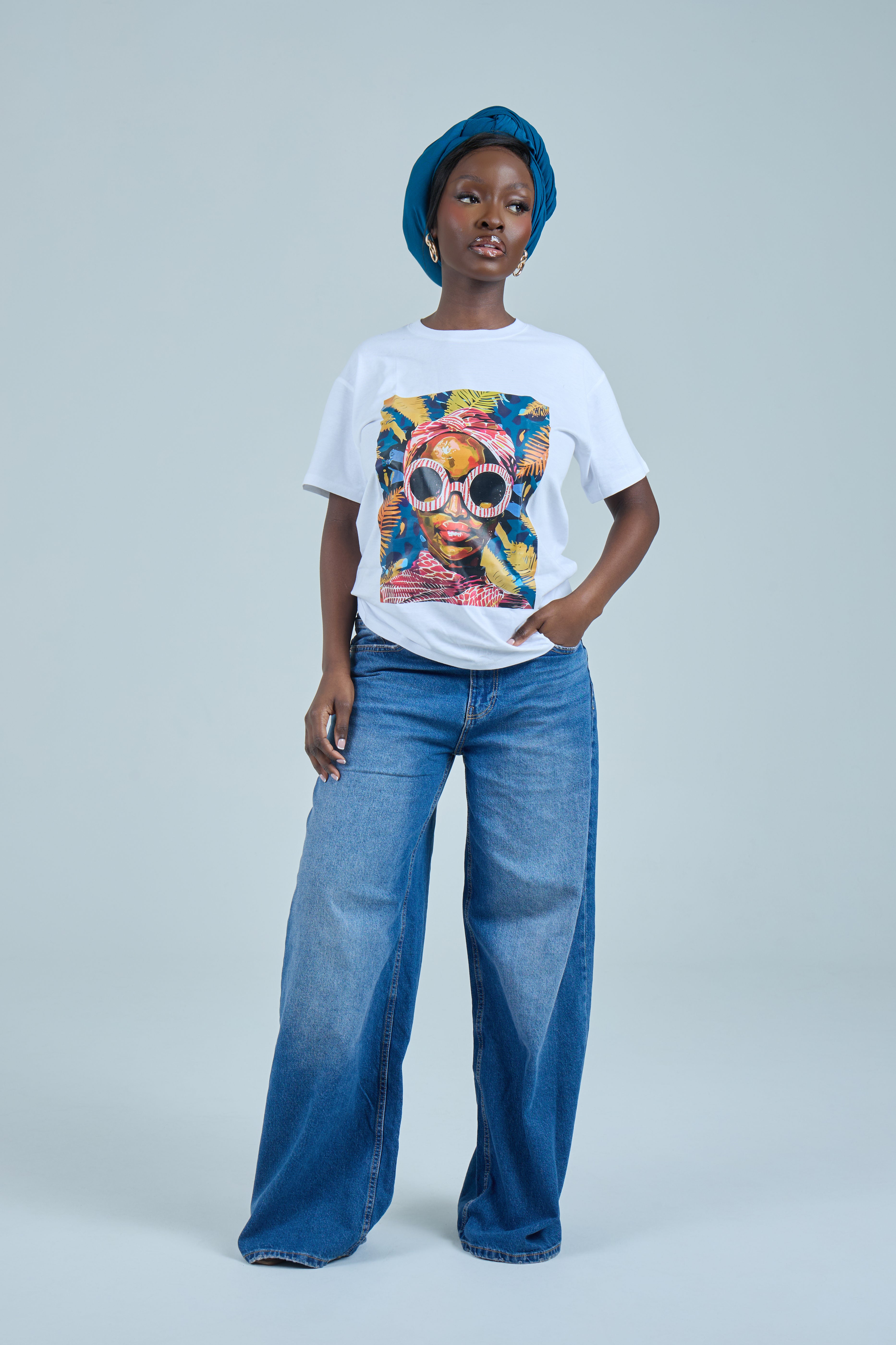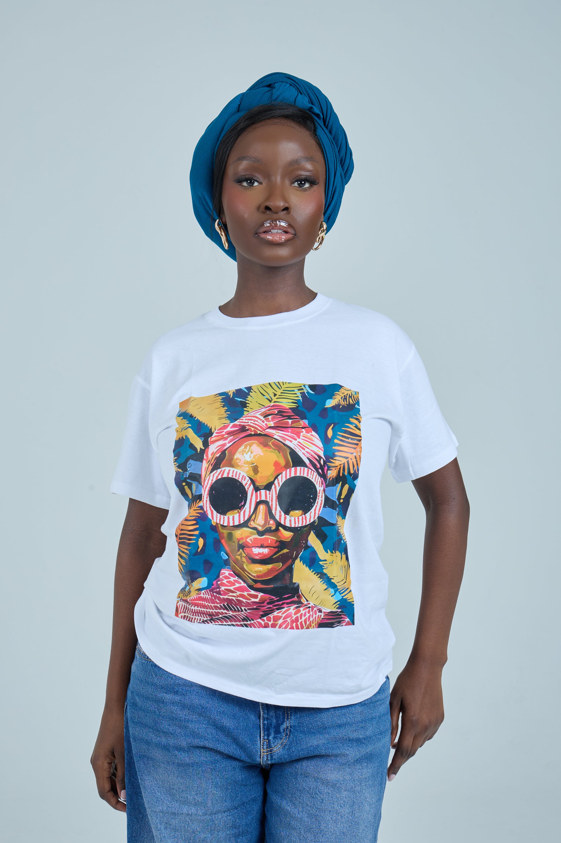 This relaxed-fit T-shirt features a striking graphic print celebrating African beauty and individuality. Perfect for everyday wear with jeans, skirts, or layered under a blazer for an elevated streetwear look.