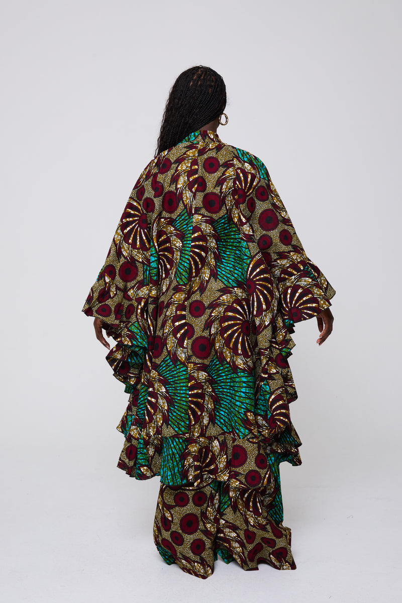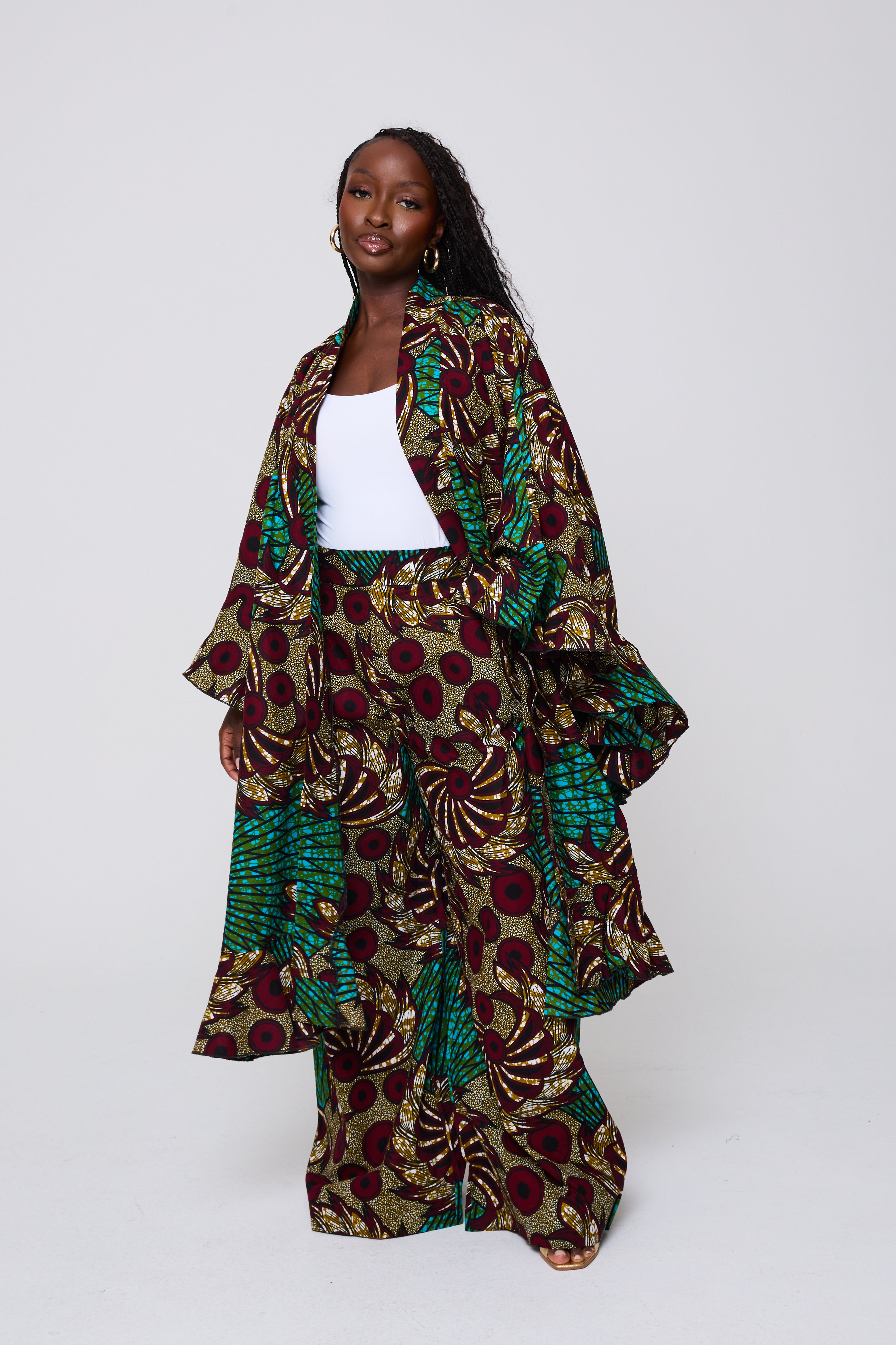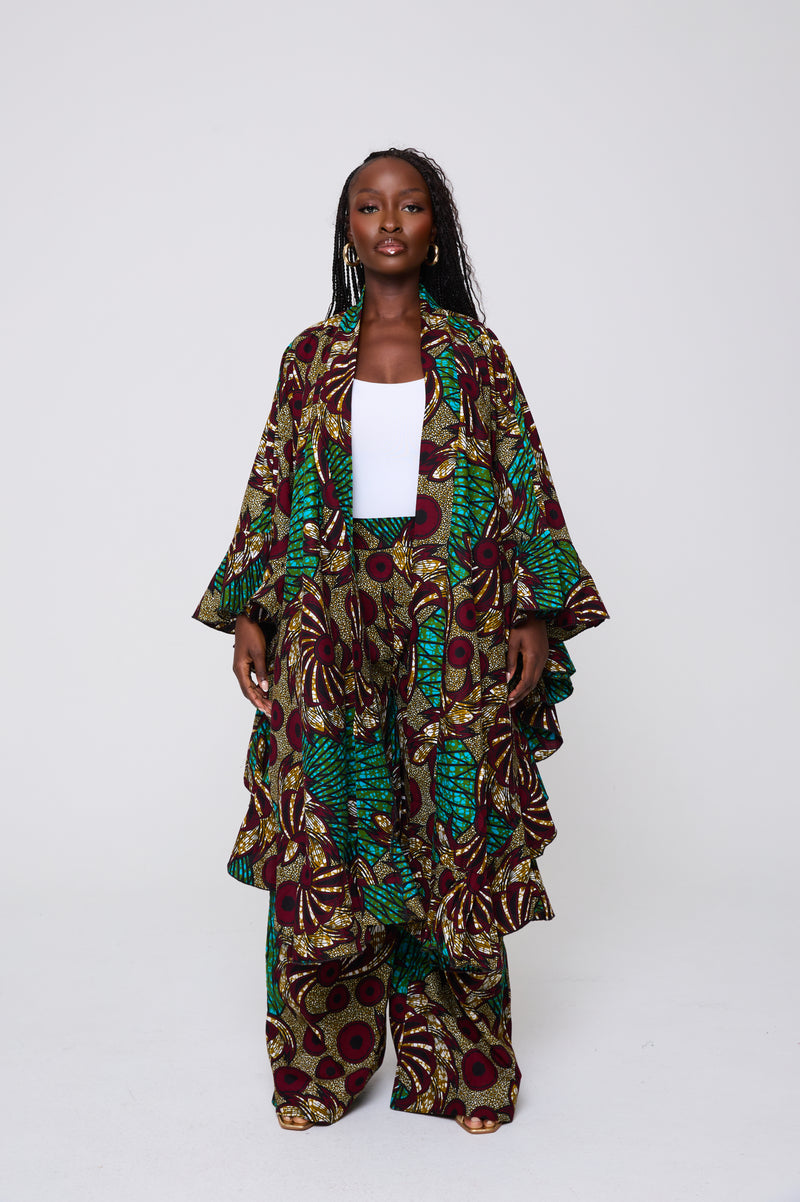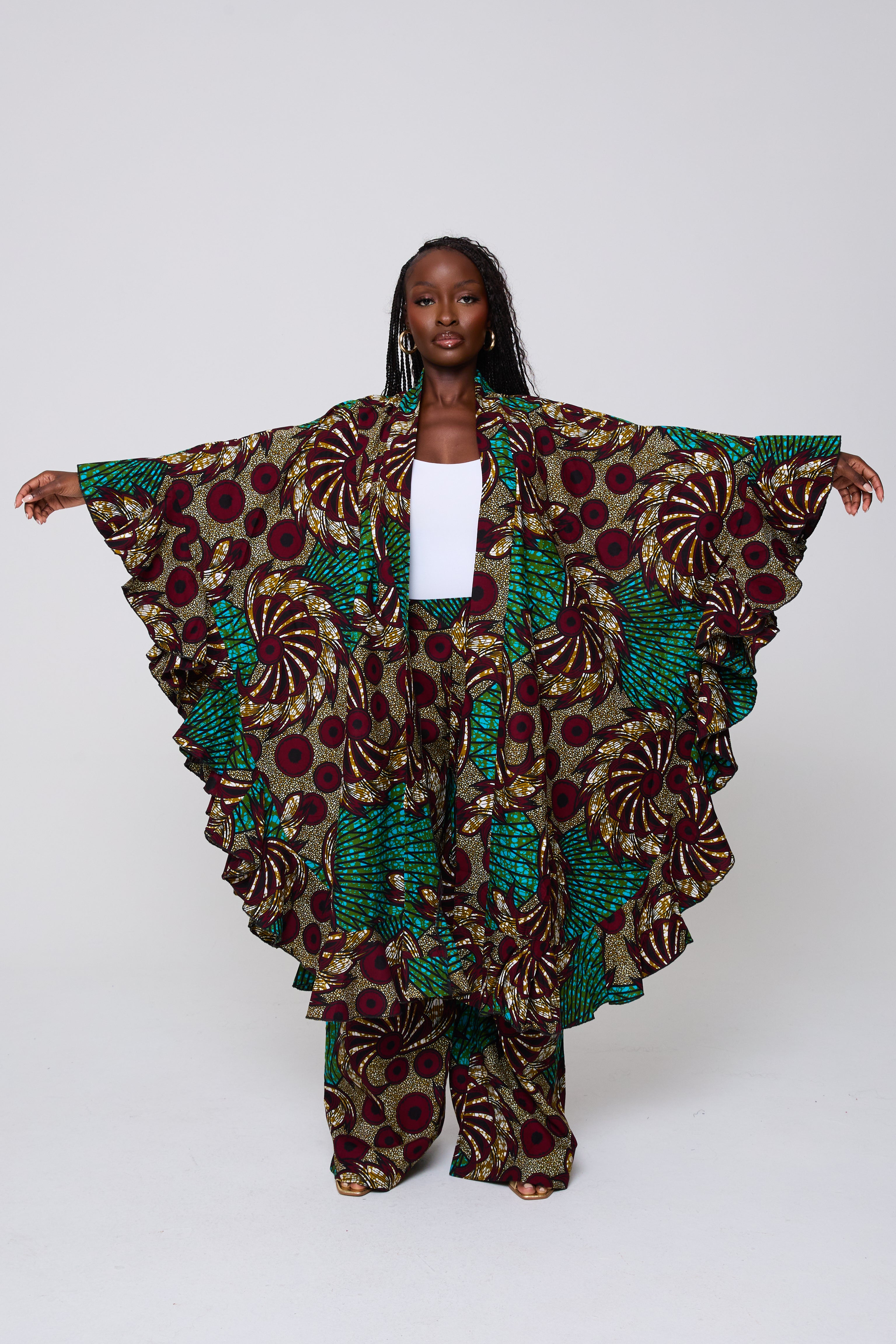The Wilma Set is designed for impact and versatility. The voluminous kimono top pairs with structured wide-leg trousers to create a commanding look that balances drama with comfort. Ideal for elevated daywear, travel, or standout evening style