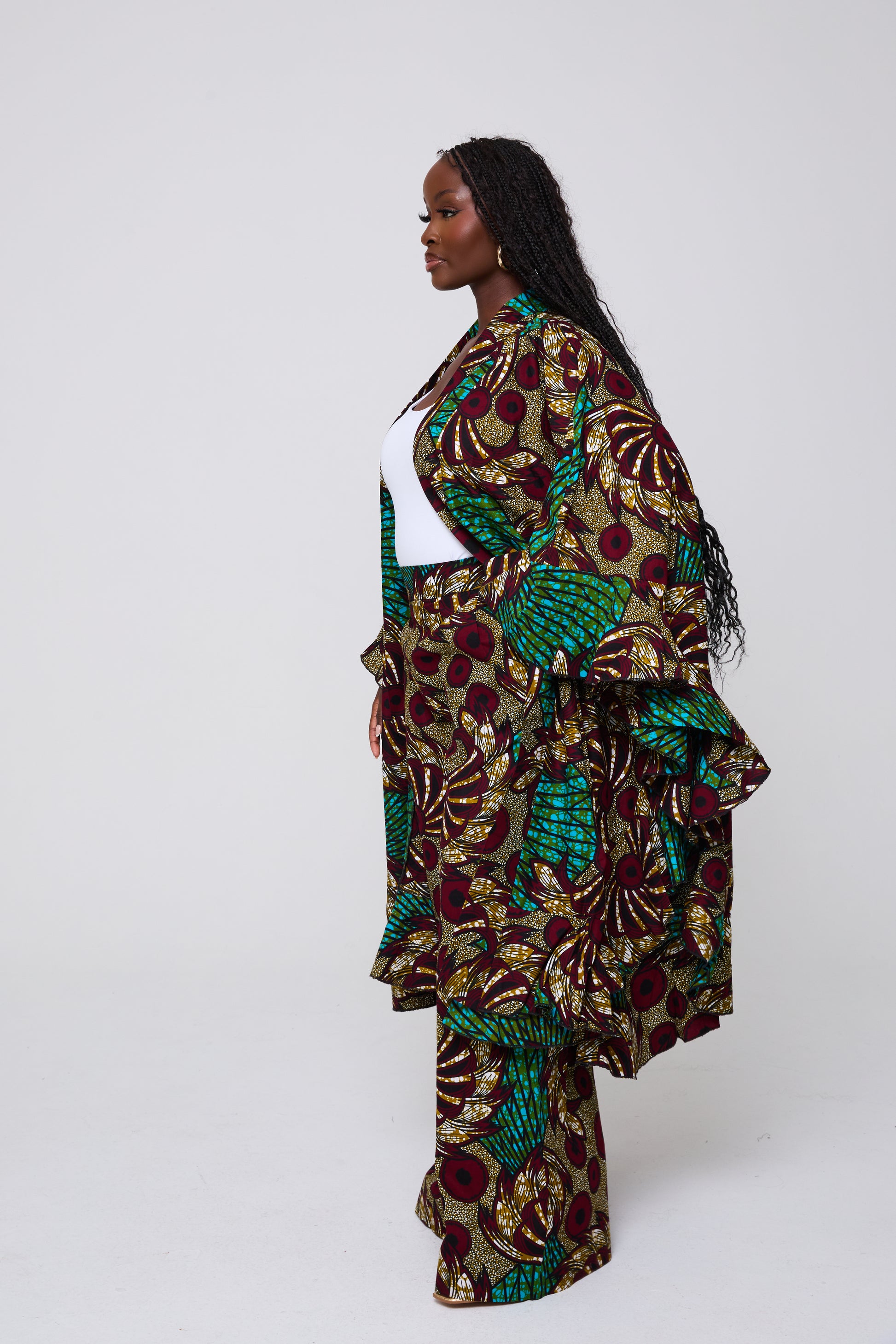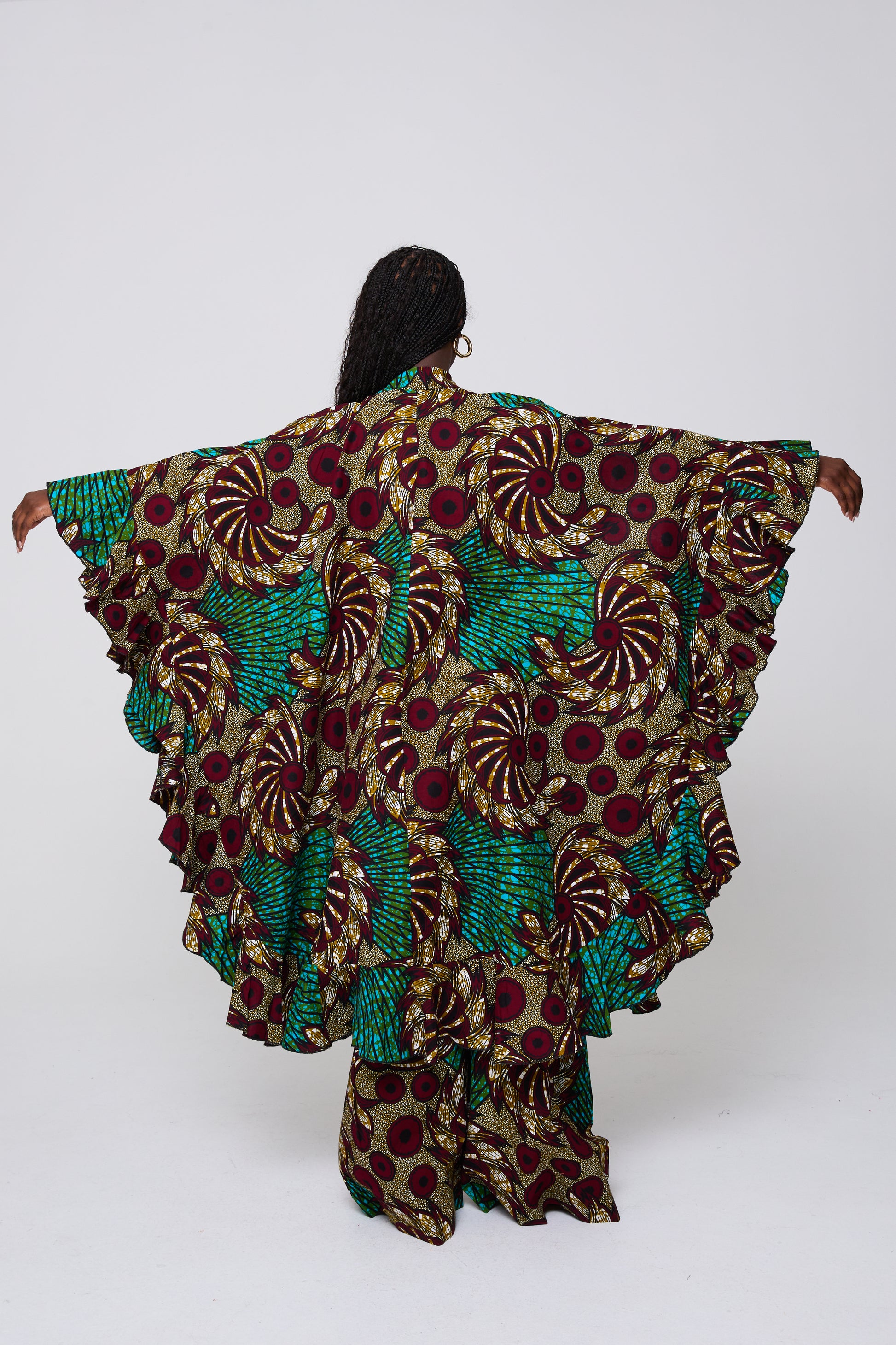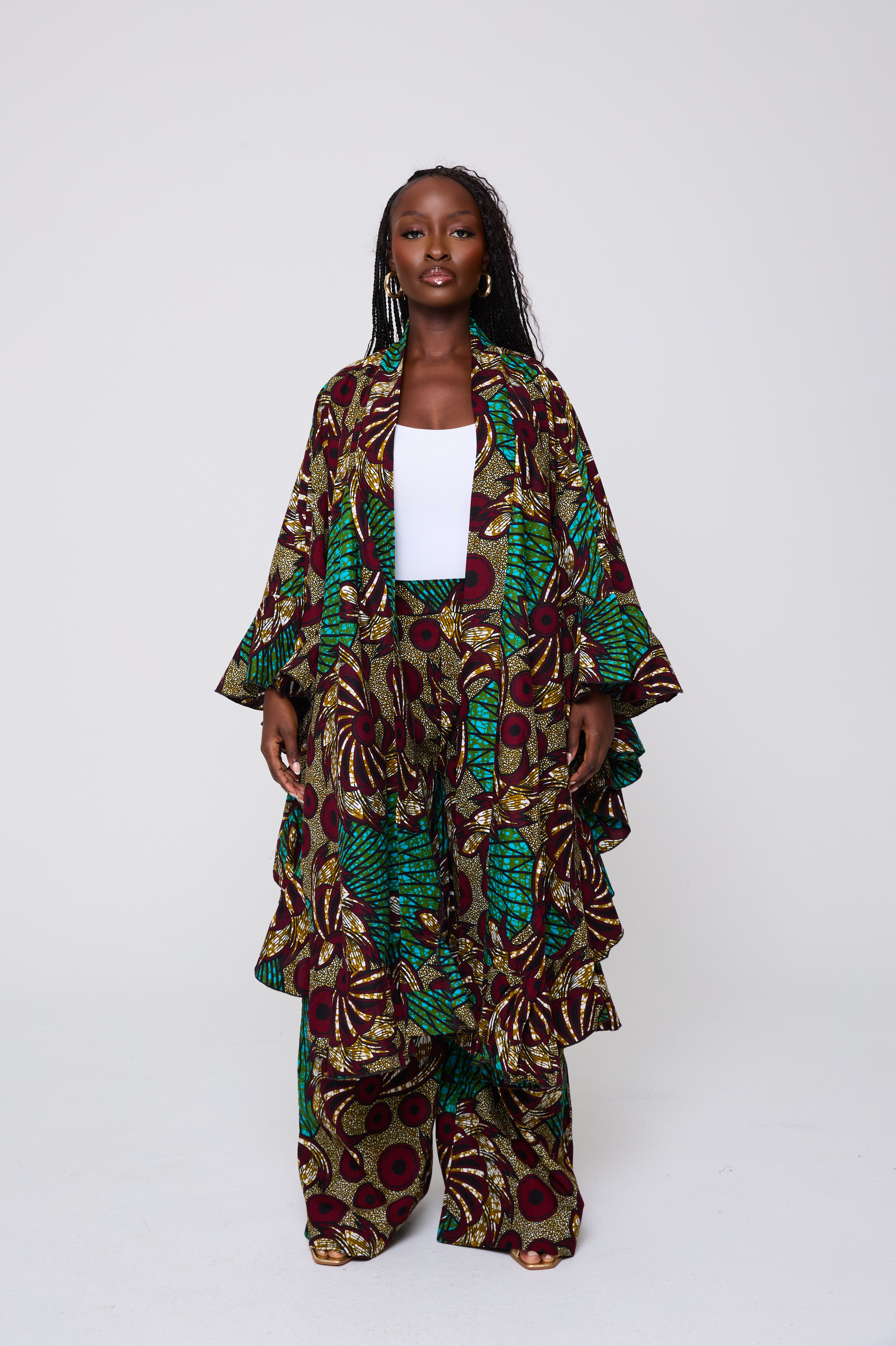 The Wilma Set is designed for impact and versatility. The voluminous kimono top pairs with structured wide-leg trousers to create a commanding look that balances drama with comfort. Ideal for elevated daywear, travel, or standout evening style